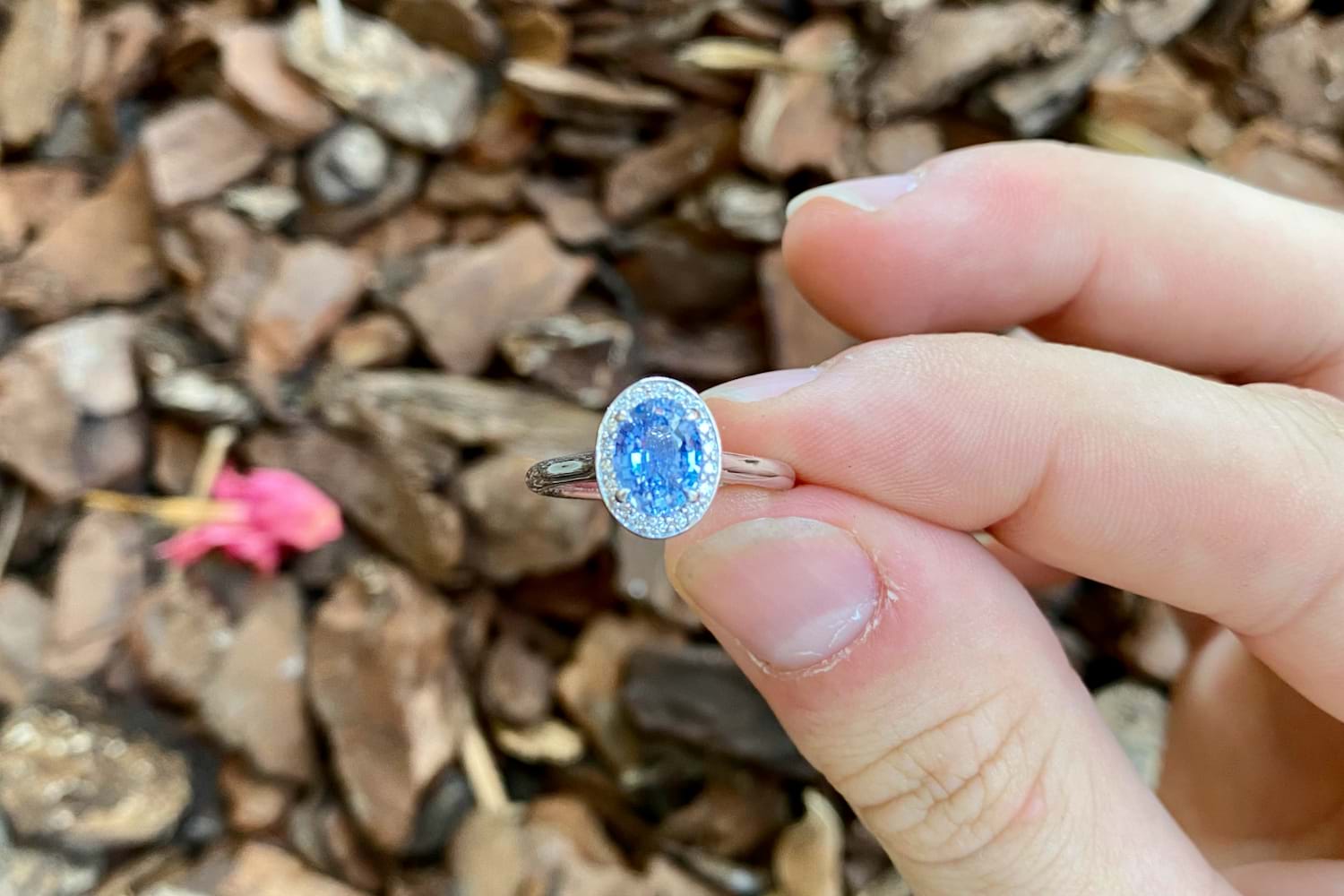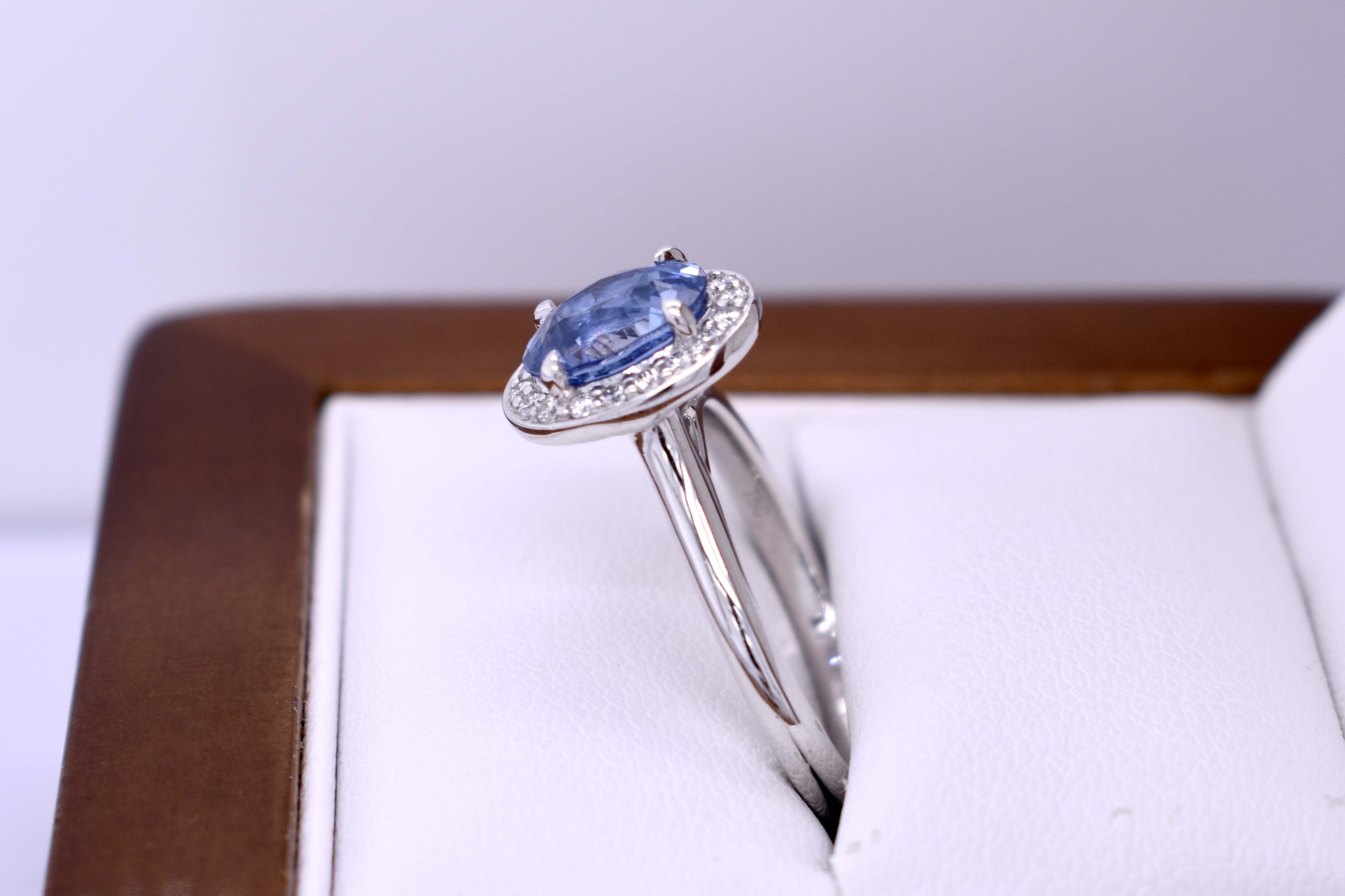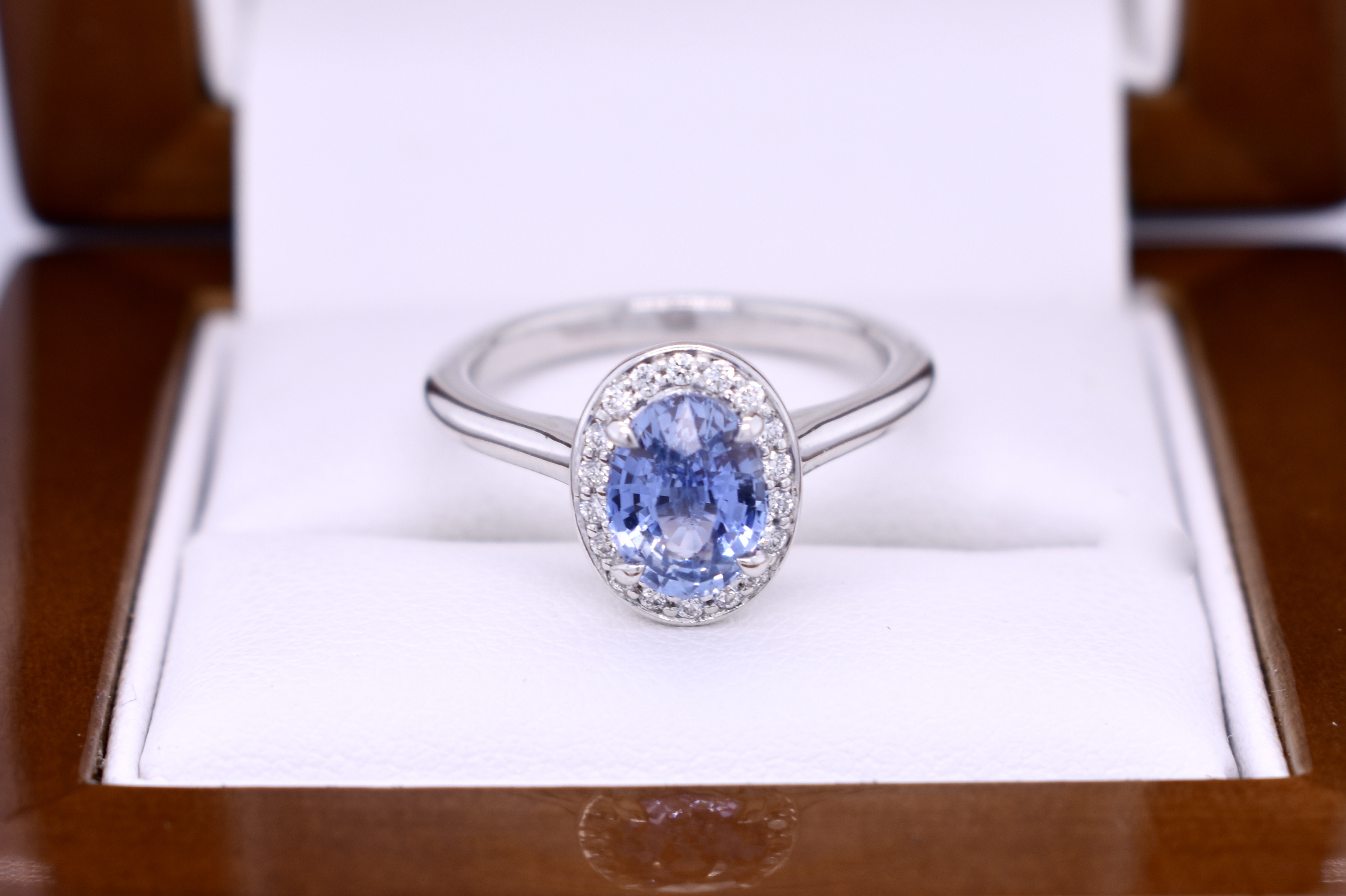 18ct White Gold 1.50ct Oval Ceylon Blue Sapphire & 0.13ct Diamond Halo Ring (K+)