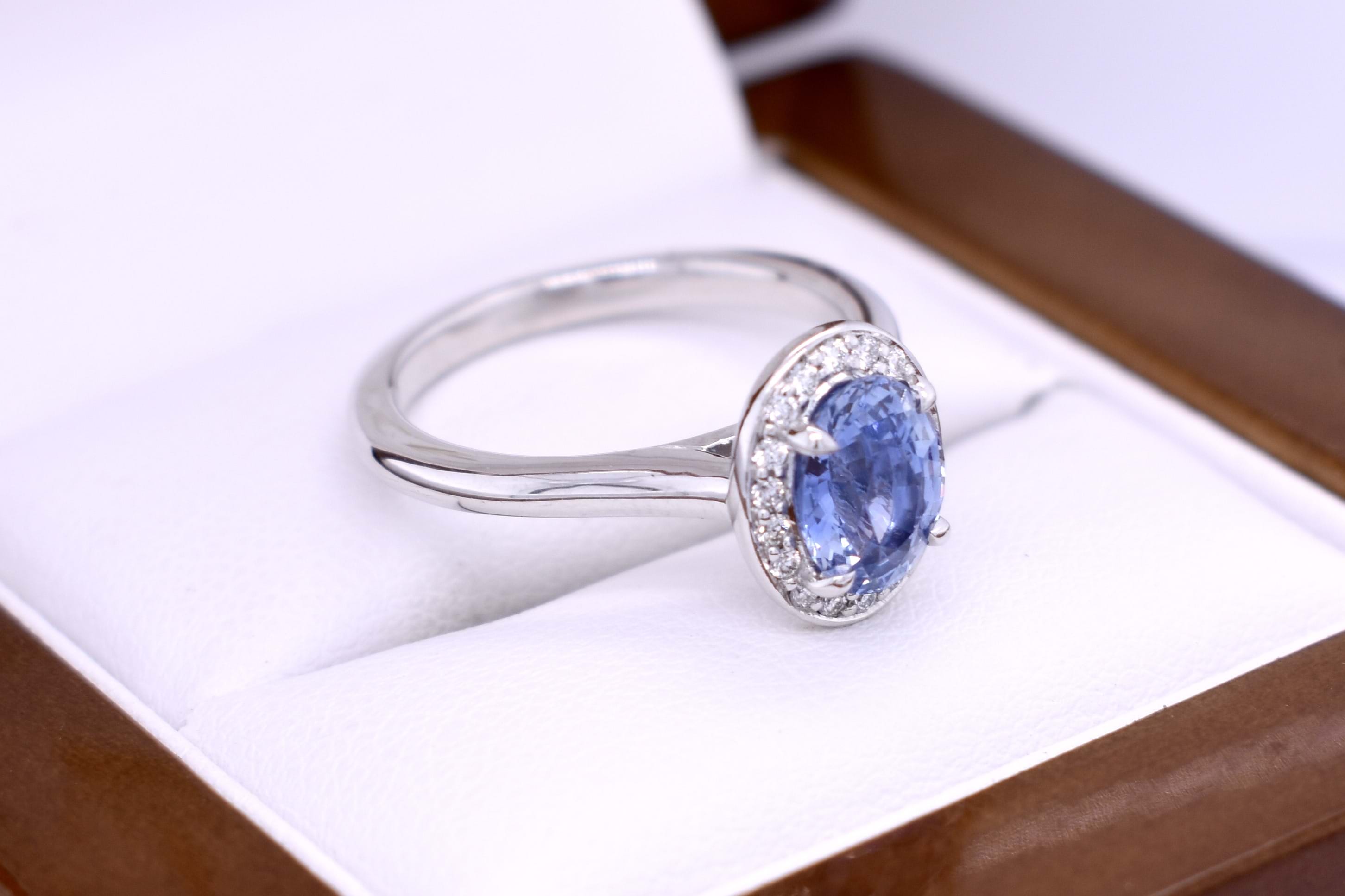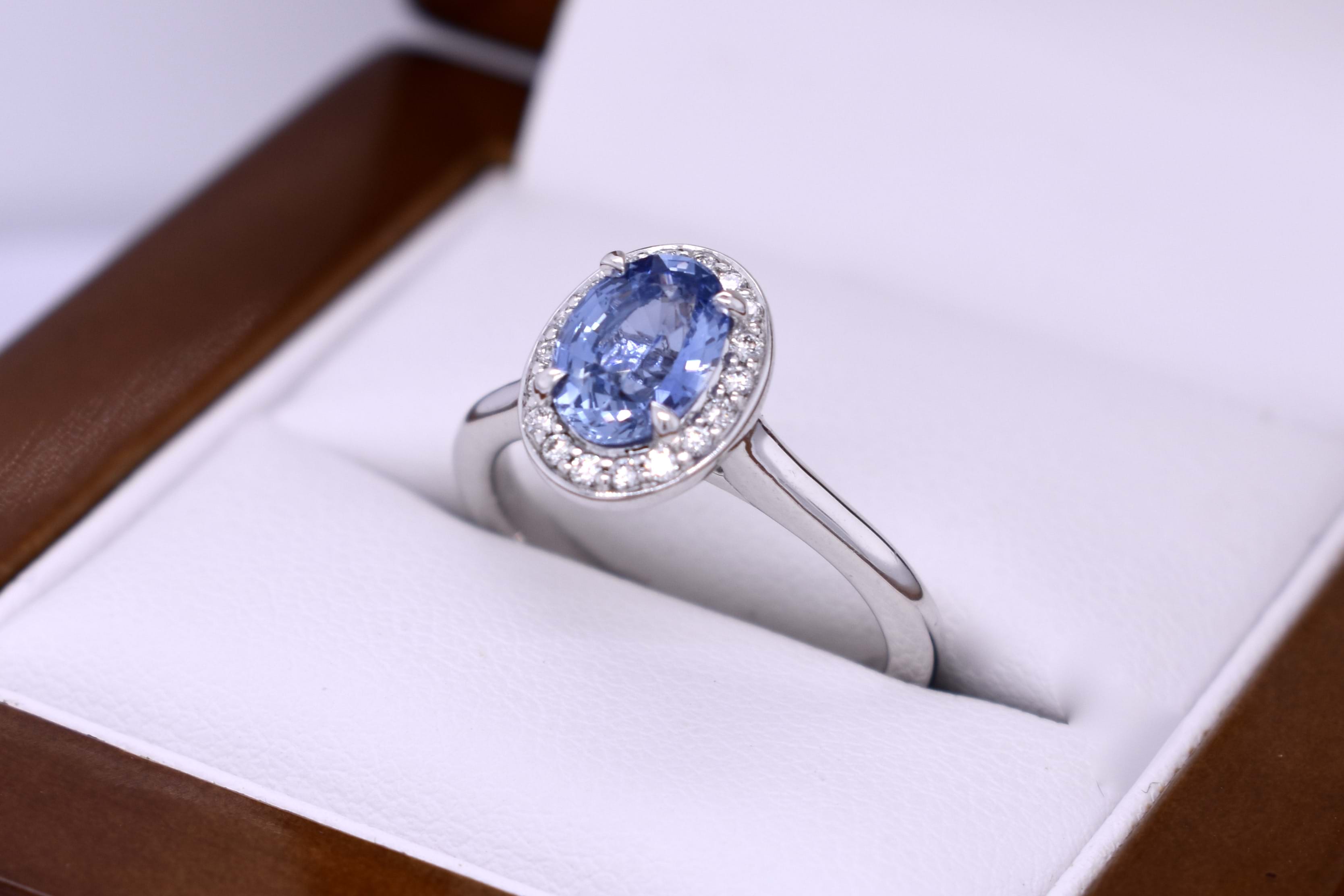 Beautiful in blue, this 18ct white gold ring features an oval Ceylon blue sapphire weighing 1.50ct which is four claw set with a dazzling halo of 20 round brilliant cut diamonds, the halo is grain set with a border. Total diamond weight of 0.13ct FG SI including a hidden diamond set in the collet. Finished on a plain white gold band. Finger size K+.