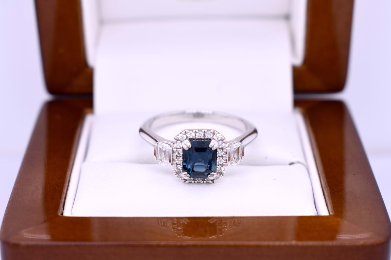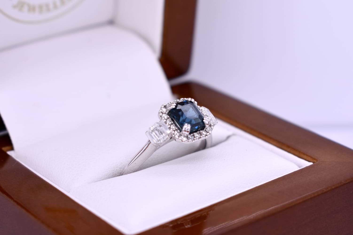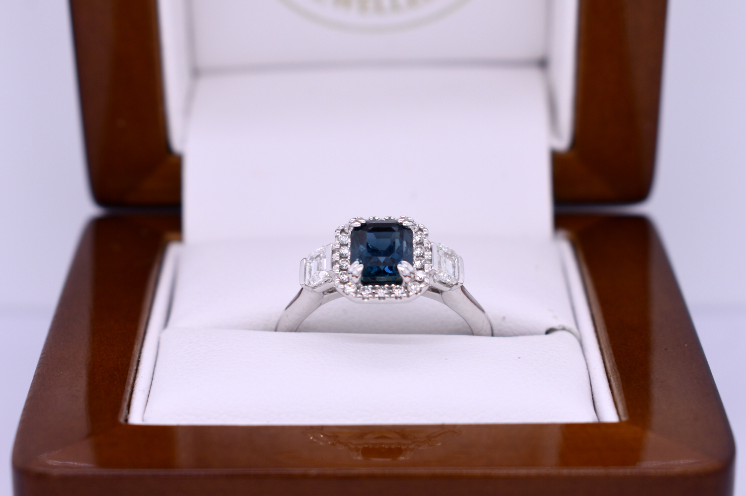 This mesmerising African blue sapphire is emerald cut and weighs 1.63ct. Claw set in 18ct white gold with a shimmering halo of round brilliant cut diamonds around it, as well as an emerald cut white diamond set either side for added sparkle. Total of 20 diamonds equalling 0.50ct FG SI. Completed on a plain gold band with an under rail. Finger size M+.