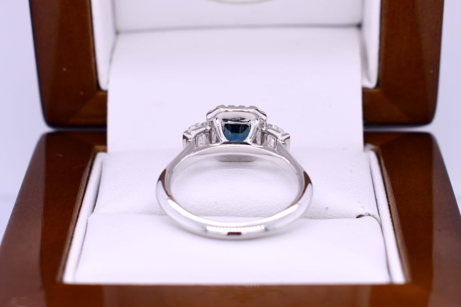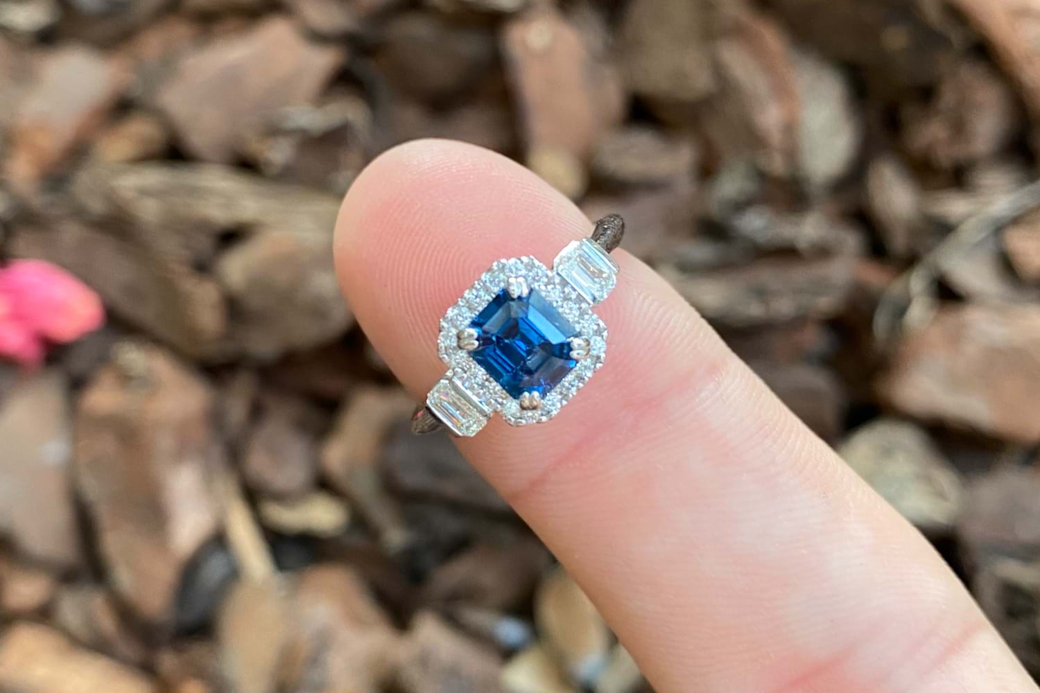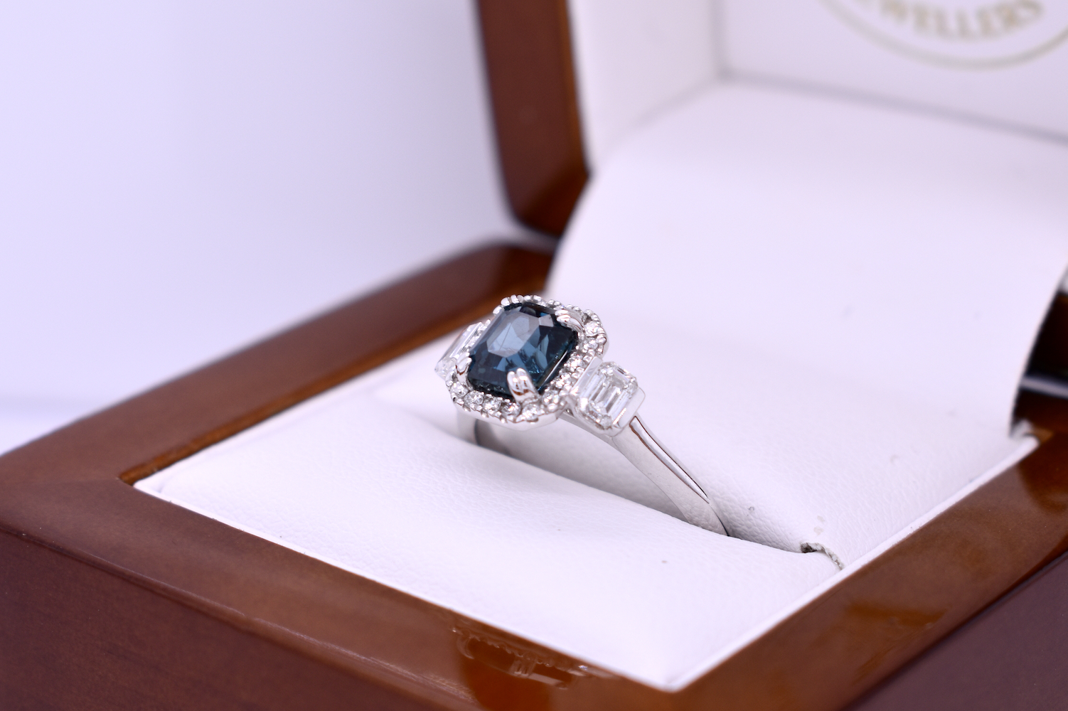 This mesmerising African blue sapphire is emerald cut and weighs 1.63ct. Claw set in 18ct white gold with a shimmering halo of round brilliant cut diamonds around it, as well as an emerald cut white diamond set either side for added sparkle. Total of 20 diamonds equalling 0.50ct FG SI. Completed on a plain gold band with an under rail. Finger size M+.