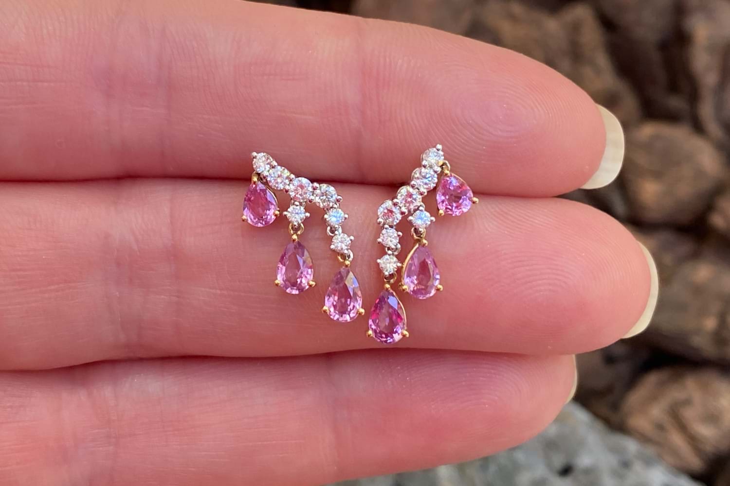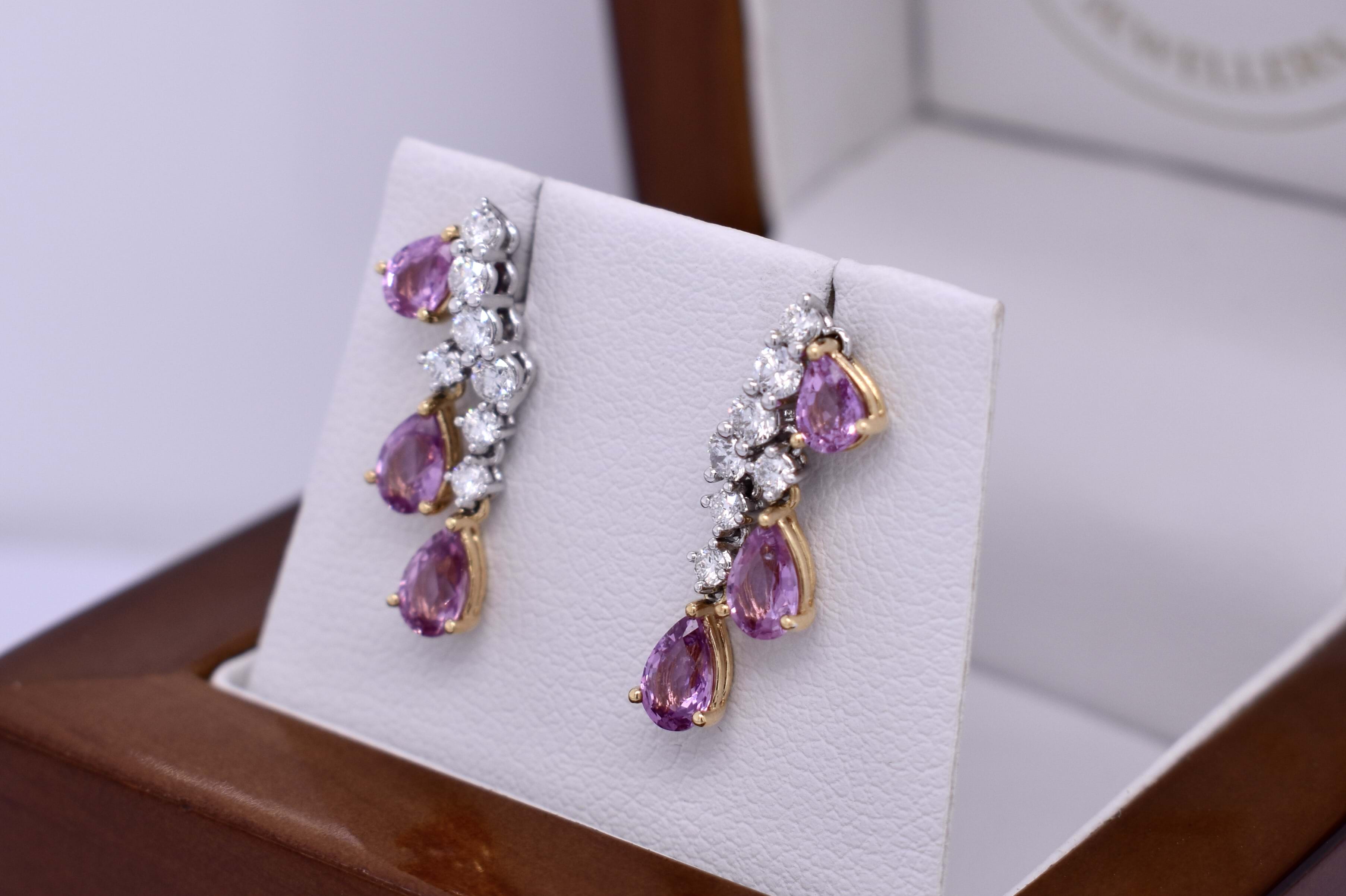 Beautiful stud earrings designed to curve up the ear lobe and create the effect of shimmering pink sapphire droplets. They are crafted in 18ct white gold with a scattering of diamonds claw set in a slightly curved vertical direction, with yellow gold set pearshape pink sapphires articulated drops from the outer edges. Total diamond content equals 0.47ct FGSI, total sapphire content equals 0.47ct FGSI. Independent Valuation Supplied