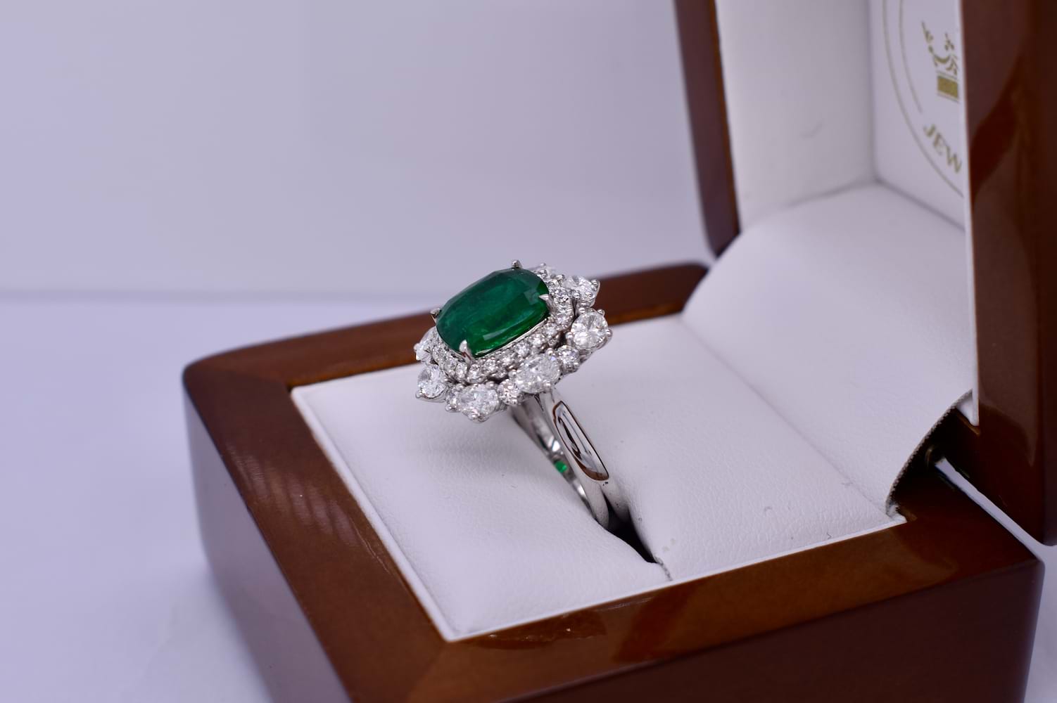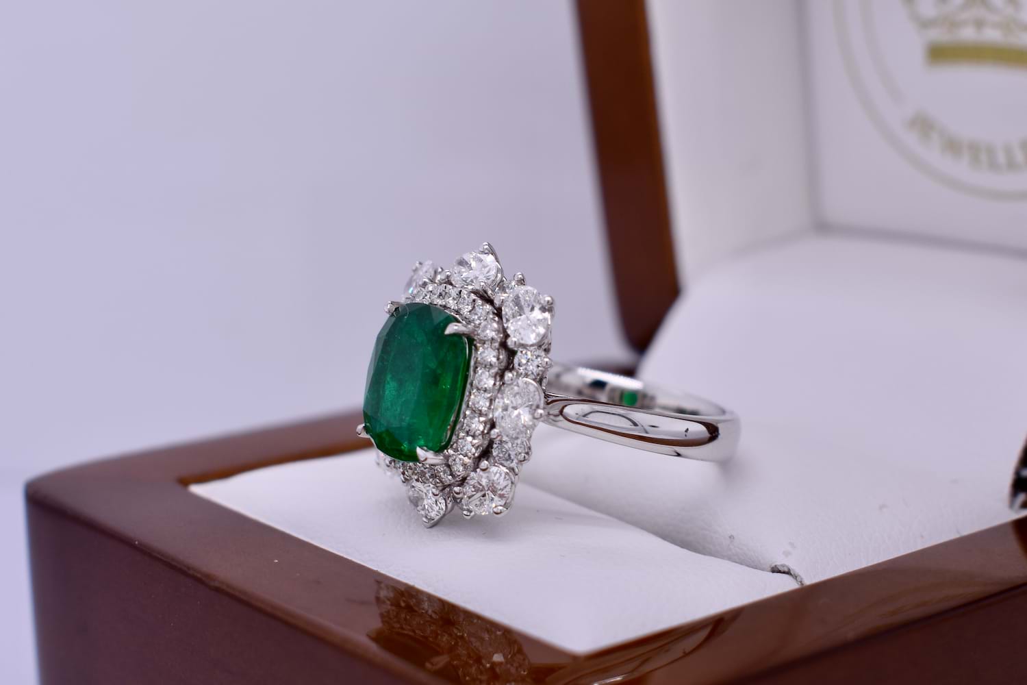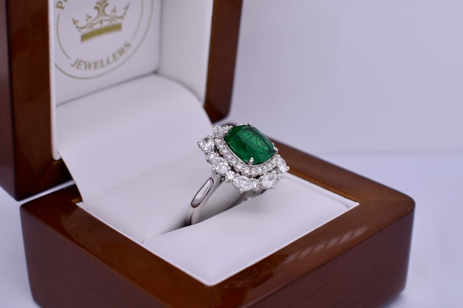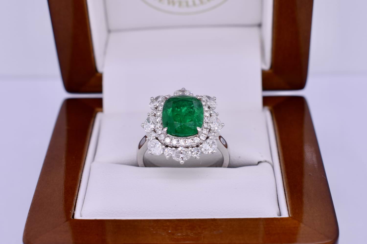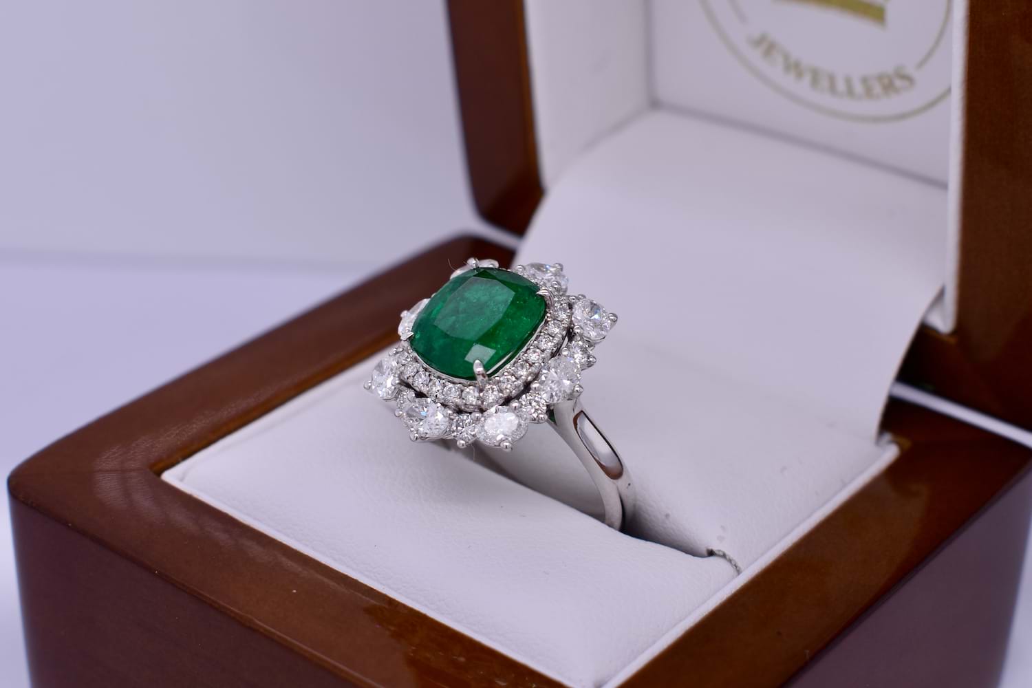Bright and dreamy, this spectacular 18ct white gold ring features a bright deep green cushion cut emerald of 2.63ct, measuring 9.96x8.39x4.71mm. This high quality emerald has a GGL (Global Gem Testing Laboratory Report) stating minor oil. Four claw set surrounded by 24 round brilliant cut 1.3mm diamonds, micro claw set, equalling 0.24ct G VS, with a further outer halo surround of 8 oval 3.85x2.75mm diamonds and 8 round brilliant cut 2mm diamonds, totalling a further 1.07ct GVS and 0.25ct G VS. Total diamond weight of 1.56ct all together. Set with a wire scroll gallery with pointed swept up shoulders on a half round 3.25mm band. Finger size M. Independent Valuation Supplied.