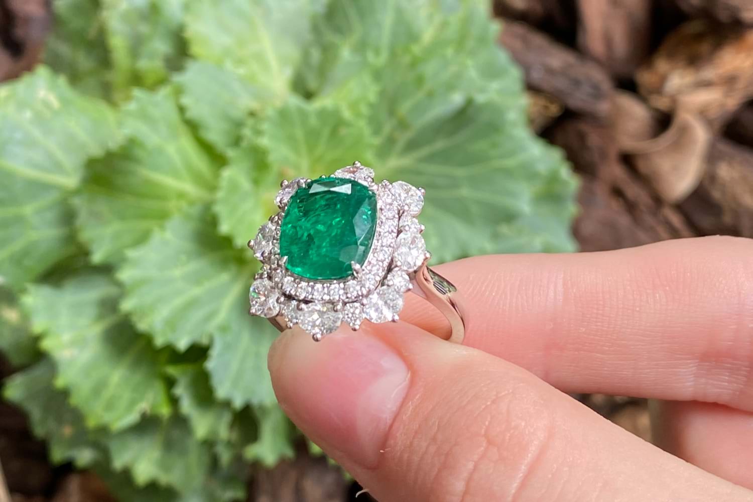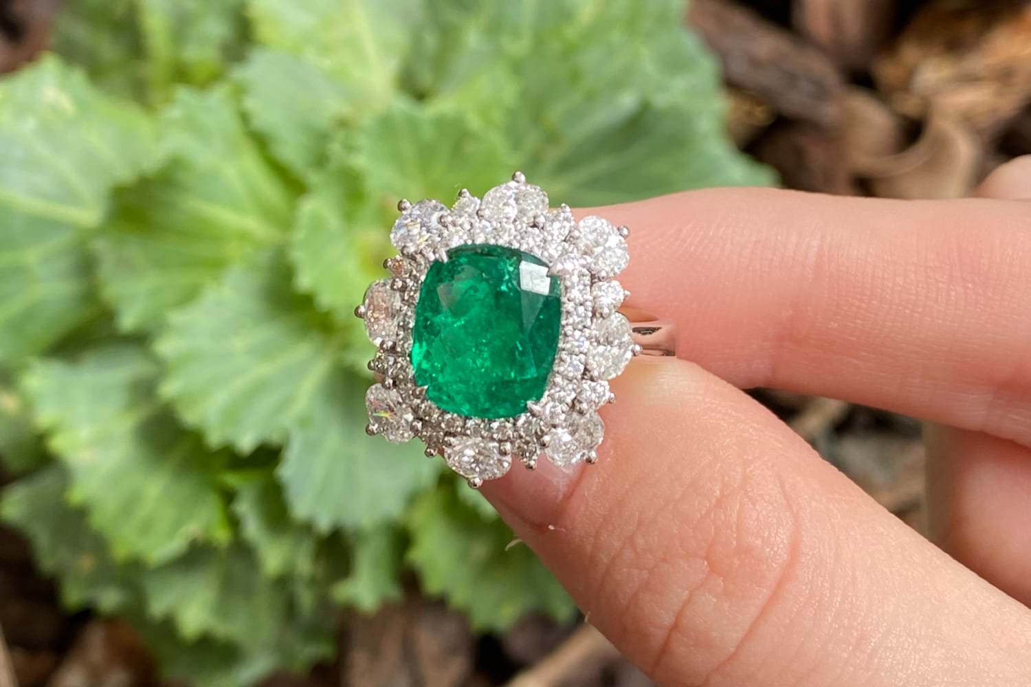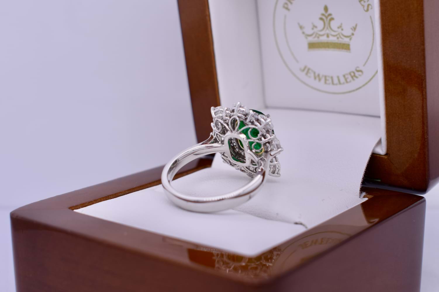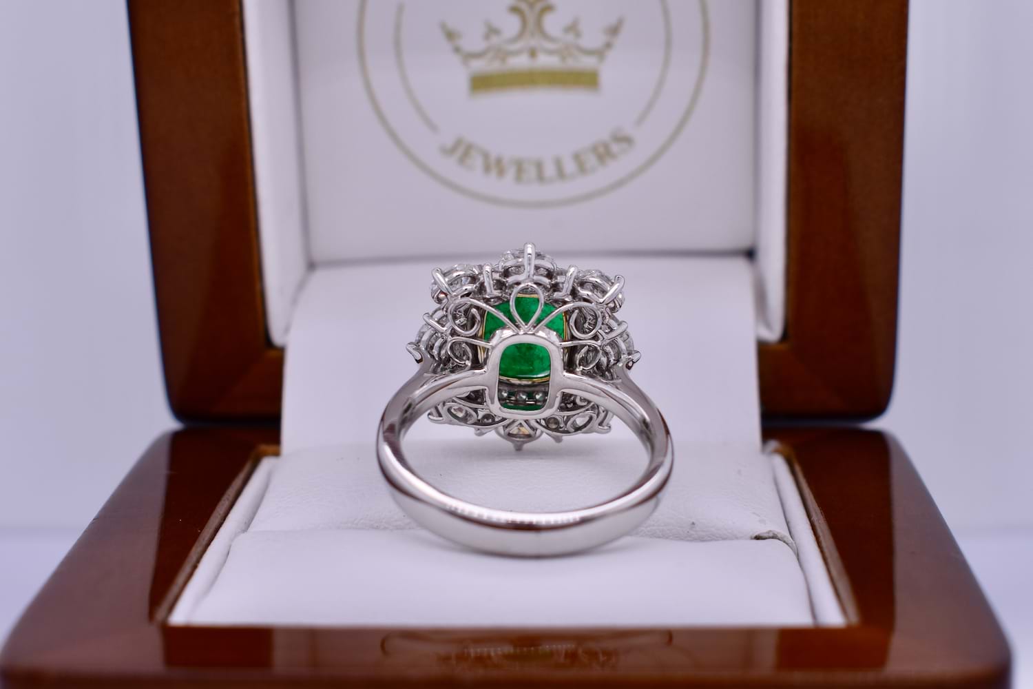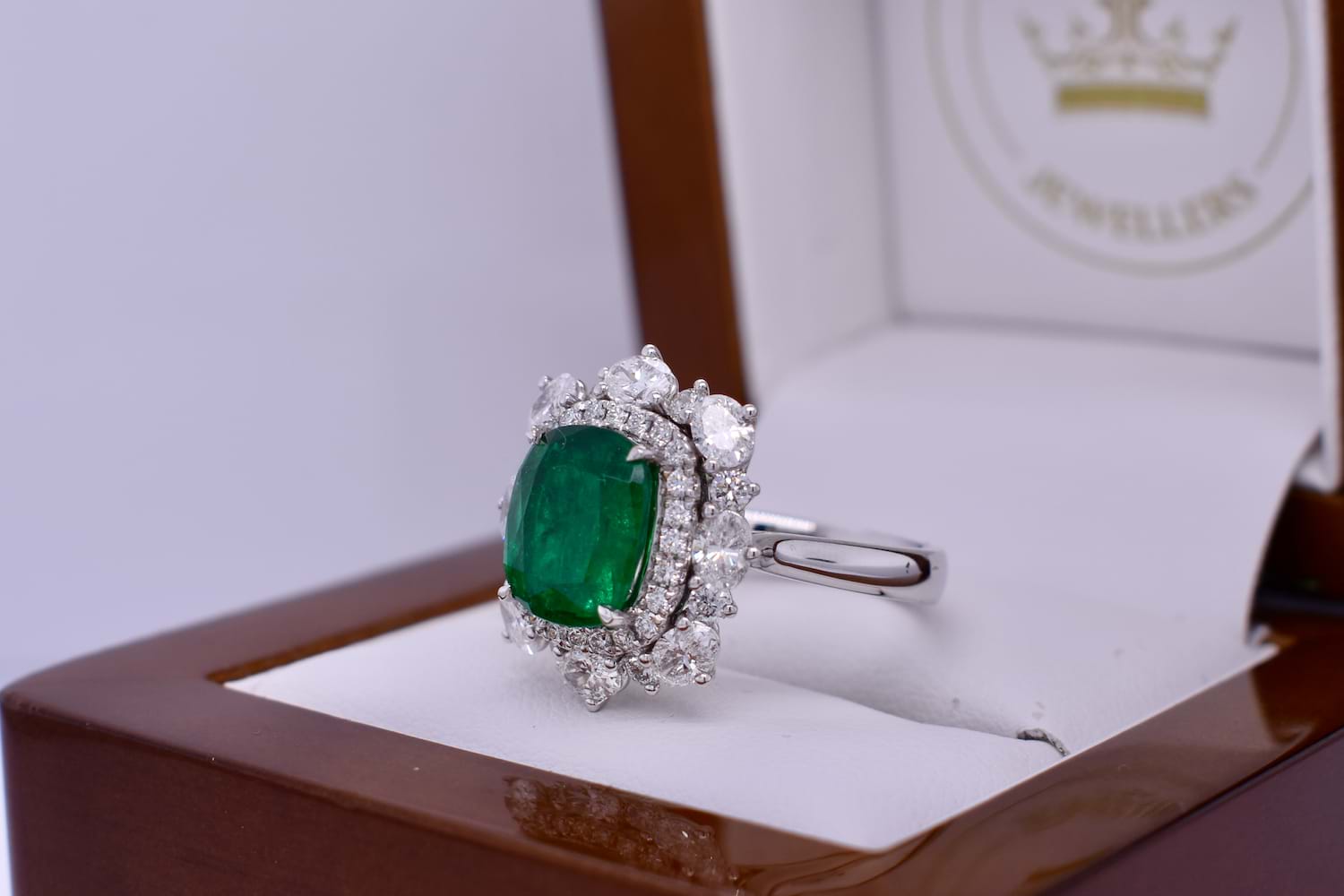 Bright and dreamy, this spectacular 18ct white gold ring features a bright deep green cushion cut emerald of 2.63ct, measuring 9.96x8.39x4.71mm. This high quality emerald has a GGL (Global Gem Testing Laboratory Report) stating minor oil. Four claw set surrounded by 24 round brilliant cut 1.3mm diamonds, micro claw set, equalling 0.24ct G VS, with a further outer halo surround of 8 oval 3.85x2.75mm diamonds and 8 round brilliant cut 2mm diamonds, totalling a further 1.07ct GVS and 0.25ct G VS. Total diamond weight of 1.56ct all together. Set with a wire scroll gallery with pointed swept up shoulders on a half round 3.25mm band. Finger size M. Independent Valuation Supplied.