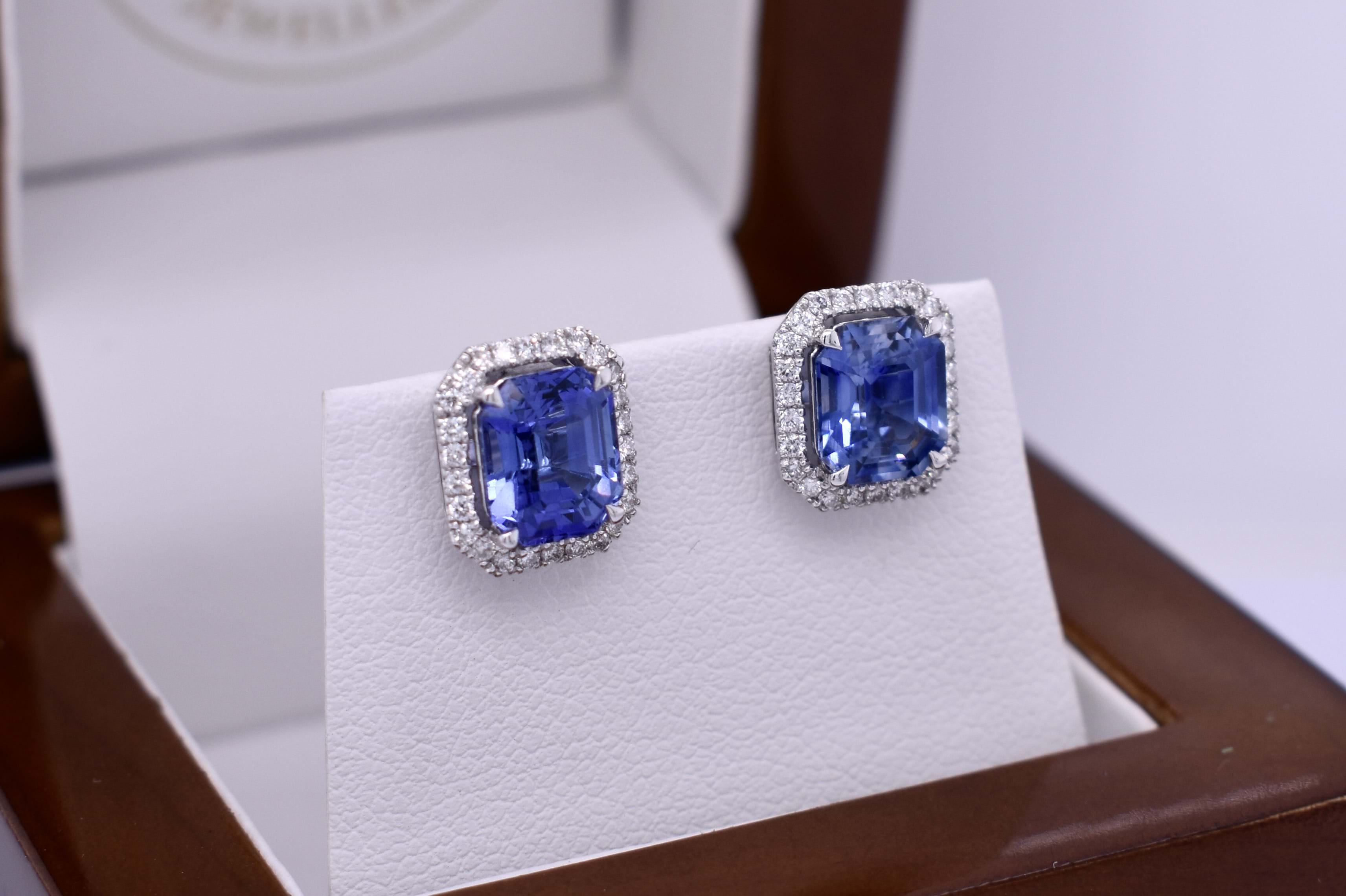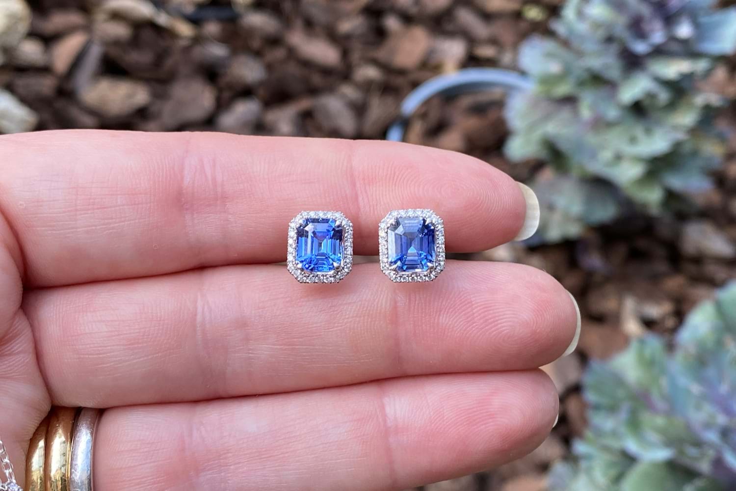 Absolutely spectacular pair of well matched, bright, eye clean, very good blue, Ceylon sapphires in an emerald cut shape totalling 3.65cts! This gorgeous pair of sapphires have been four talon claw set into a simple and timeless halo of shimmering round brilliant cut diamonds in 18ct white gold stud earrings. The earrings contain a total of 52 round brilliant cut diamonds totalling 0.26cts GH/SI.