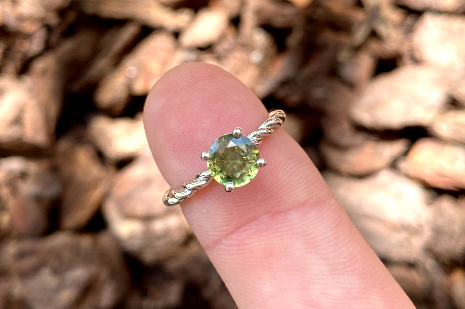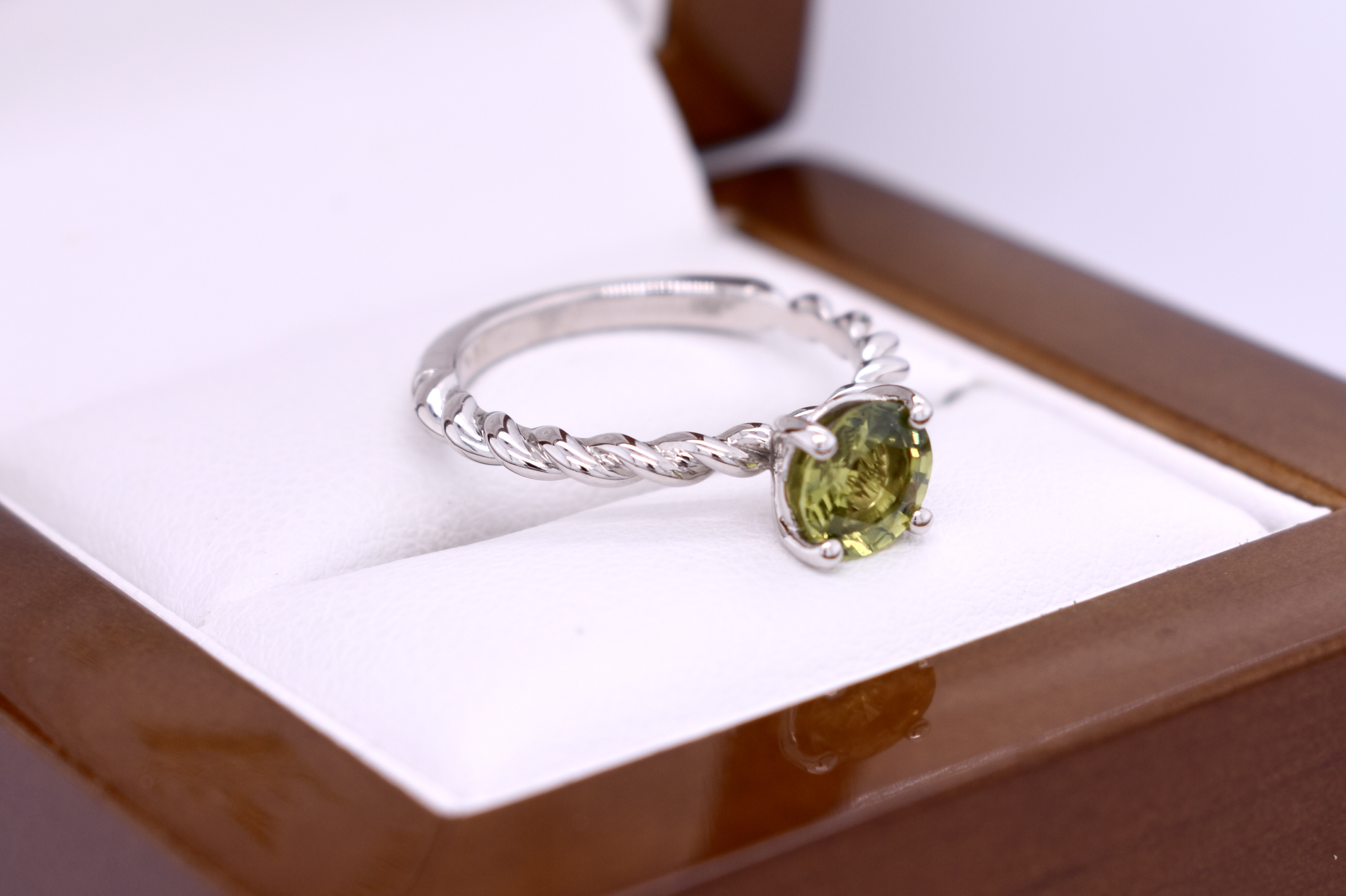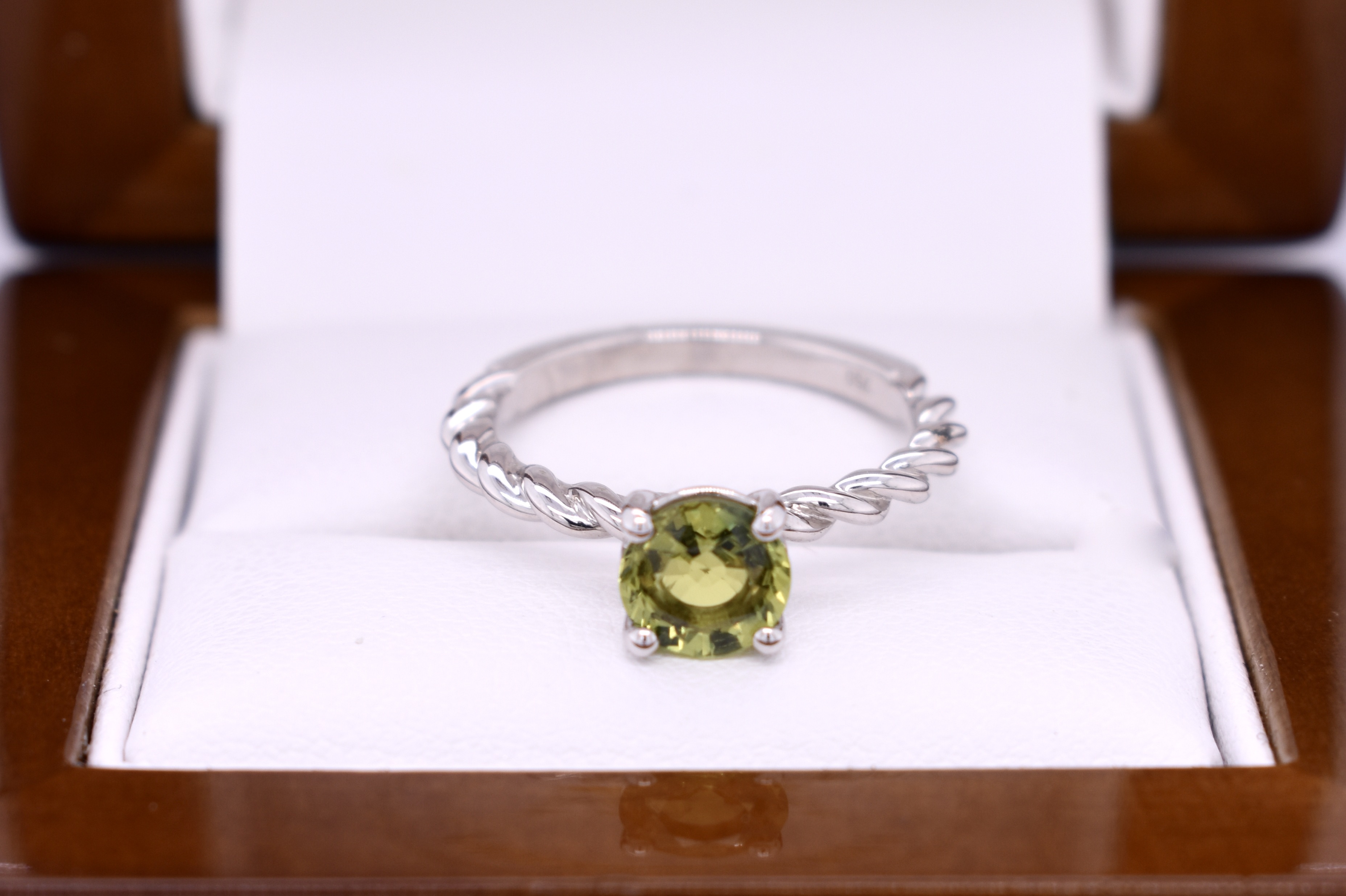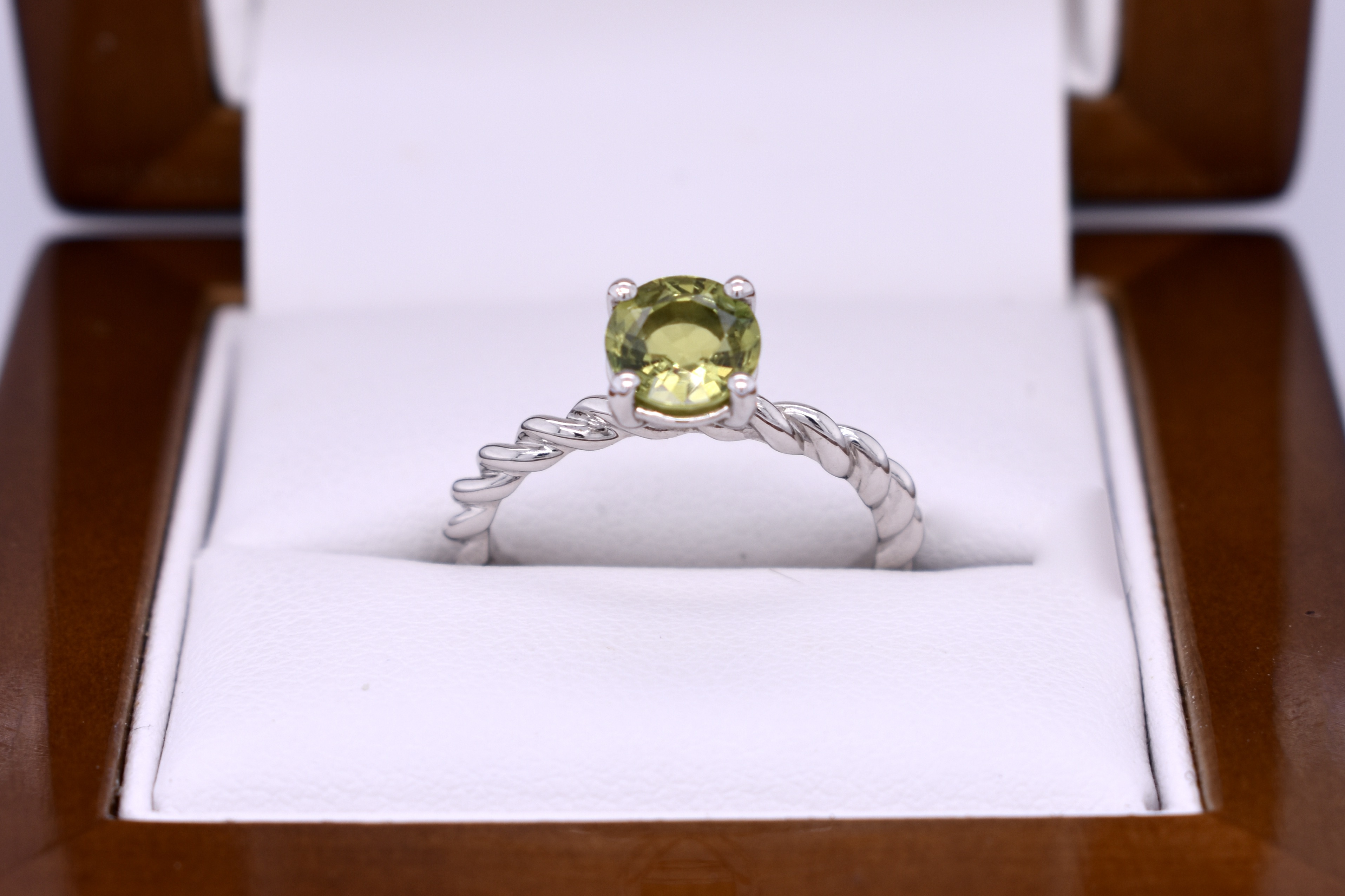 This simple and pretty single stone ring features a 1.07ct Australian green sapphire four claw set in 18ct white gold and is finished on a unique twist band. Finger size L