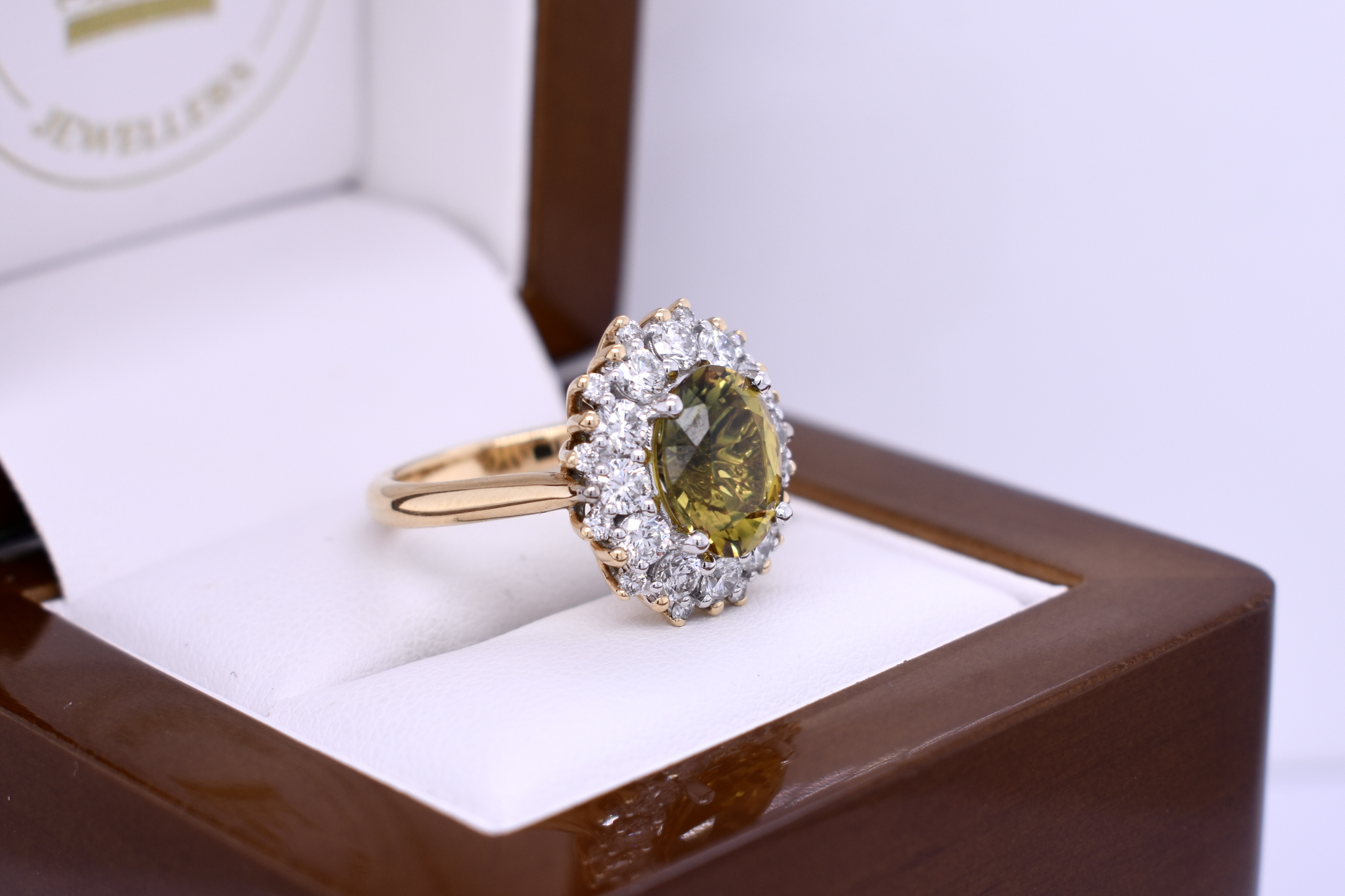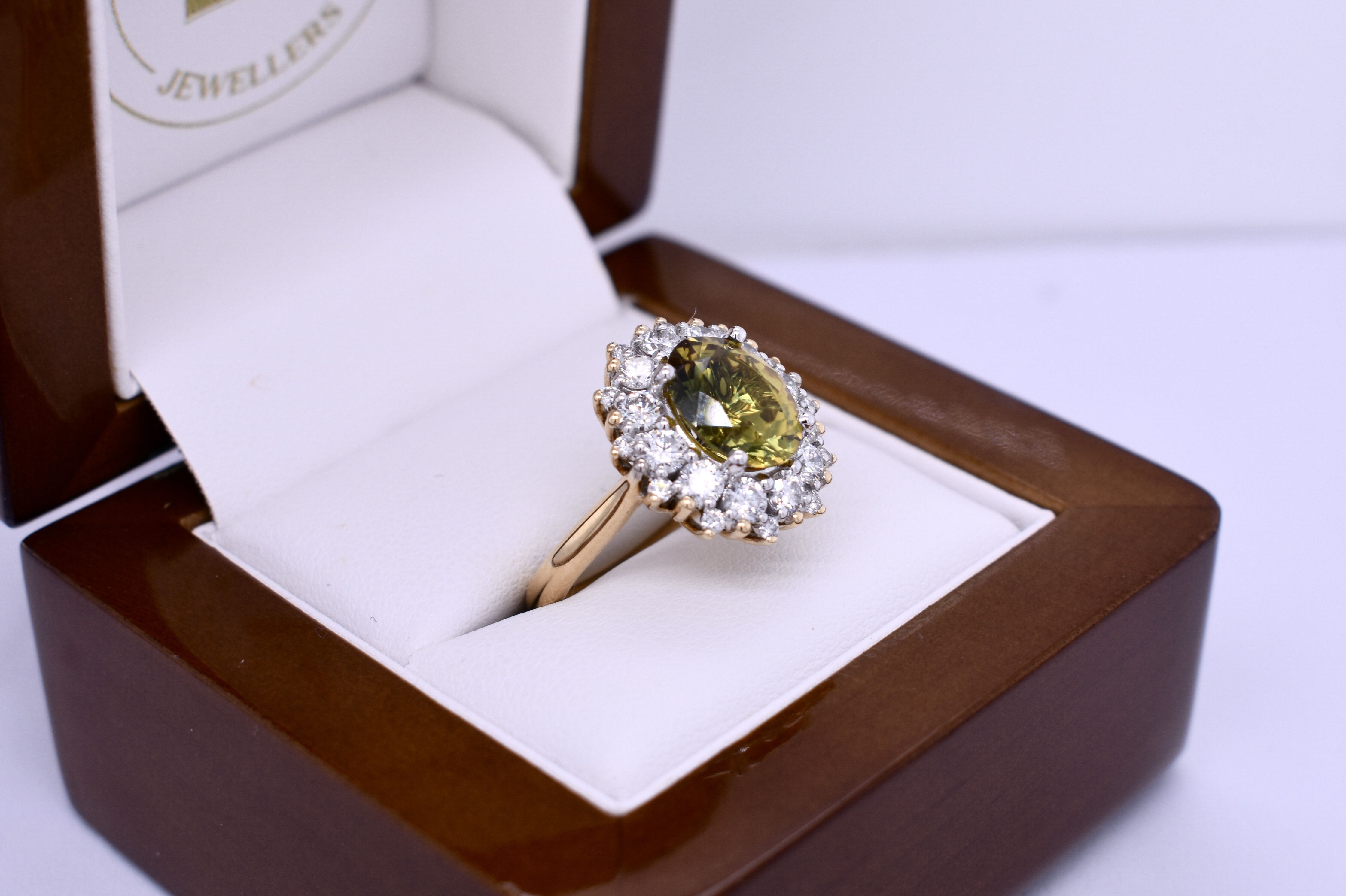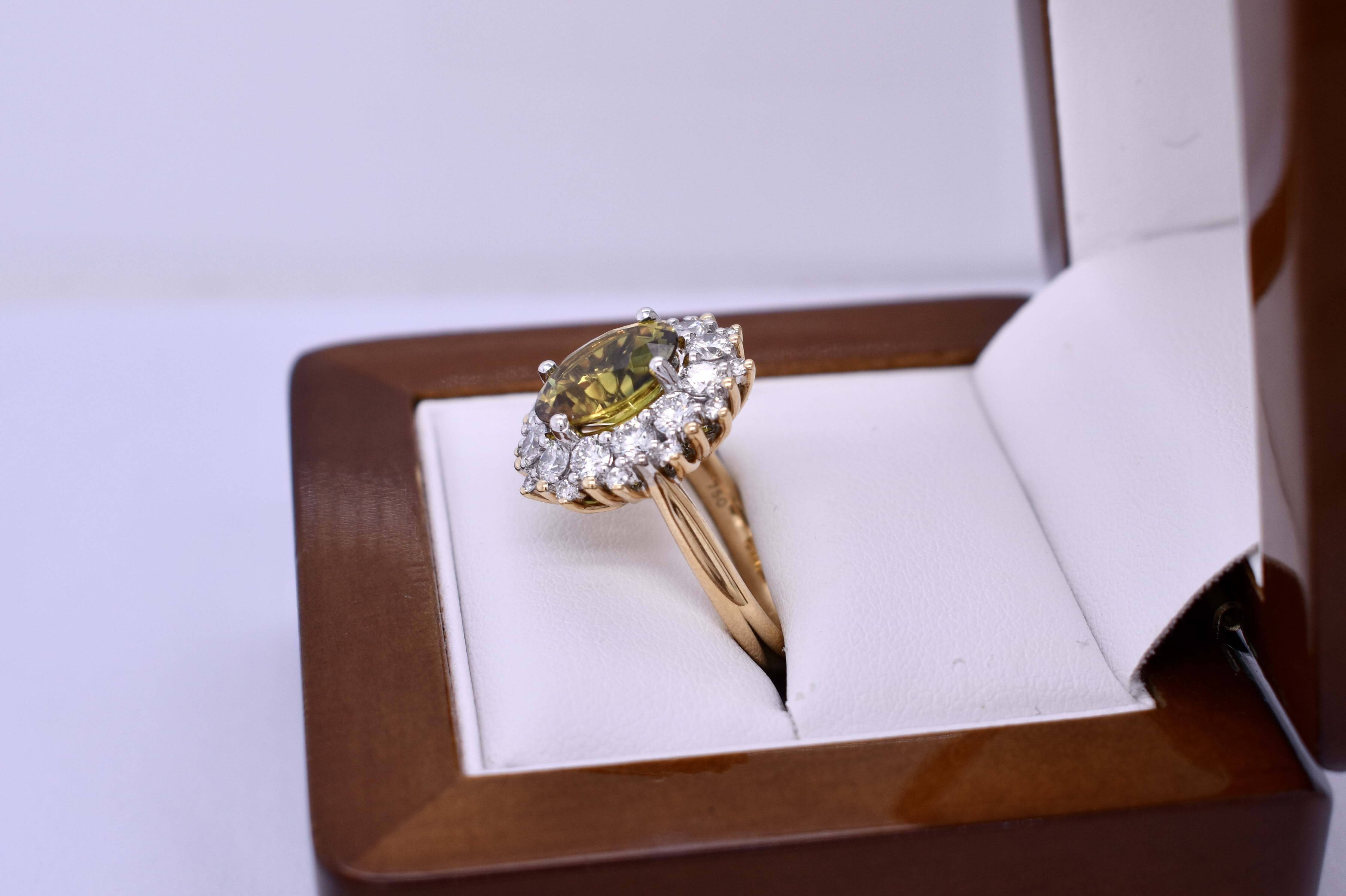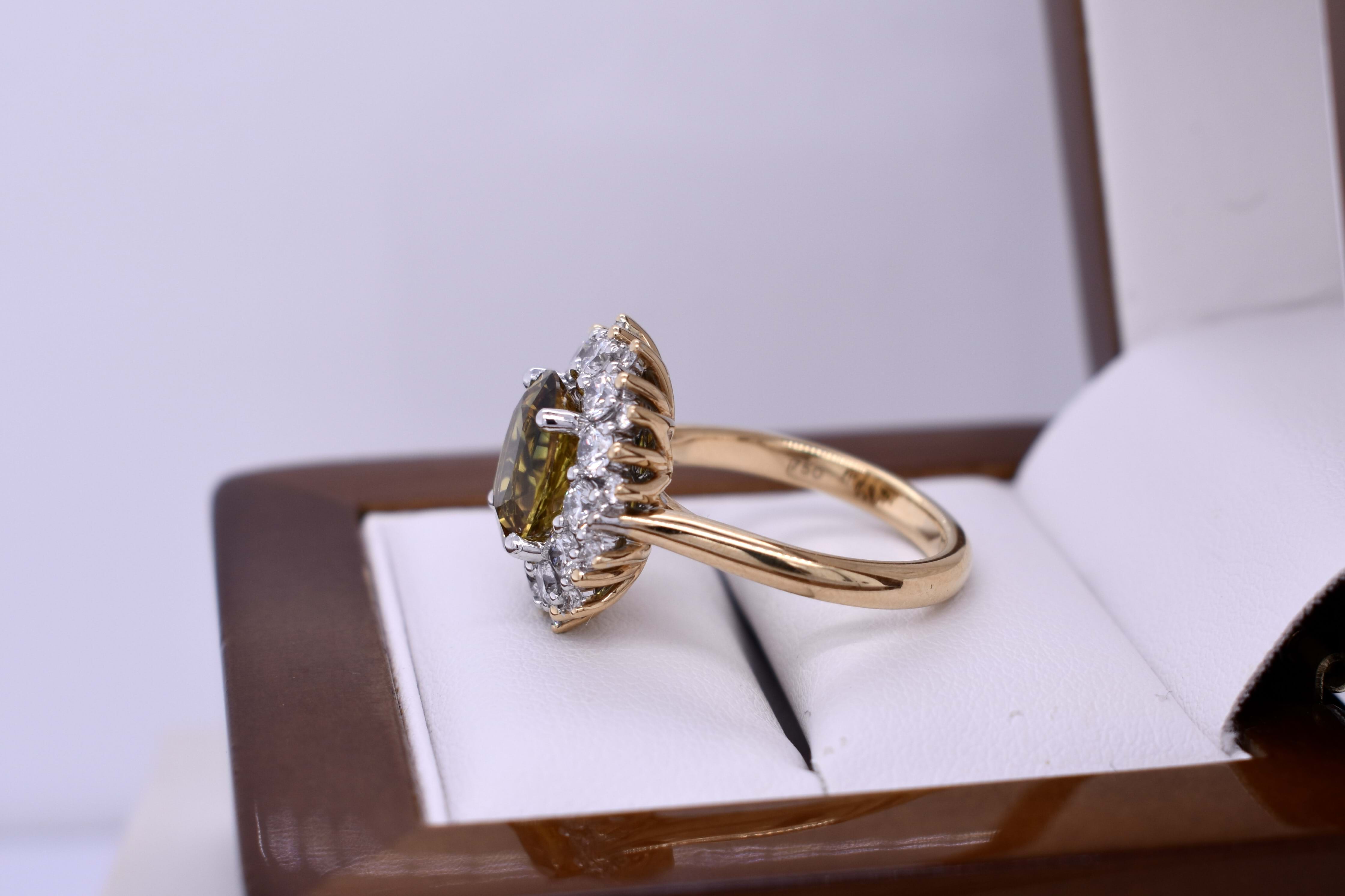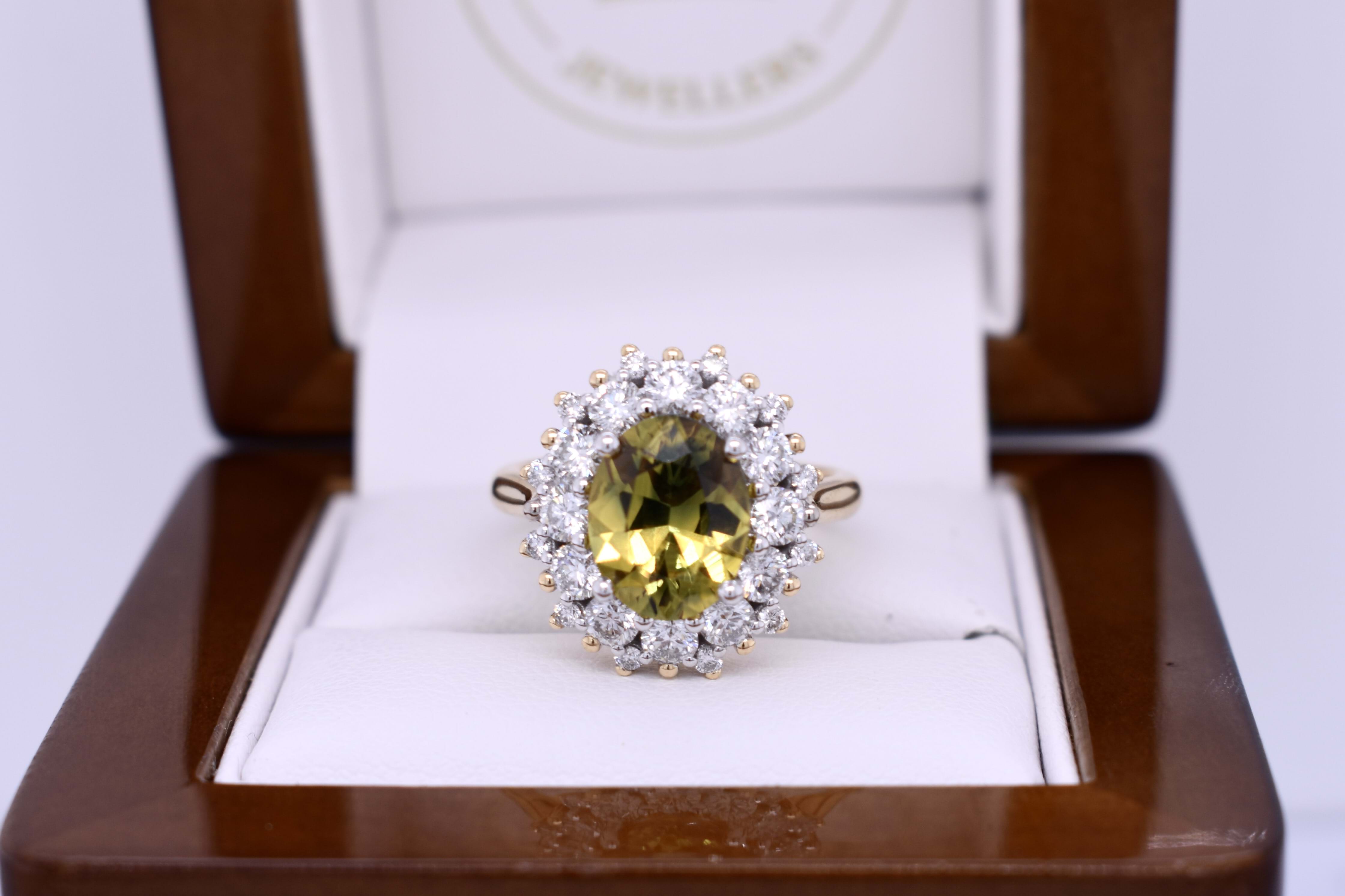 The feature stone of this gorgeous 18ct yellow and white gold 25 stone cluster ring is a dazzling bright mid yellow and green 3.25ct Australian parti sapphire four claw set in white gold surrounded by 24 round brilliant cut diamonds yellow & white gold shared claw set with a lovely pierced out basket gallery, finished with swept up shoulders on a 2.70mm yellow gold band. Finger size M. Independent valuation supplied.