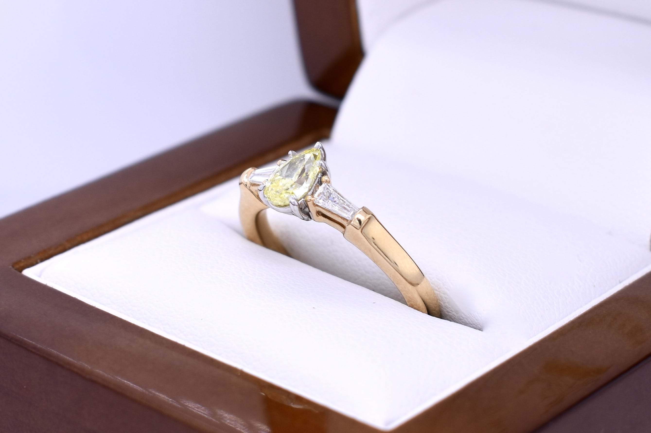 Striking and sparkling, this ring is crafted in 18ct yellow gold and features a centre pear shaped fancy intense yellow diamond of 0.50ct FIY SI1, set in white gold. Enhanced with a tapered baguette diamond set on either side. Tapered baguettes totalling 0.18ct F VS1 and they are GIA certified. Completed on a 2.34mm wide plain band. 4.61 grams. Finger size M.