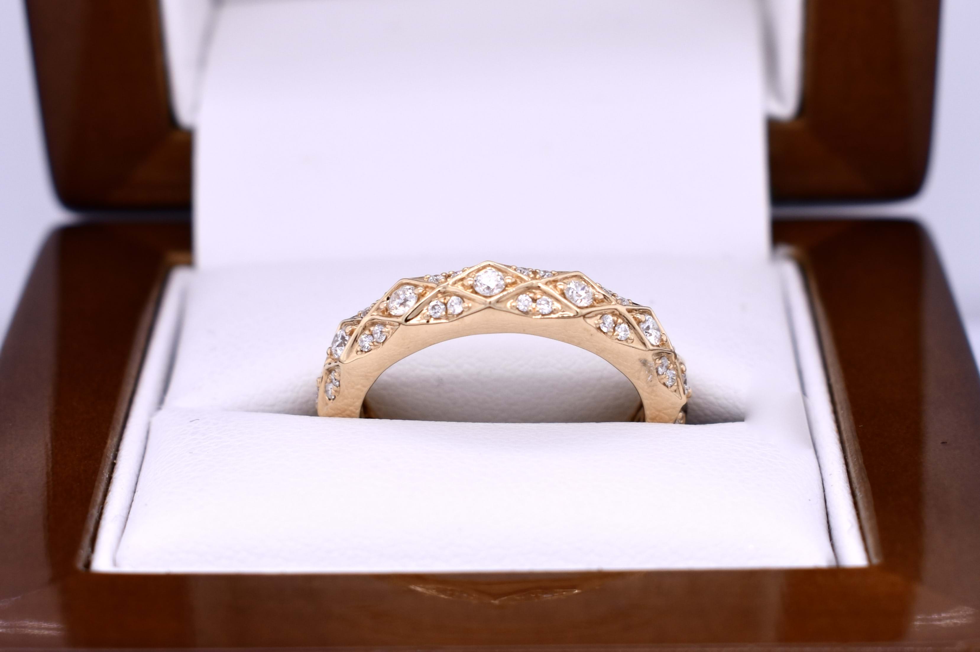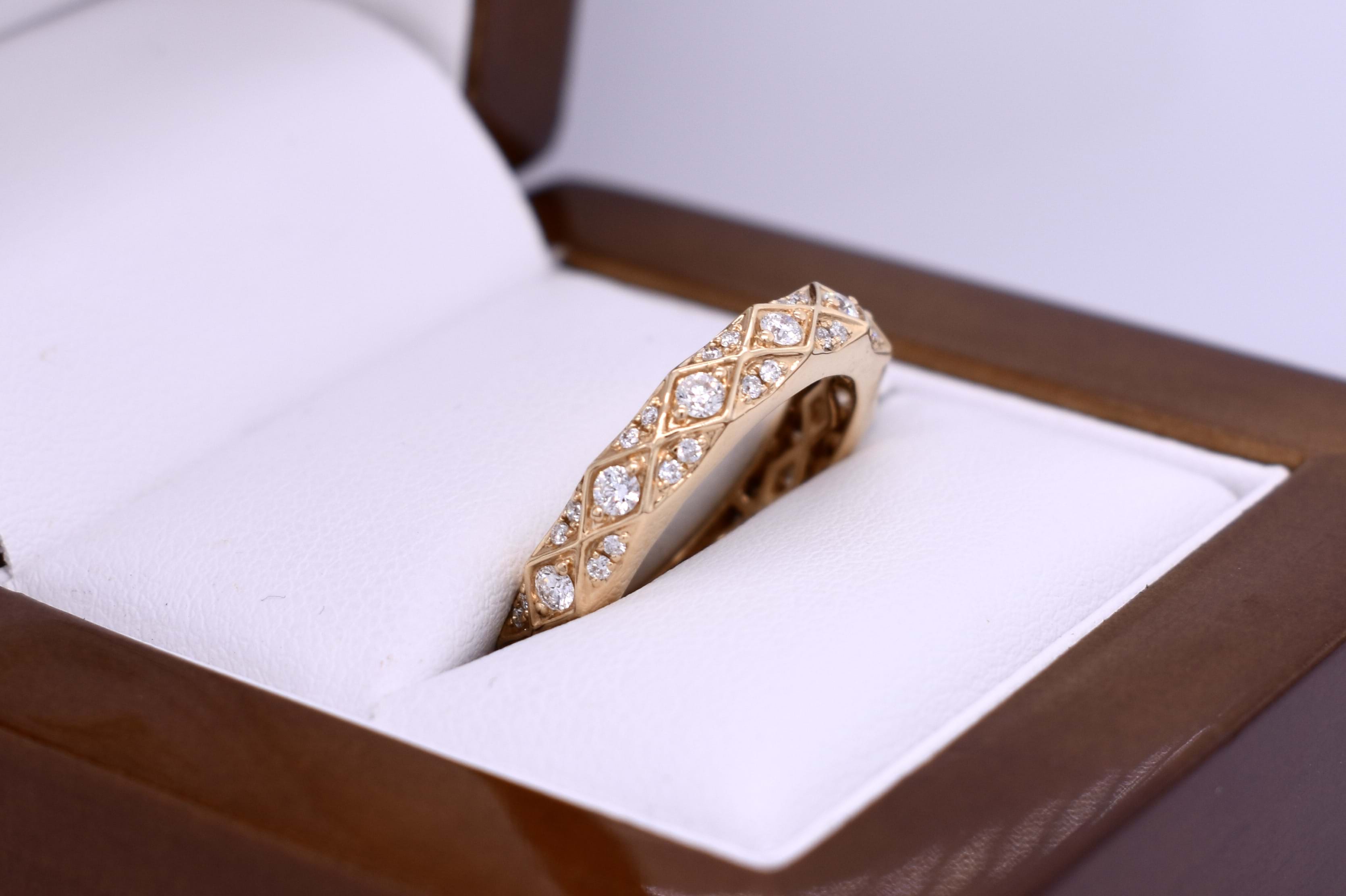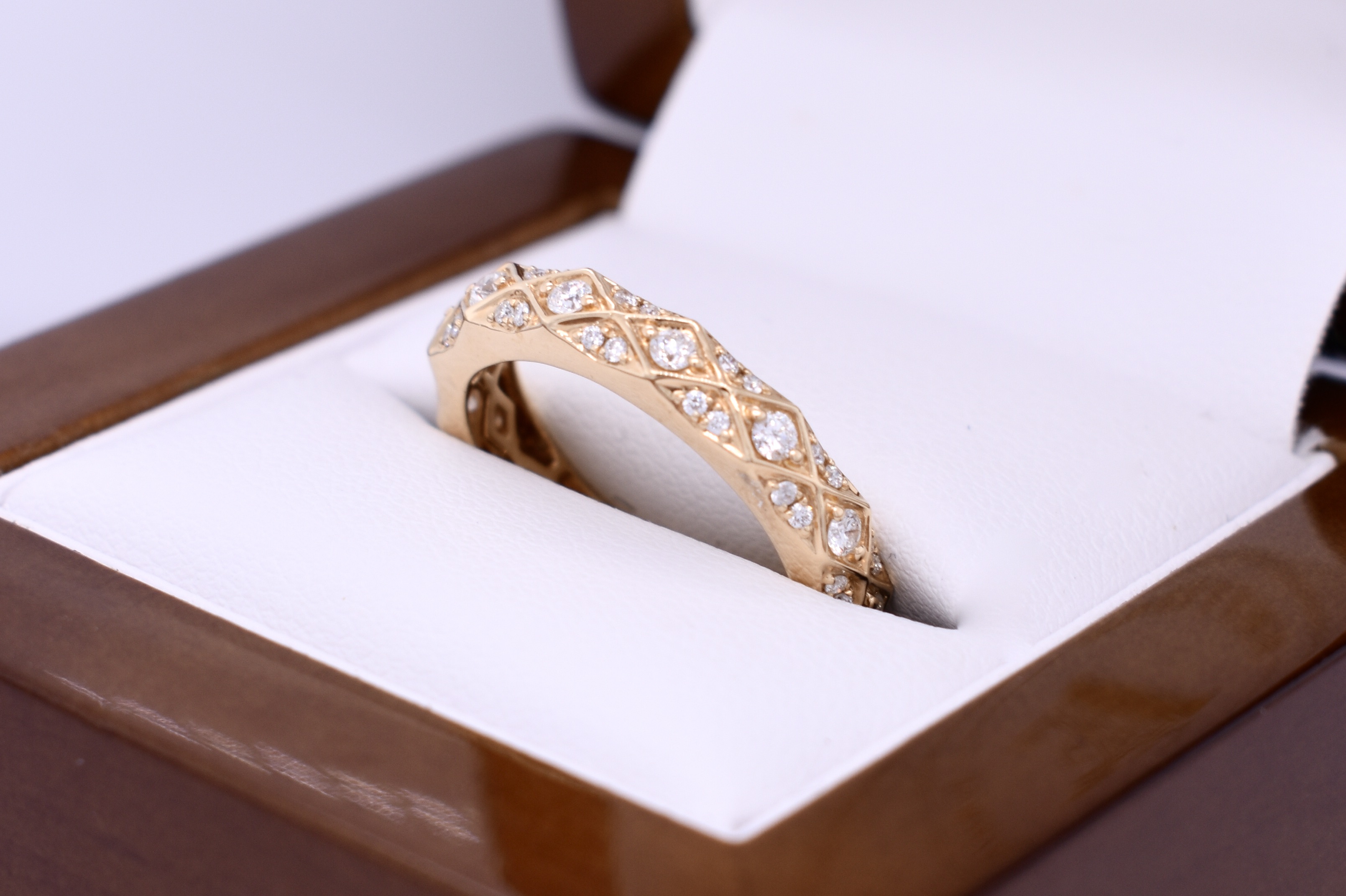 This classic full eternity band is crafted in 18ct yellow gold with a intertwined hollow pattern with netting on the inside, set with 65 round brilliant cut diamonds going all the way around. Total diamond weight of 0.65ct FG SI1. Finger size M+.