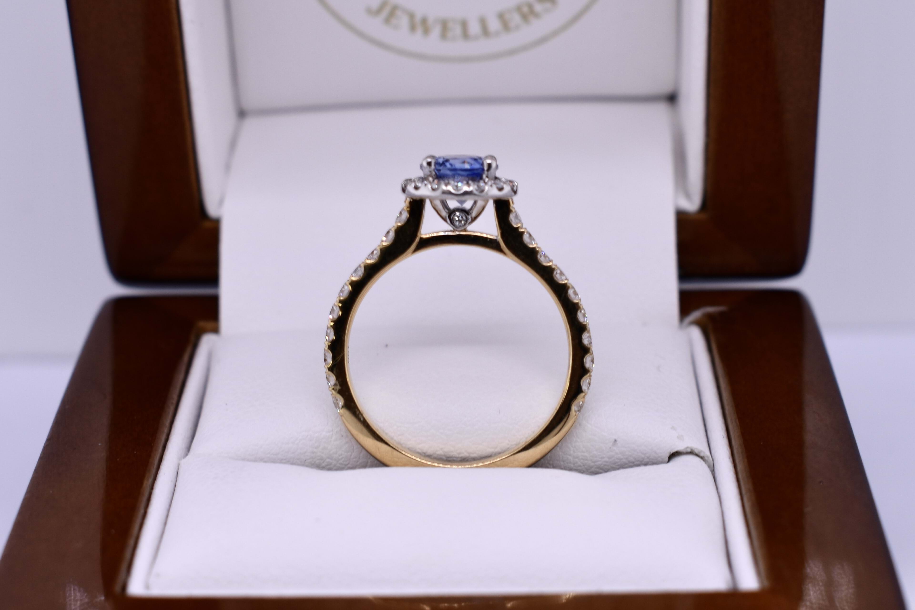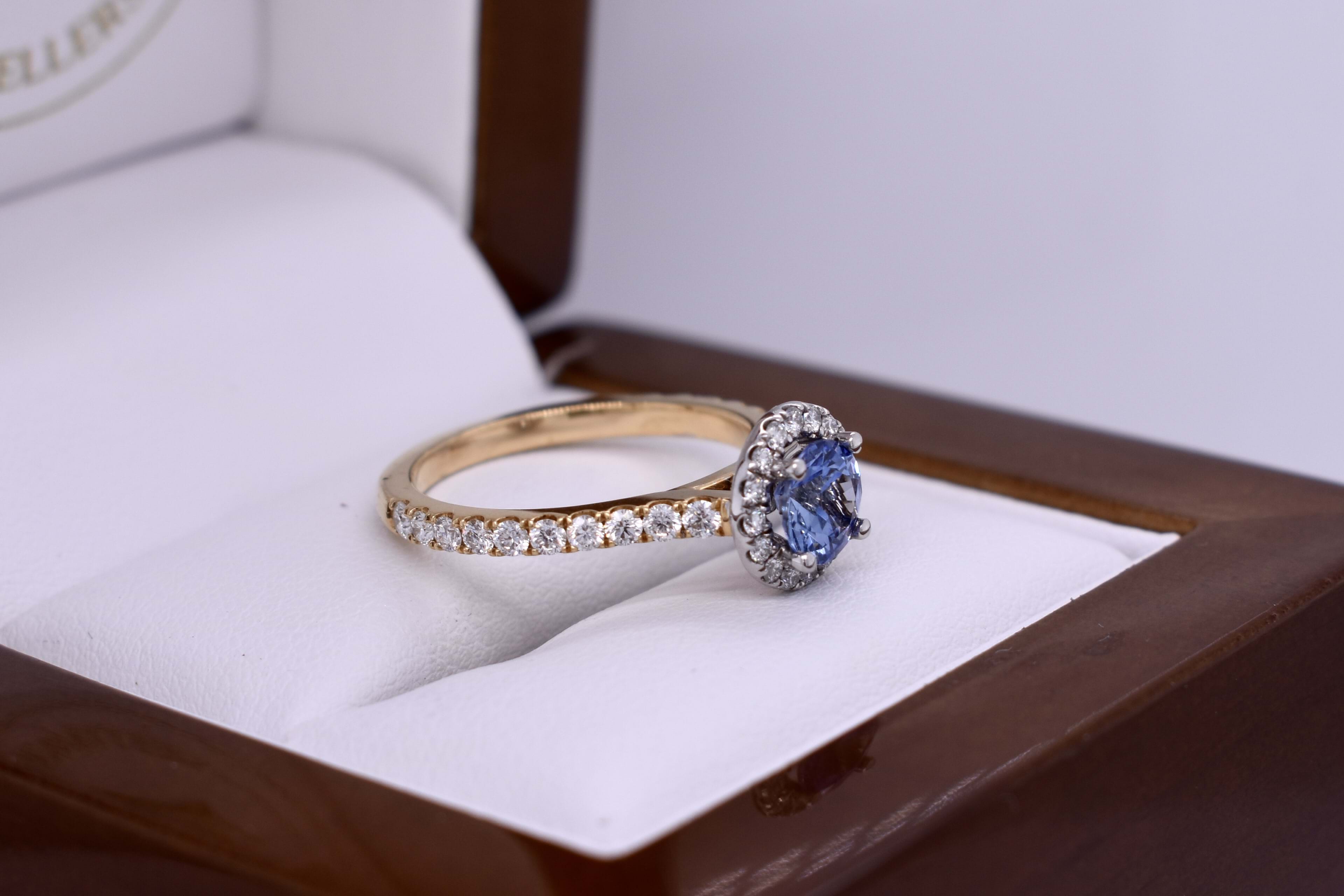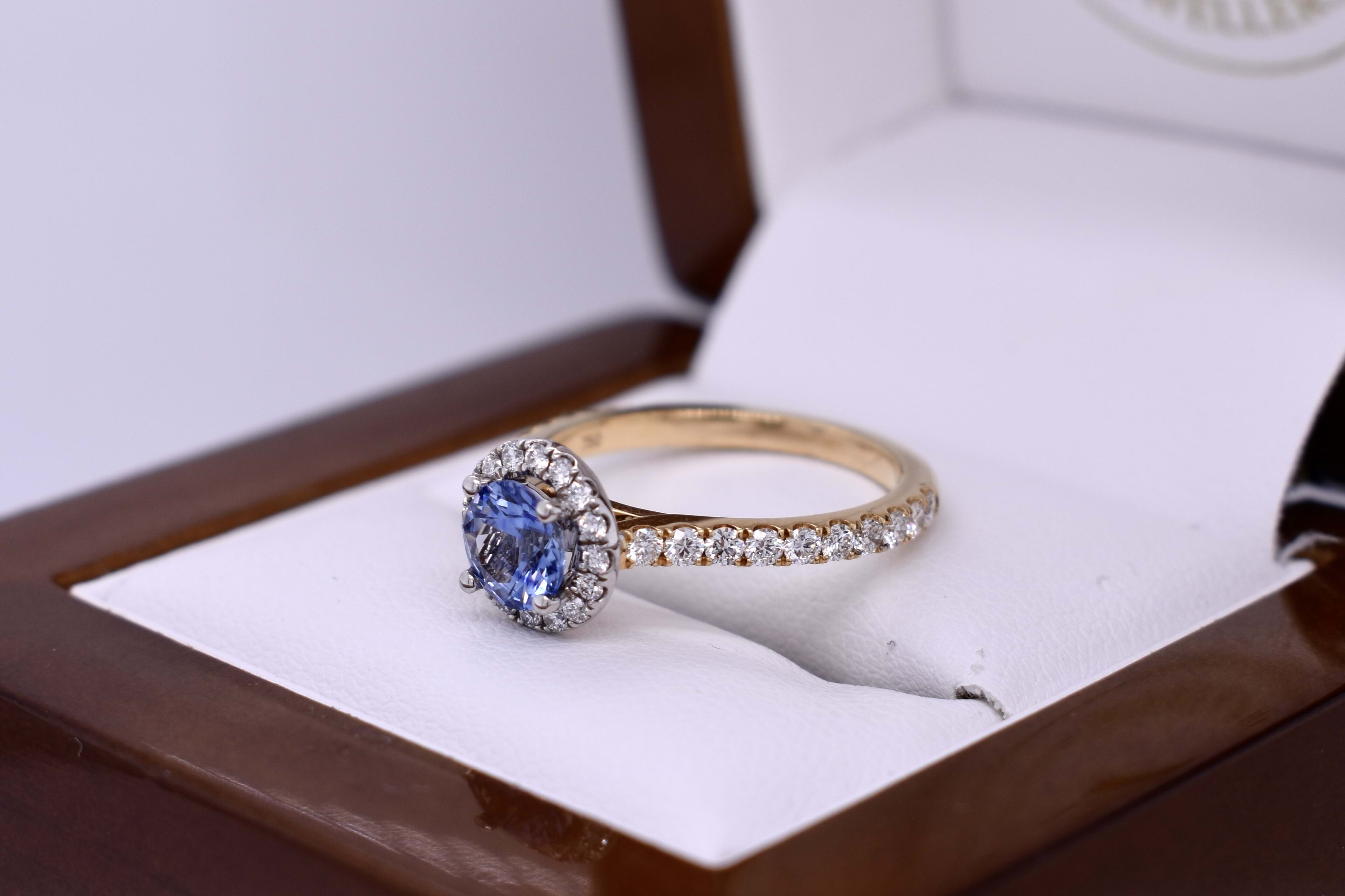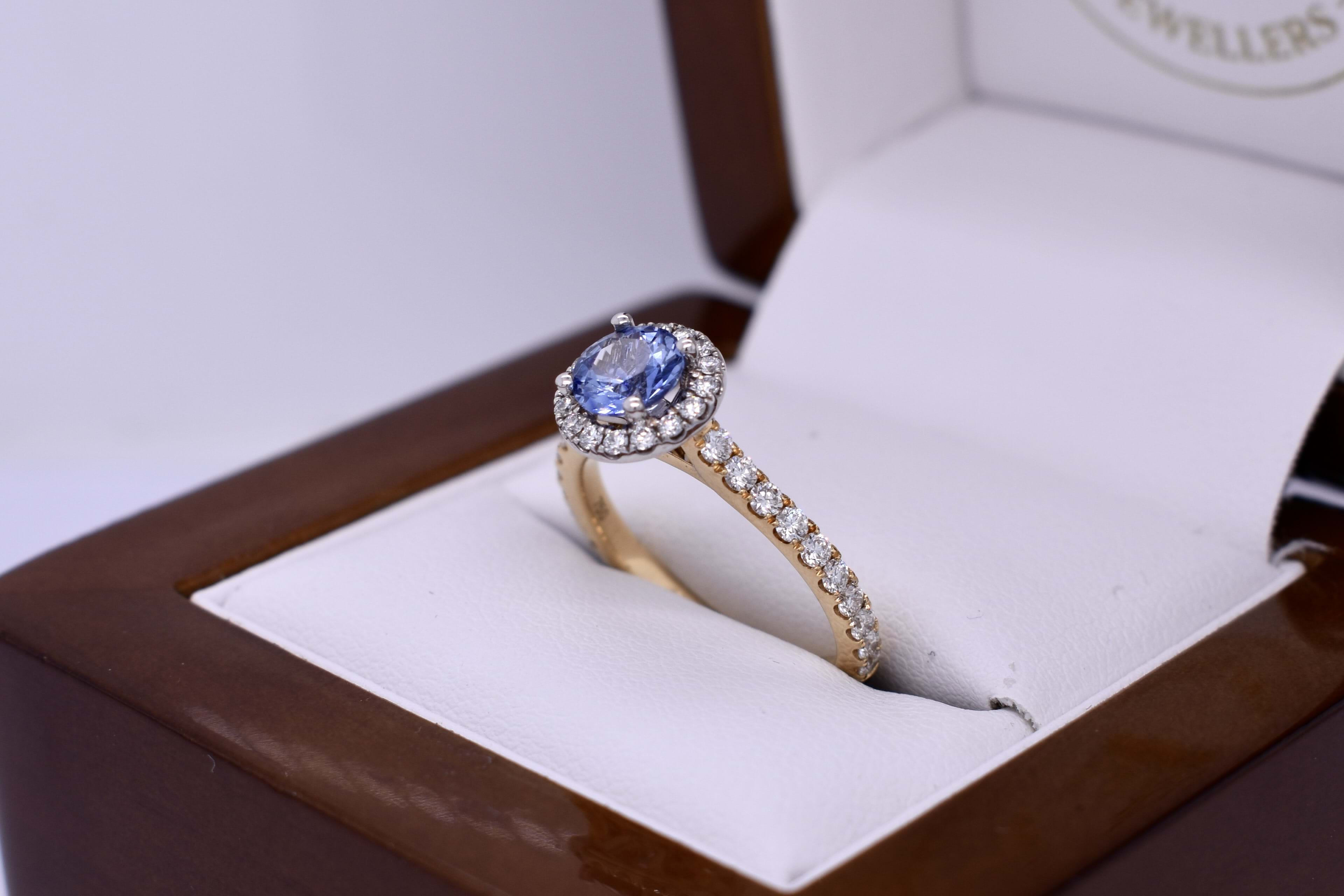 A beautiful pop of colour! This lovely ring is crafted in 18ct yellow gold with a central light purplish blue Ceylon sapphire of 0.87ct, measuring 5.80mm round. Set with a shimmering halo of white round brilliant cut diamonds, sixteen 1.30mm diamonds around the sapphire equalling 0.16ct, a further twenty 1.60mmclaw set down the shoulders weighing 0.34ct, and two 1.00mm set in the v style gallery equalling 0.01ct G SI. Completed on a 1.88mm half round band. Total of 38 diamonds totalling 0.51ct G SI. Finger size L. Independent Valuation Supplied.