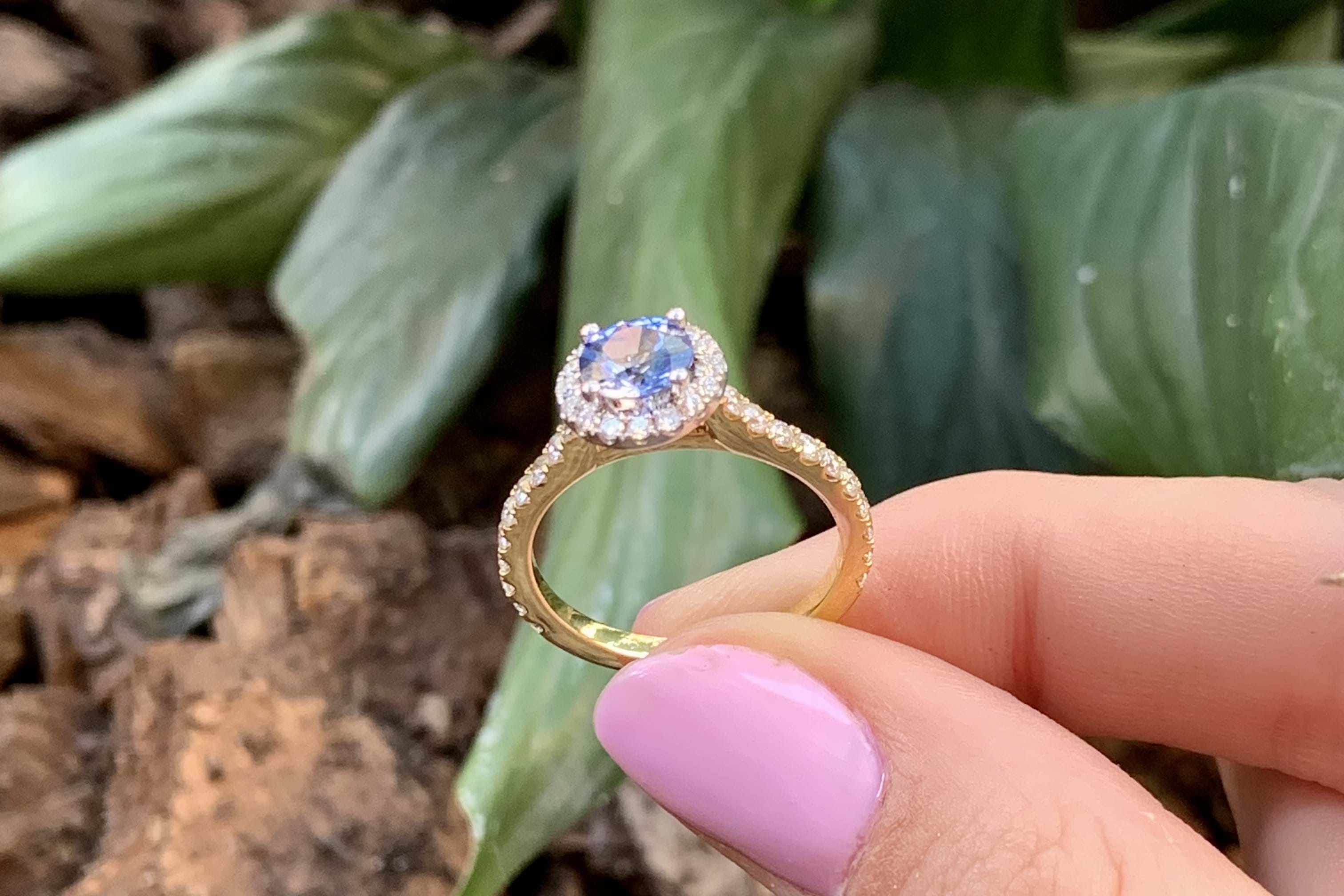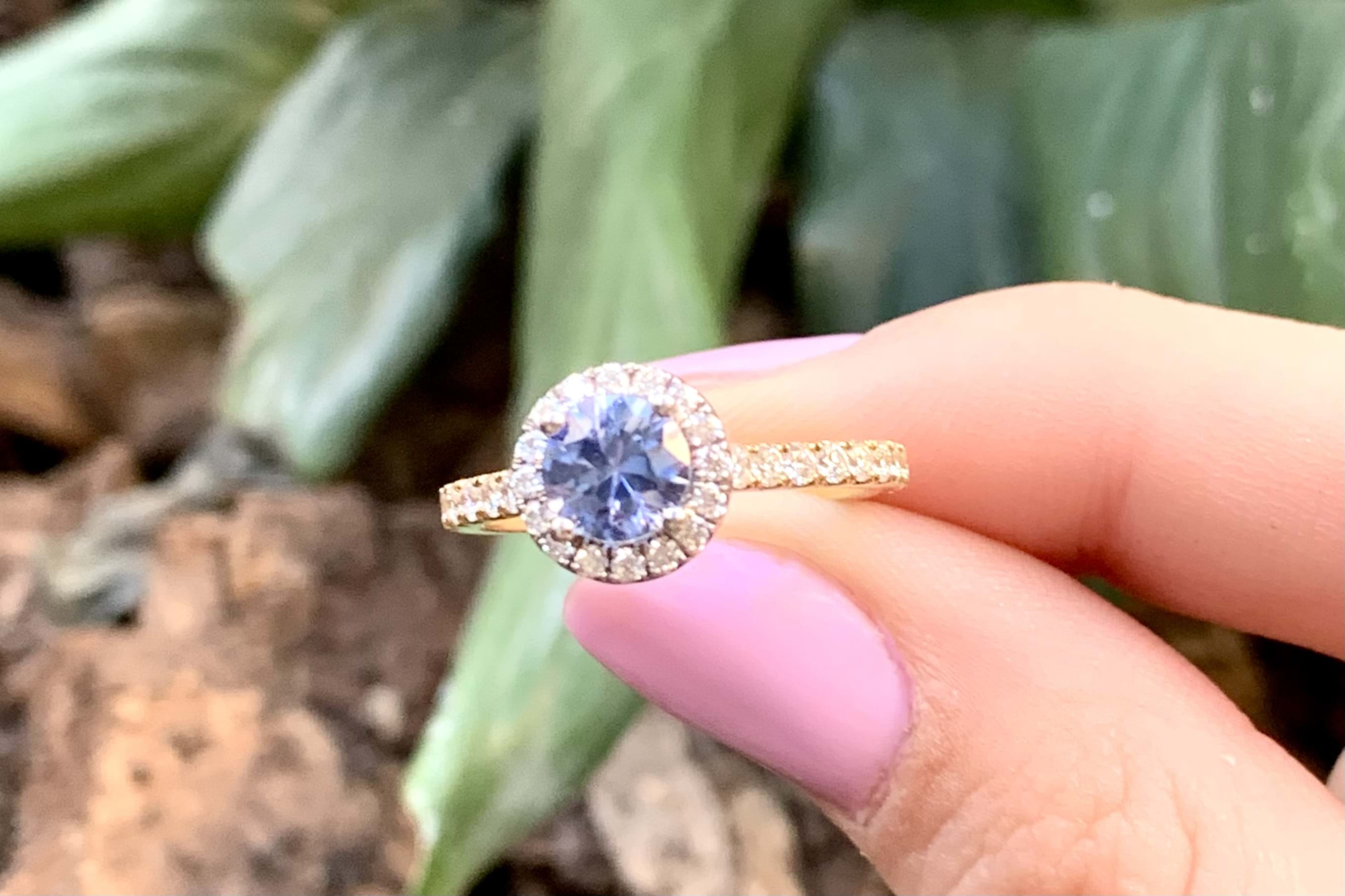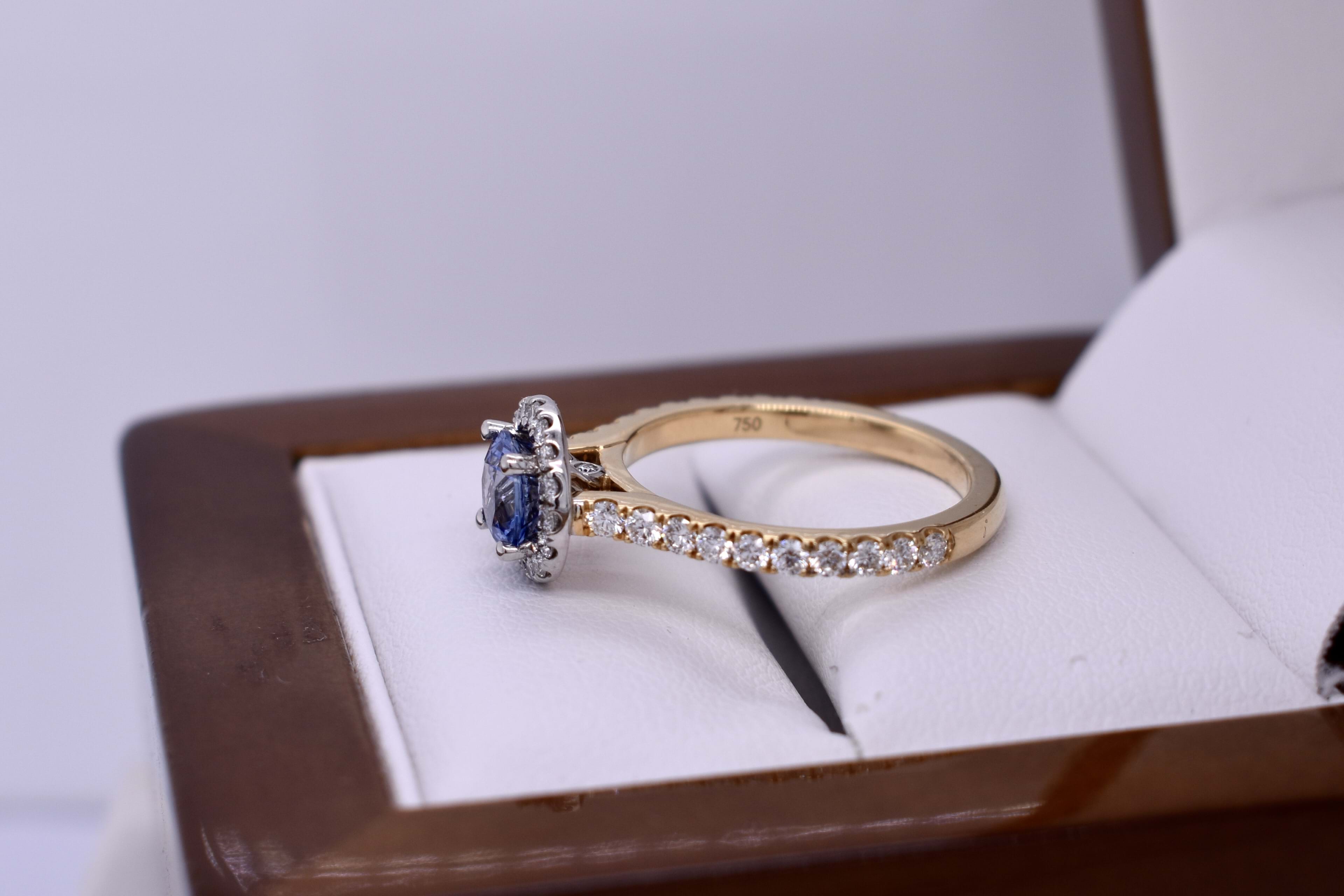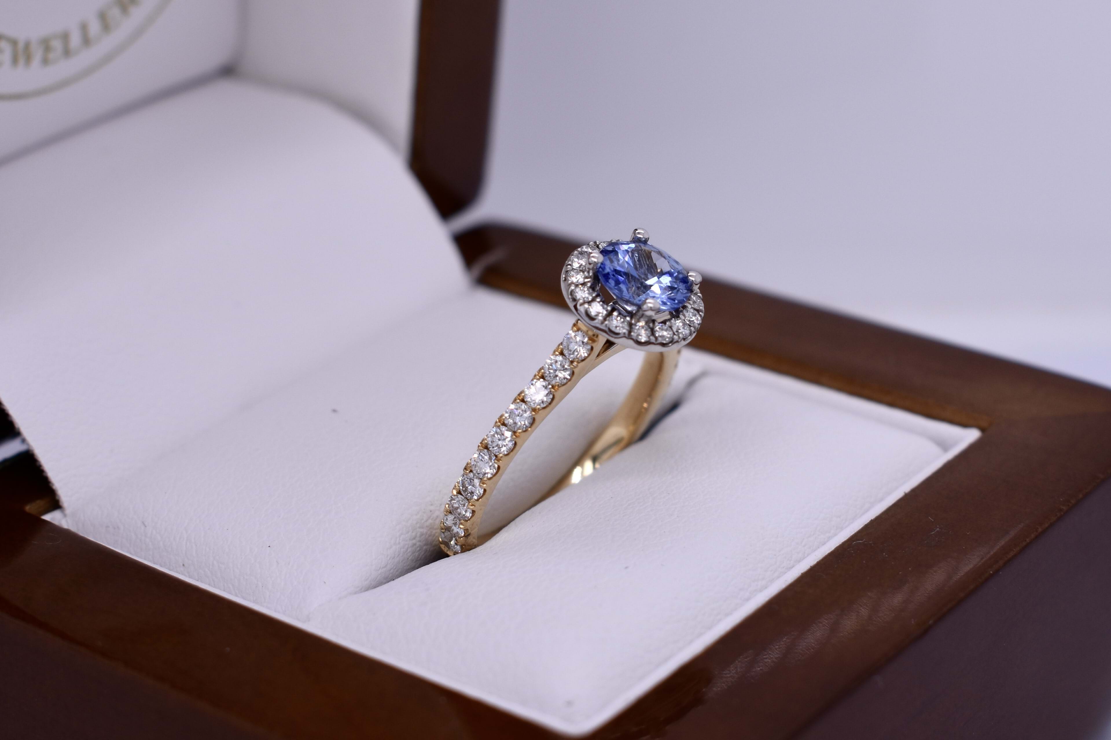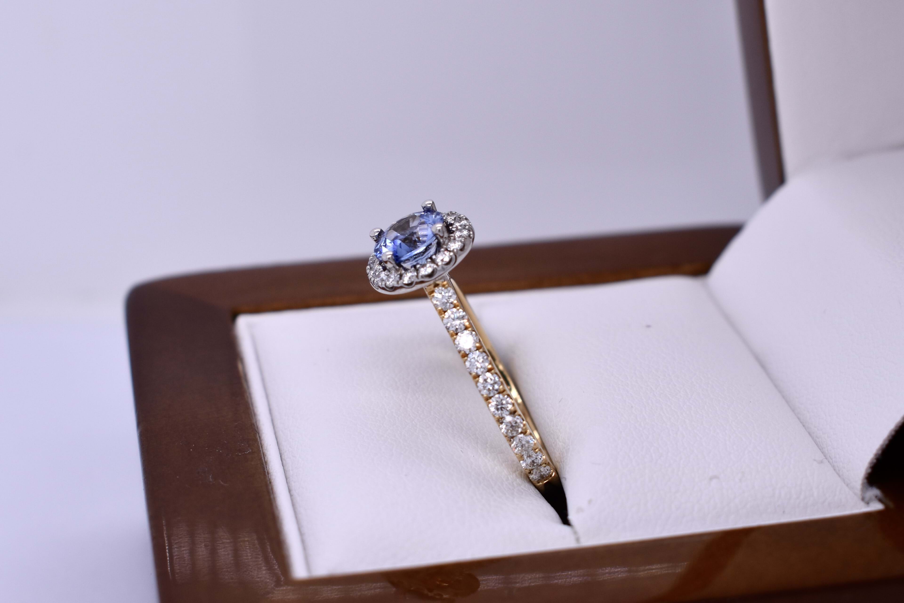 A beautiful pop of colour! This lovely ring is crafted in 18ct yellow gold with a central light purplish blue Ceylon sapphire of 0.87ct, measuring 5.80mm round. Set with a shimmering halo of white round brilliant cut diamonds, sixteen 1.30mm diamonds around the sapphire equalling 0.16ct, a further twenty 1.60mmclaw set down the shoulders weighing 0.34ct, and two 1.00mm set in the v style gallery equalling 0.01ct G SI. Completed on a 1.88mm half round band. Total of 38 diamonds totalling 0.51ct G SI. Finger size L. Independent Valuation Supplied.
