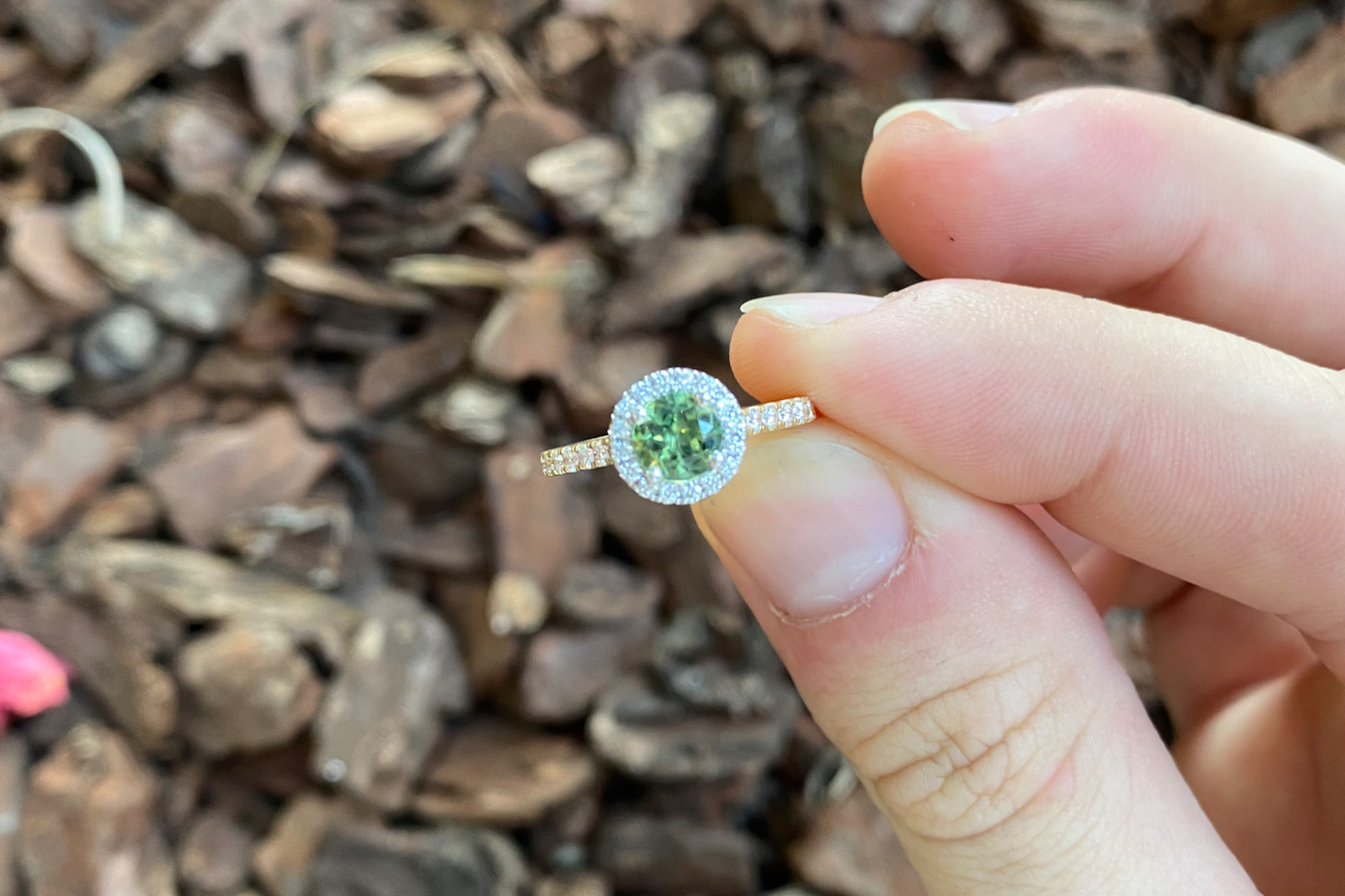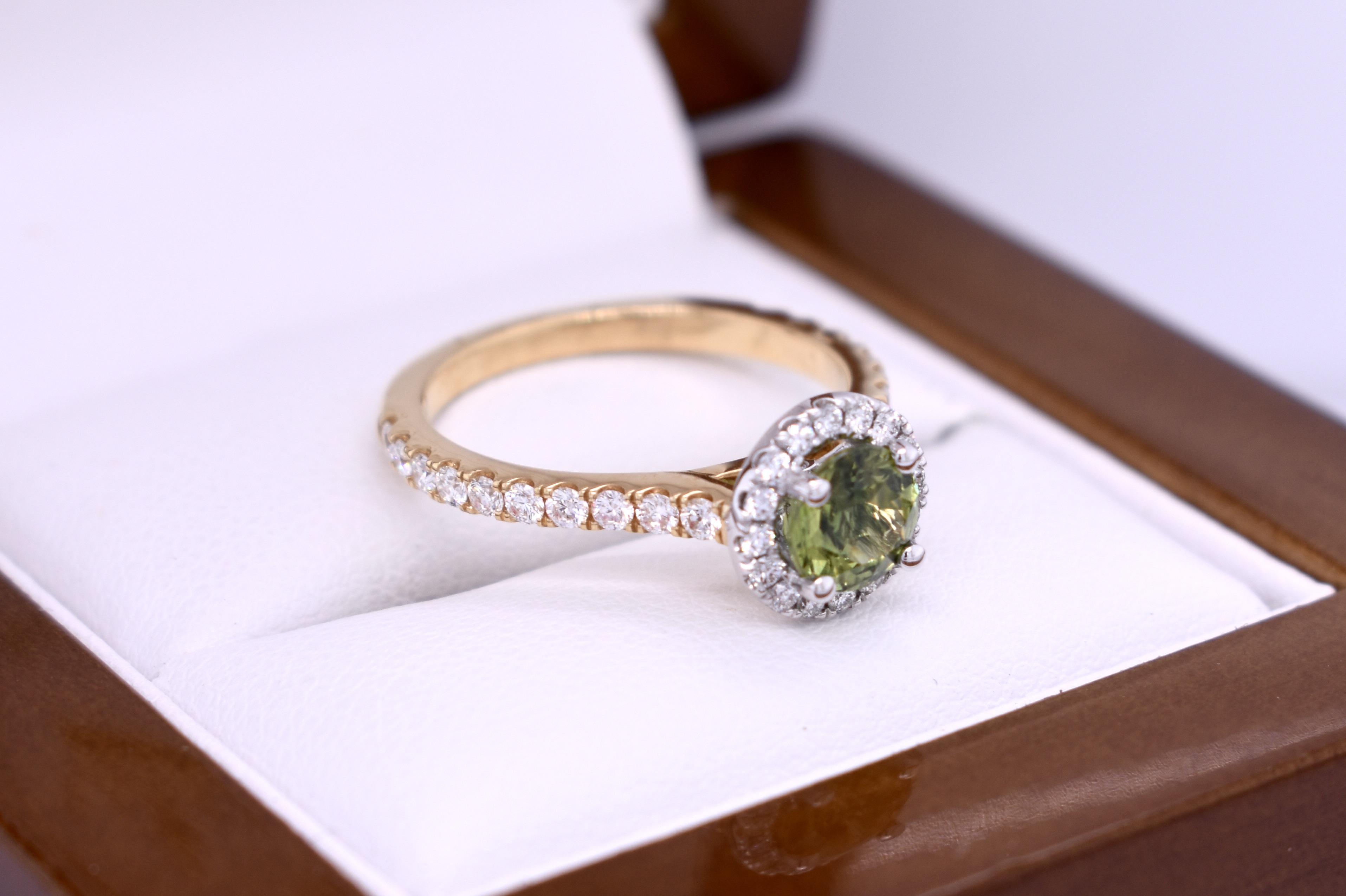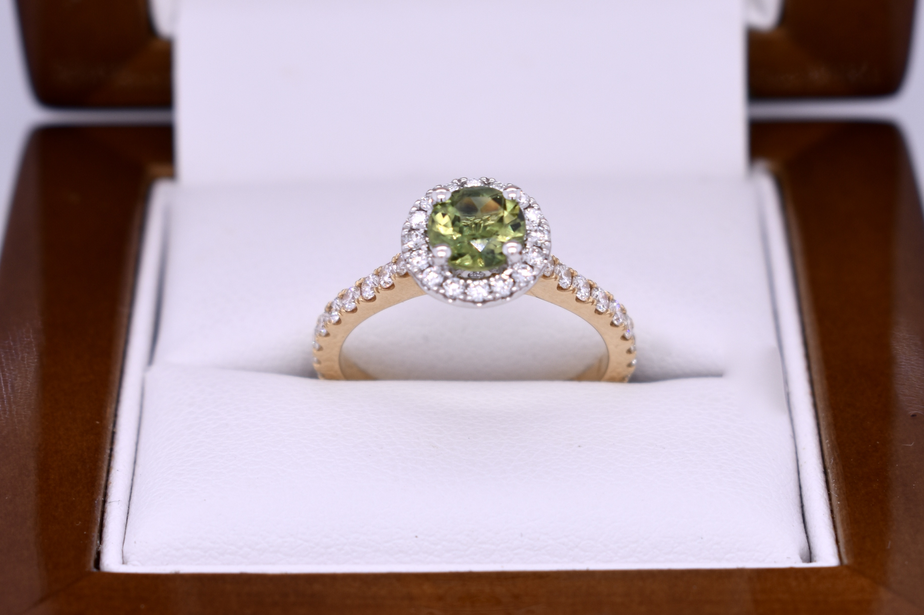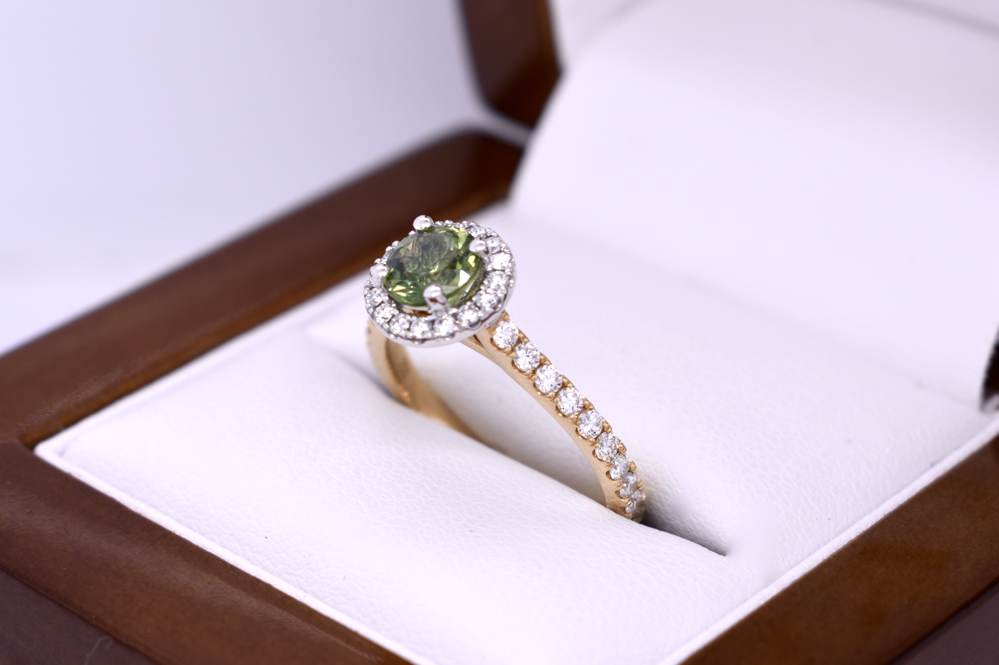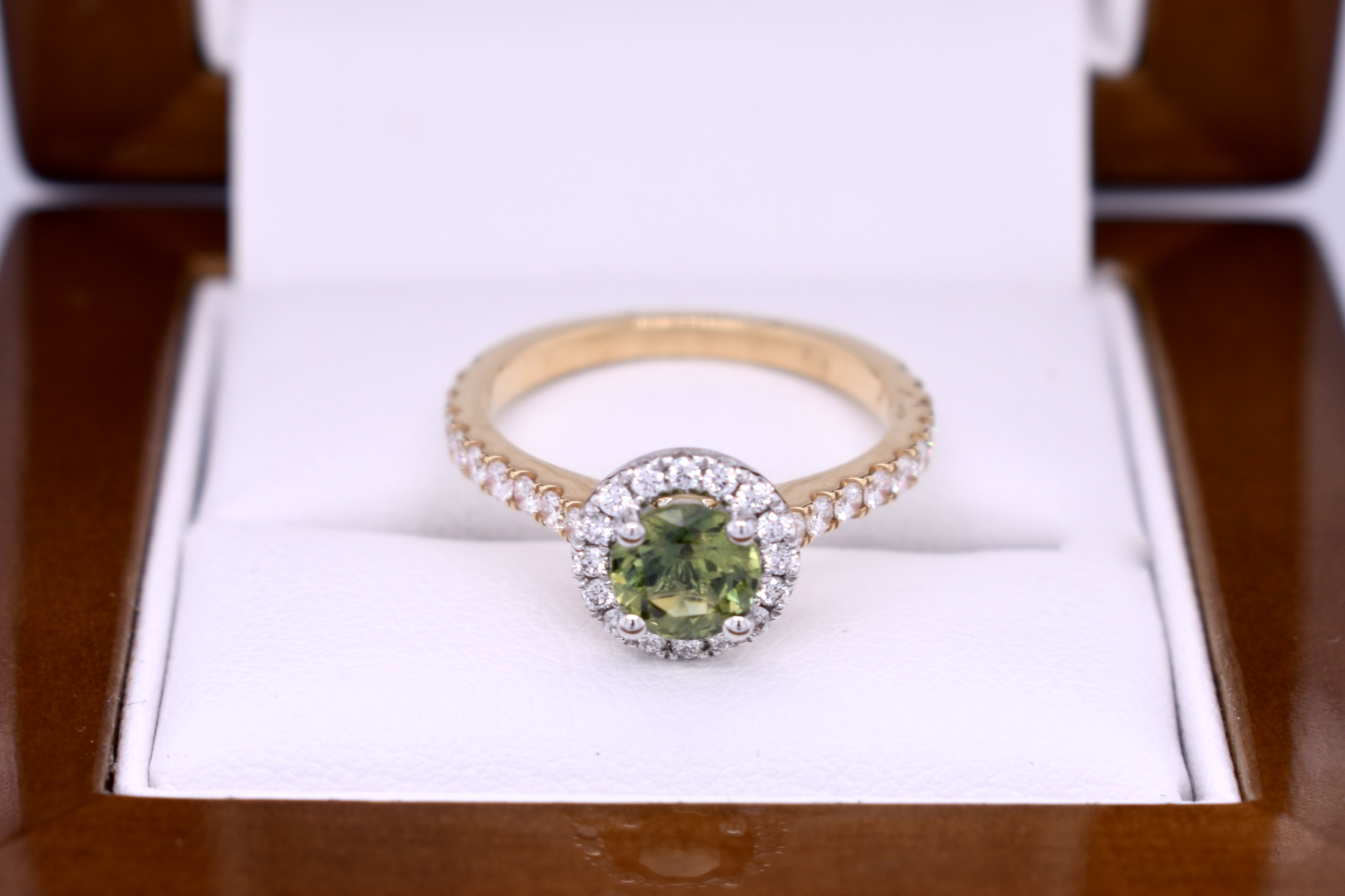 This eye-catching 18ct yellow gold ring has a round green Australian parti sapphire in the centre, weighing 0.90ct. Surrounded by a shimmering halo of round brilliant cut diamonds which continue down the band and one bezel set in the collet. Total of 38 diamonds with a combined weight of 0.51ct FG SI. This ring has a built in under rail. Finger size L.