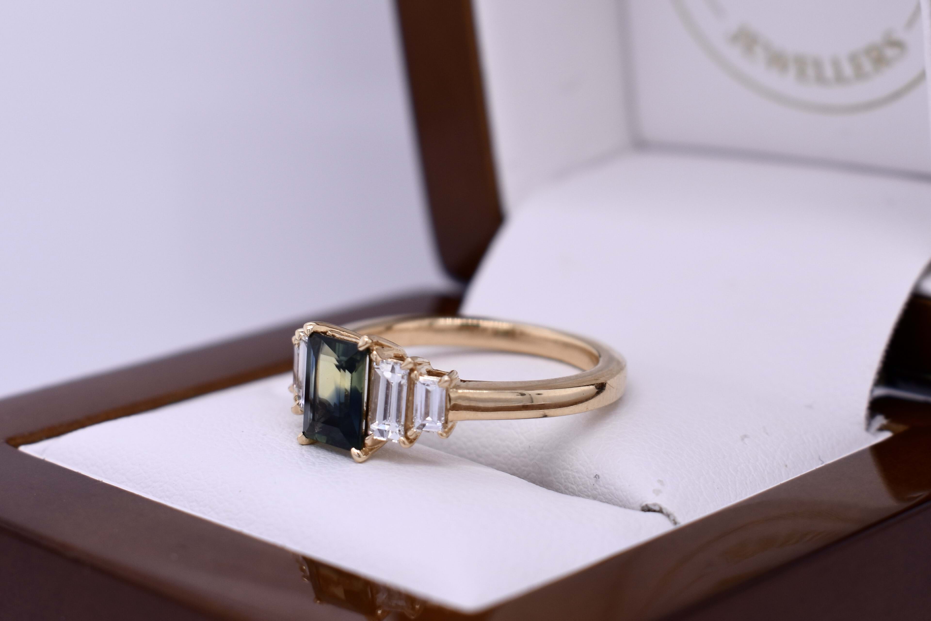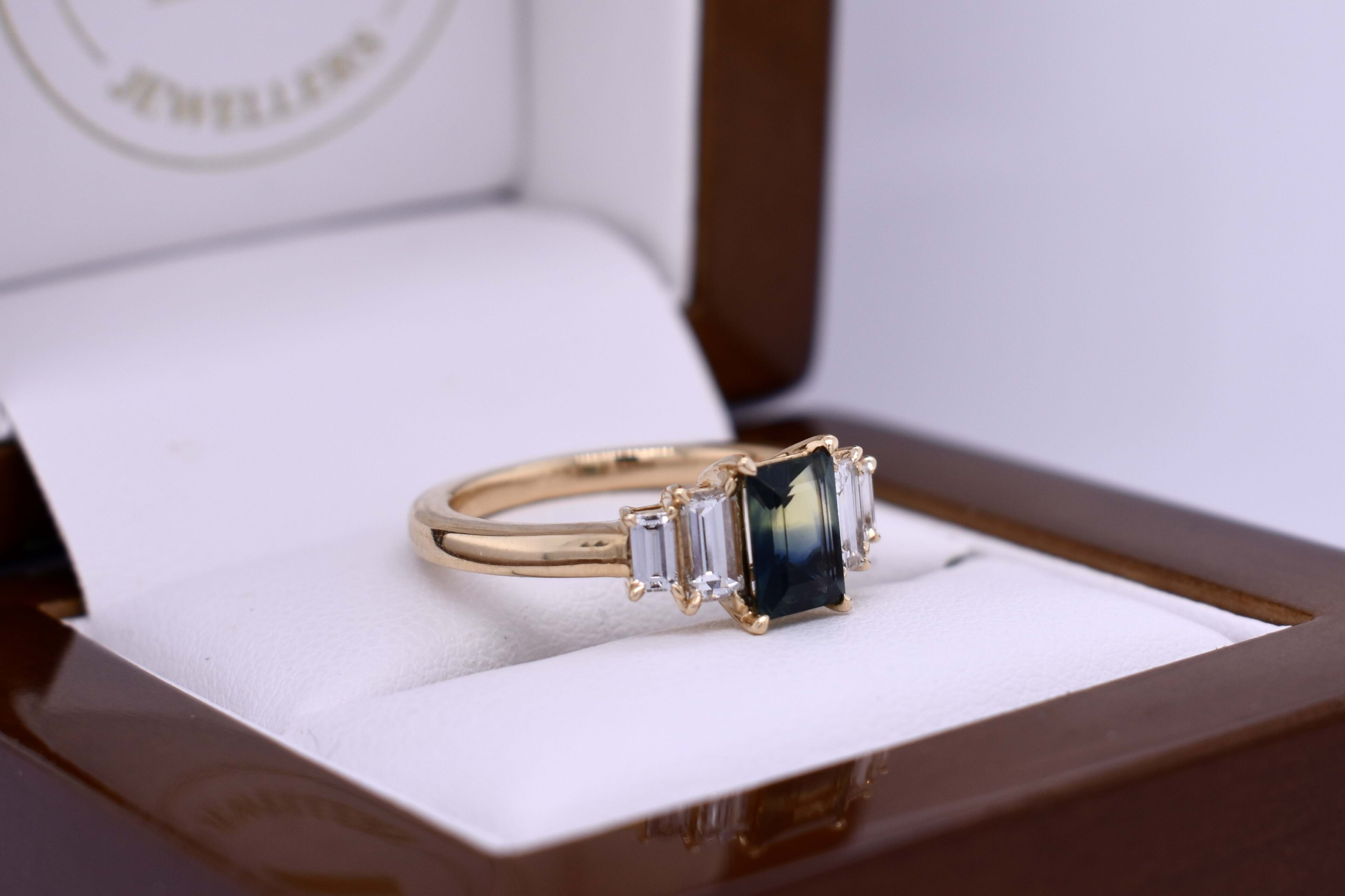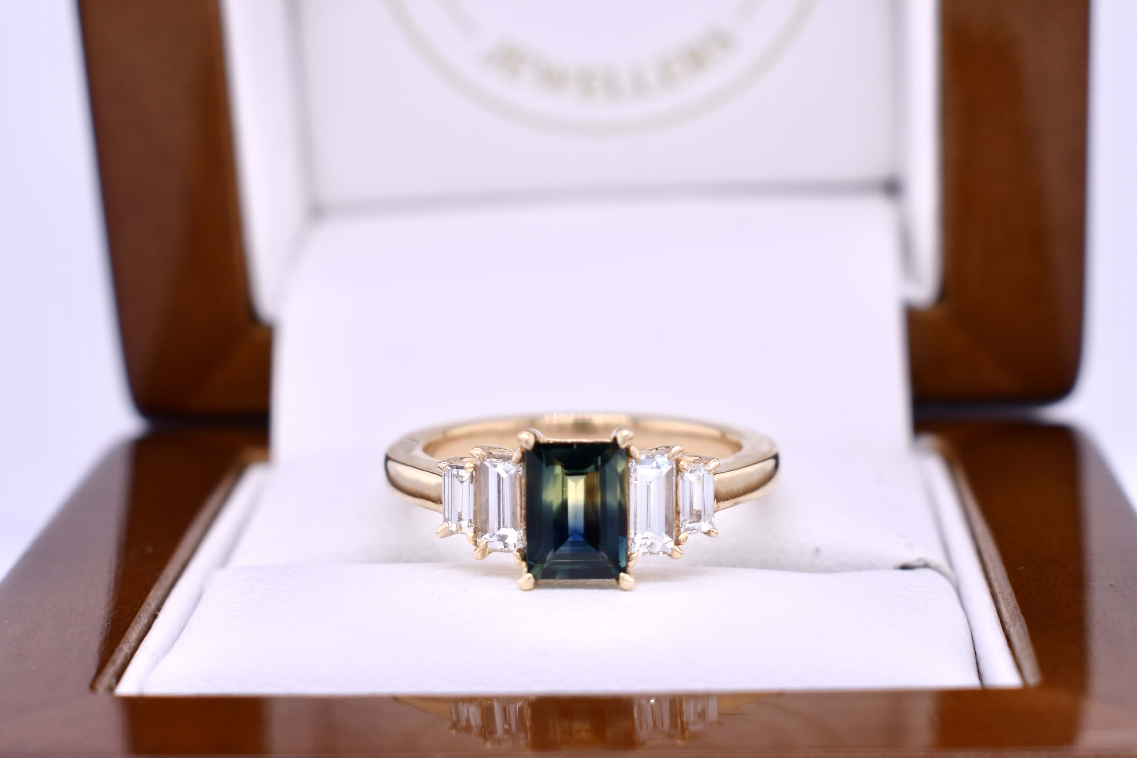 This wonderful ring features a bright mid blue-light yellow Australian baguette shaped sapphire weighing 1.06ct, four claw set in 18ct yellow gold. Complemented with one 5.0x2.5mm baguette diamond either side, equalling 0.34ct FG VS, followed by a 3.4x2.0mm baguette diamond each side, equalling 0.20ct FG VS. Total diamond weight 0.54ct. Completed on a plain gold 2.12mm band. Finger size M. Independent Valuation Supplied.