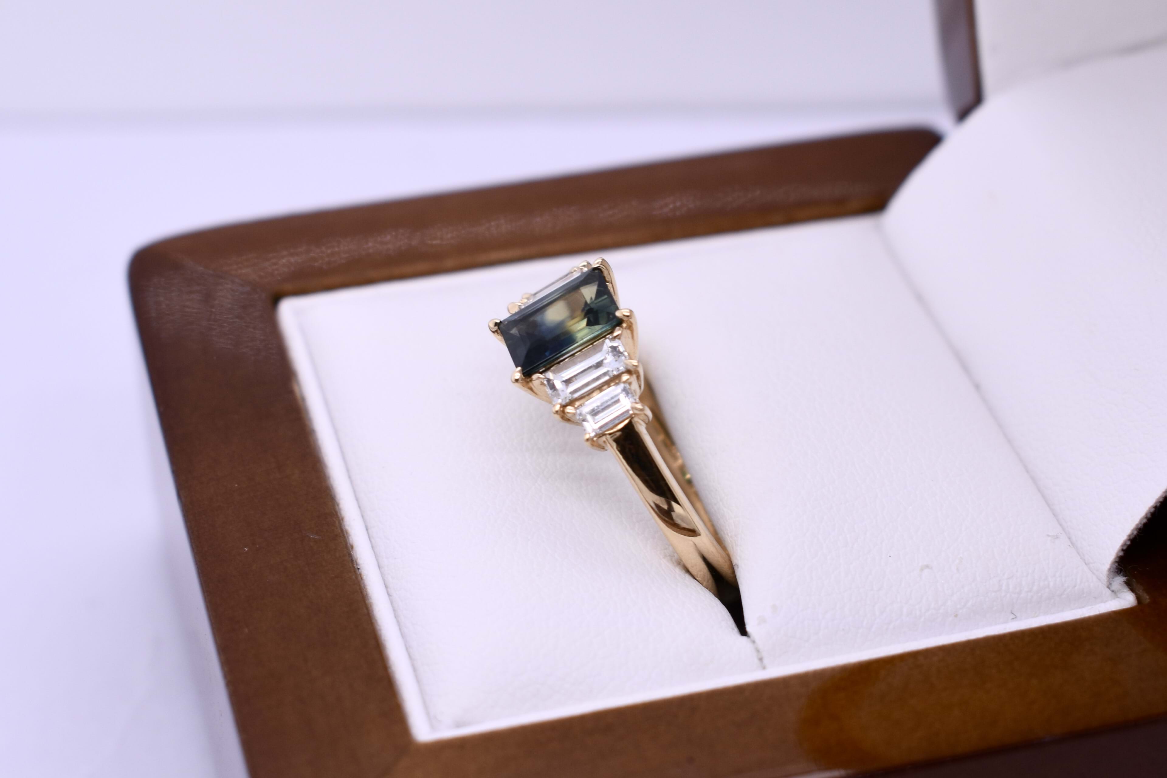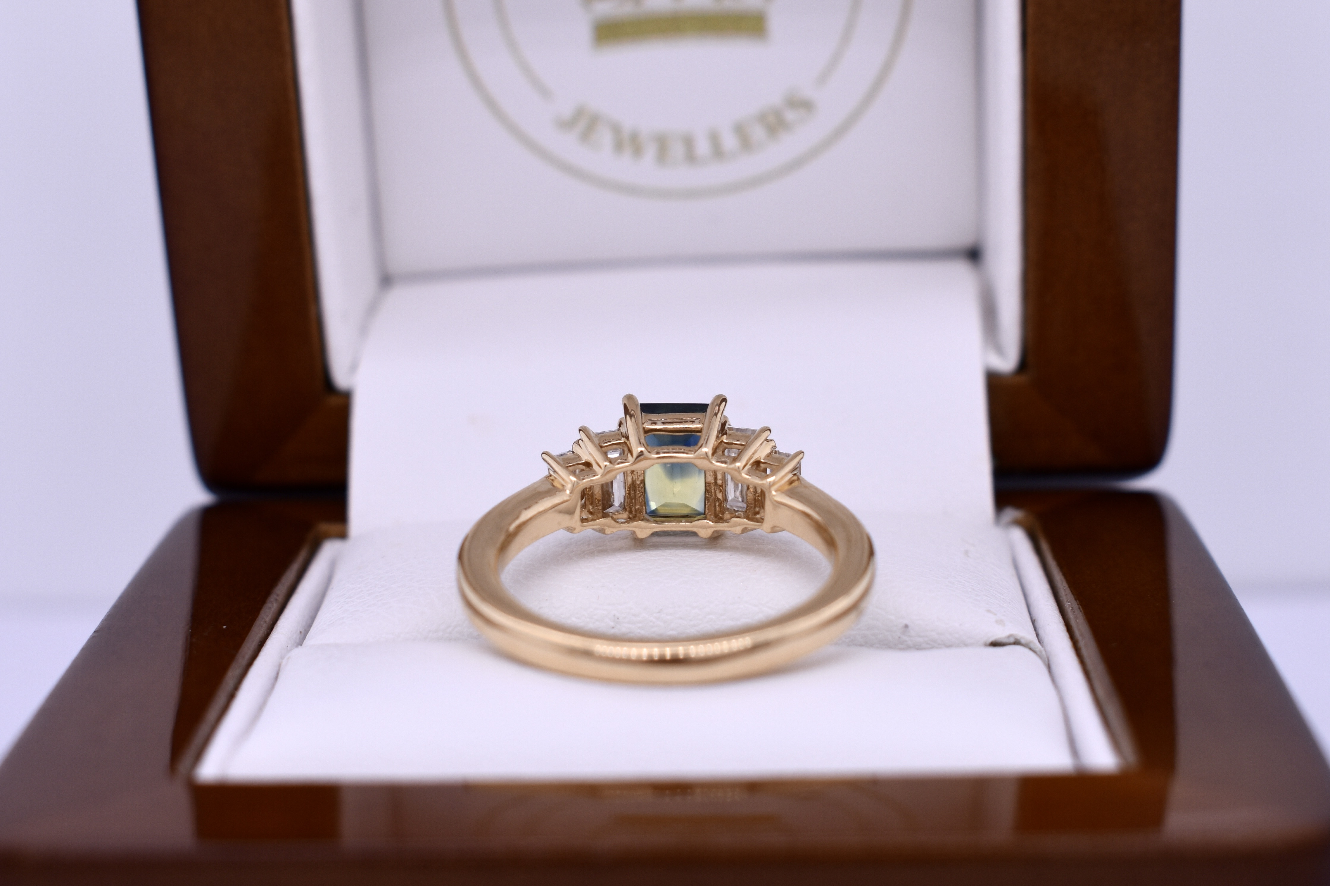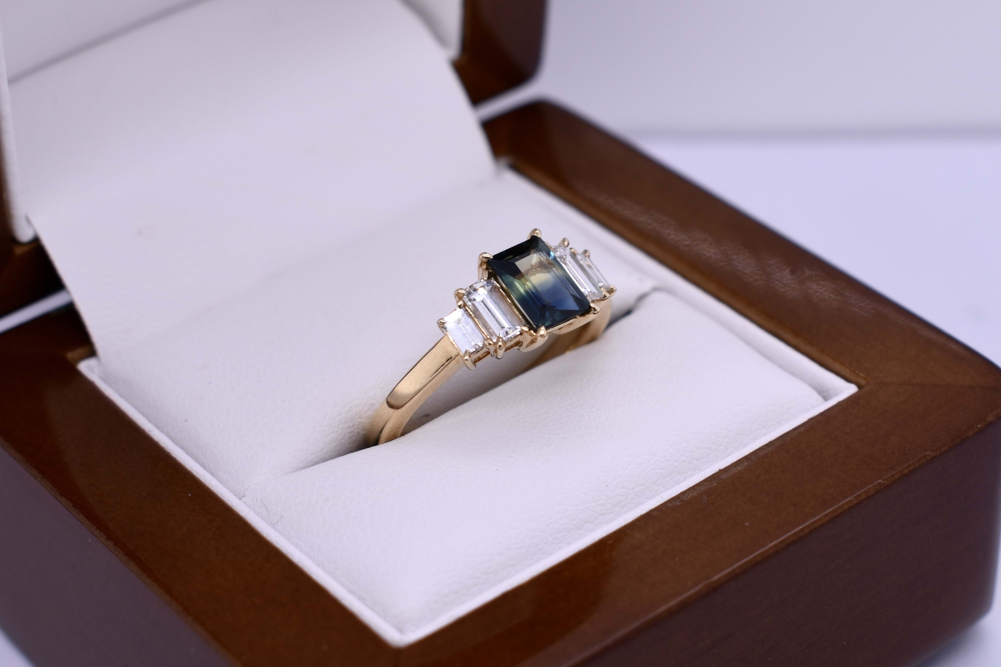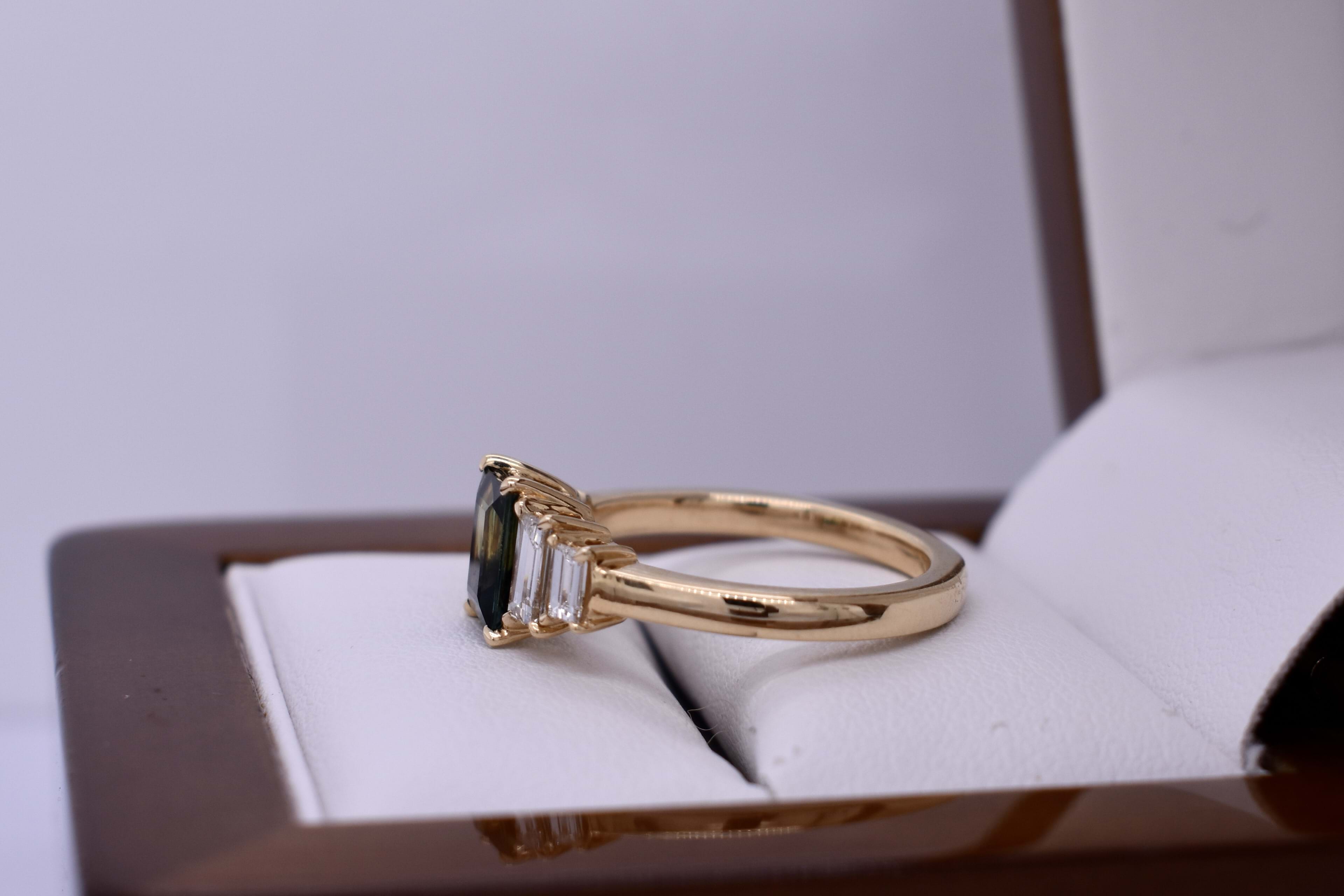 This wonderful ring features a bright mid blue-light yellow Australian baguette shaped sapphire weighing 1.06ct, four claw set in 18ct yellow gold. Complemented with one 5.0x2.5mm baguette diamond either side, equalling 0.34ct FG VS, followed by a 3.4x2.0mm baguette diamond each side, equalling 0.20ct FG VS. Total diamond weight 0.54ct. Completed on a plain gold 2.12mm band. Finger size M. Independent Valuation Supplied.