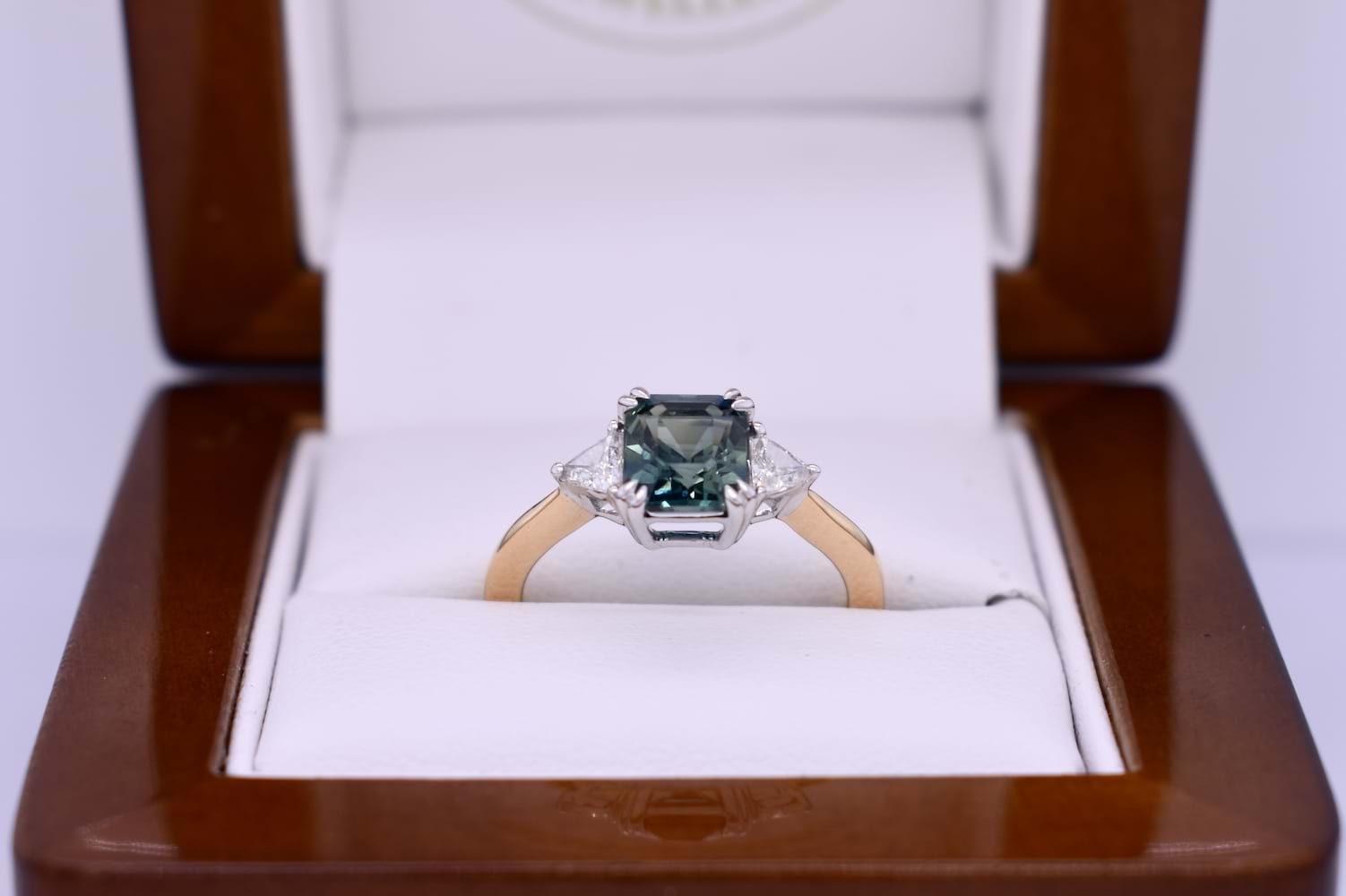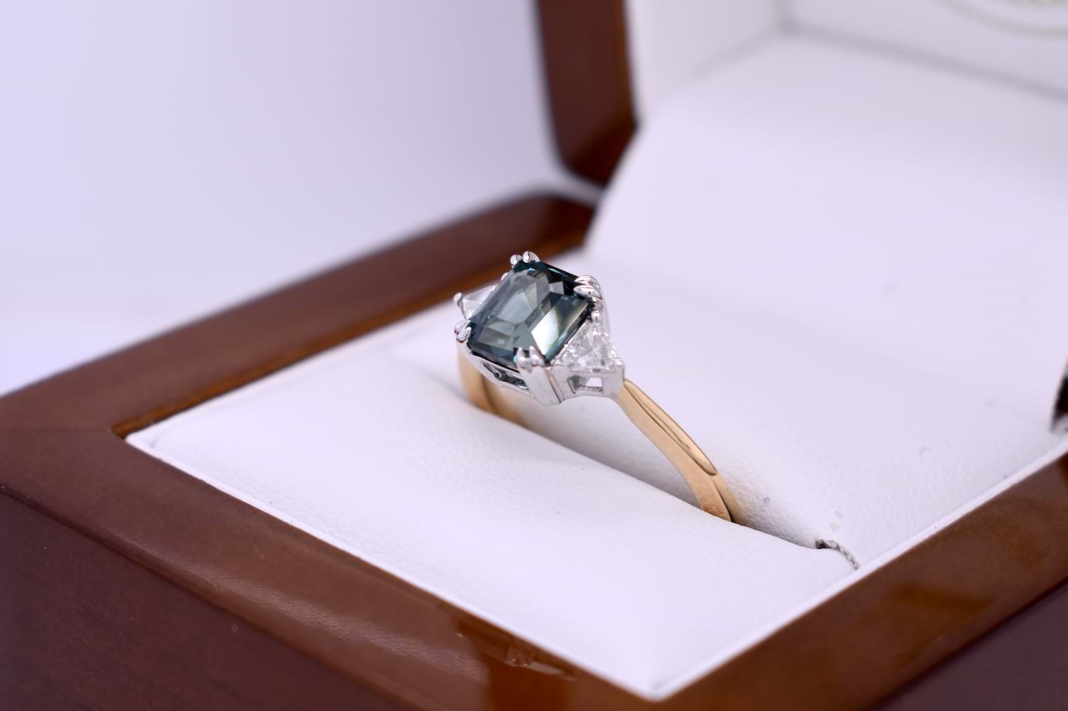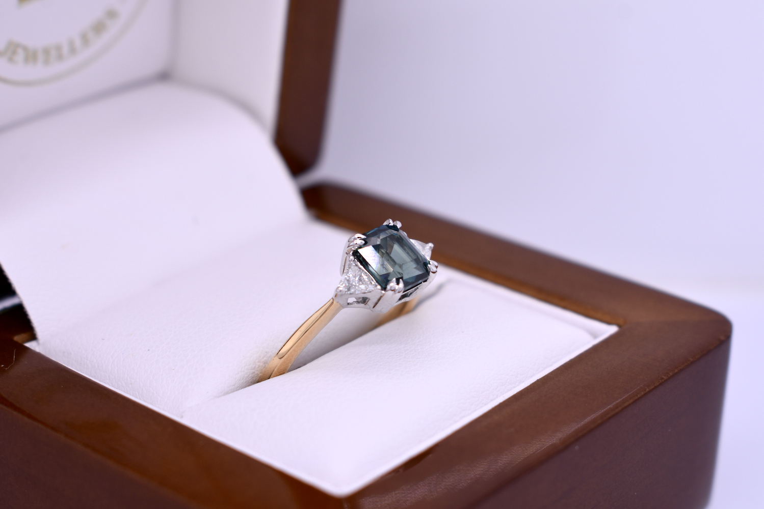 This elegant ring features a central emerald cut teal Madagascan sapphire of 2.07ct, four claw set in white gold, paired with a trilliant white diamond each side. Two diamonds totalling of 0.23ct E VS2. The ring is made with an 18ct yellow gold band and no under rail. Finger size M.