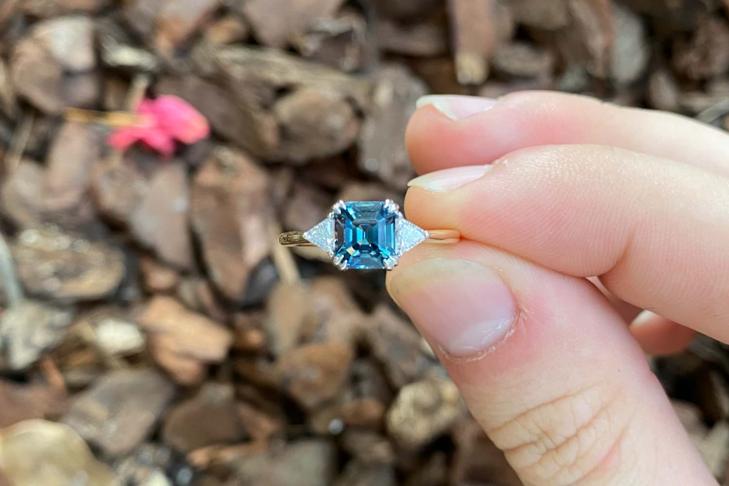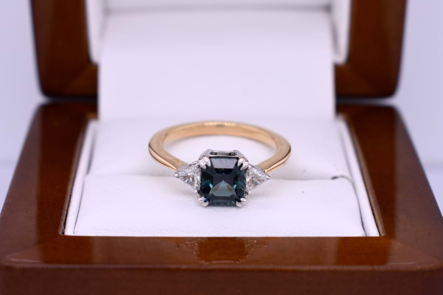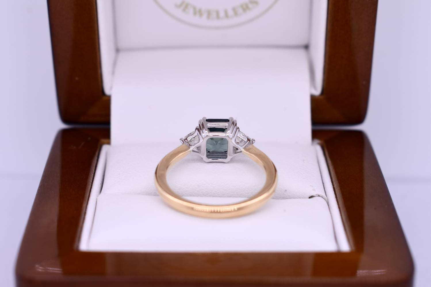 This elegant ring features a central emerald cut teal Madagascan sapphire of 2.07ct, four claw set in white gold, paired with a trilliant white diamond each side. Two diamonds totalling of 0.23ct E VS2. The ring is made with an 18ct yellow gold band and no under rail. Finger size M.