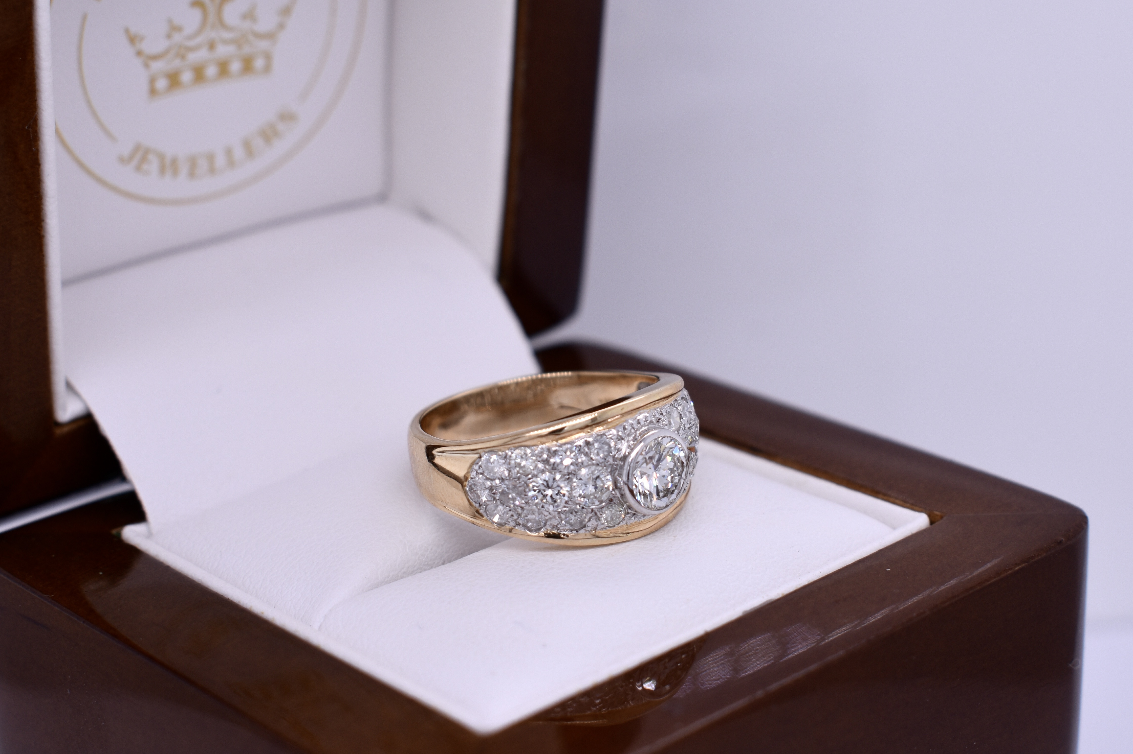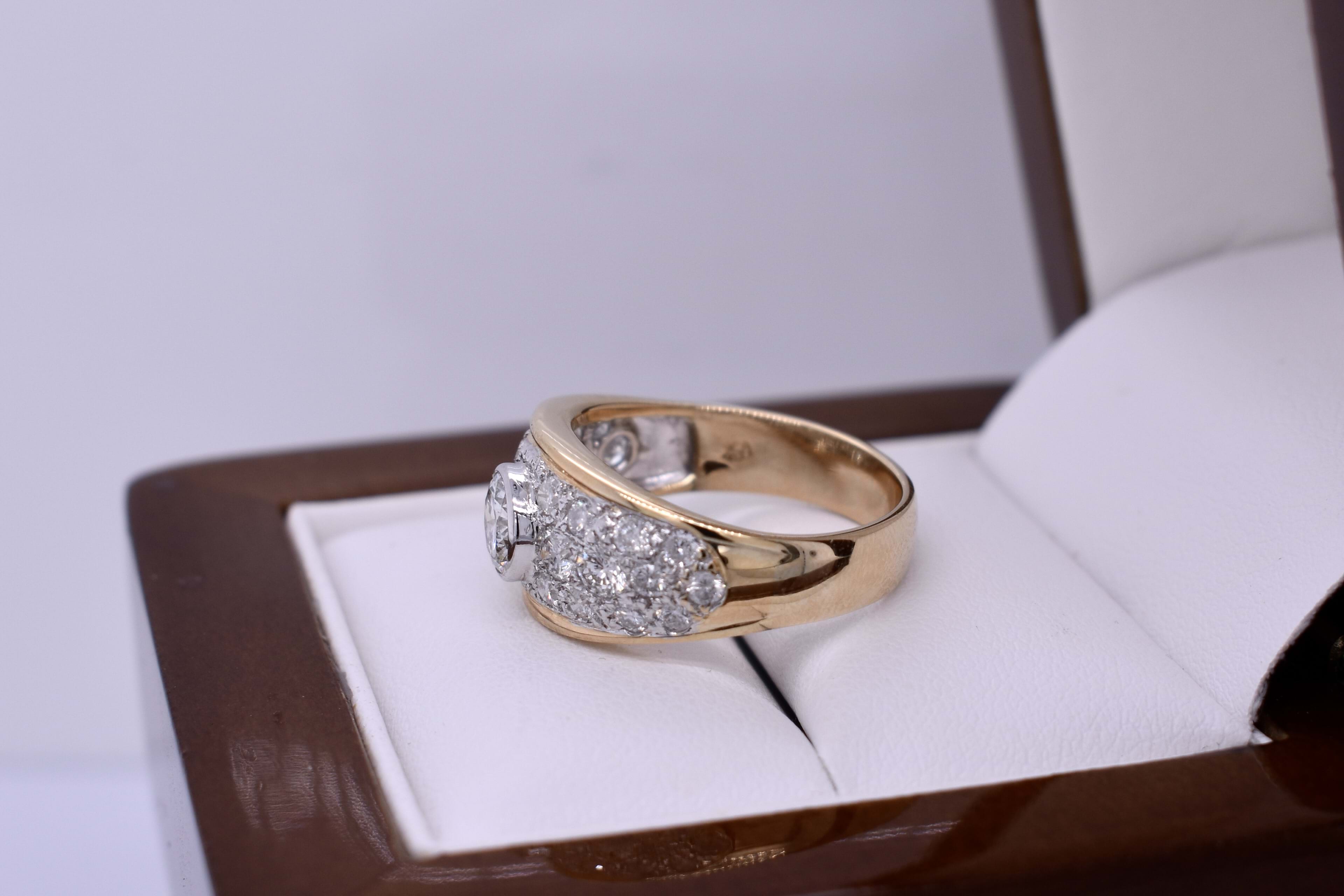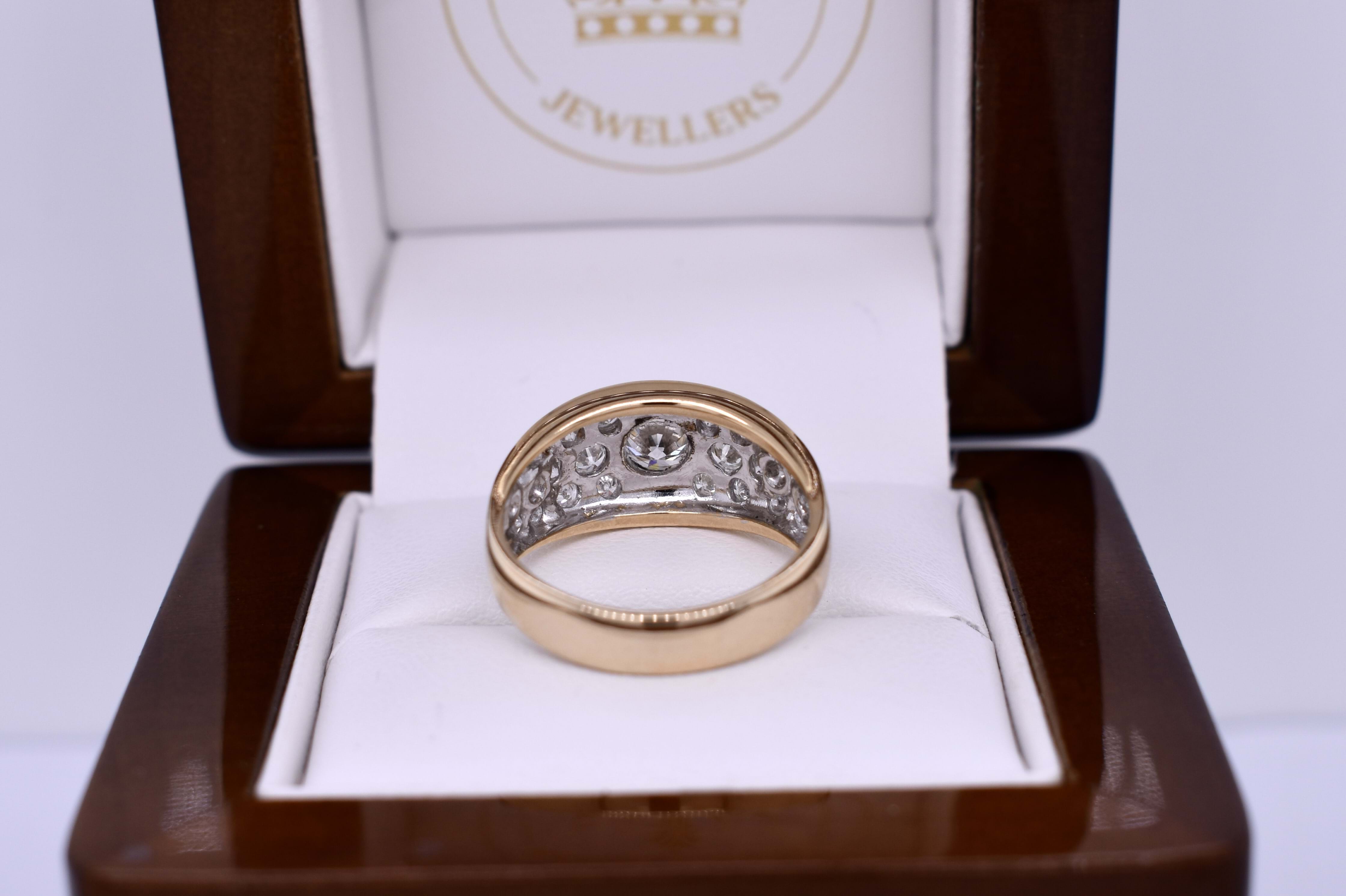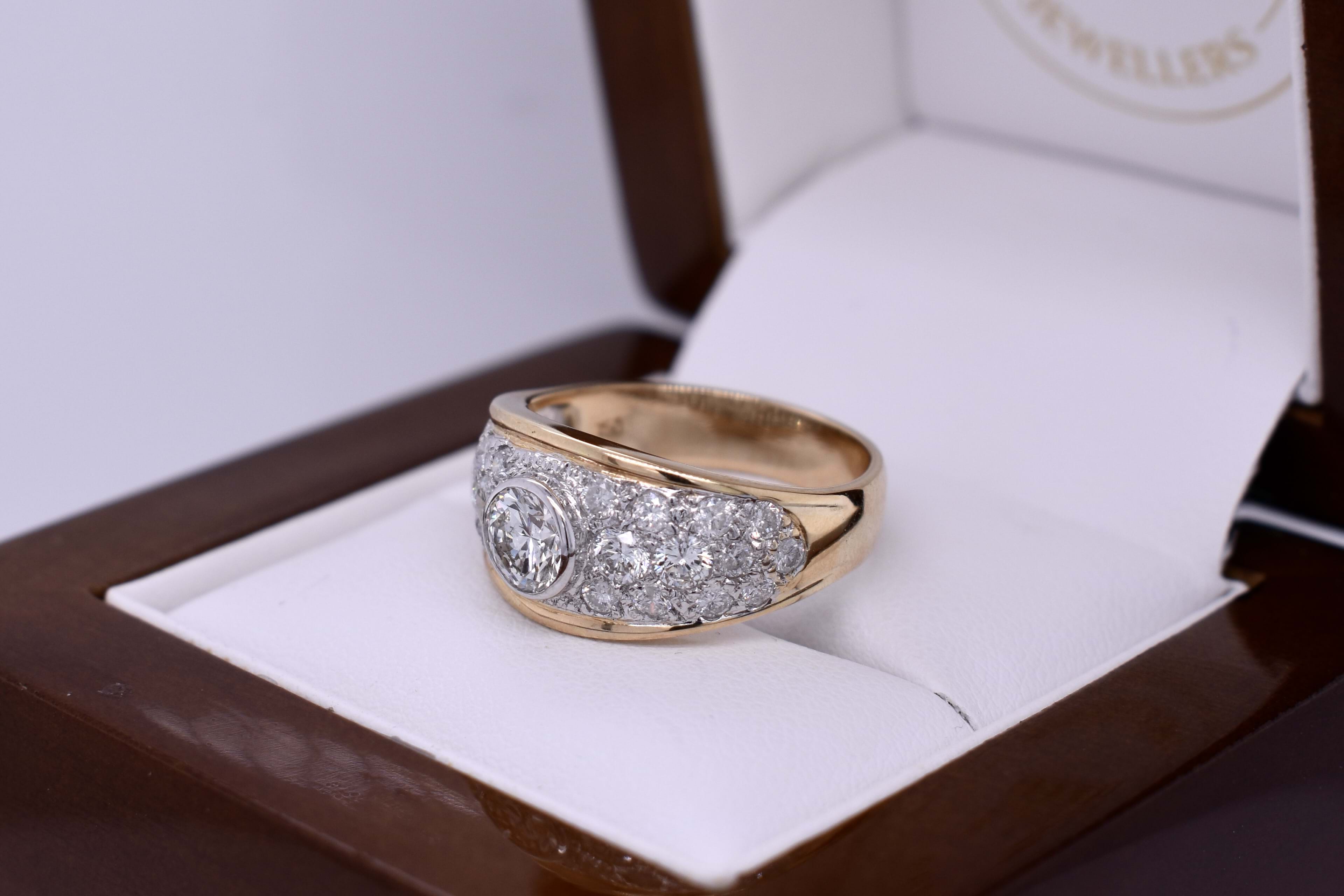Crafted in 18ct yellow gold, this stylish diamond ring features a domed top design cantered around a 0.60ct round brilliant cut diamond, bezel set within a rhodium plated setting to enhance its brightness. Surrounding the centre stone, 24 additional round brilliant cut diamonds are arranged in three pave set rows. Subtle grooved detailing along the outer edges adds small design details to the ring. Total diamond weight of approximately 1.60ct, graded H-J colour and S1-P2 clarity. The band tapers from 10mm to 4.3mm, weighs 5.65grams and is a finger size N. Independent valuation supplied.