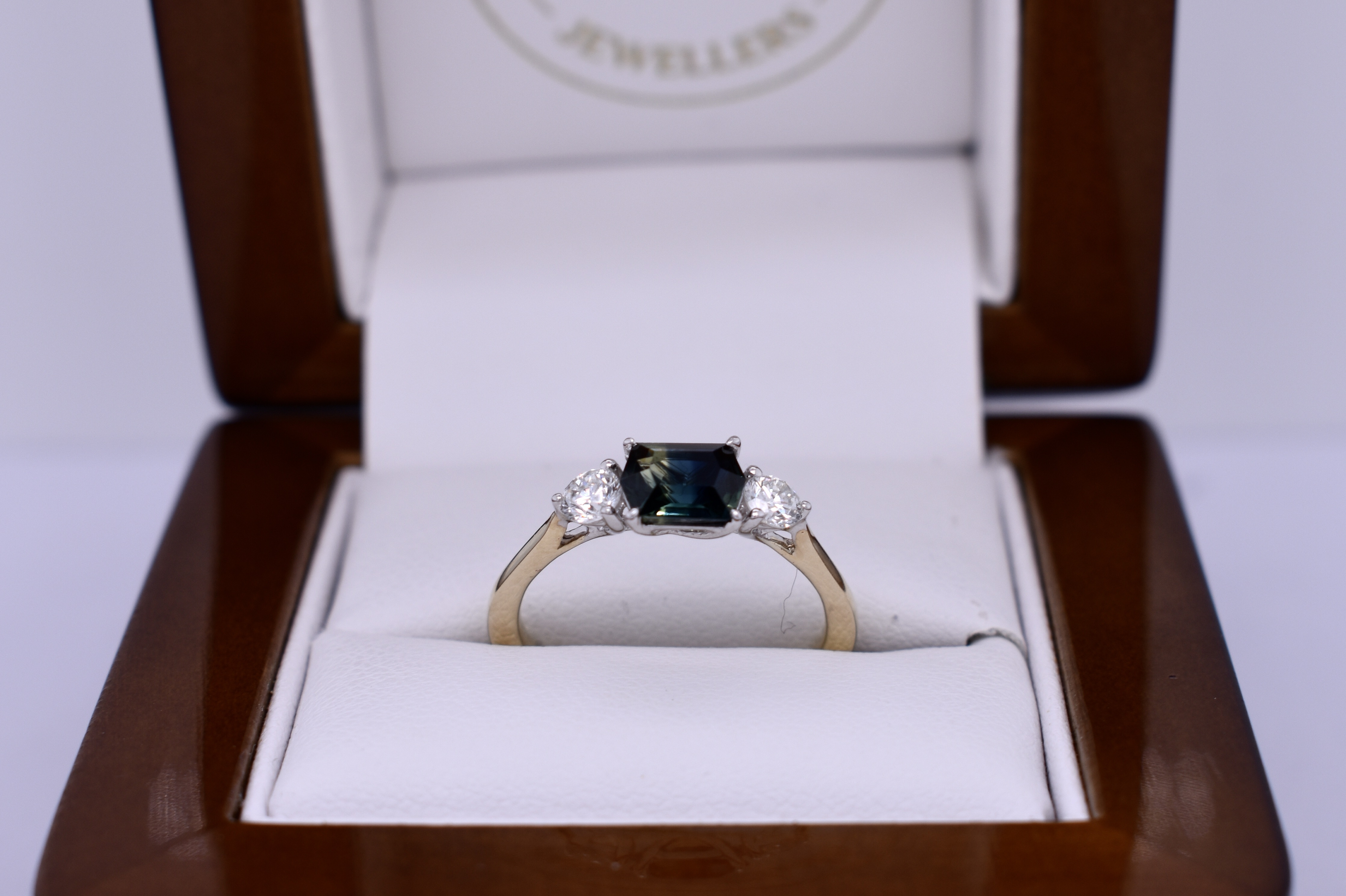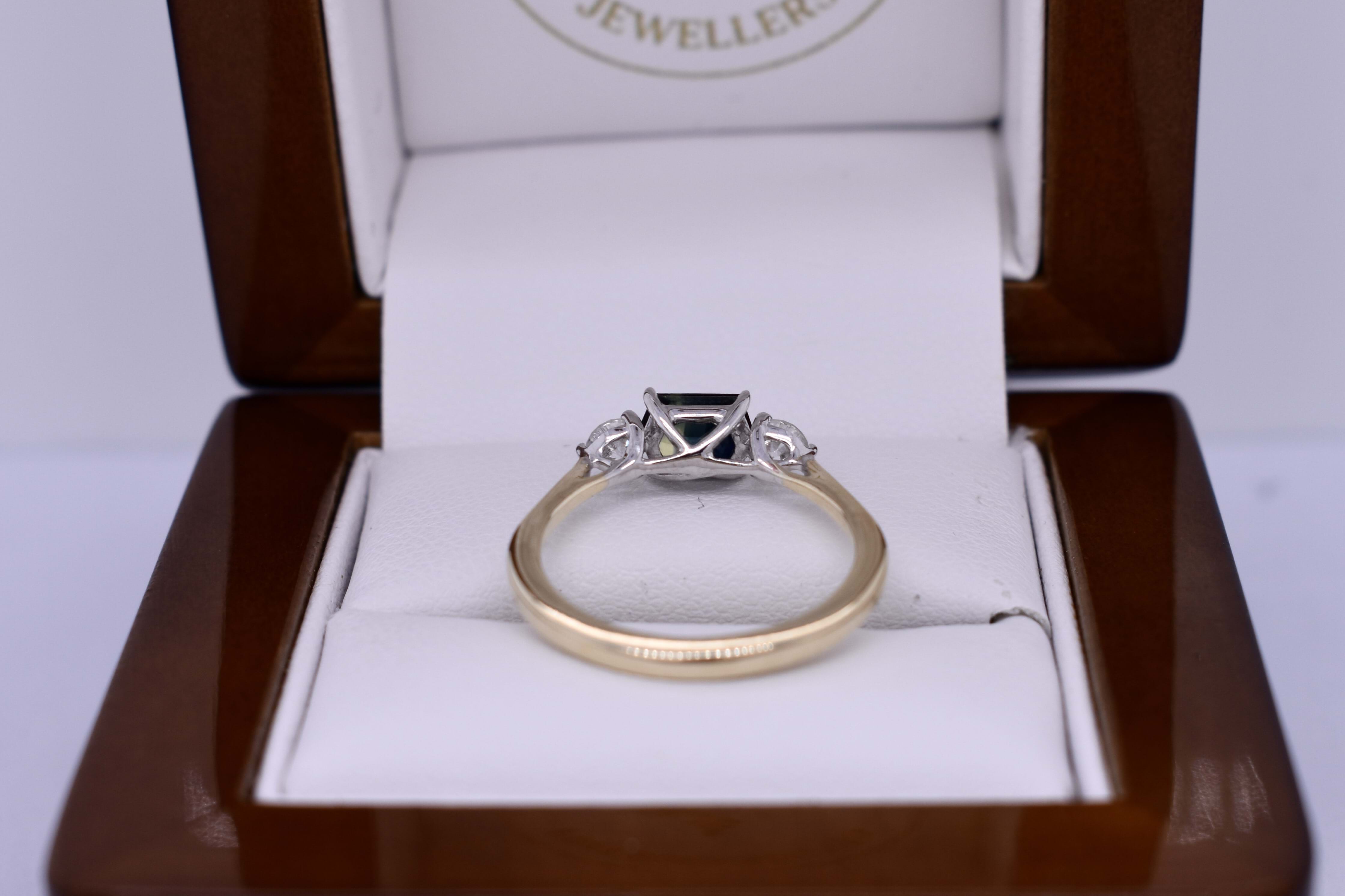 A stunning and unique sapphire and diamond ring crafted from 18ct yellow gold and featuring a gorgeous four claw set 0.97ct hexagonal blueish yellow Australian parti sapphire at the centre, complemented by two three claw set shimmering FG/SI RBC diamonds totalling 0.30ct on a petite, plain band. Finger size M. Independent Valuation Supplied