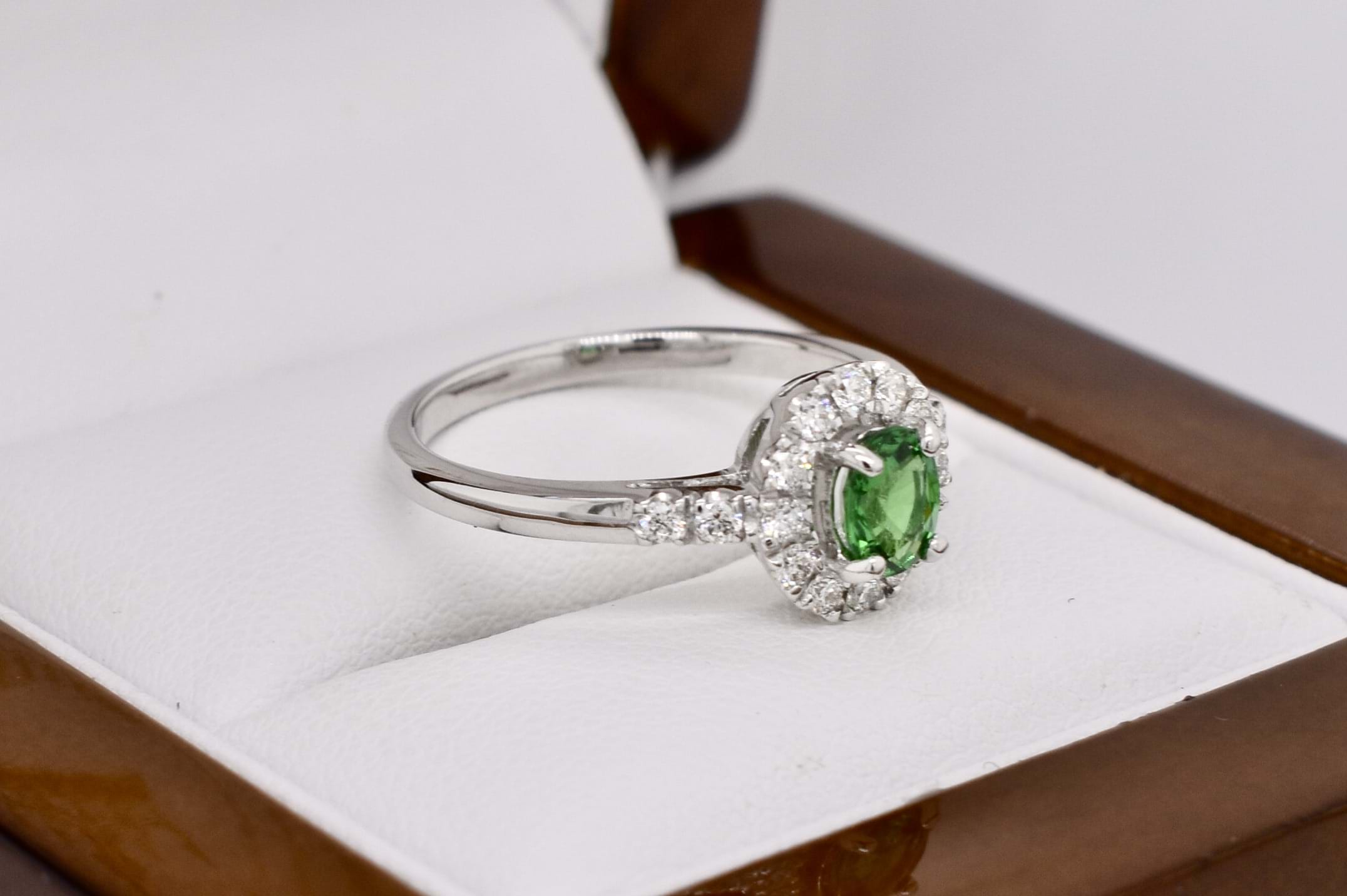 This beautiful ring is crafted in 9ct white gold and features a beaming bright green oval shaped tsavorite garnet of 0.55ct, measuring 5.50x4.38x2.59mm. The garnet is four claw set surrounded by a halo of twelve round brilliant cut 1.50-1.60mm diamonds and a further two each side of the 1.86mm band. Total diamond weight of 0.29ct G VS. Finger size M+. Independent Valuation Supplied.