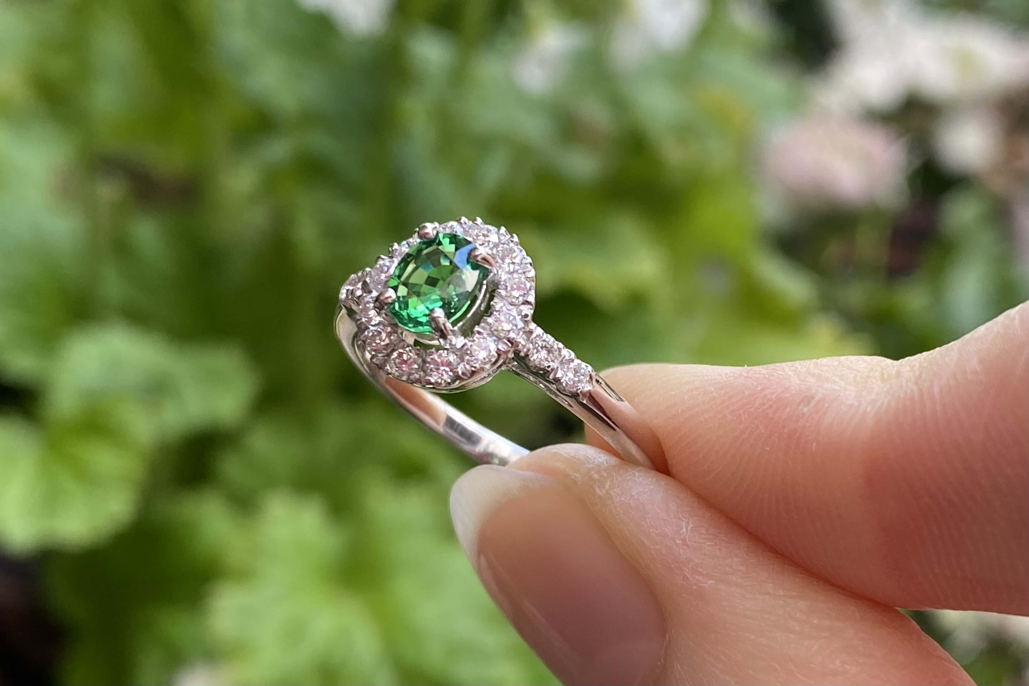 9ct White Gold 0.55ct Tsavorite Garnet & 0.29ct Diamond Halo Ring (M+)