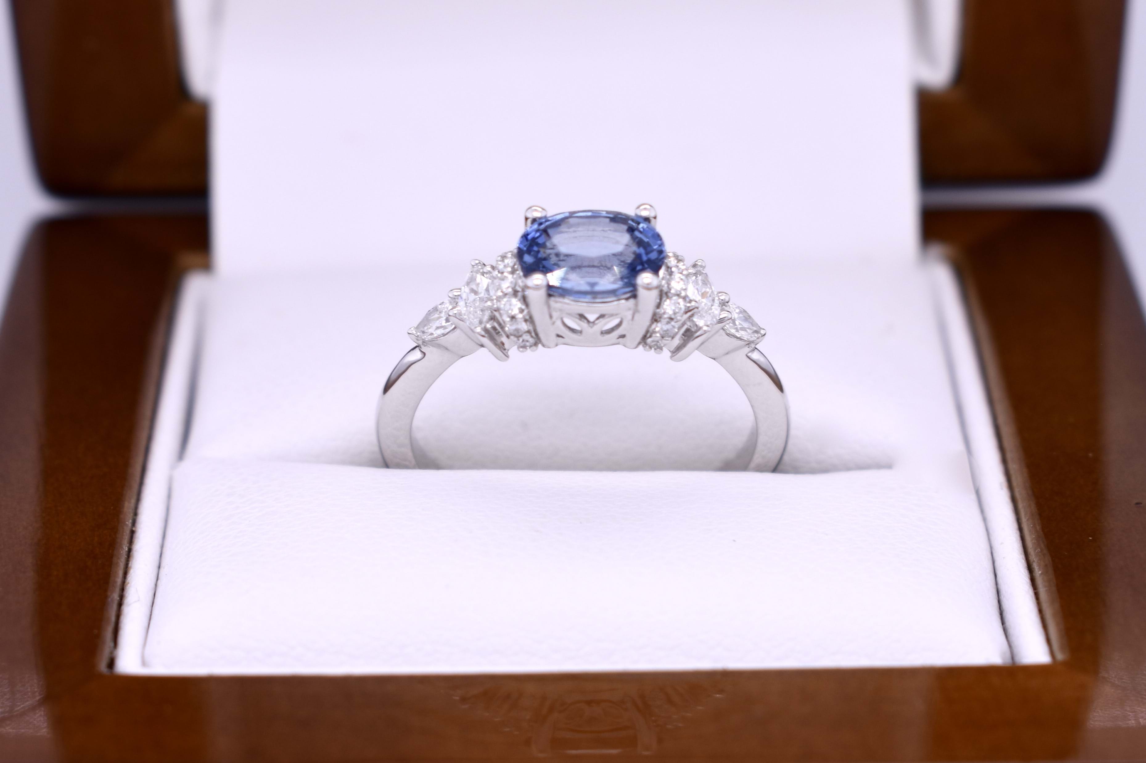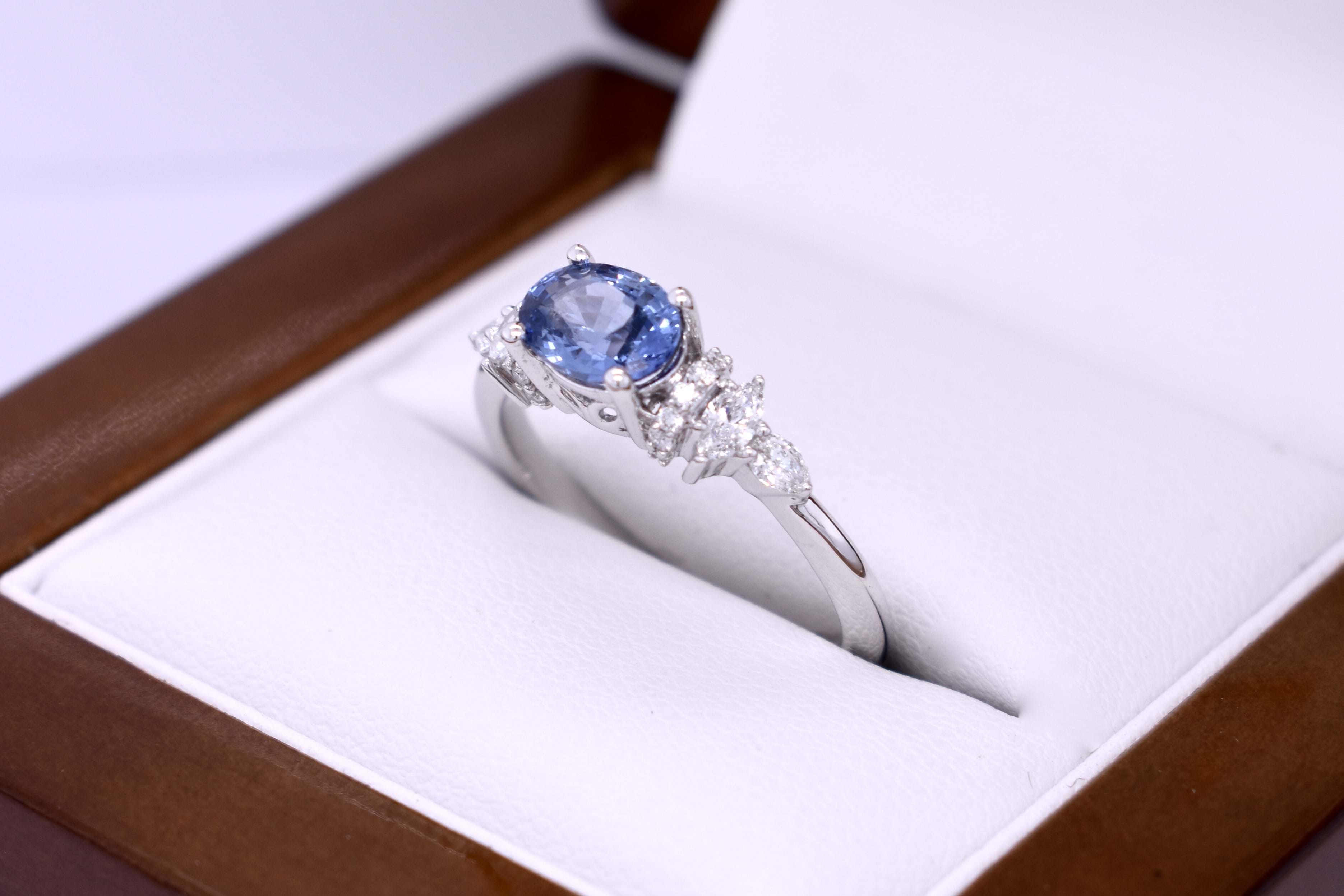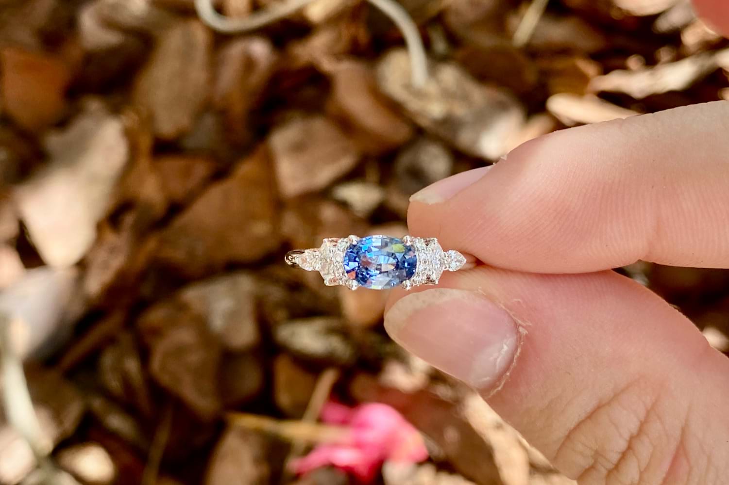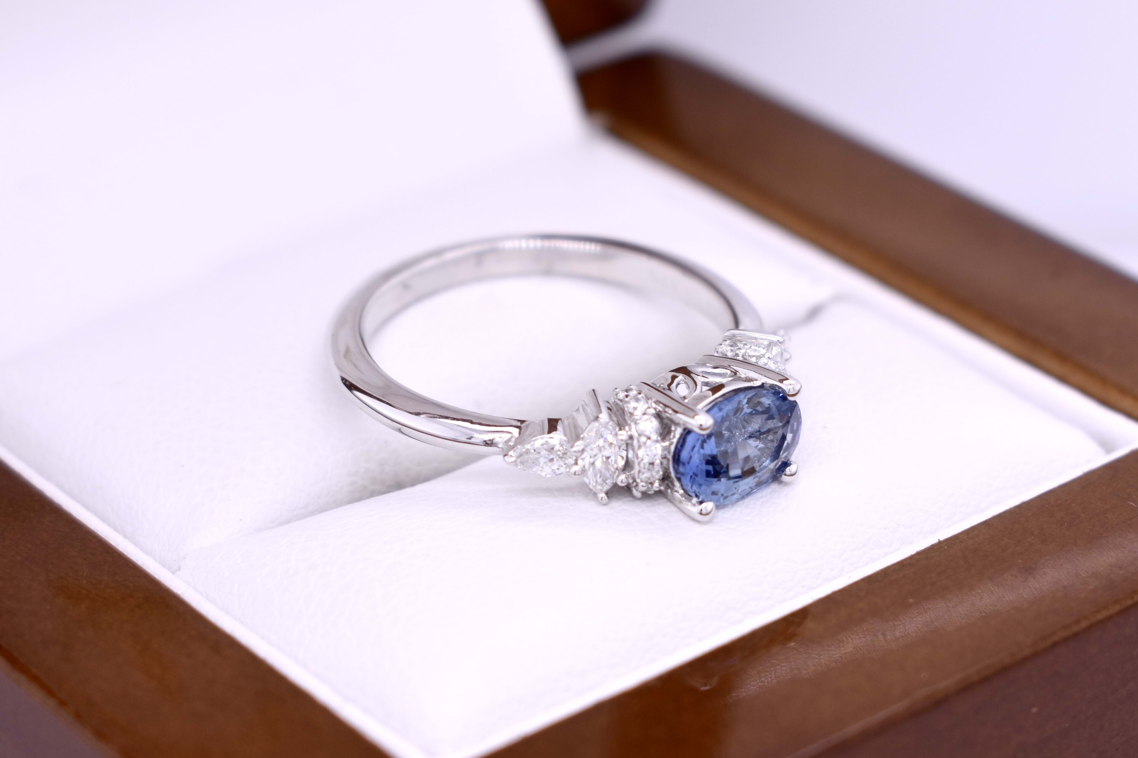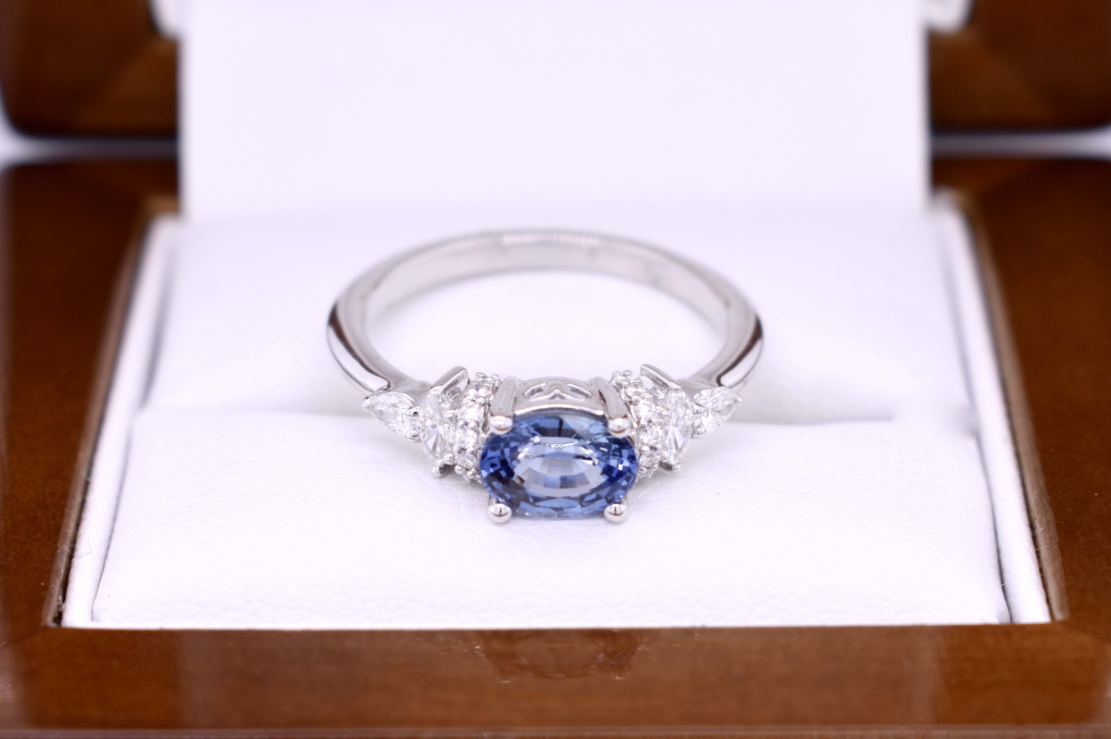 9ct White Gold 1.12ct Ceylon Blue East/West & 0.29ct Diamond Ring (M)