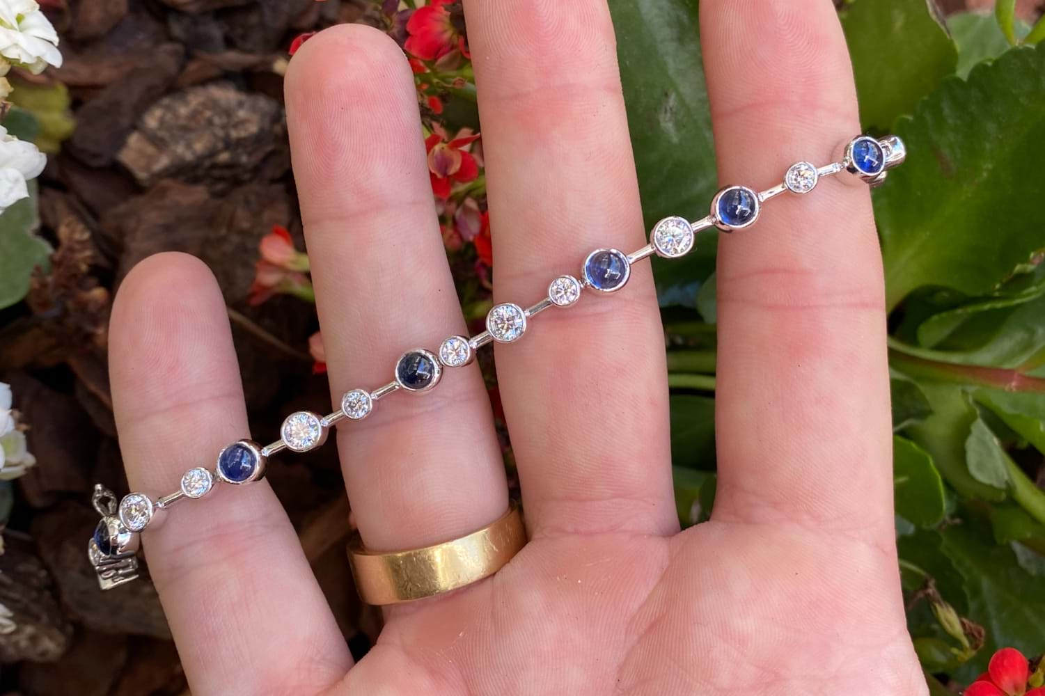 The prettiest sapphire and diamond bracelet, consisting of 8 cabochon blue round sapphires, bezel set, stationed between 16 round brilliant cut diamonds, also bezel set. Total sapphire weight of 6.74ct and a total diamond weight of 2.50ct FG SI. All in various sizes set along the 9ct white gold bracelet creating a 'bubble' design. Complete with a box clasp and figure 8 safety catch. Length of 19.5cm.