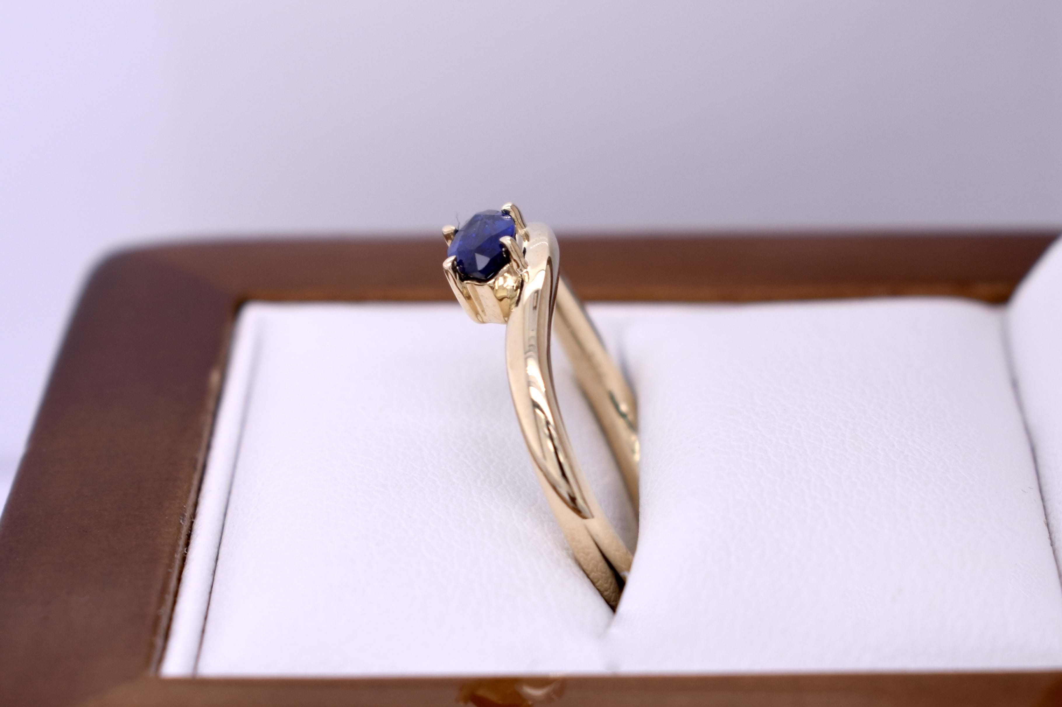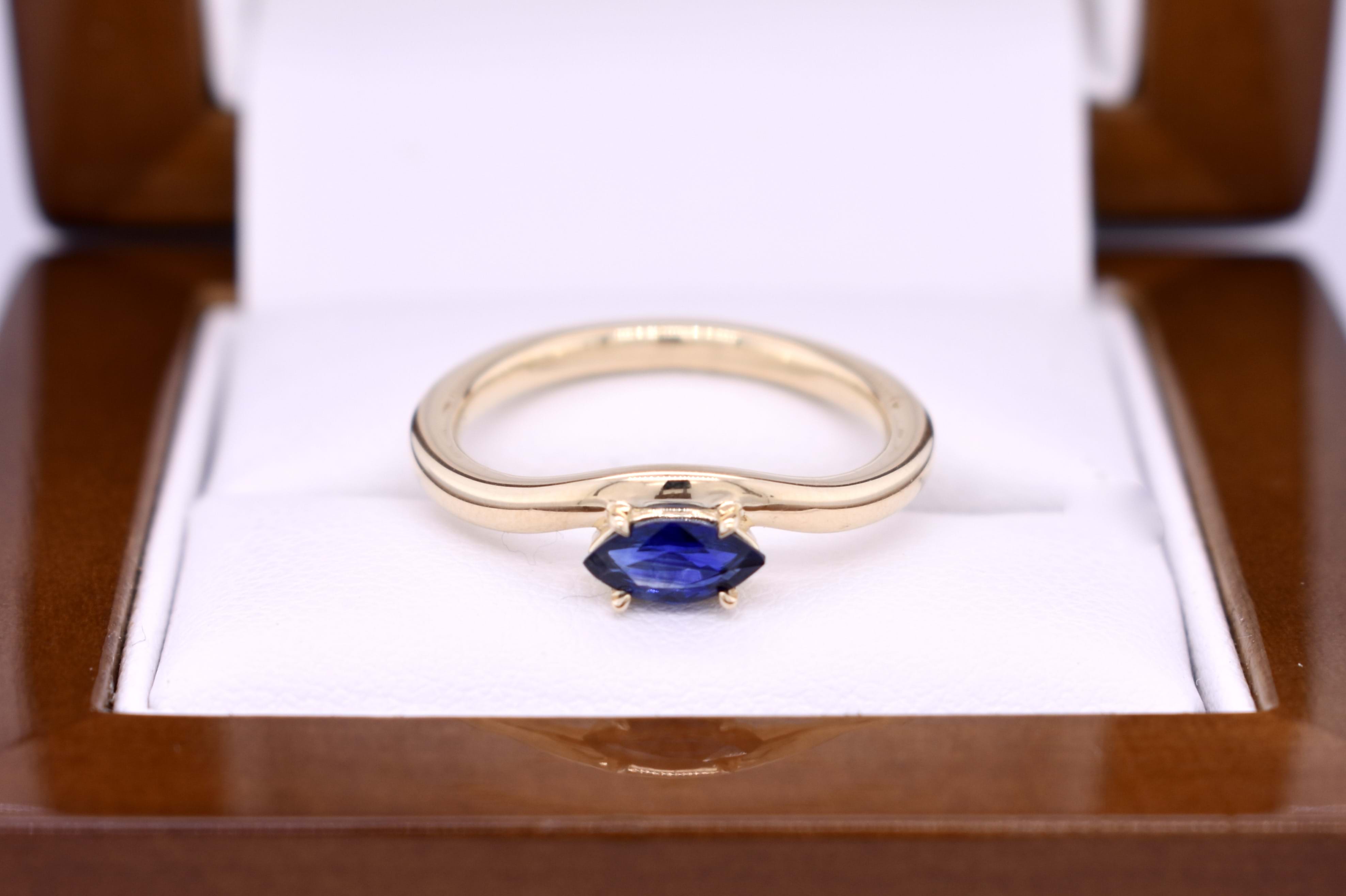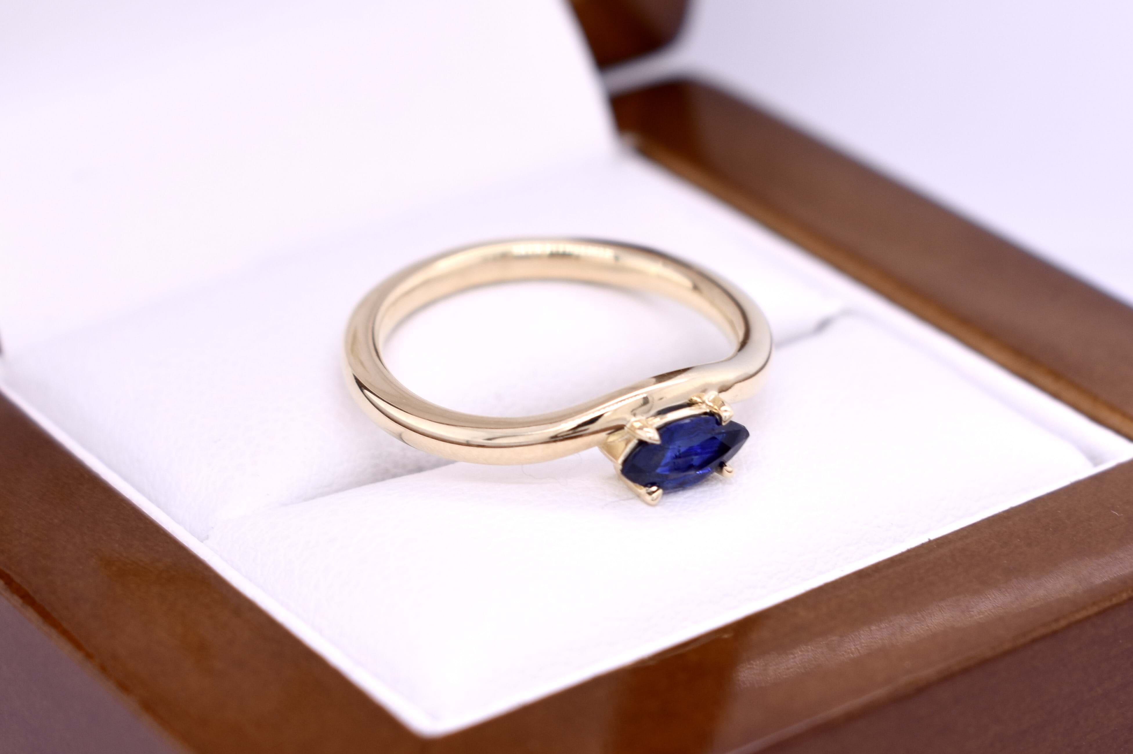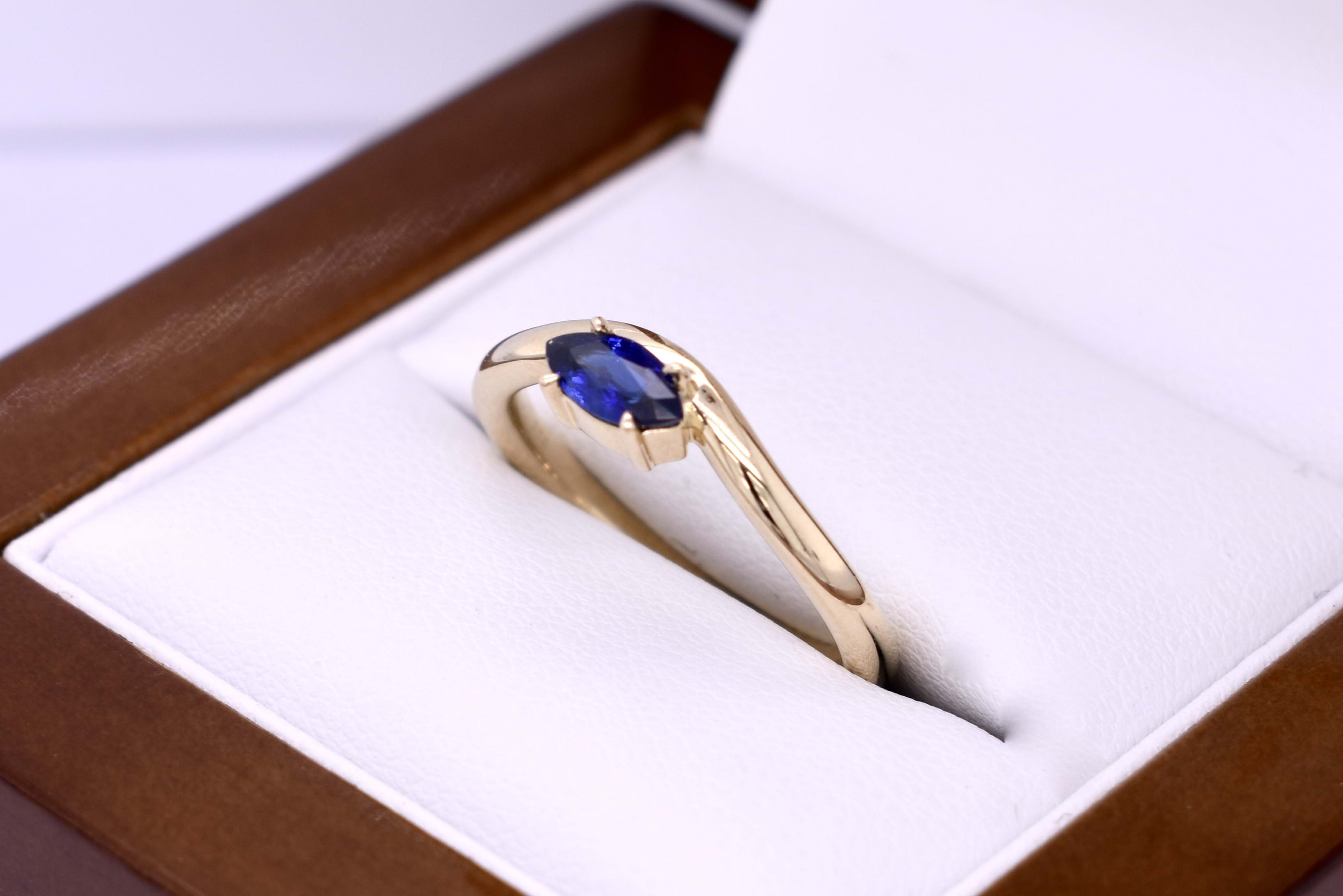 Crafted in 9ct yellow gold, this unique ring has one marquise shaped 6.78x3.50mm deep blue Ceylon sapphire of 0.39ct, four claw set on a swirl/curved style band measuring 2.12mm wide. 3.00 grams. Finger size M+.