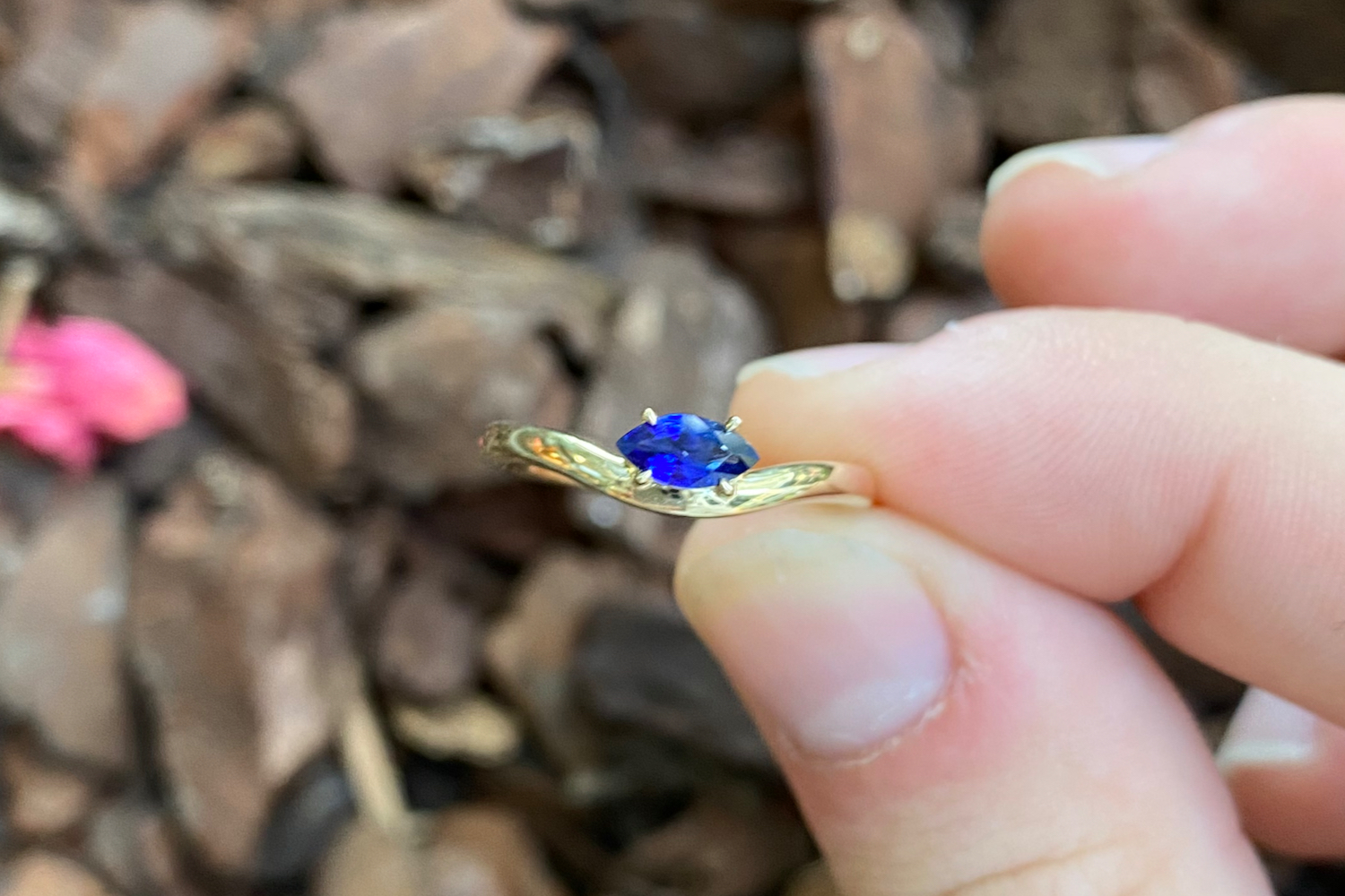 9ct Yellow Gold 0.39ct Marquise Ceylon Blue Sapphire Swirl Band Ring (M+)