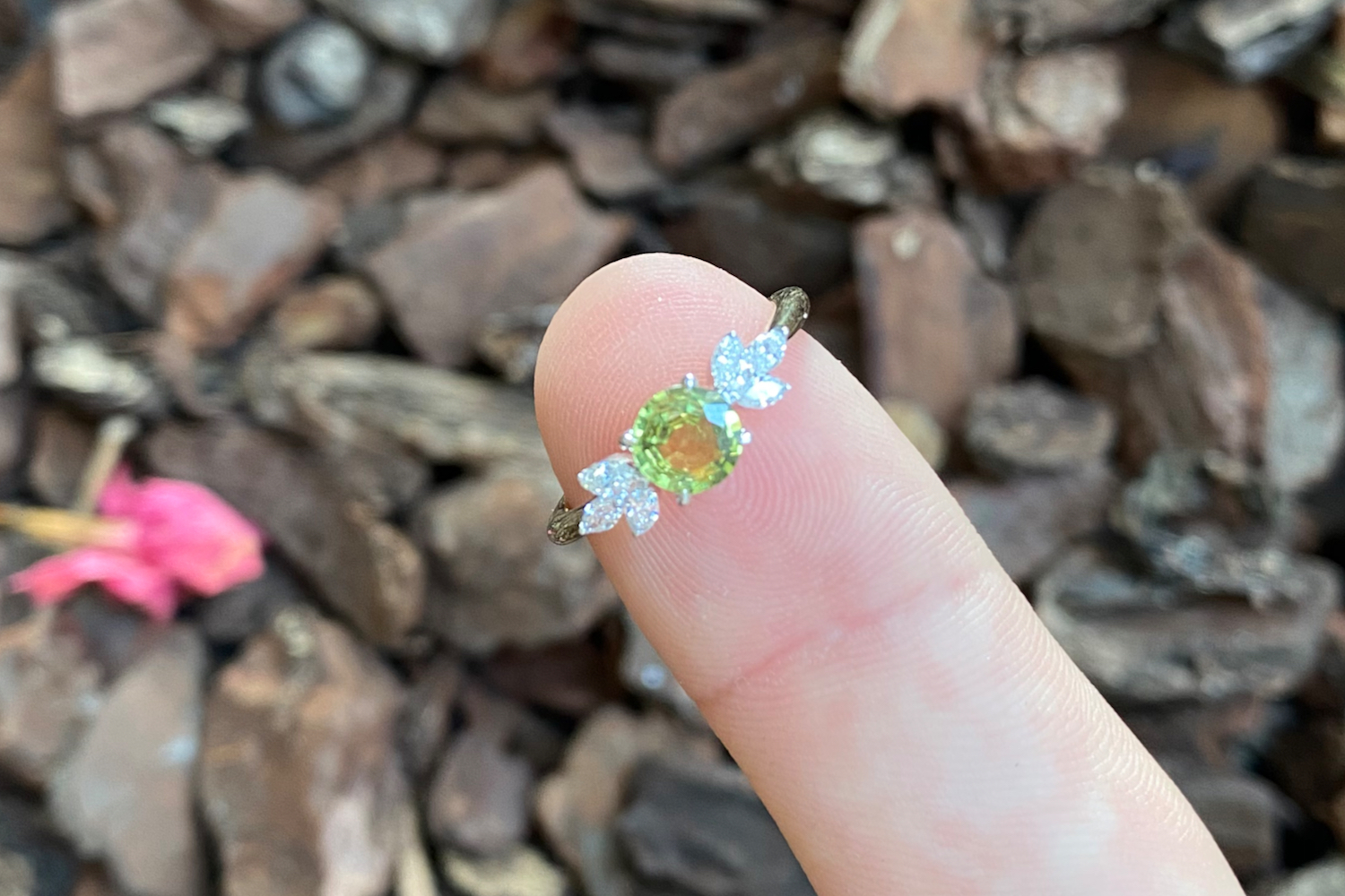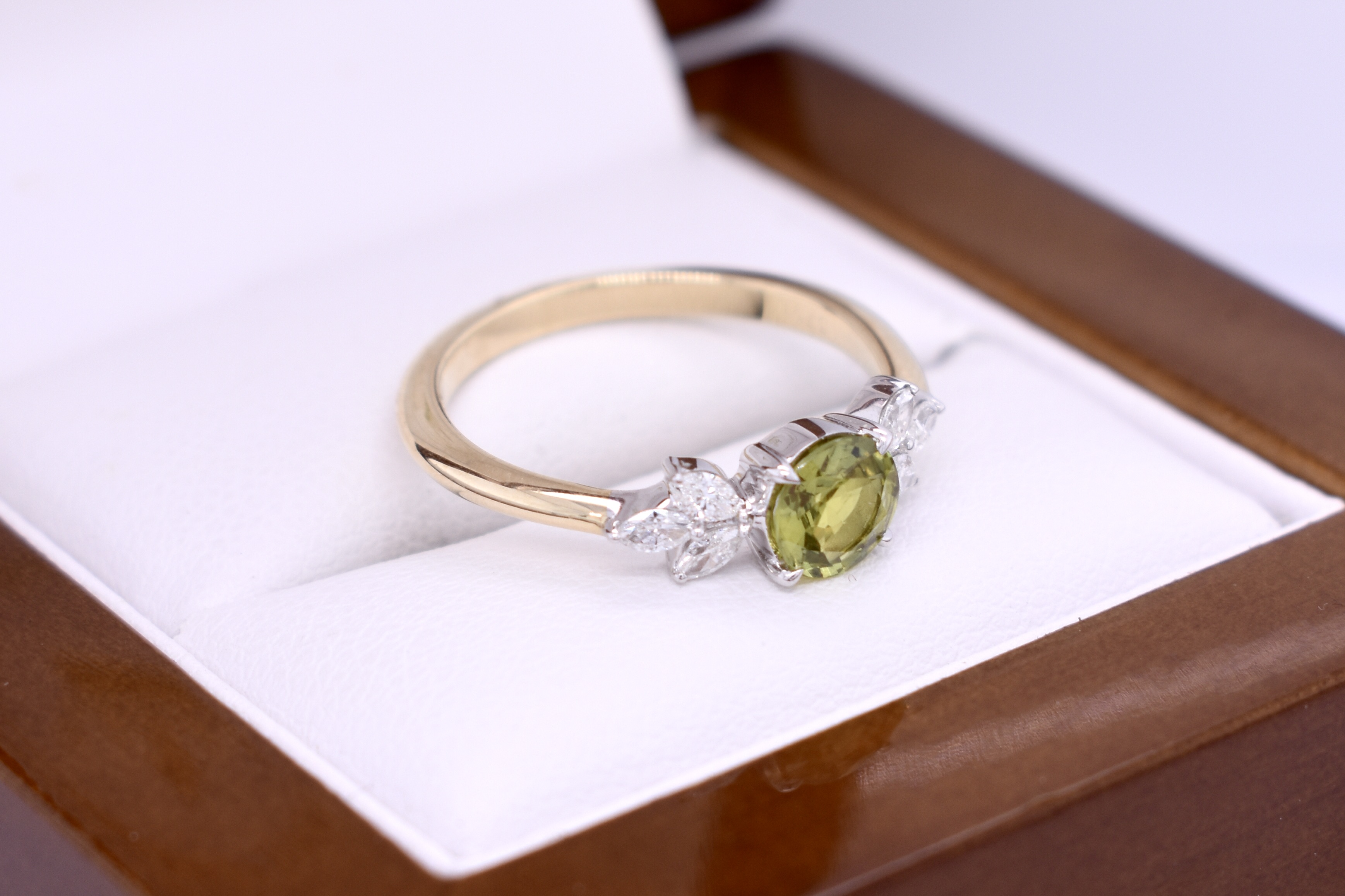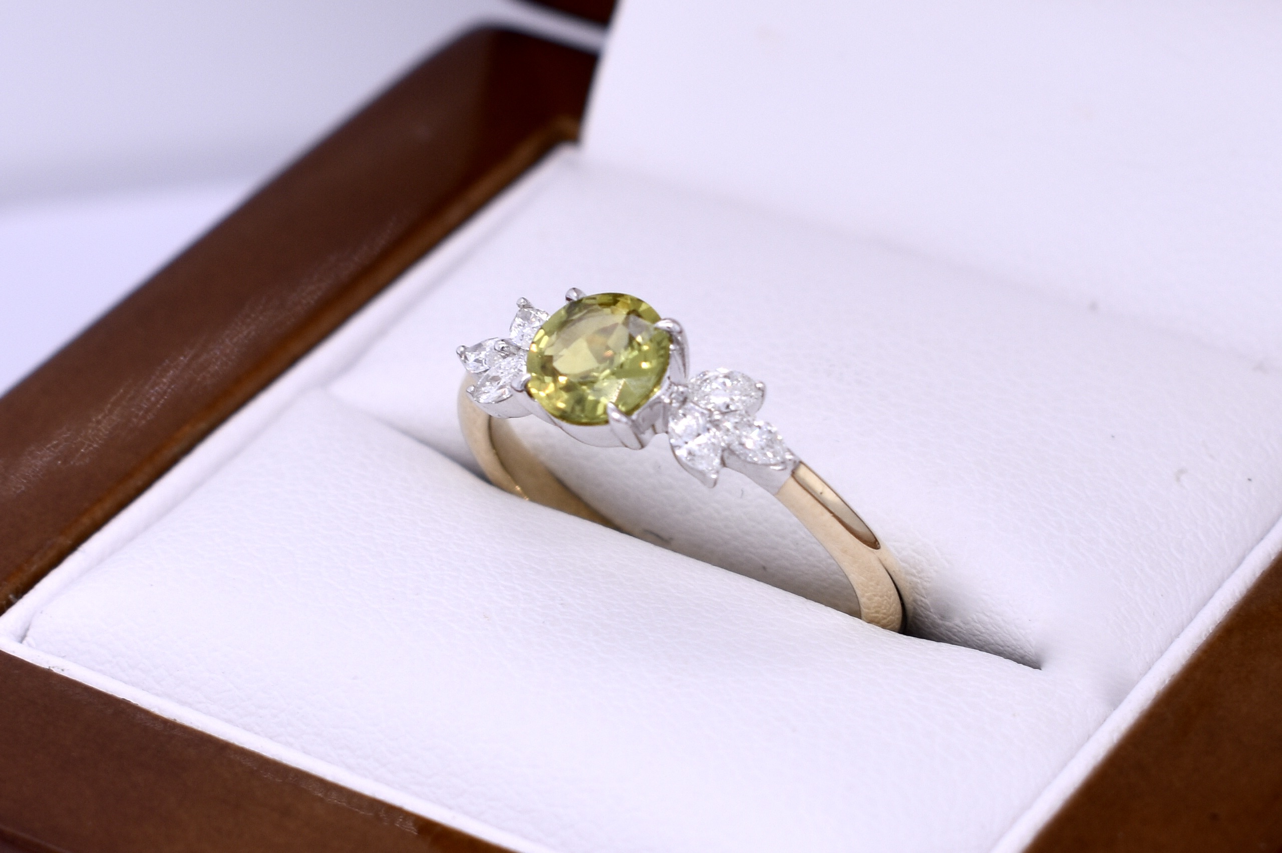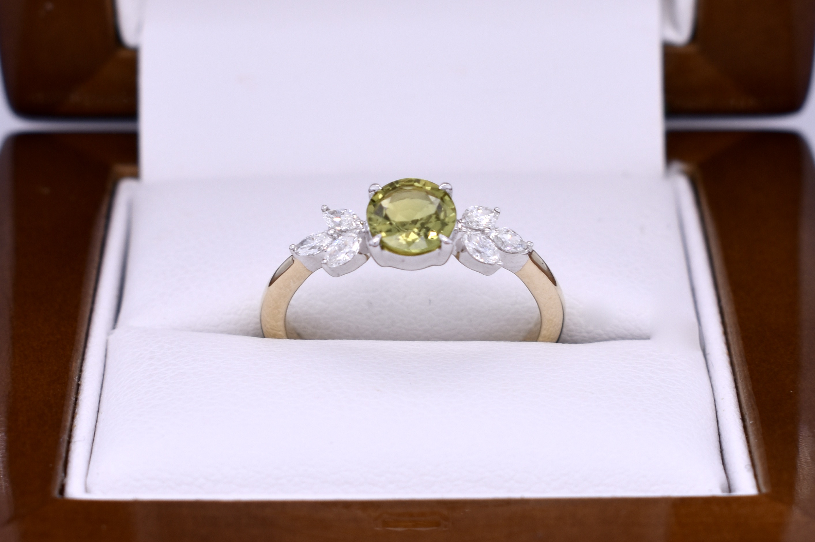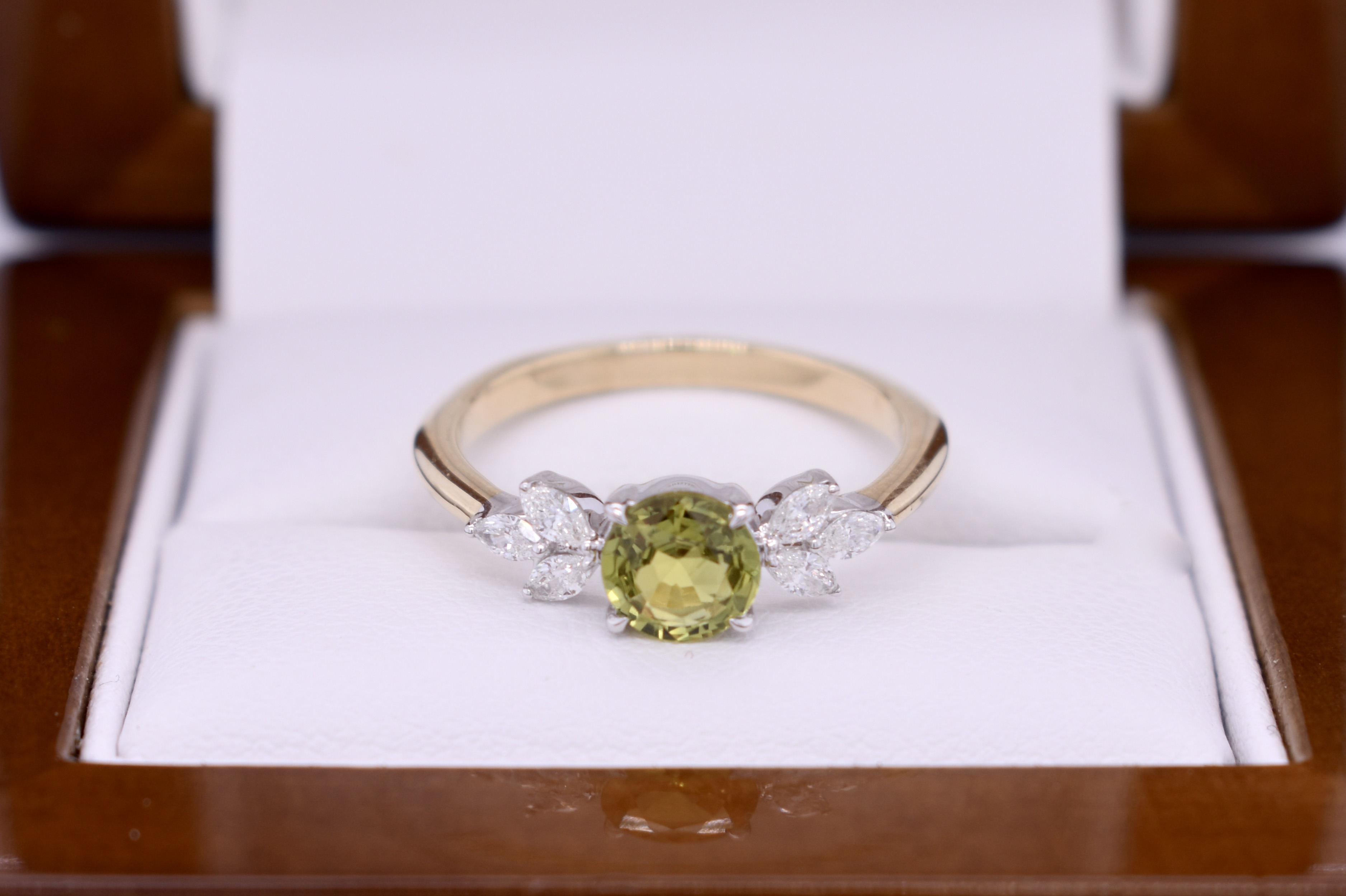 SOLD 9ct Yellow Gold 0.73ct Yellowish Green Aus Parti Sapphire & 0.25ct Diamond Cluster Ring (L+)