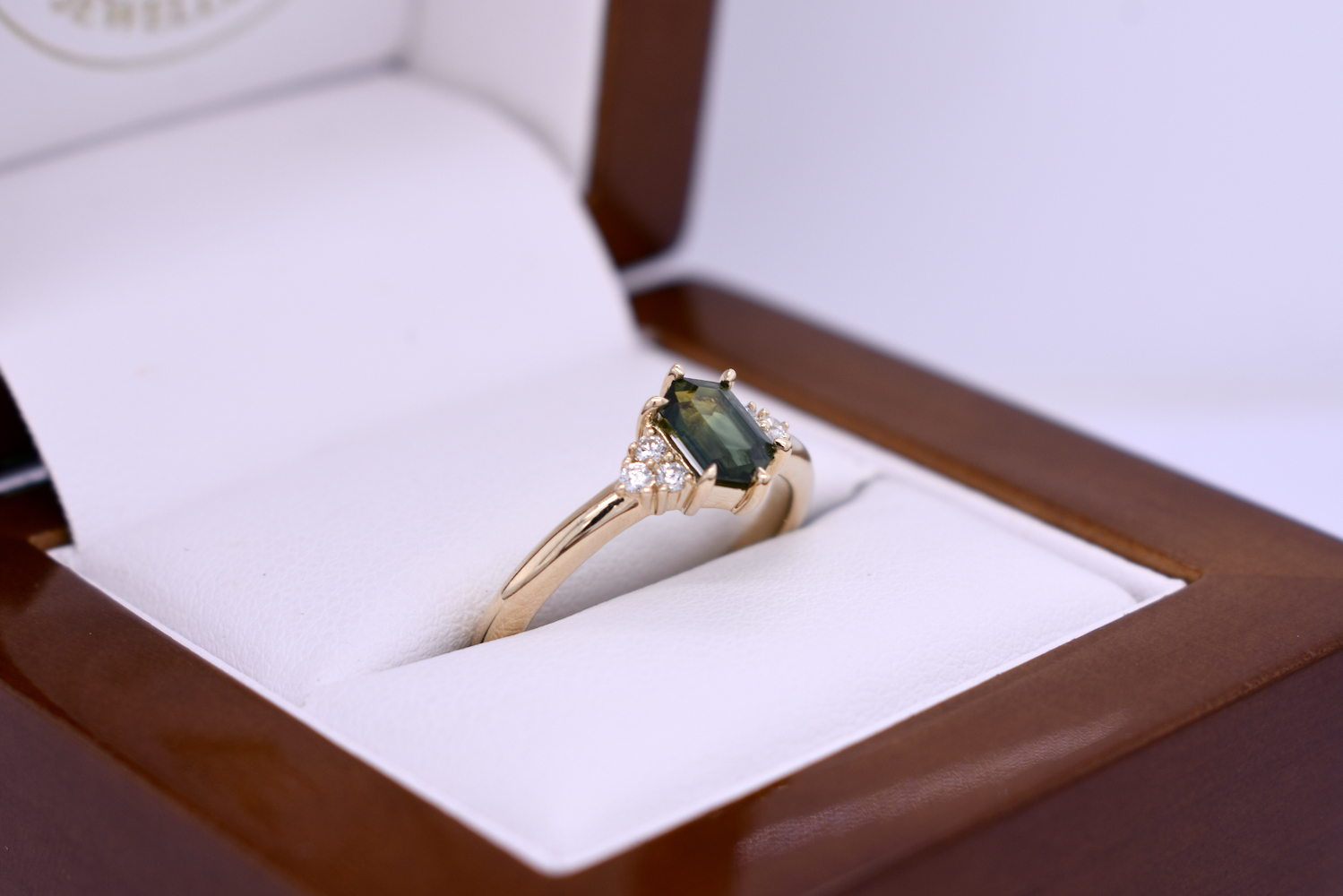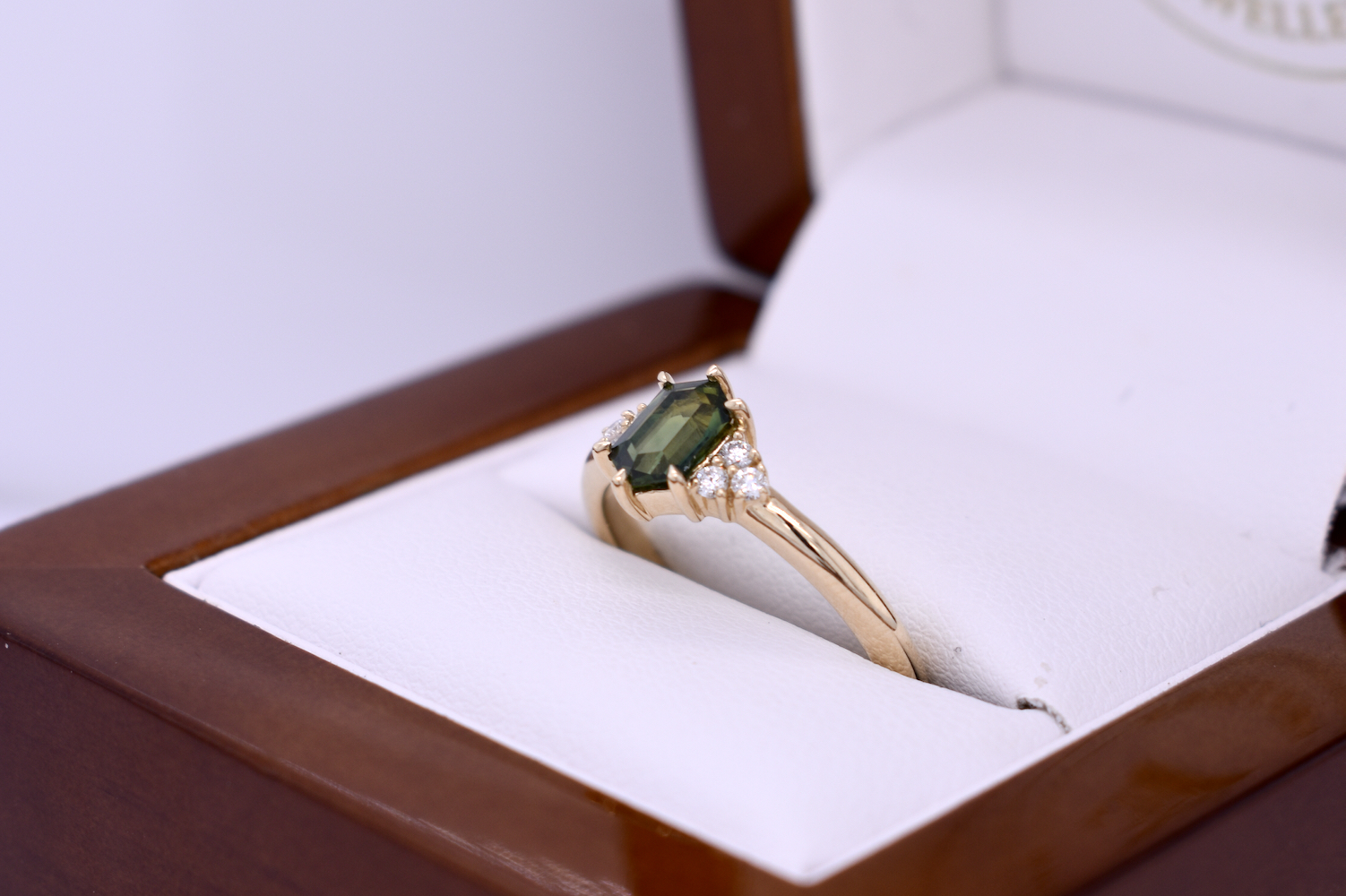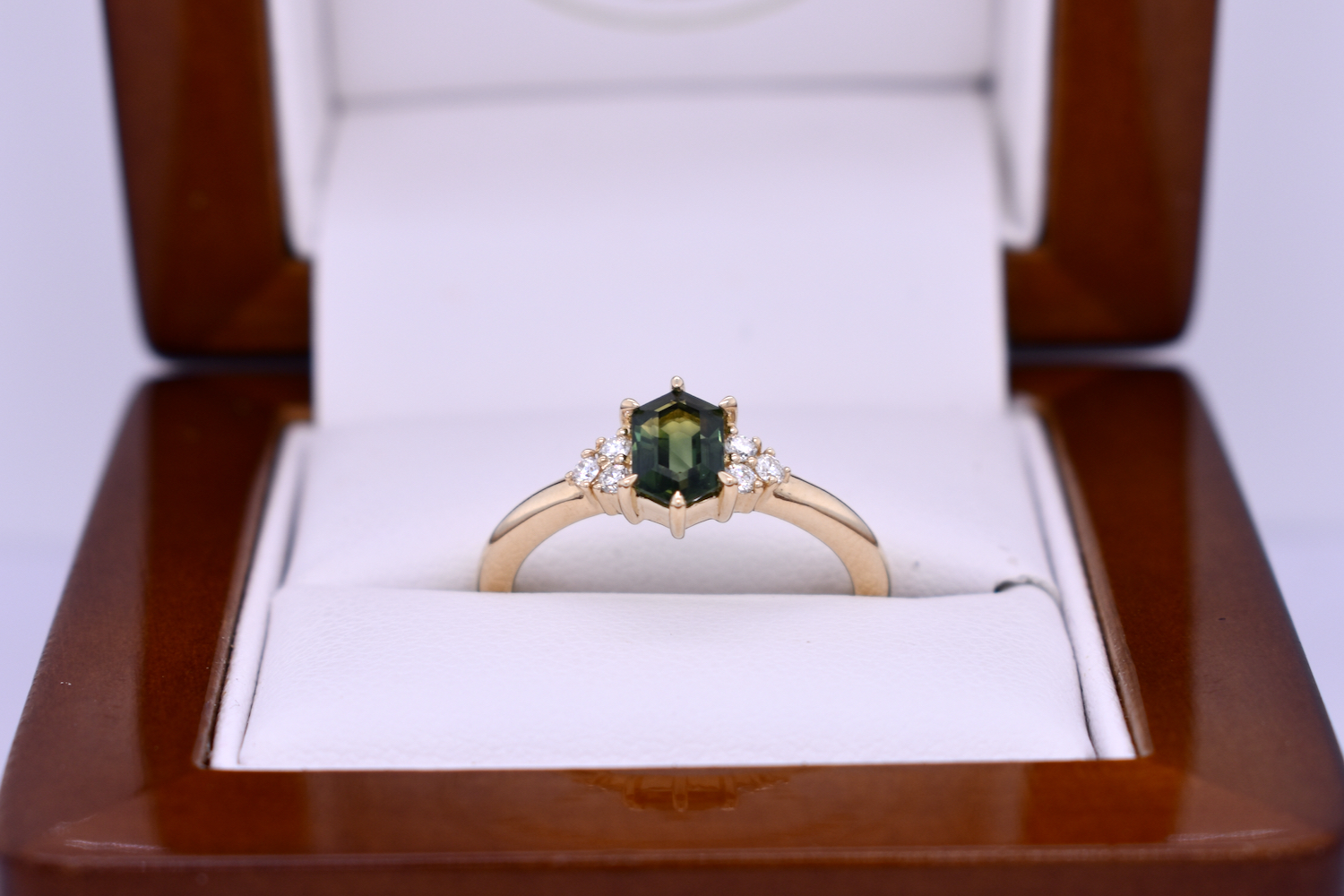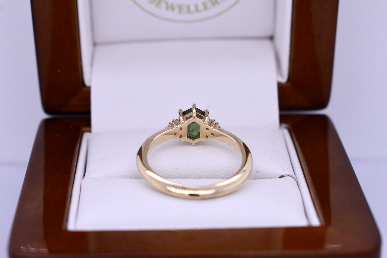 9ct Yellow Gold 0.91ct Hexagon Shaped Aus Green Parti Sapphire & 0.08ct Diamond Ring (M+)