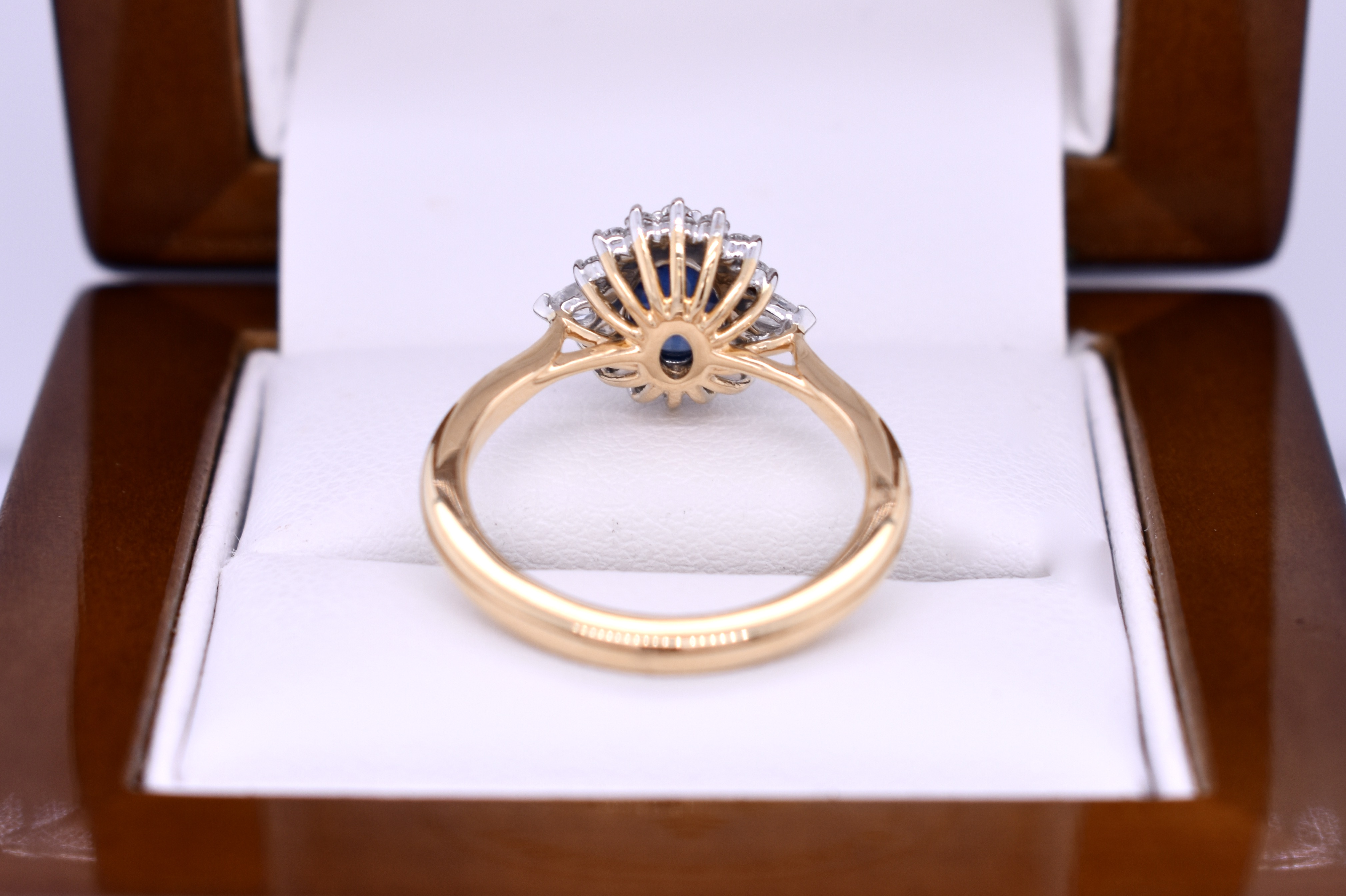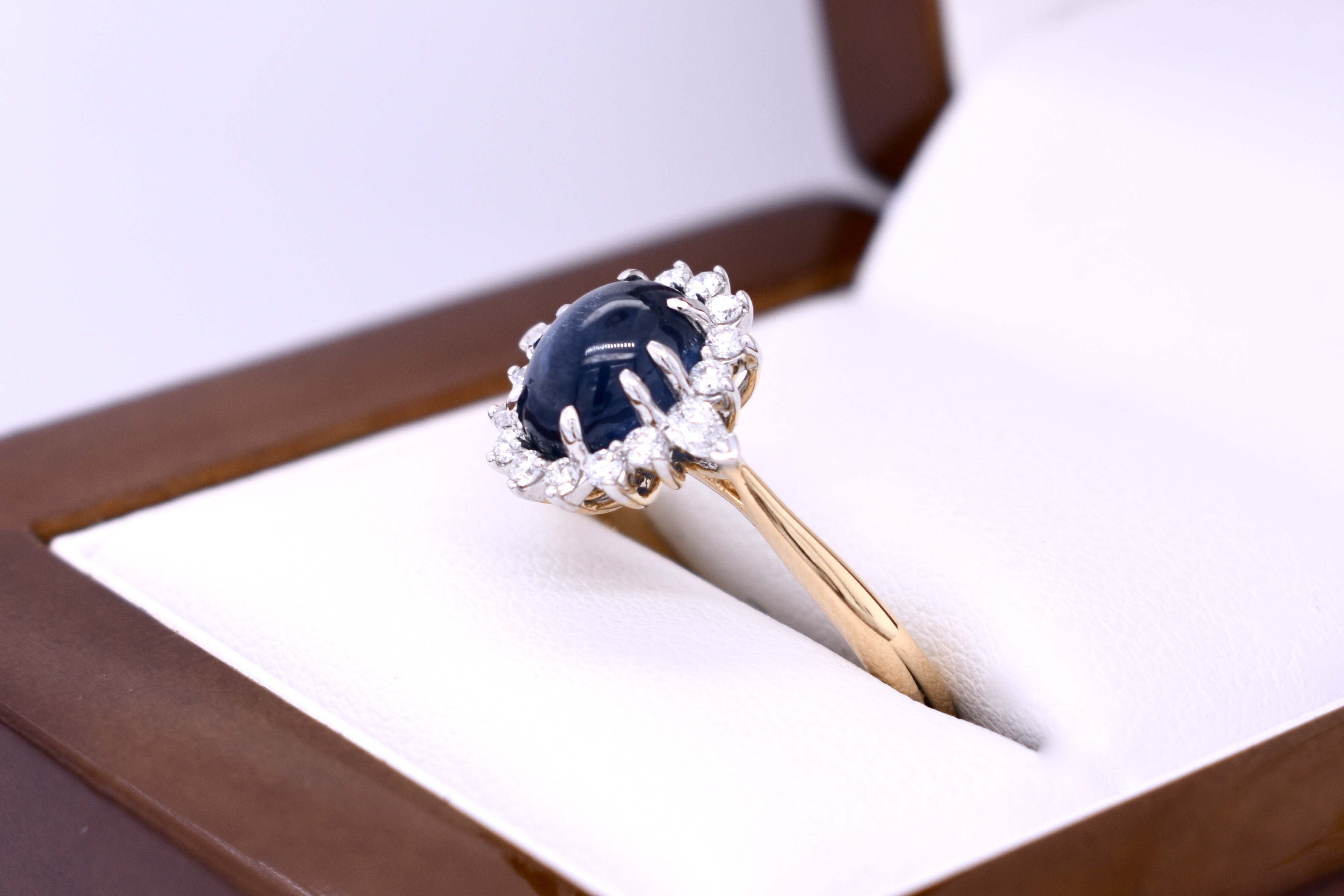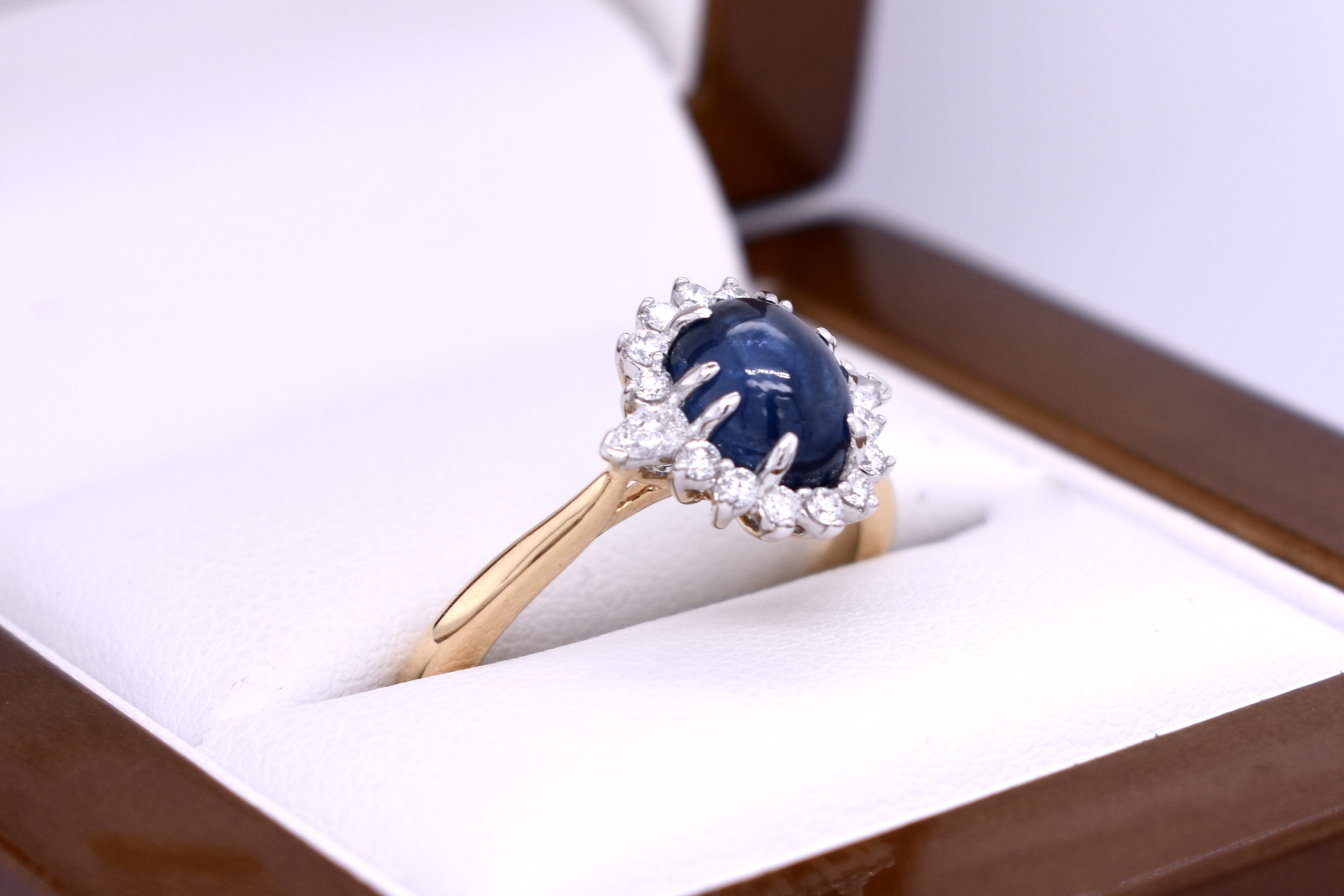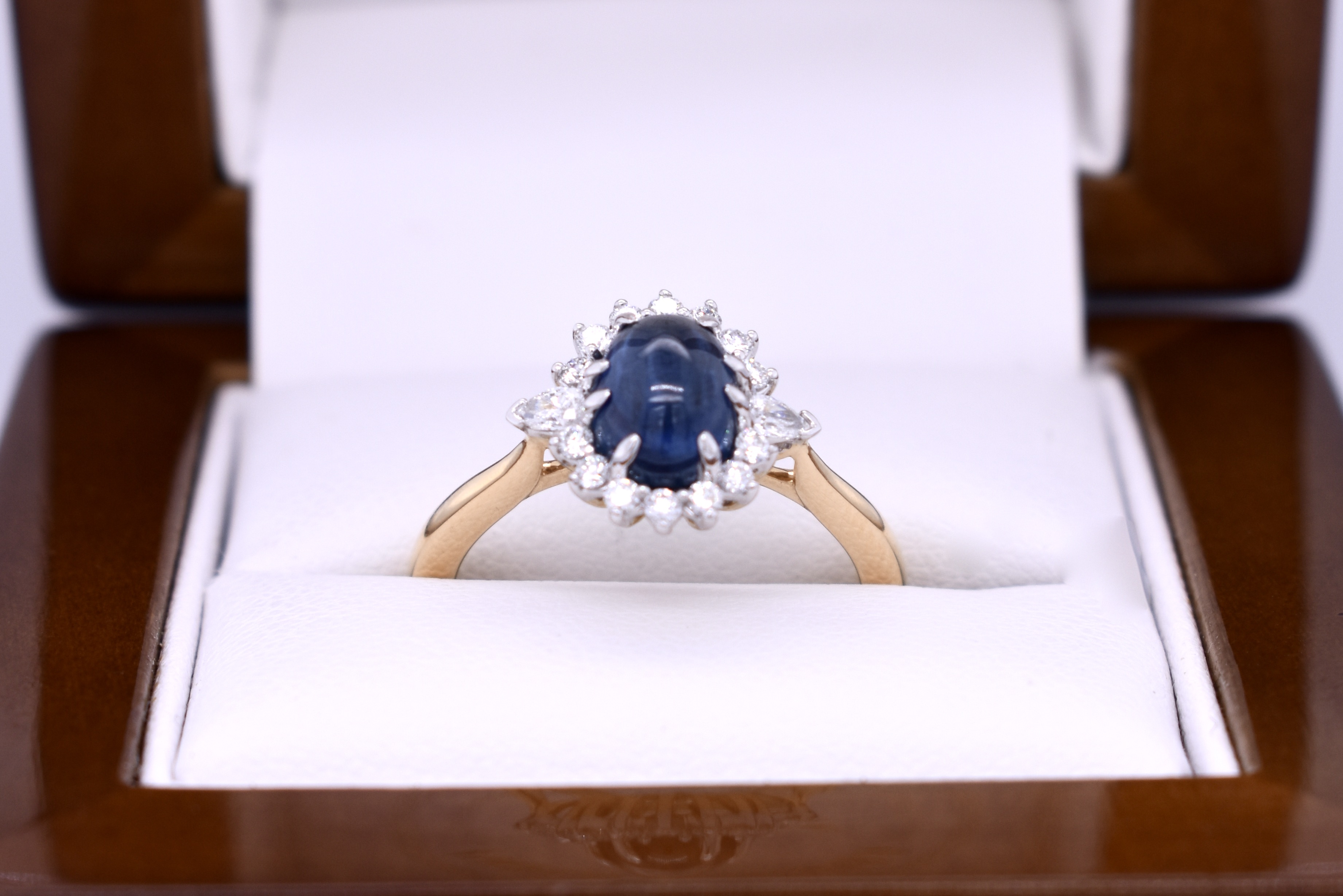 This lovely 9ct yellow gold ring features an oval cabochon blue sapphire of 2.22ct, eight claw set in white gold with a diamond cluster halo including pear shaped diamonds on the sides. The plain yellow gold band has pinched shoulders. Finger size M+.