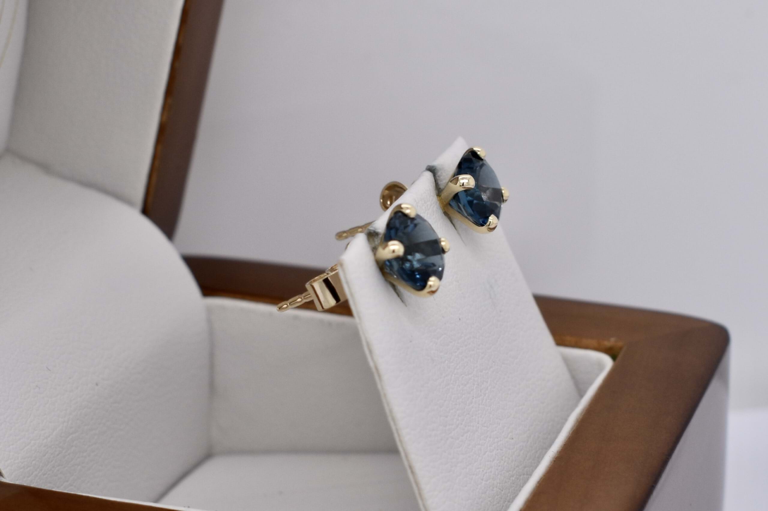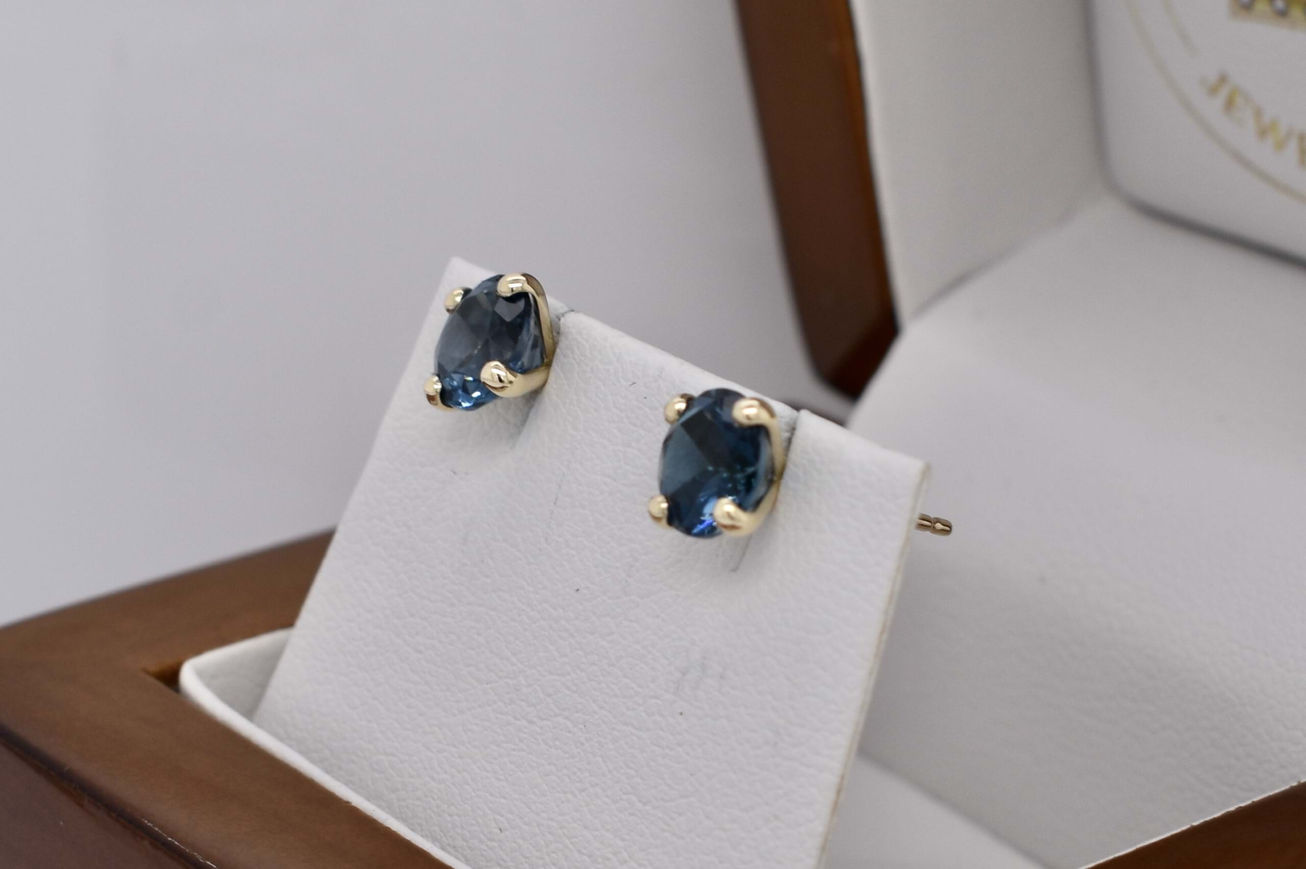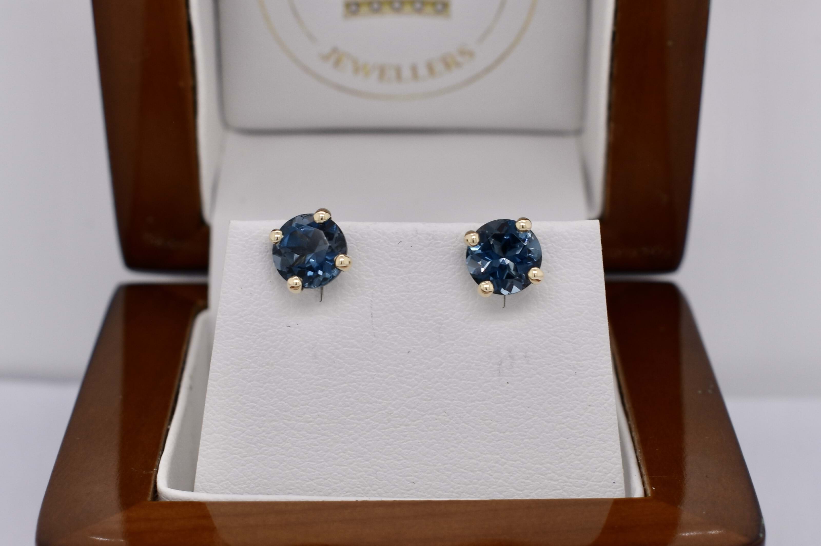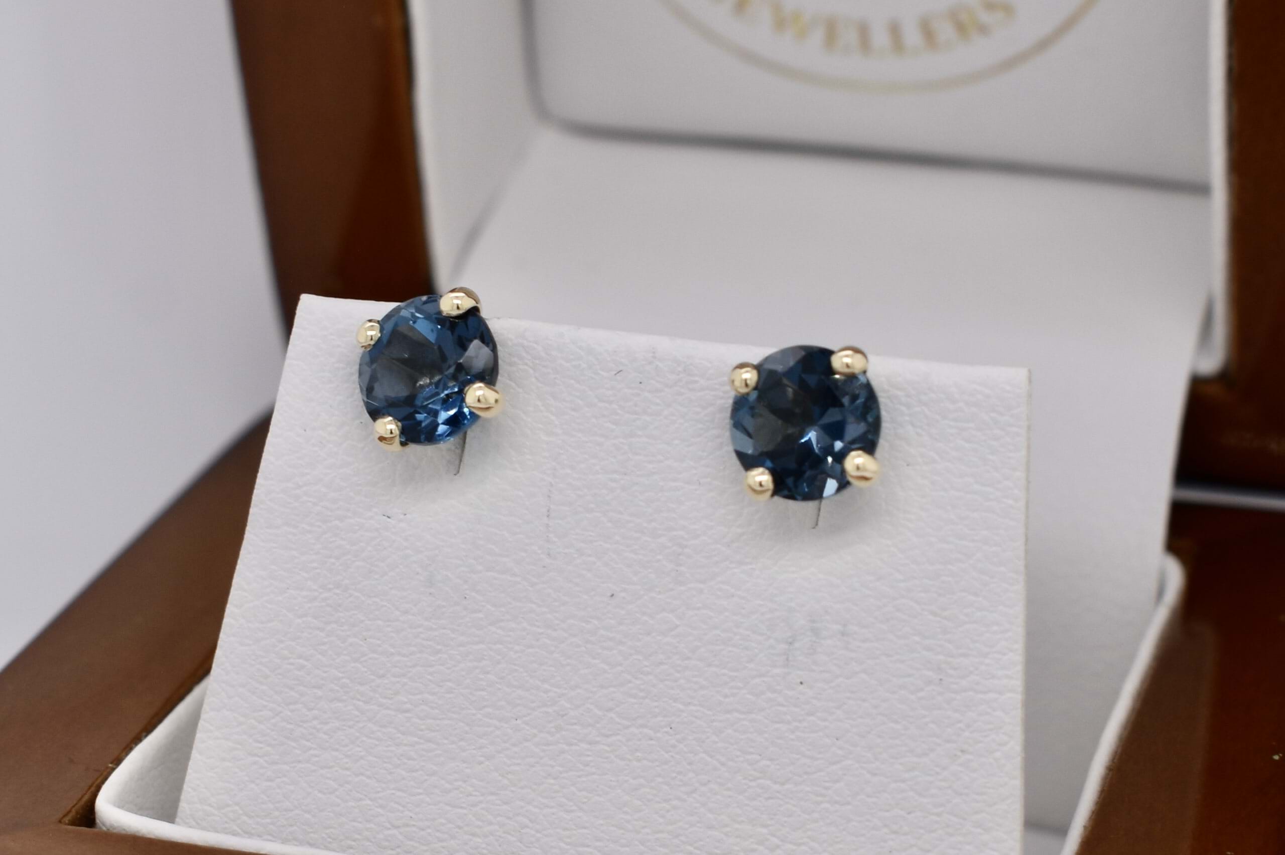 The cutest 9ct yellow gold london blue topaz studs, four claw set, measuring 6.6mm round. Finished with post and butterfly fittings.