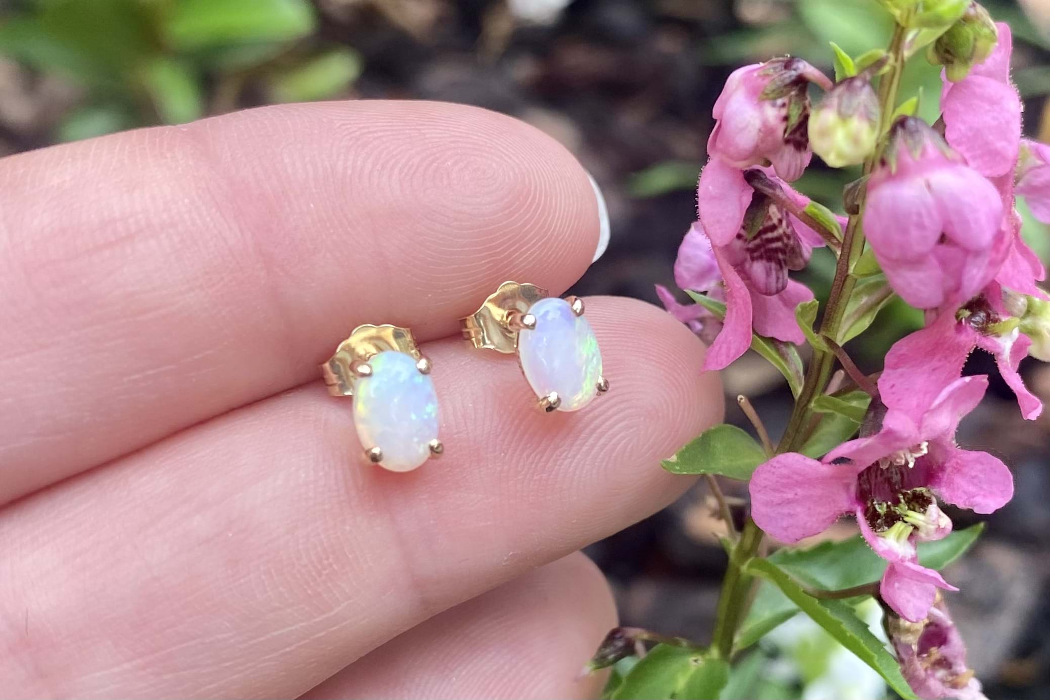 Gorgeous and simple, these studs feature two oval shaped, crystal coober pedy opals measuring approx. 6.8x4.9mm, four claw set into 9ct yellow gold. With every movement they flash vibrant colours of green throughout. Finished with a post and butterfly fittings.