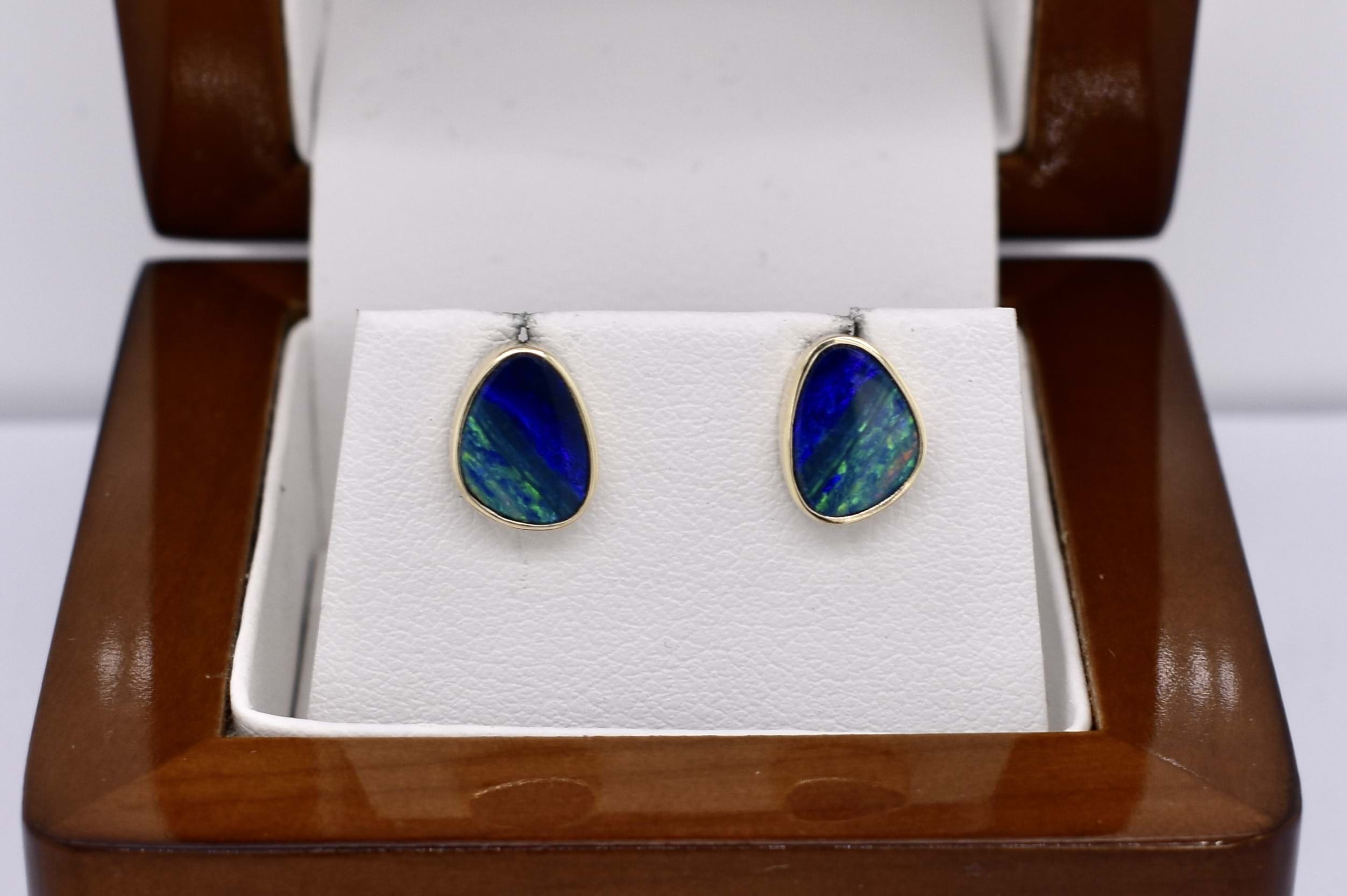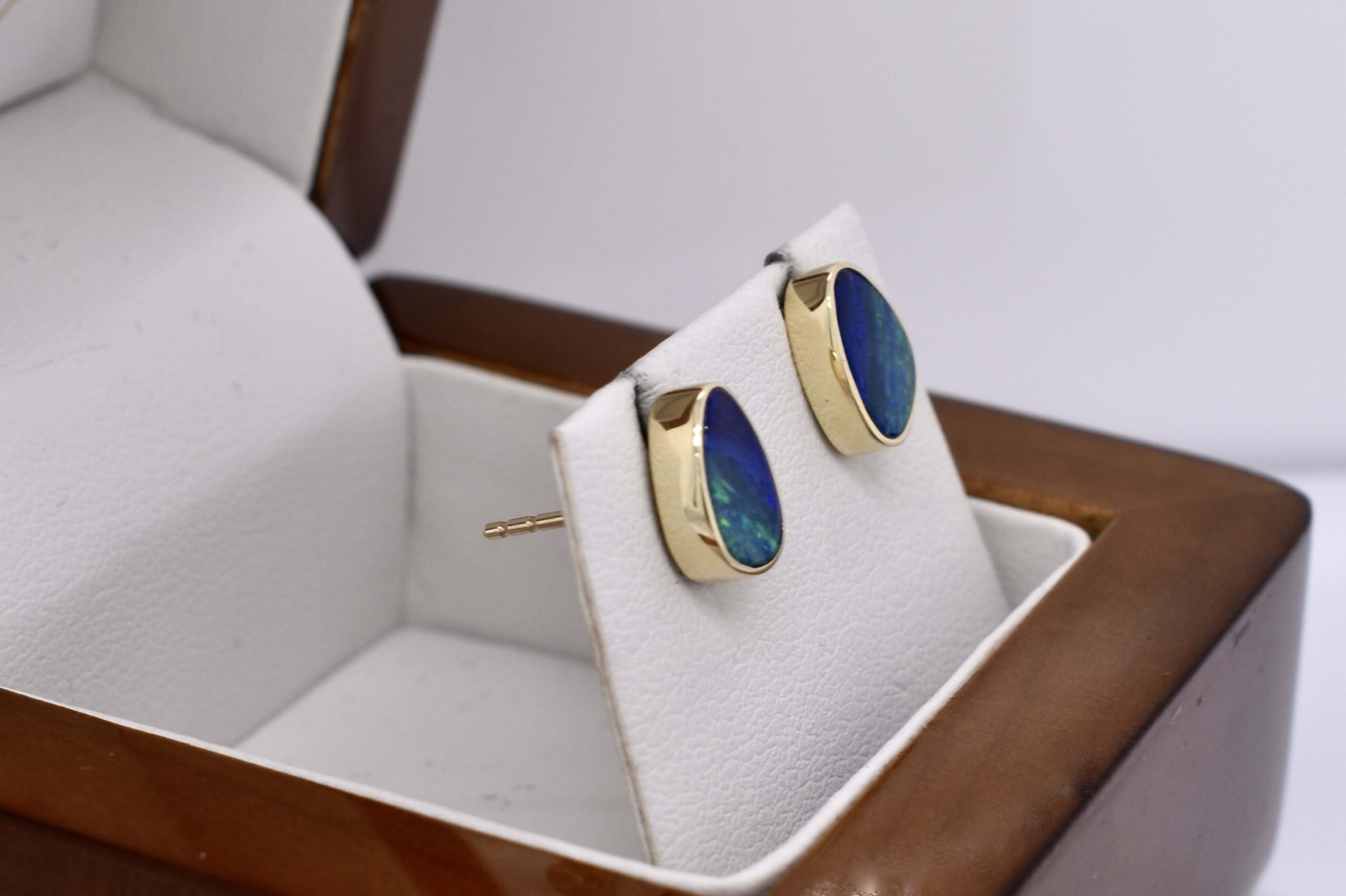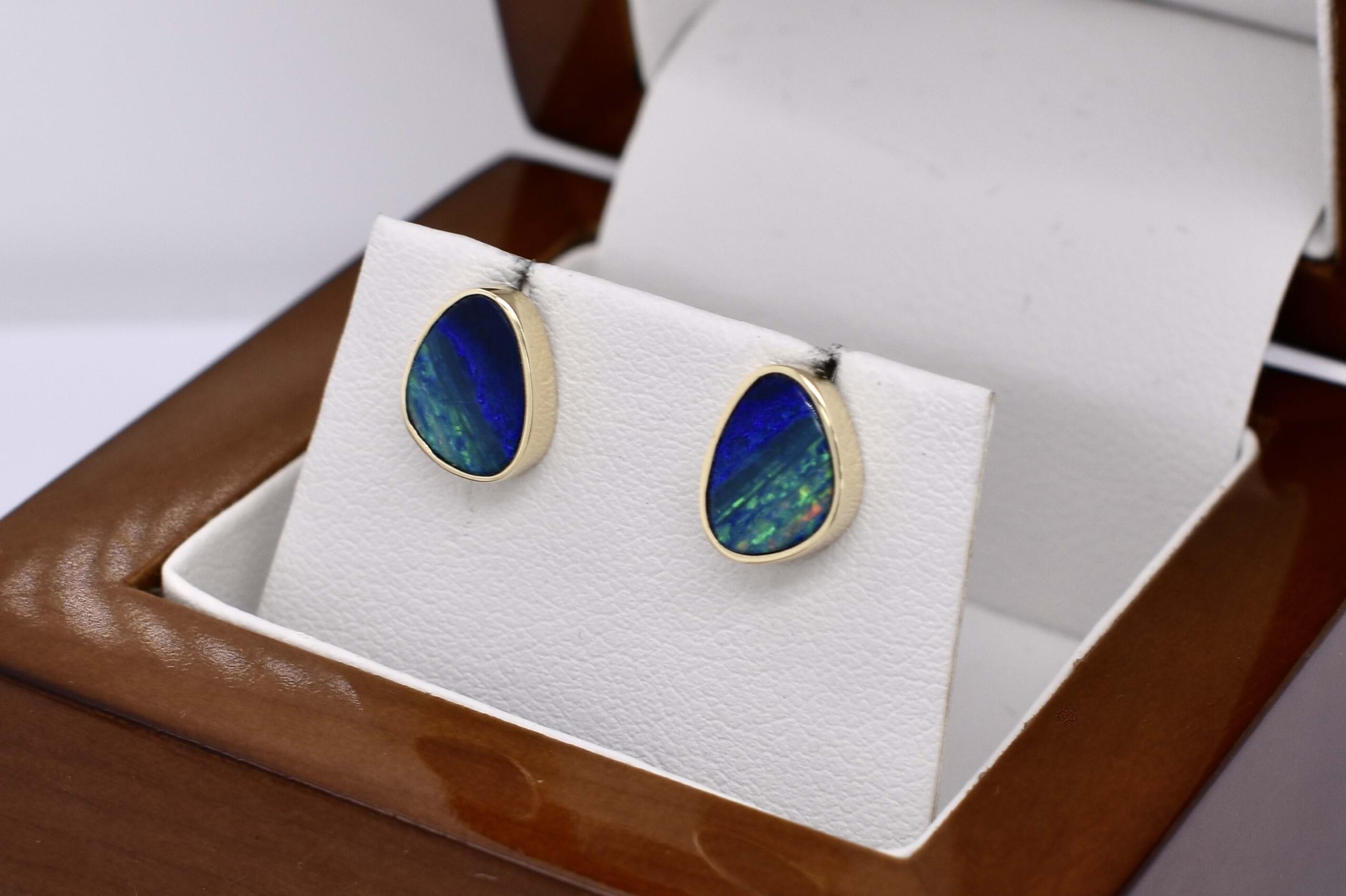 Simple and pretty pair of studs crafted in 9ct yellow gold, with two dark Coober Pedy opal doublets with flashes of green, yellow and blue throughout. The doublet consisting of Coober Pedy opal (on top) with a boulder opal backing. Studs measuring approx. 9.2x7.4mm and are bezel set. Completed with post and butterfly fittings.
