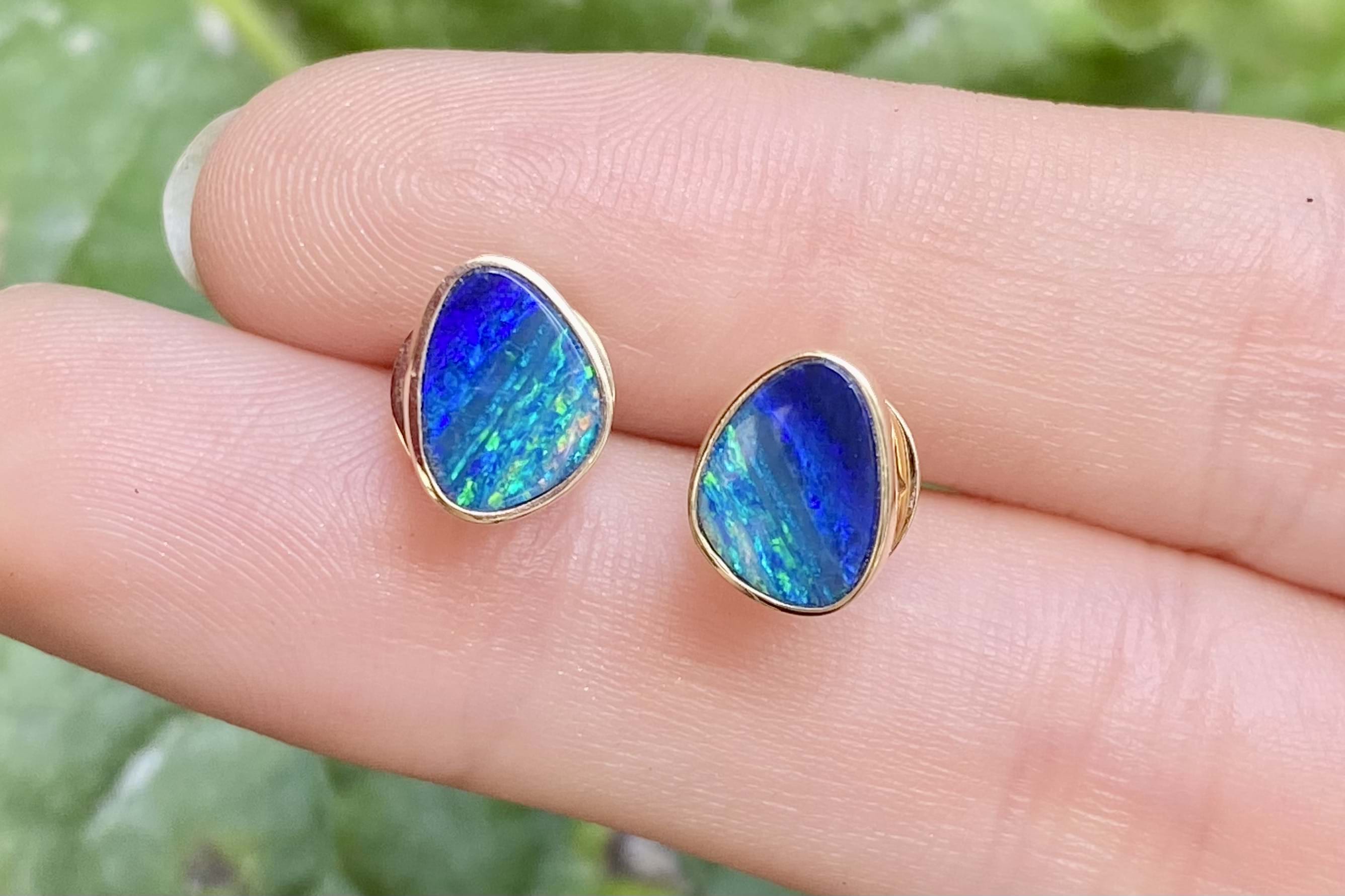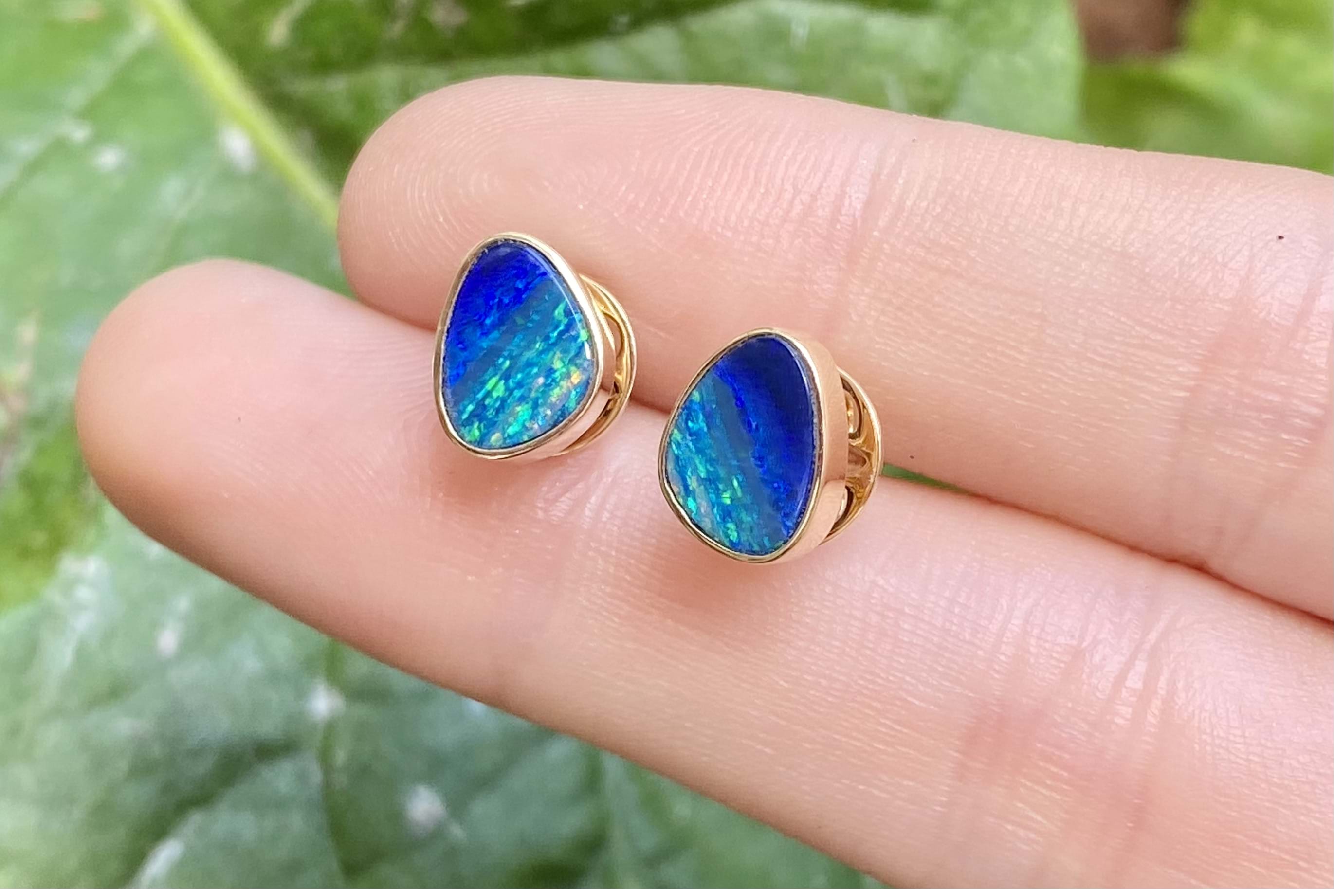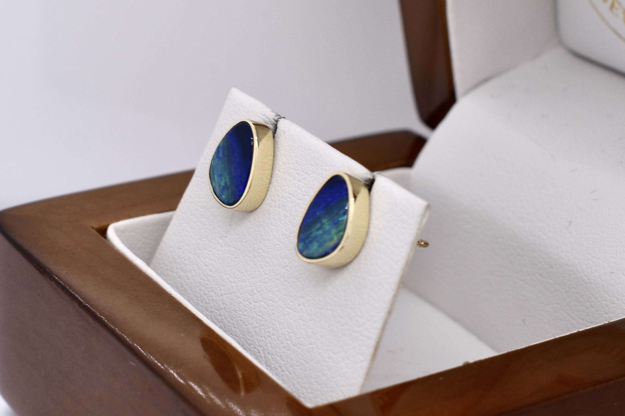 Simple and pretty pair of studs crafted in 9ct yellow gold, with two dark Coober Pedy opal doublets with flashes of green, yellow and blue throughout. The doublet consisting of Coober Pedy opal (on top) with a boulder opal backing. Studs measuring approx. 9.2x7.4mm and are bezel set. Completed with post and butterfly fittings.