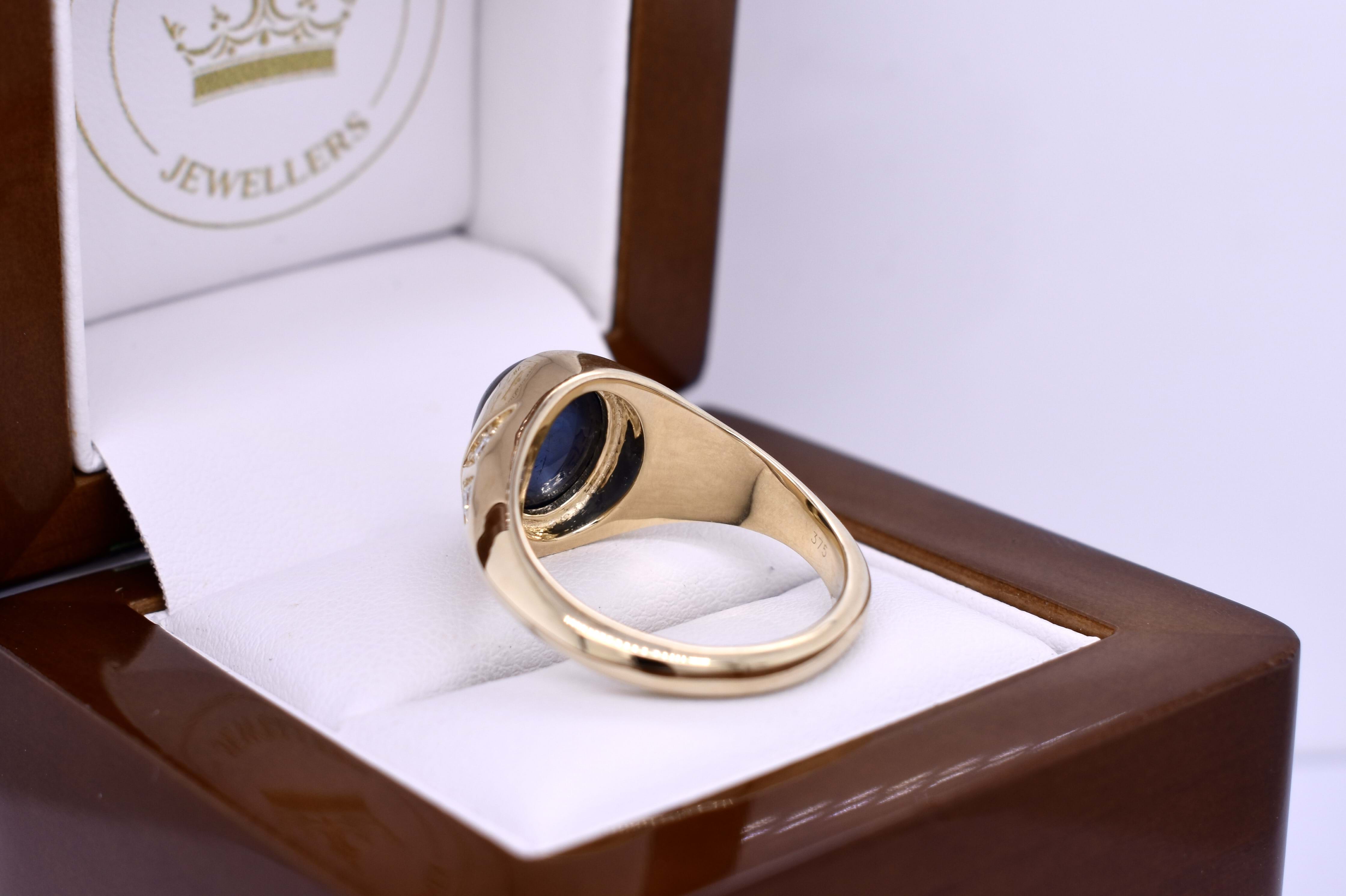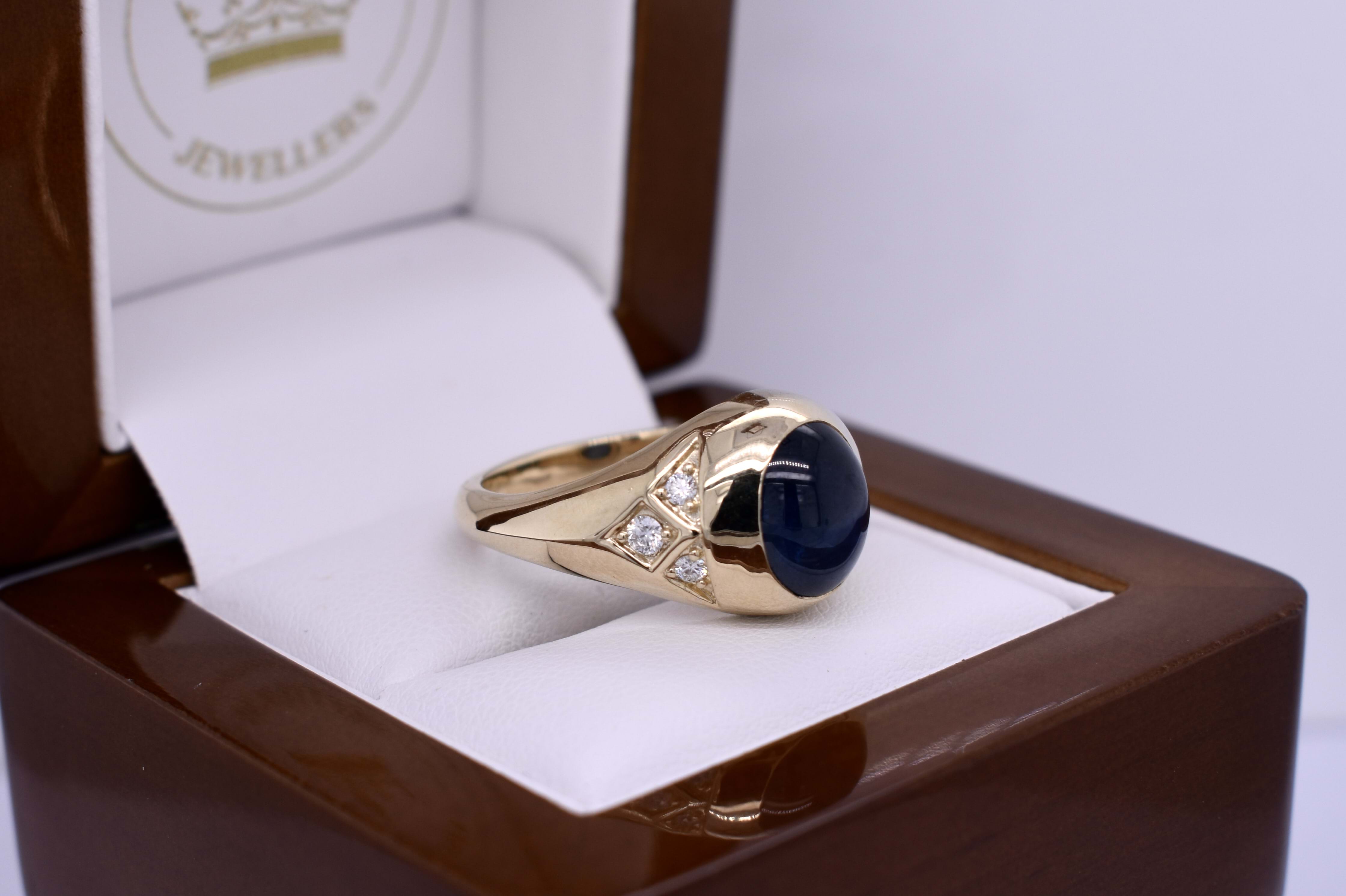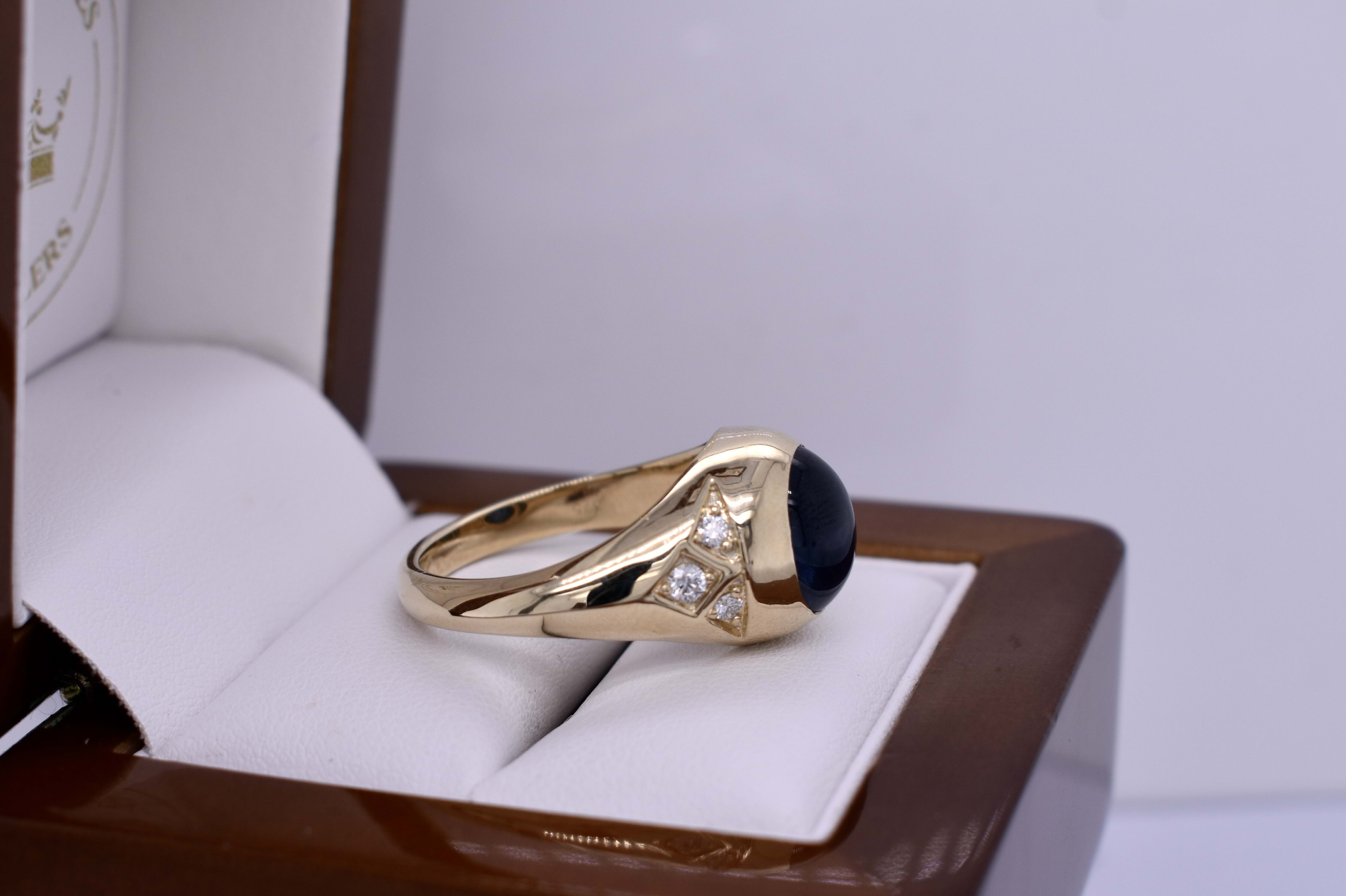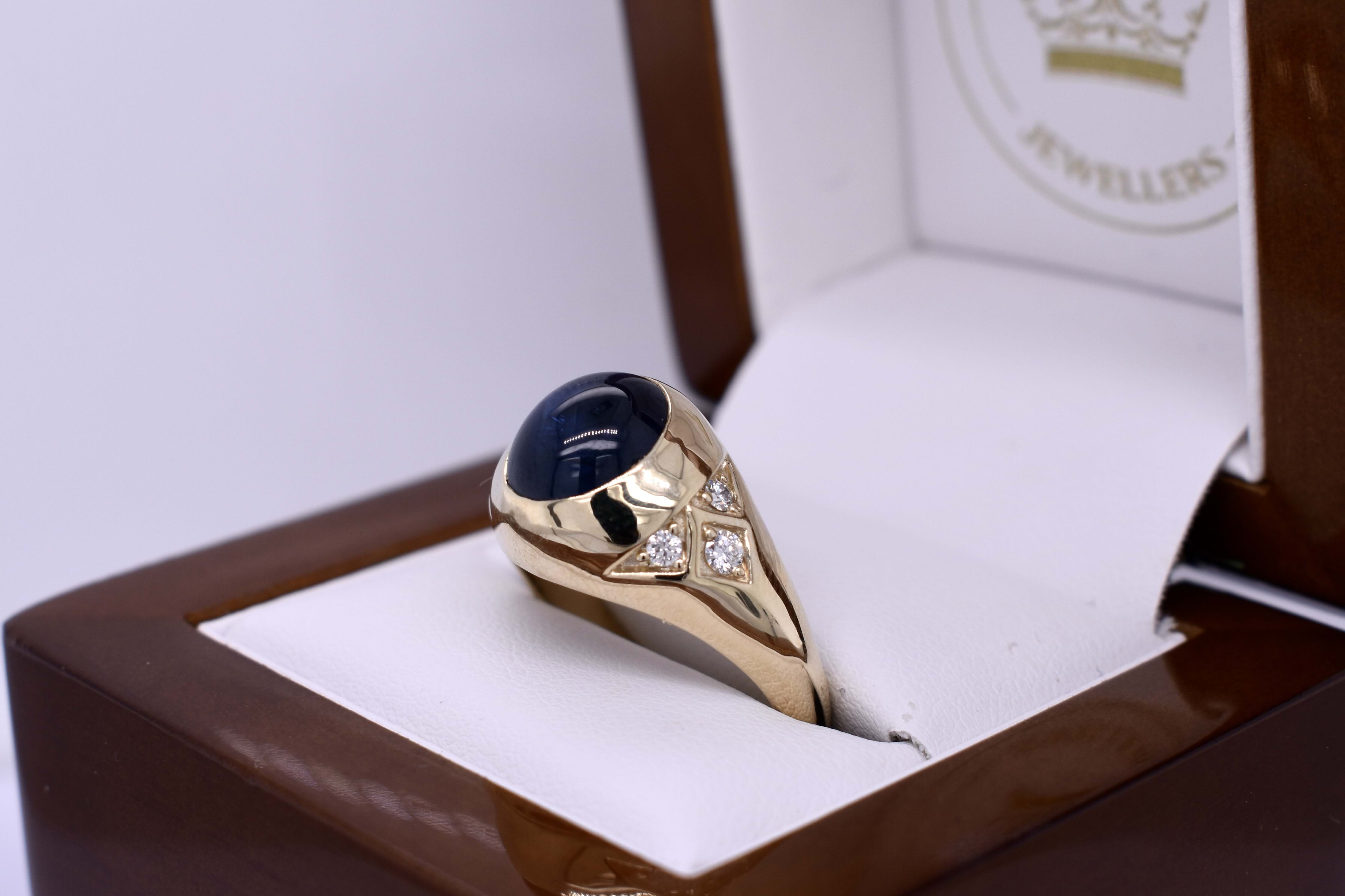 Crafted in 9ct yellow gold this beautiful ring features a moderately bright deep blue oval 6.40ct cabochon sapphire rub over set into a domed ring with three bright F/G SI diamonds triangular grain set each side into the tapered shoulders on a 2.97mm band. Total diamond weight 0.23ct. Finger size S+. Independent Valuation Supplied