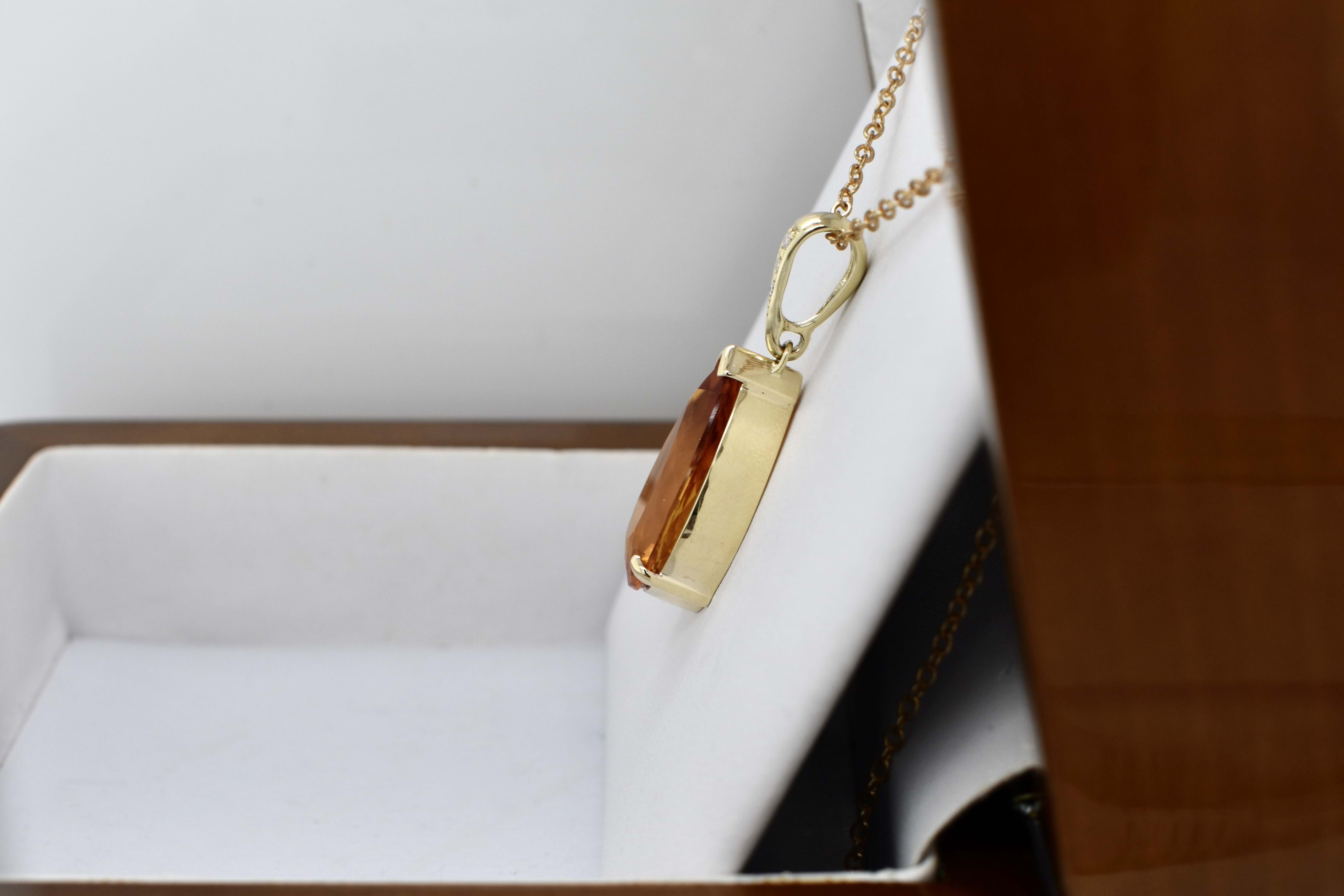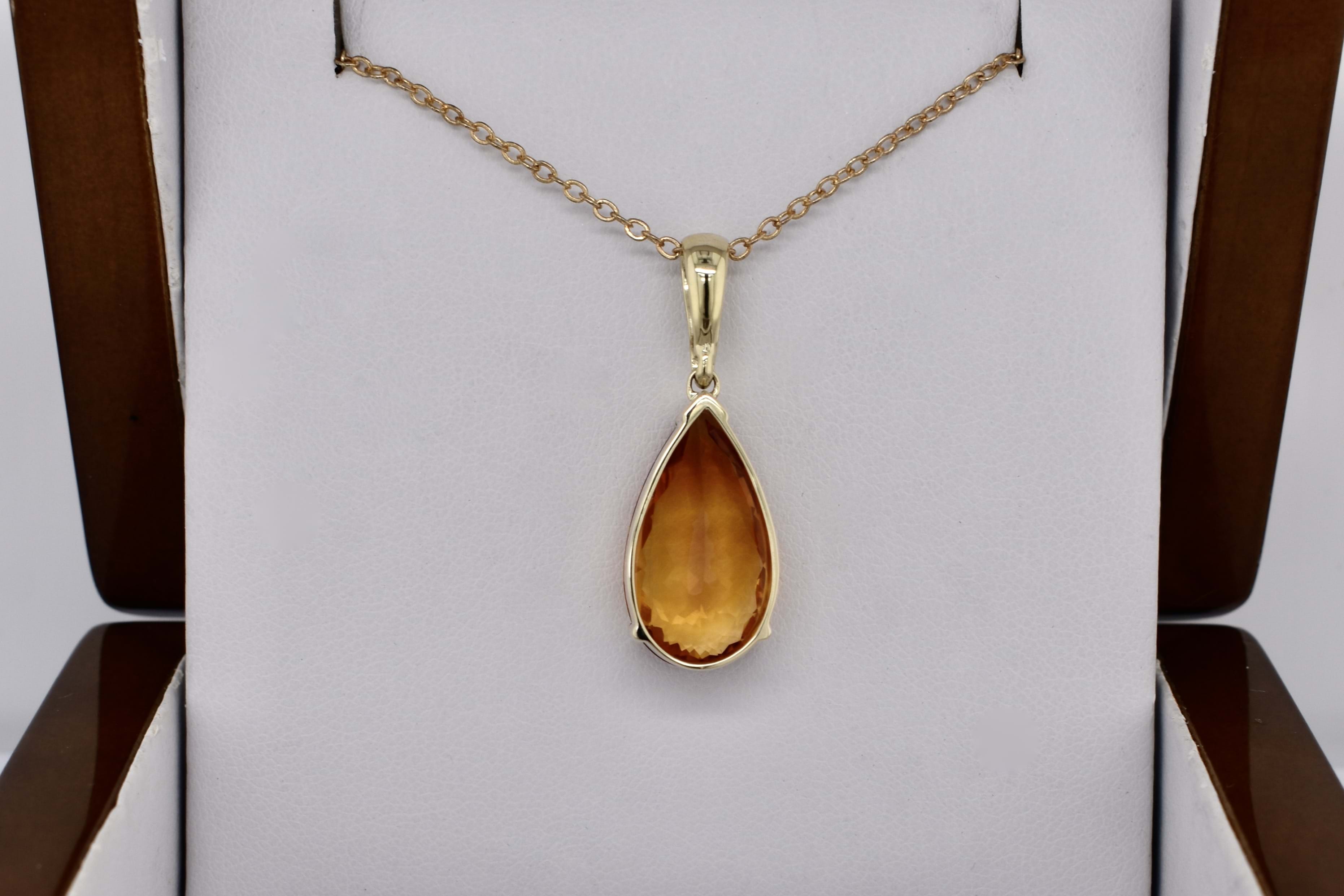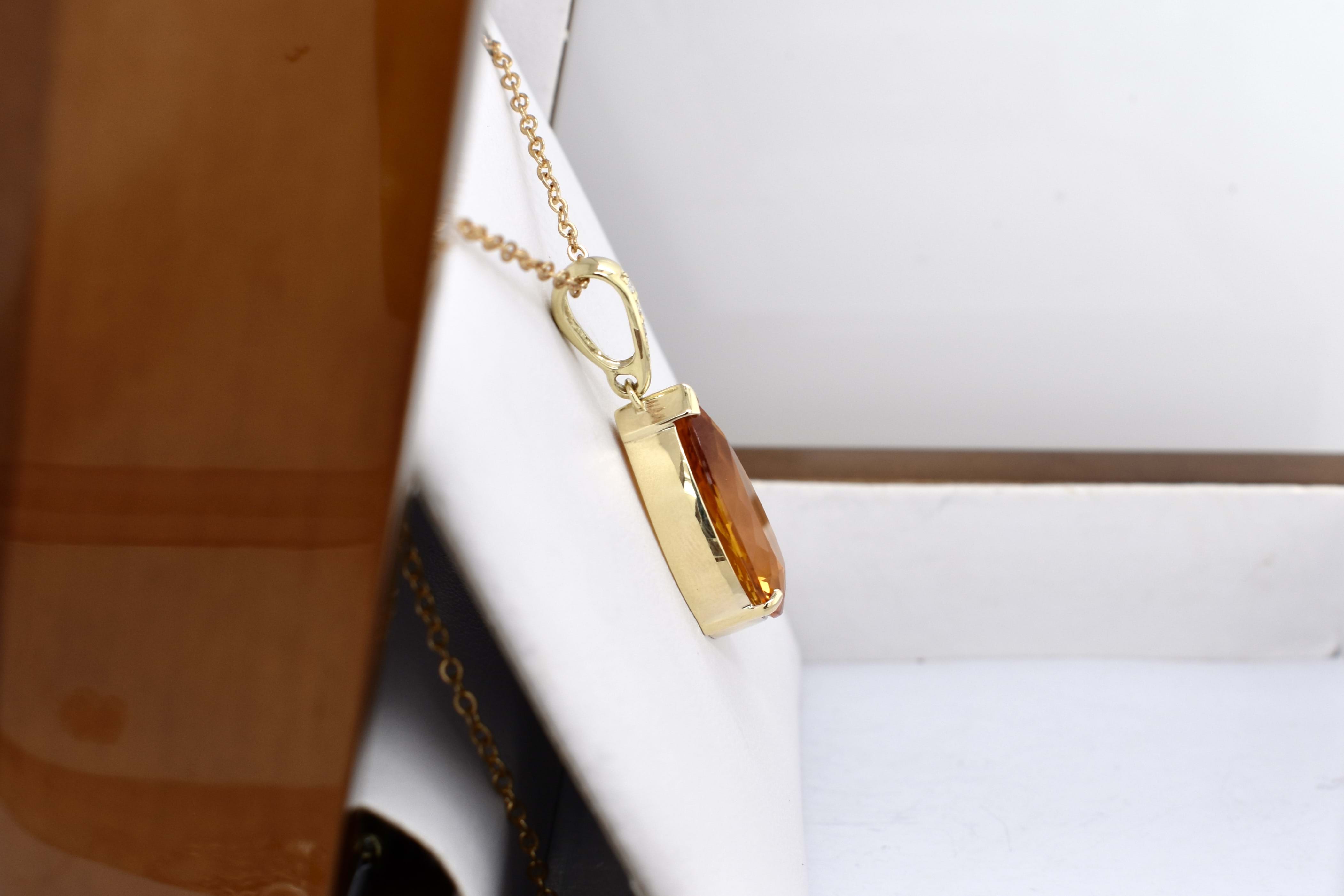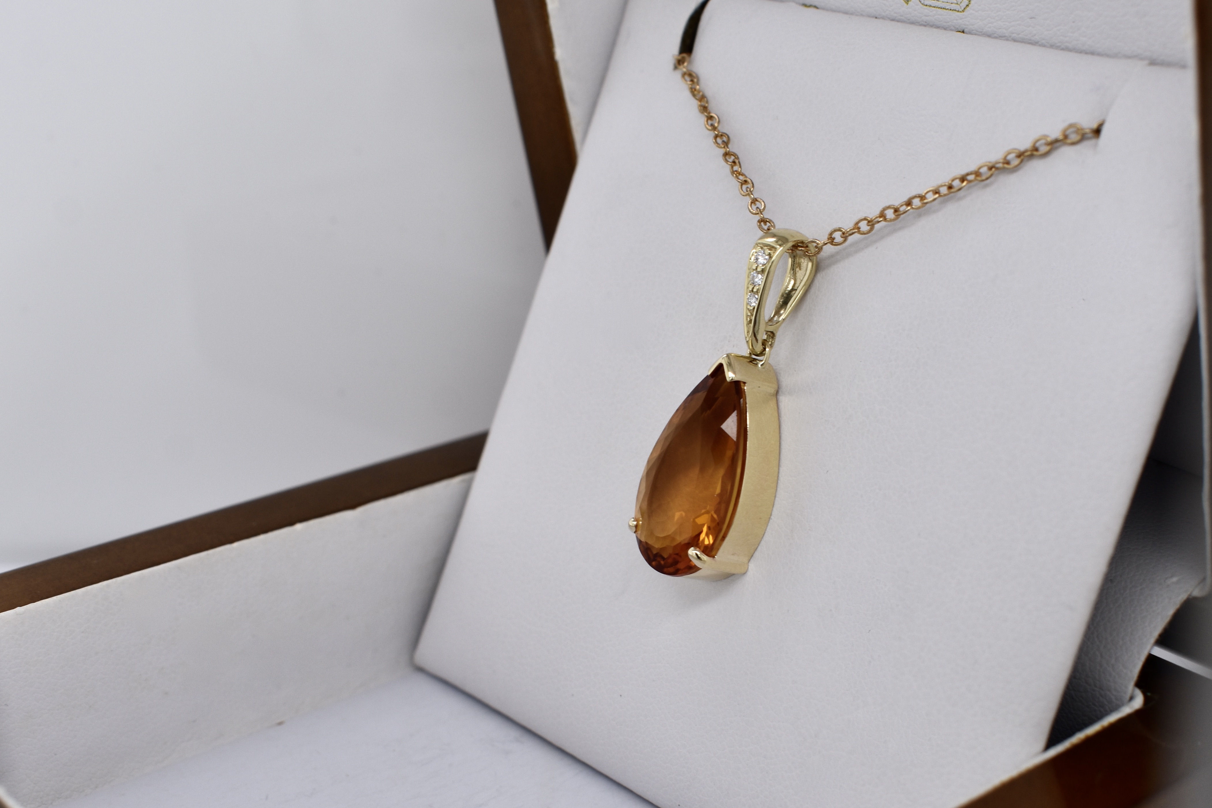 This beautiful large enhancer, with a large pear shaped citrine measuring 21.4x11.6mm, is two claw and cap set in 9ct yellow gold, with a diamond set enhancer clip. With three round brilliant diamonds totalling 0.03ct GH VS. The enhancer bale allows the piece to be worn on a chain, clipped onto pearls and bolt rings.