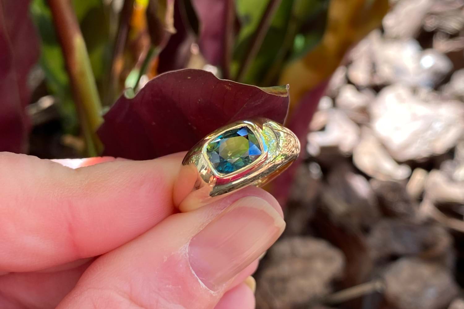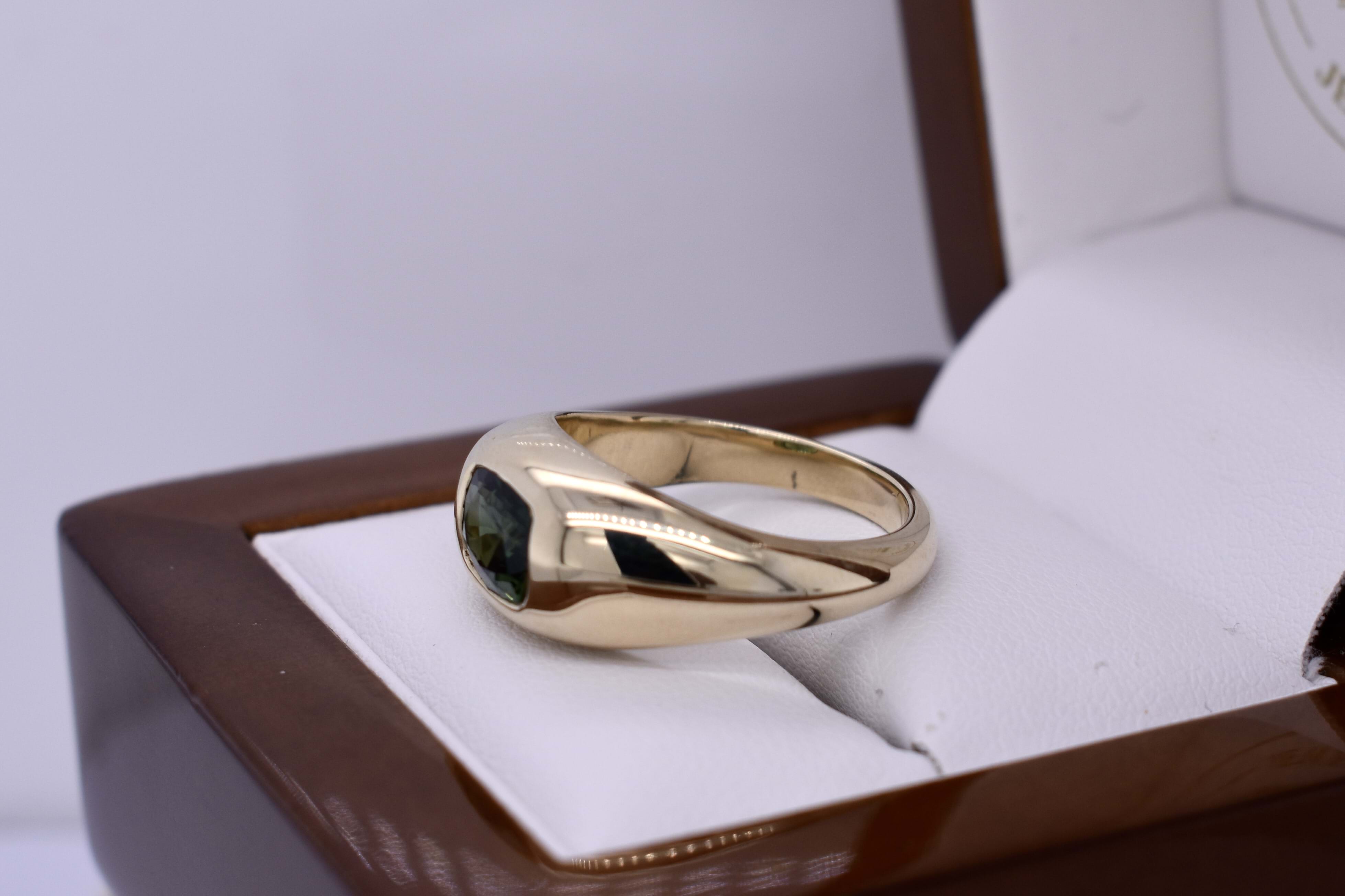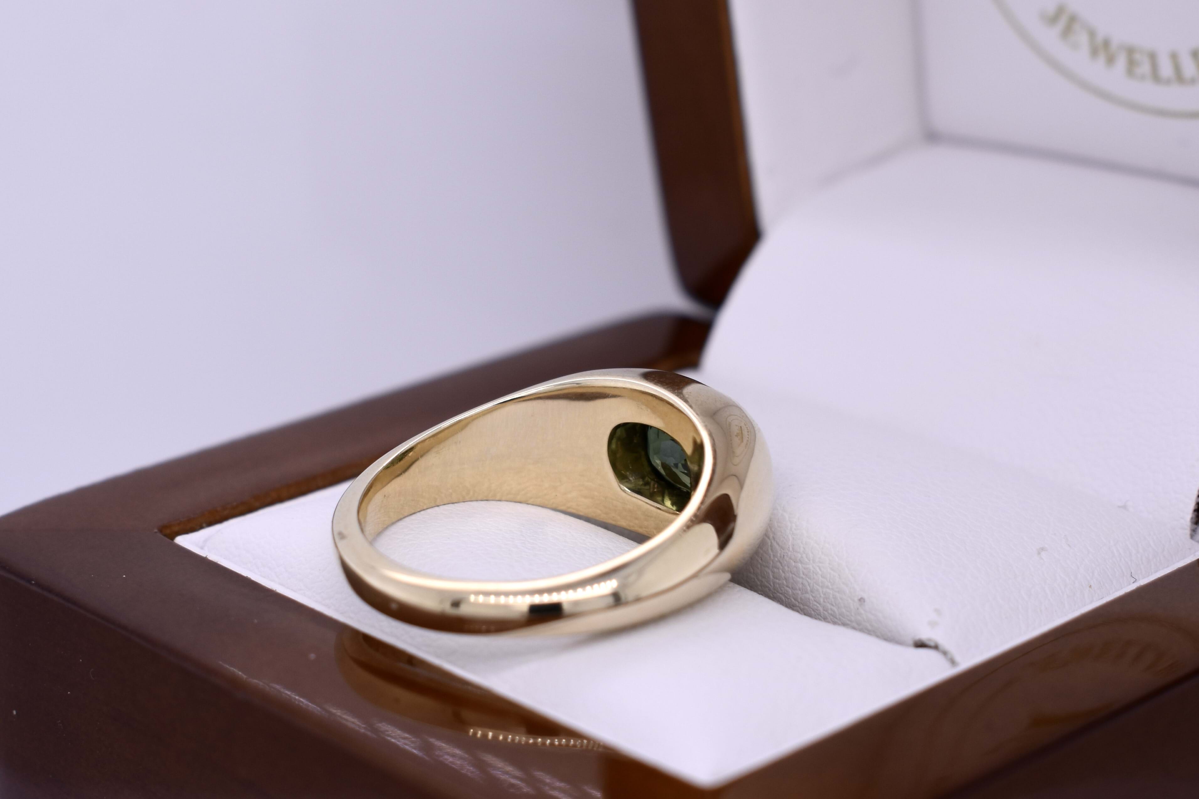 Beautifully crafted in 9ct yellow gold, this gents ring features a 1.93ct bright, deep mid green cushion cut Australian sapphire pressure set into a domed top ring with tapered shoulders and a 2.94mm plain band. Finger size O+. Independent Valuation Supplied.
