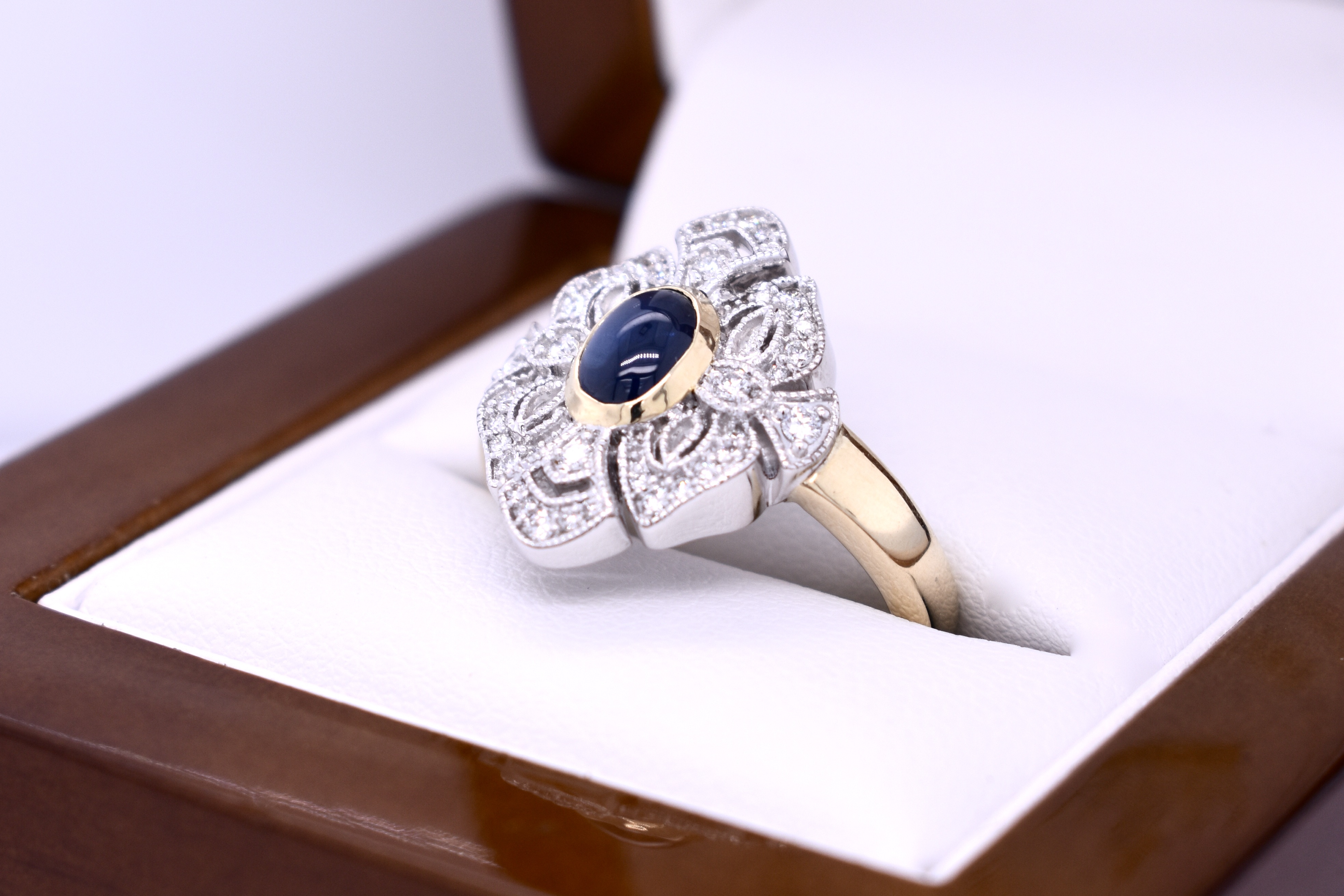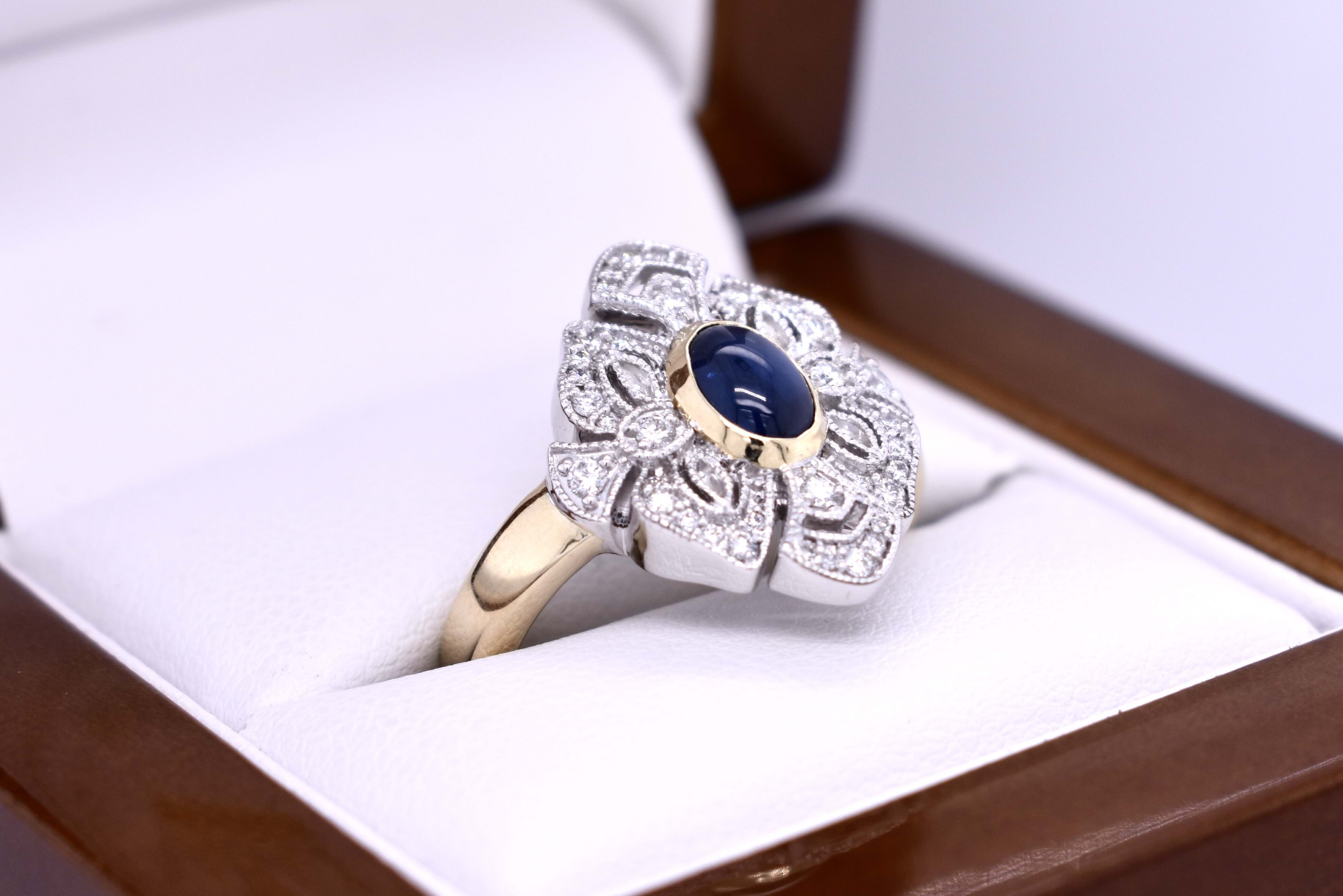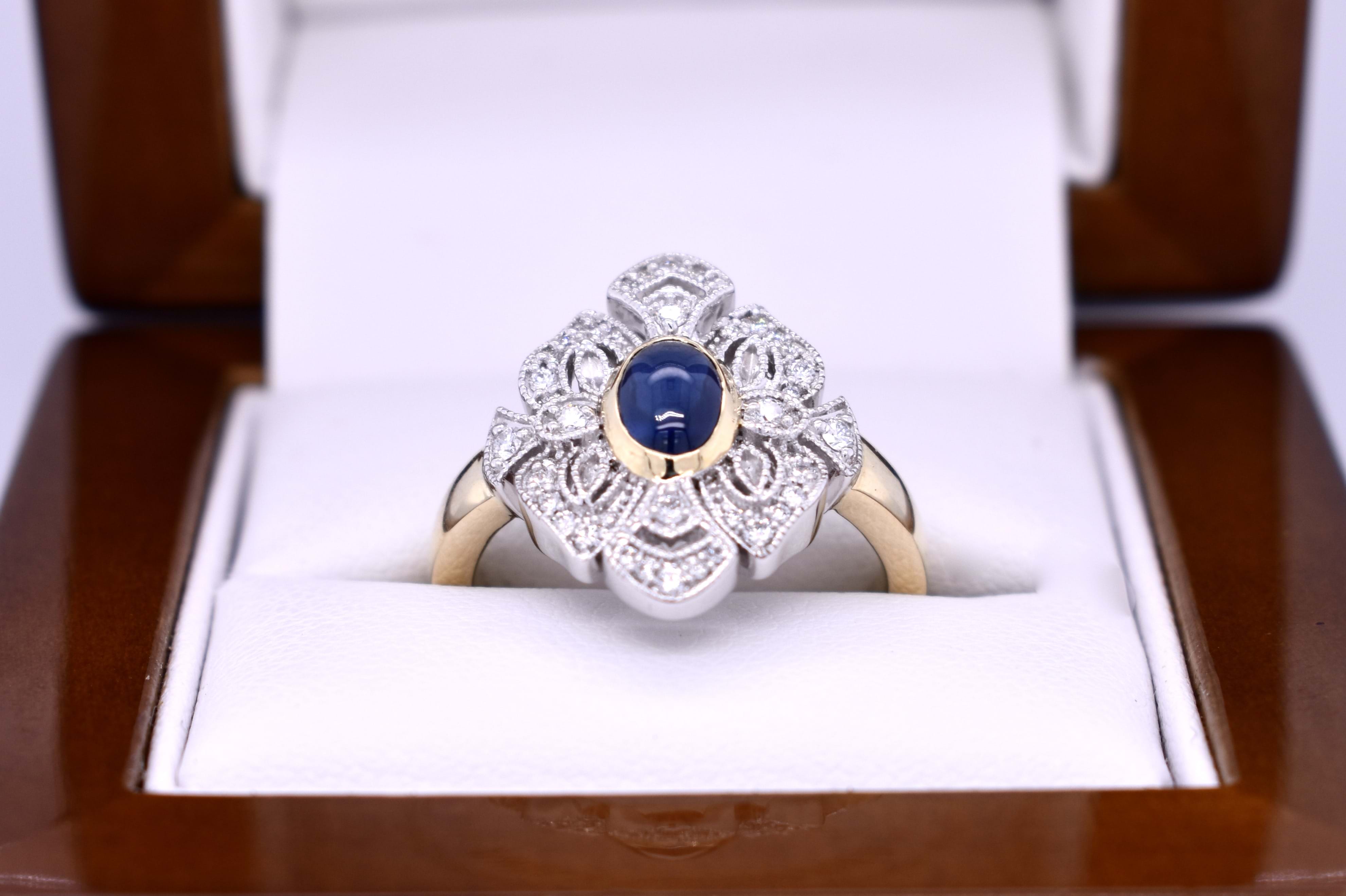 Beautifully detailed, this deco styled ring is crafted in both 9ct yellow gold and 9ct white gold, featuring an oval cabochon blue sapphire of 1.37ct, bezel set. The fancy scroll border is diamond shaped and set with 40 round brilliant cut diamonds totalling 0.26ct G SI. Finished on a plain yellow gold band. Finger size M+.