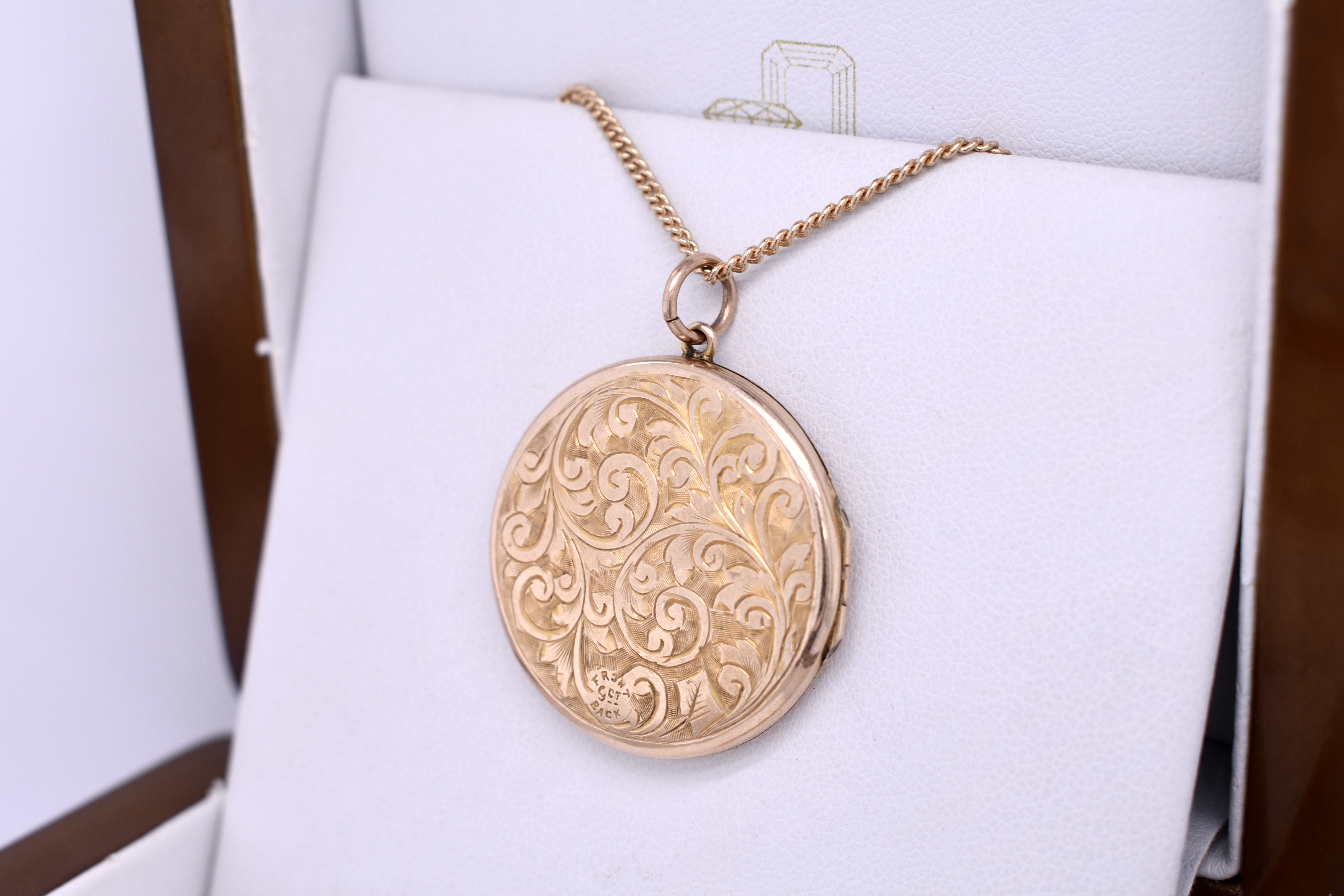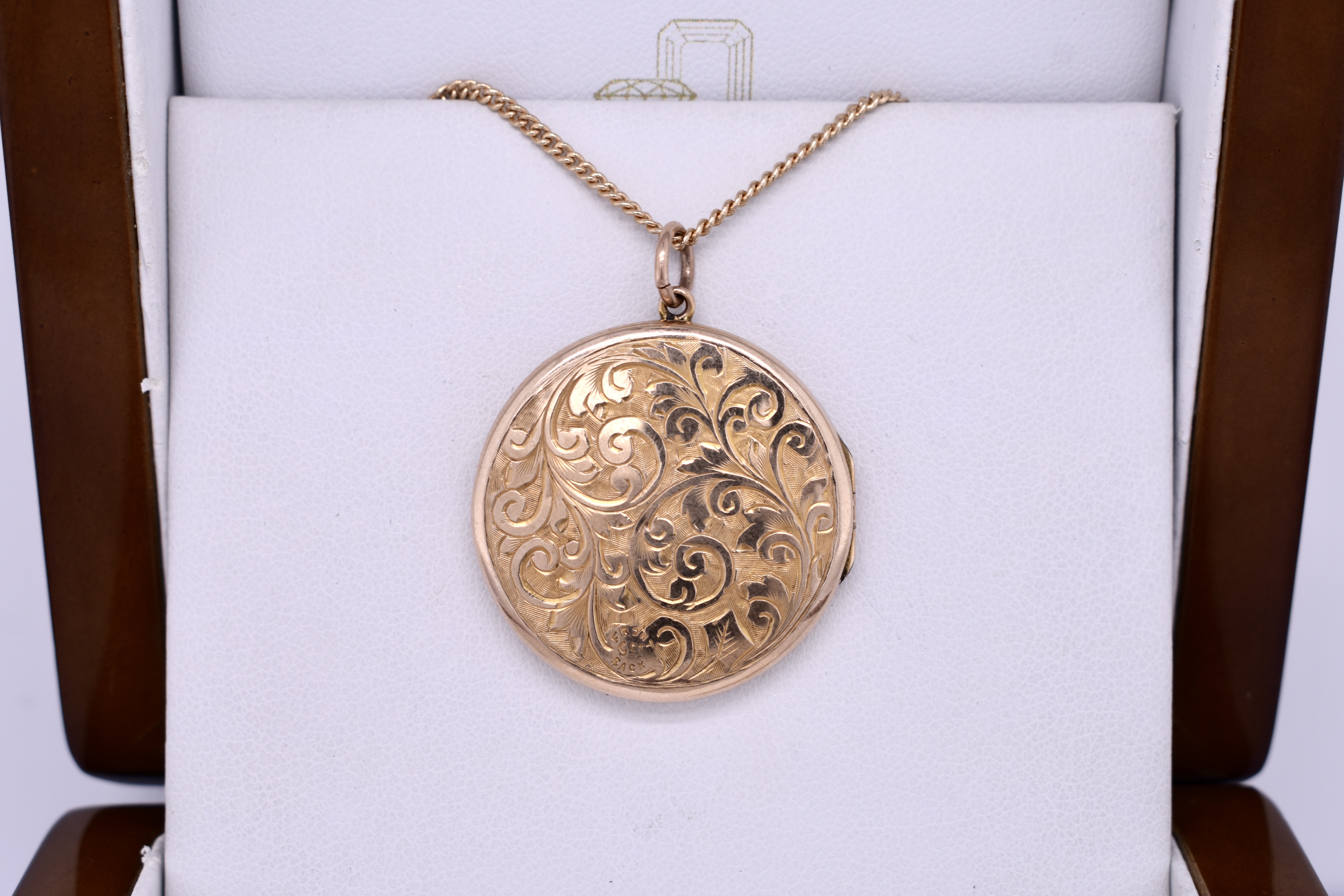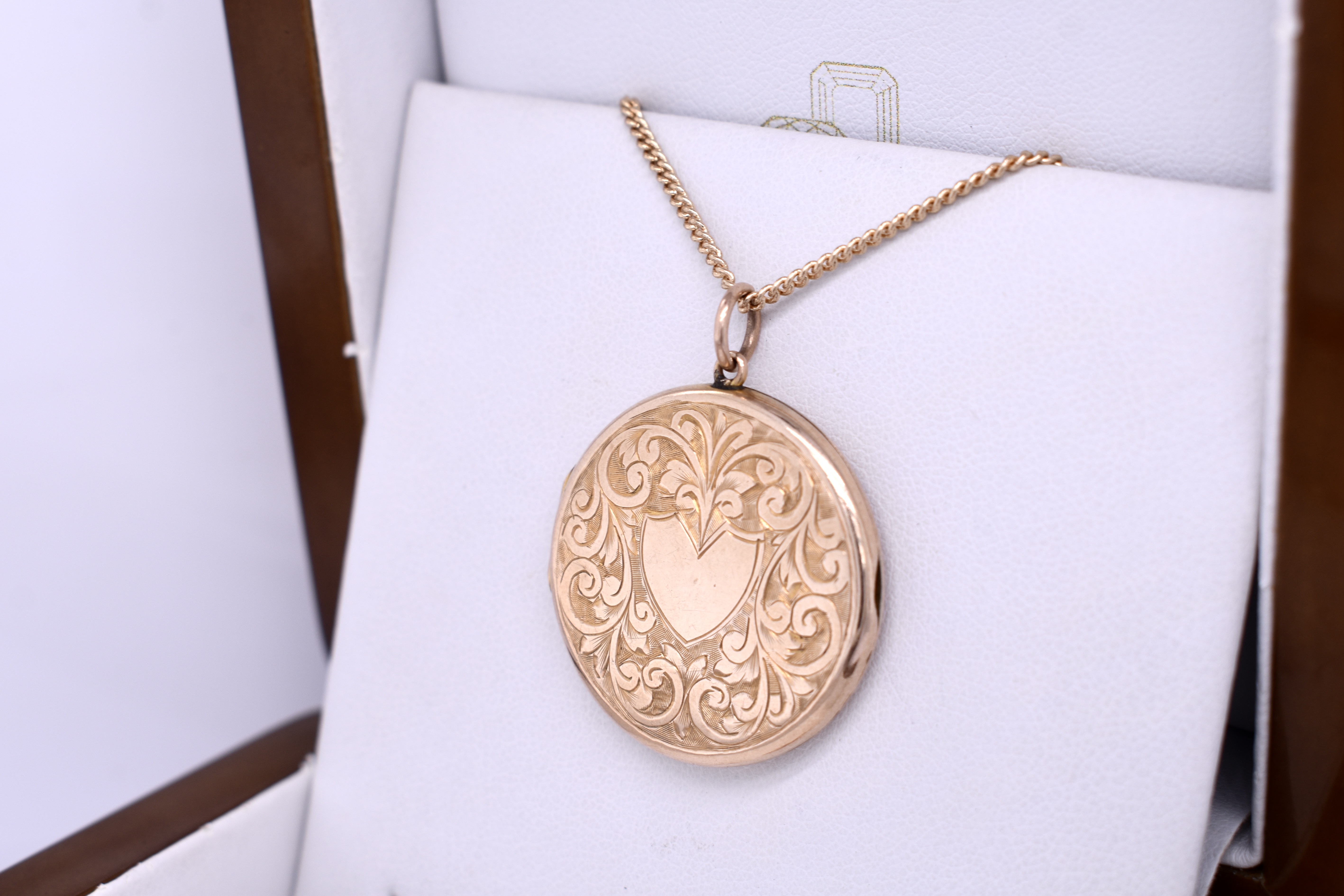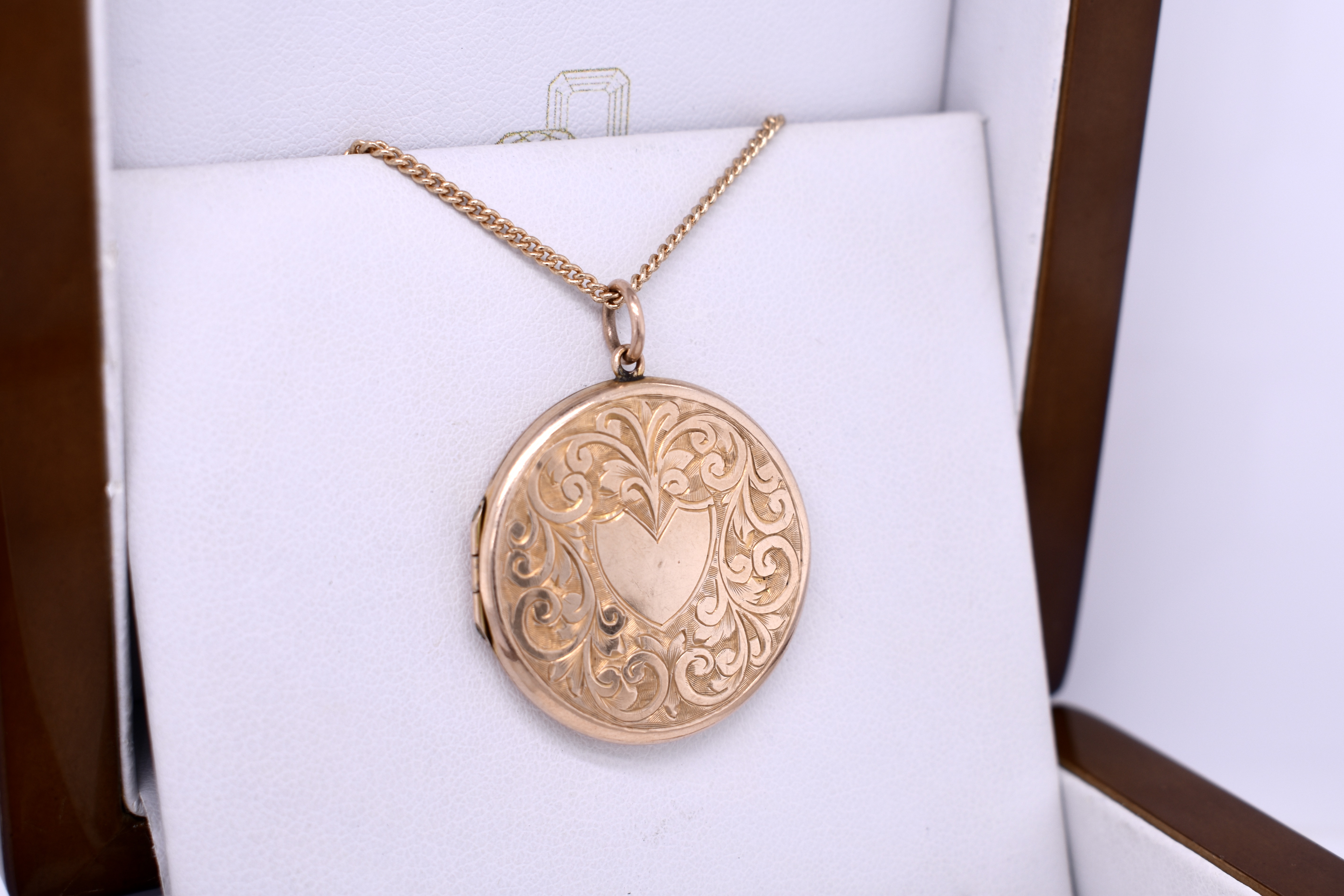 The prettiest 9ct yellow gold back and front floral scroll engraved locket, with a heart shape in the centre. This Edwardian locket measures 38mm round and inside is still intact. Finished with a jump ring bale. Chains available for separate purchase.