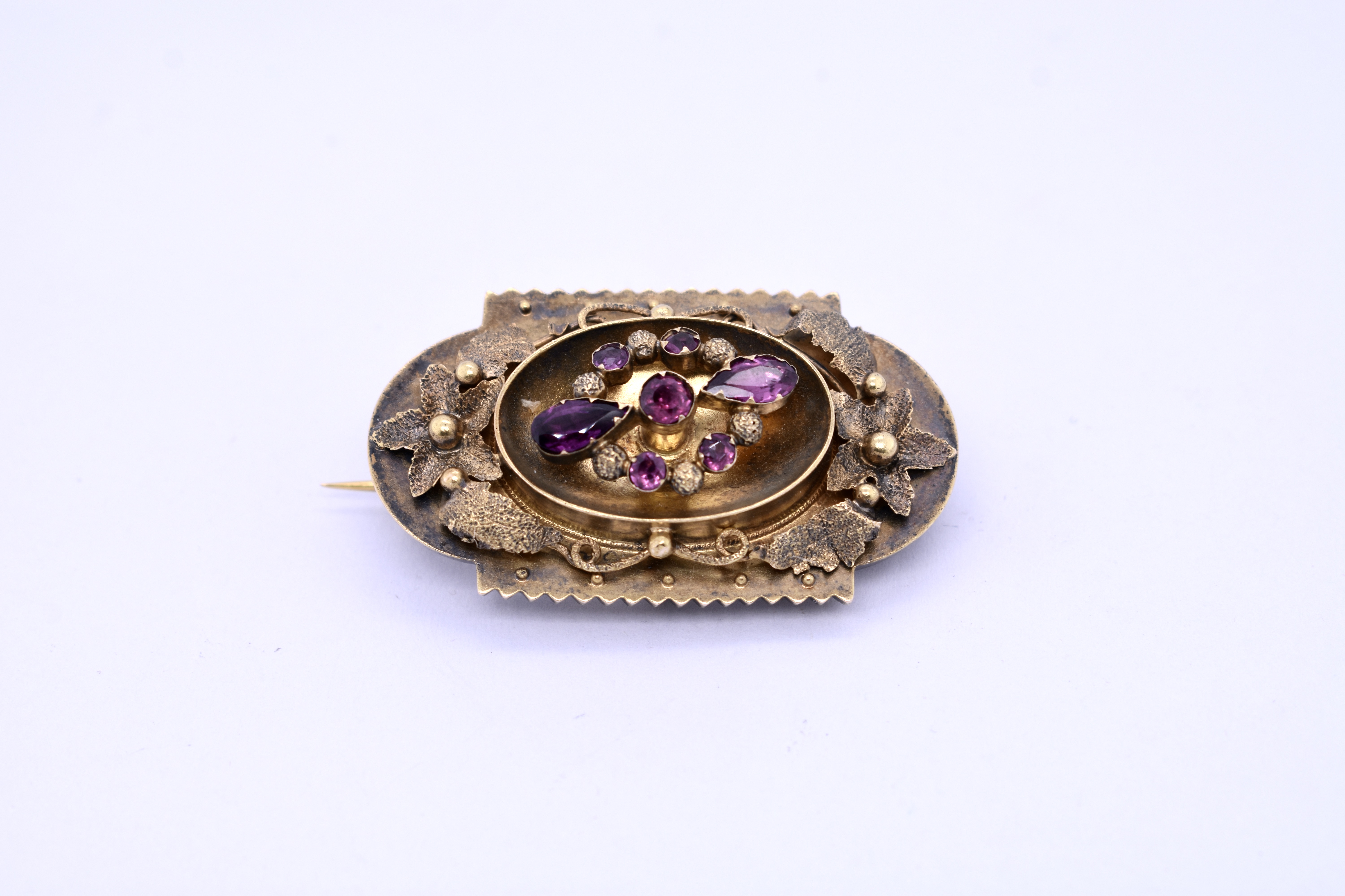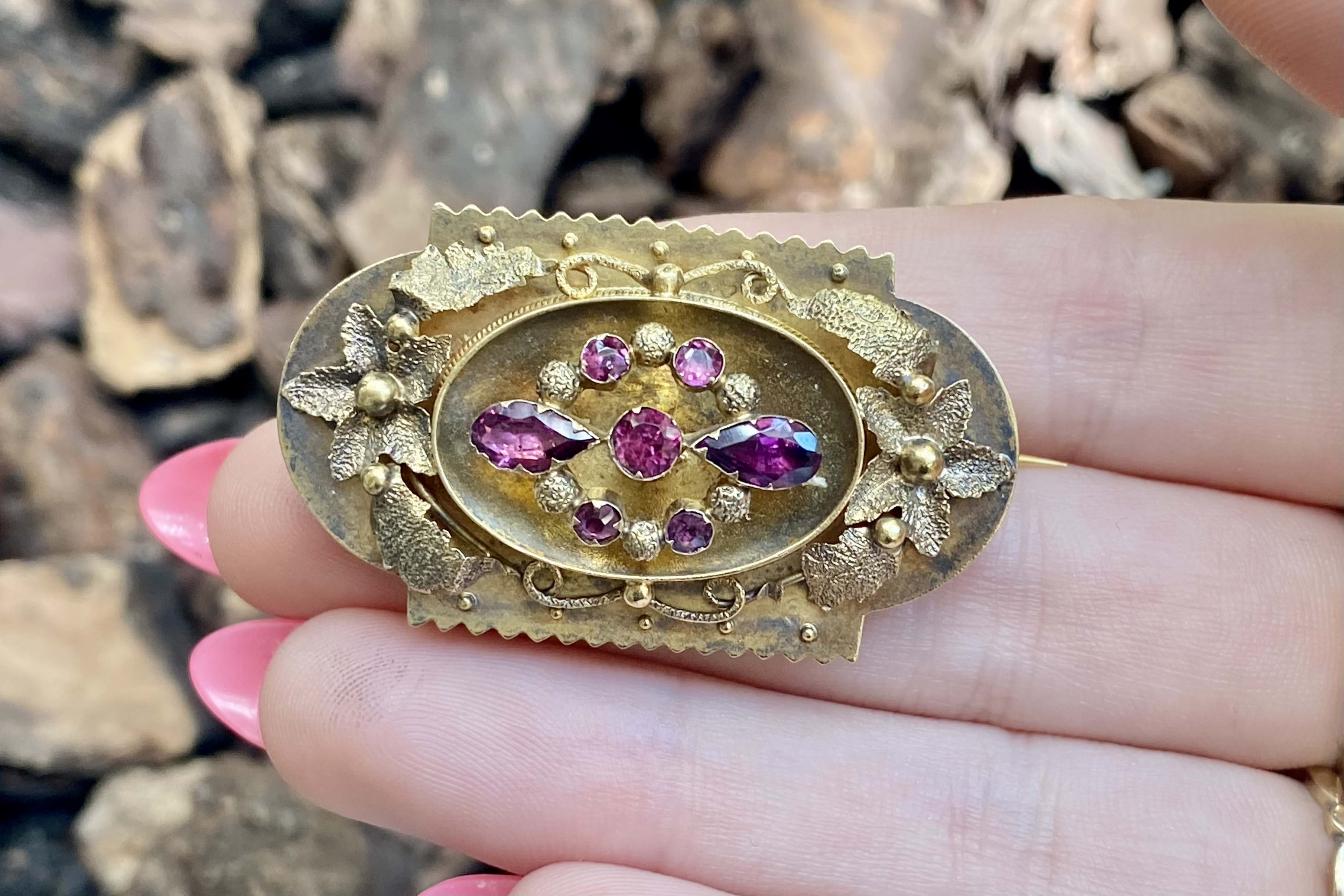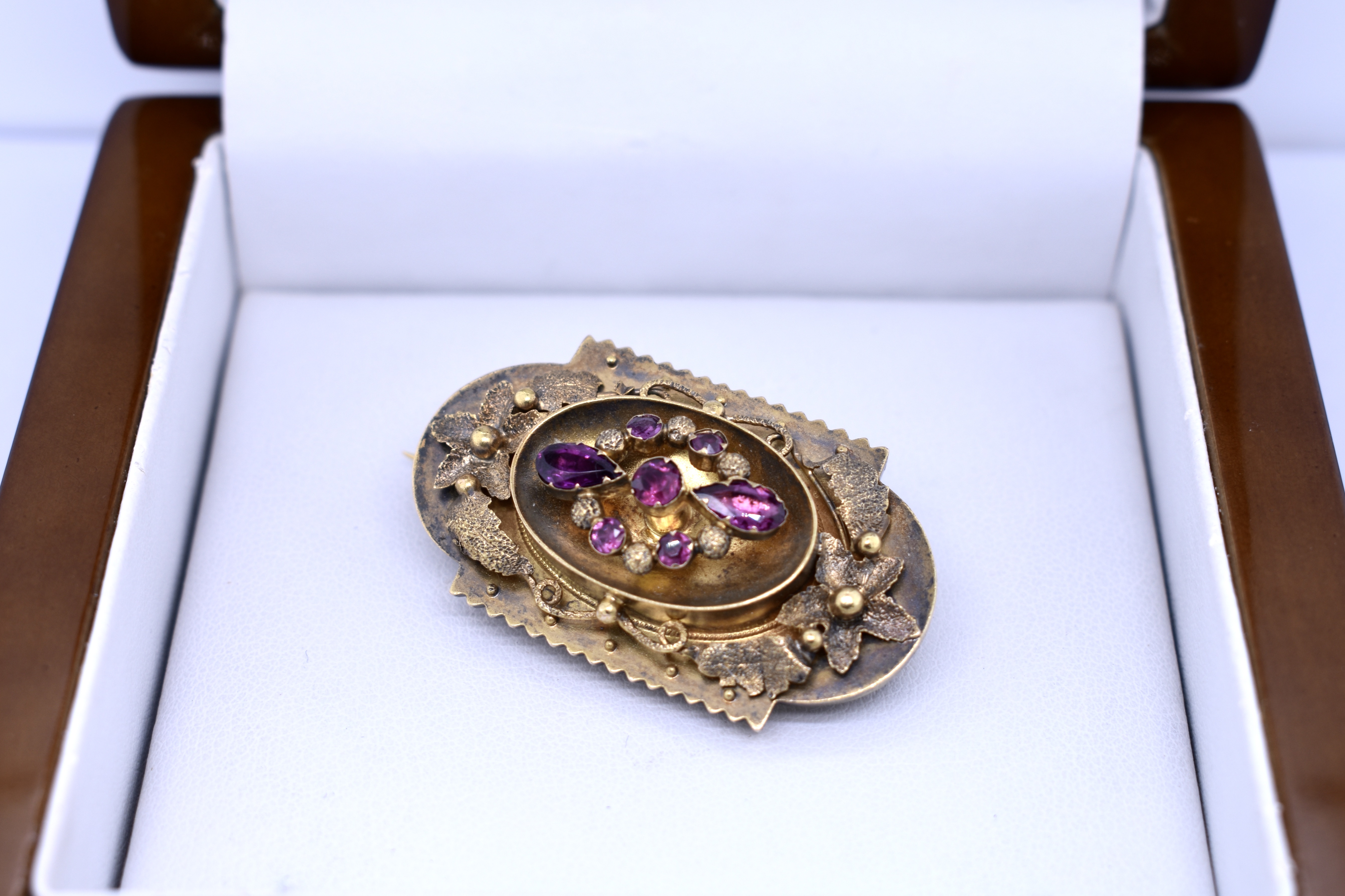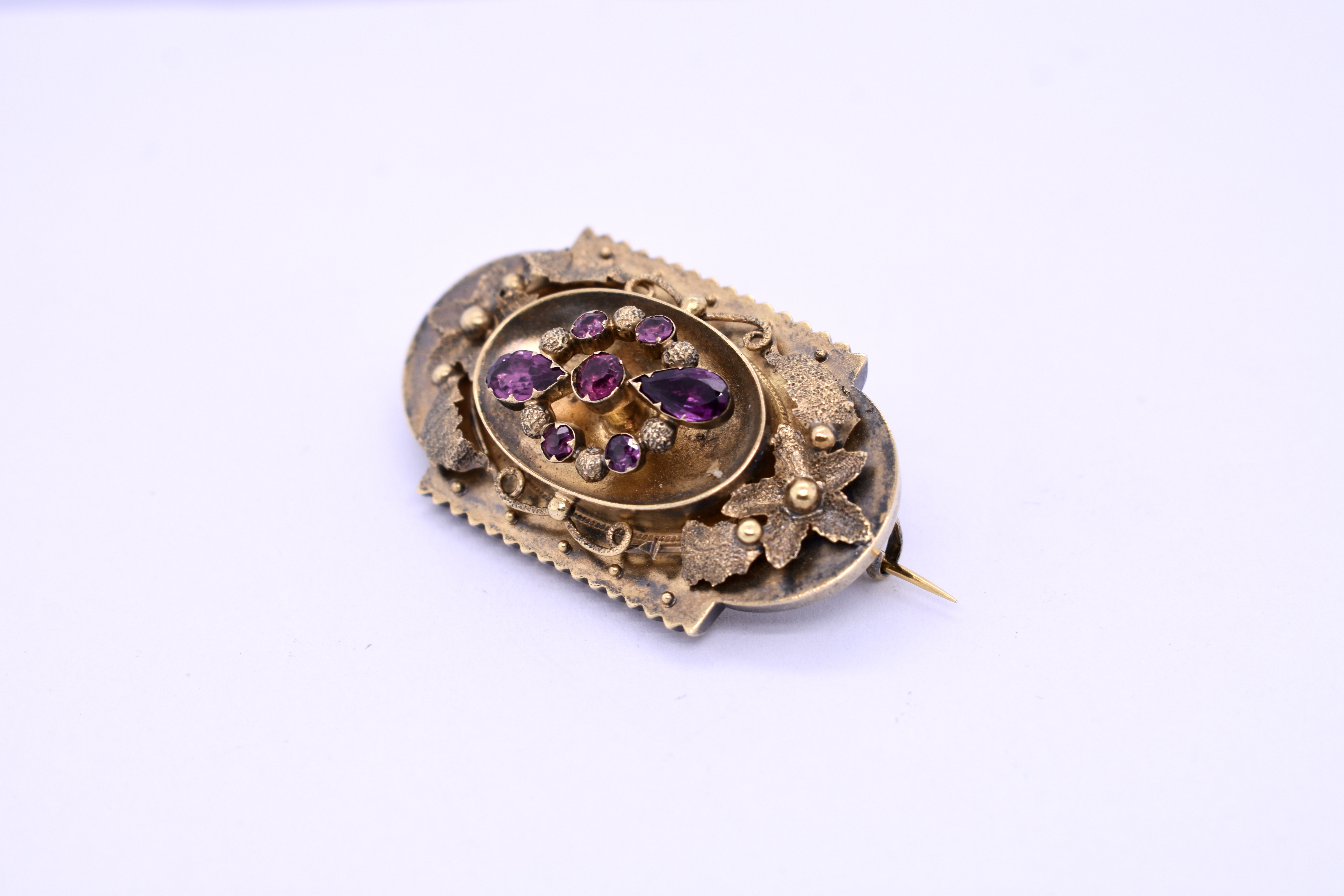 Beautifully detailed, this antique Victorian oval 9ct yellow gold brooch has a gorgeous leaf and flower textured overlay, set with seven 3.60mm rhodolite garnets. Brooch measures 43x25mm and the back has a memory locket, complete with a c clip and brass pin. Dated circa 1900. Independent Valuation Supplied