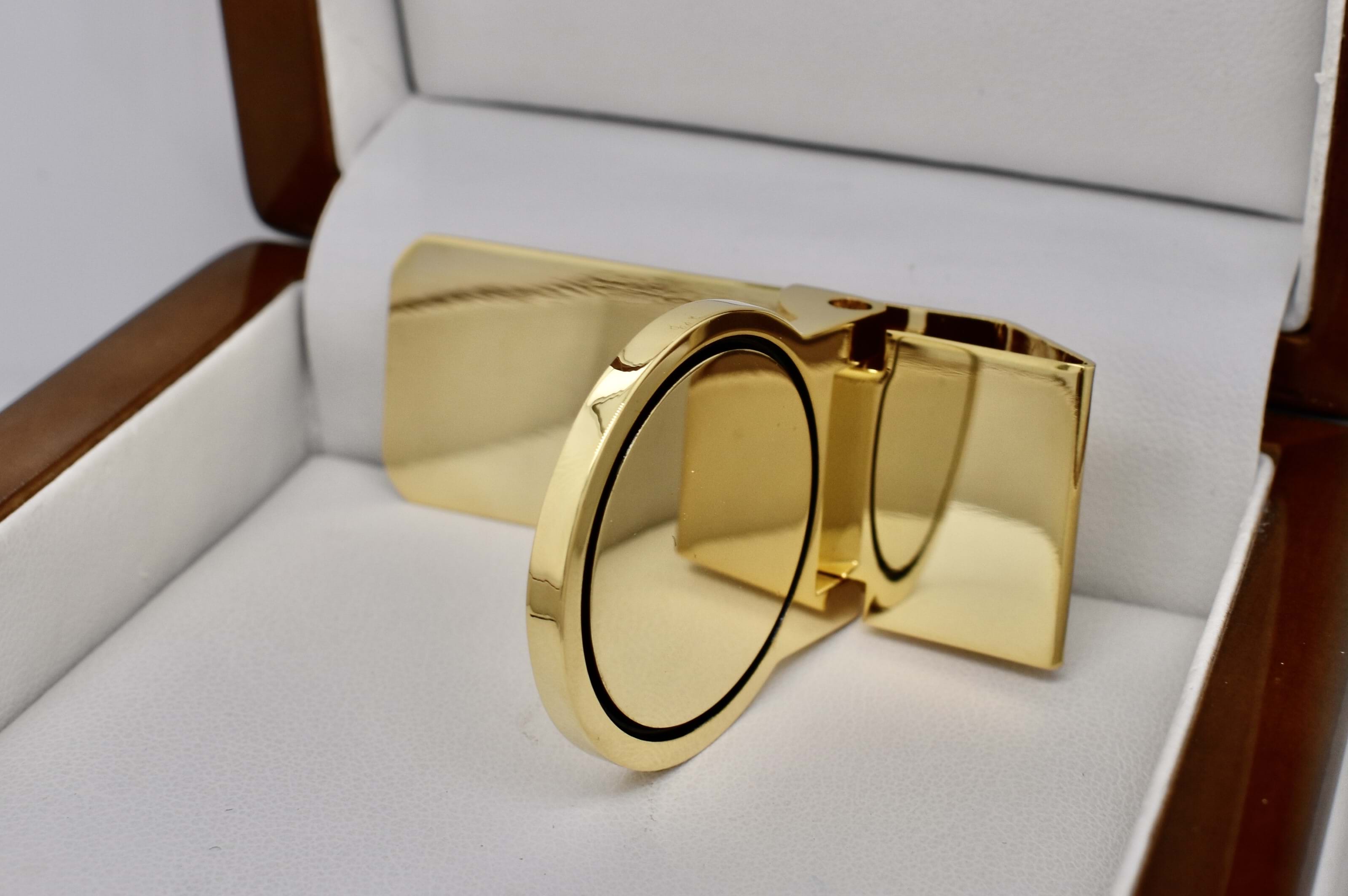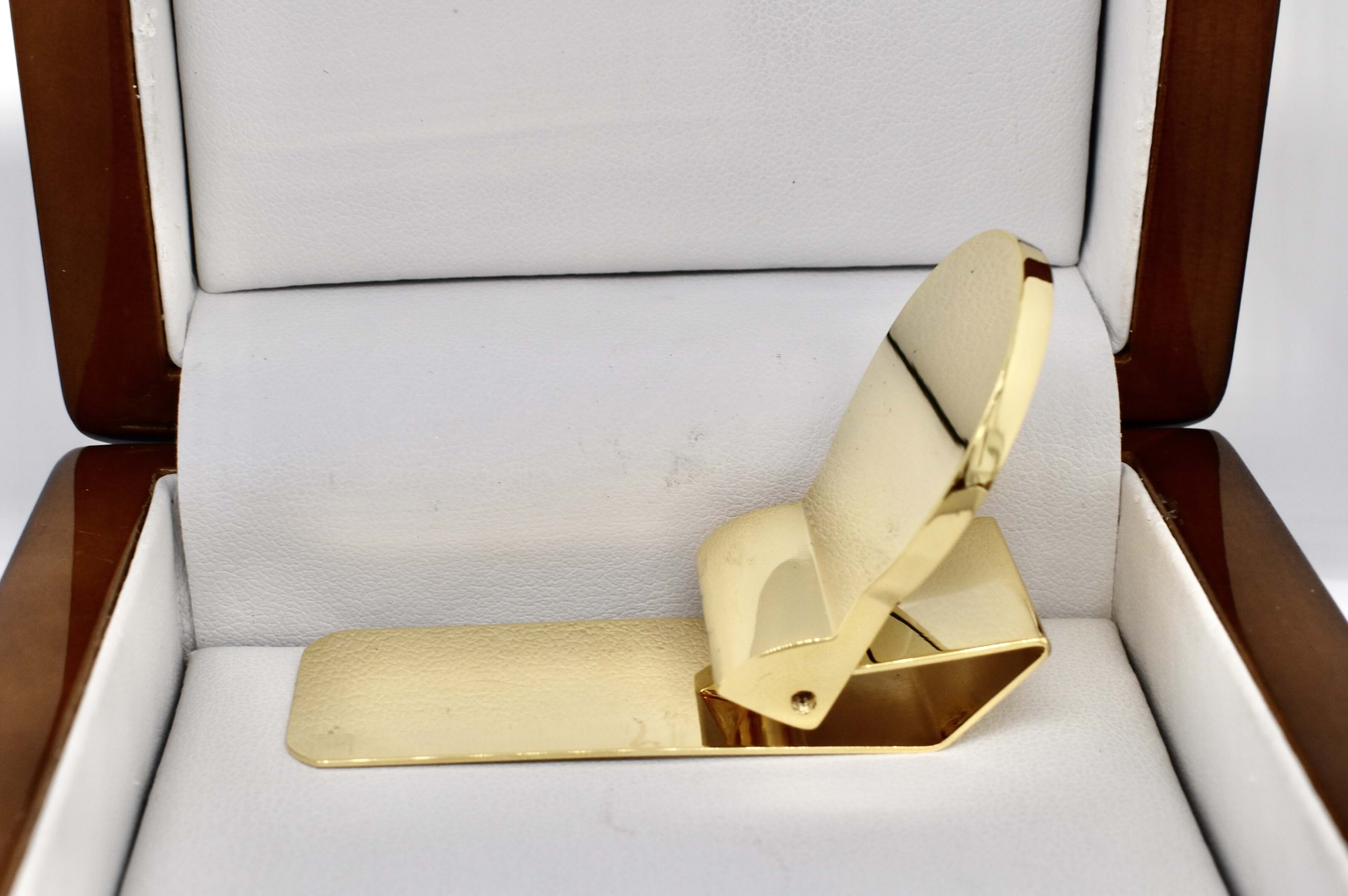 This awesome hinged money clip is gold plated and has a circular design.