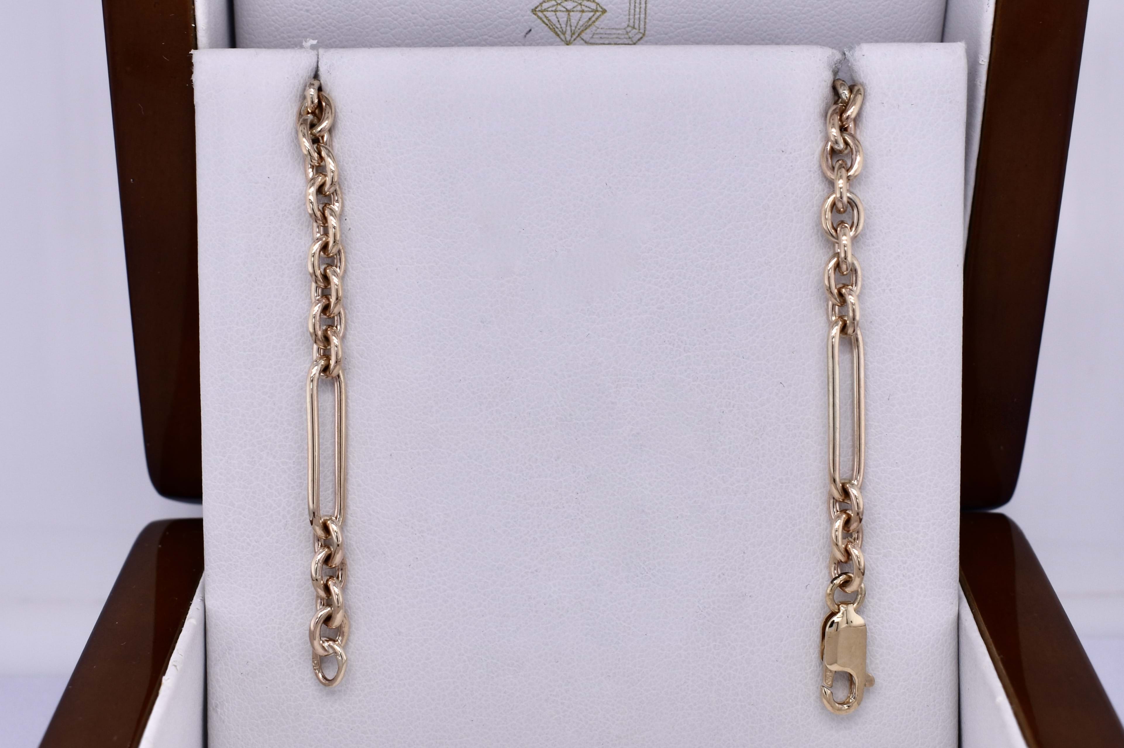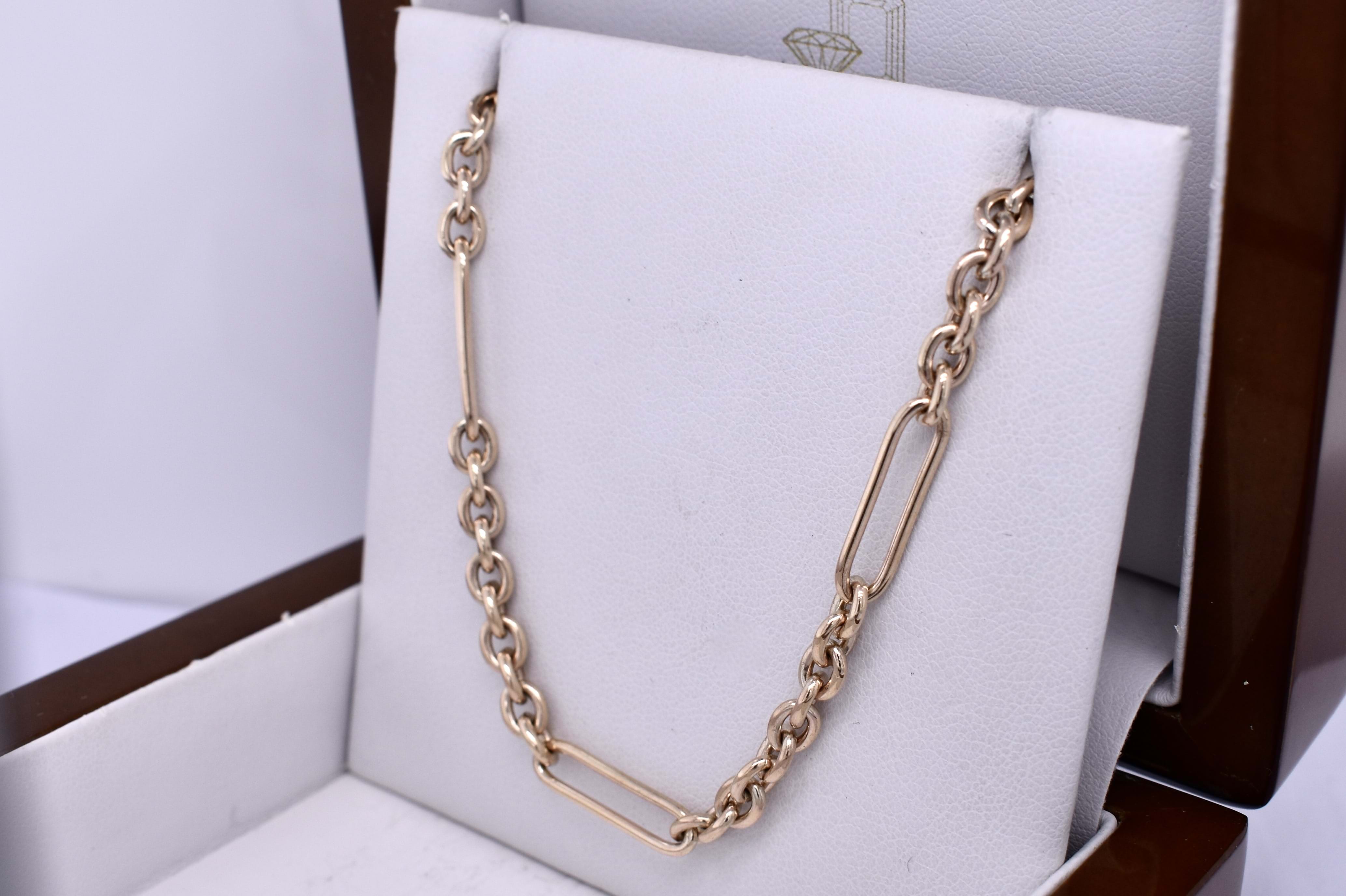 This beautiful chain was handmade by our goldsmith in 9ct yellow gold in this pretty 9/1 cable link (9 short, 1 long). It has a 12x4mm parrot clasp. Chain measures 47cm long and weighs 19.56 grams.