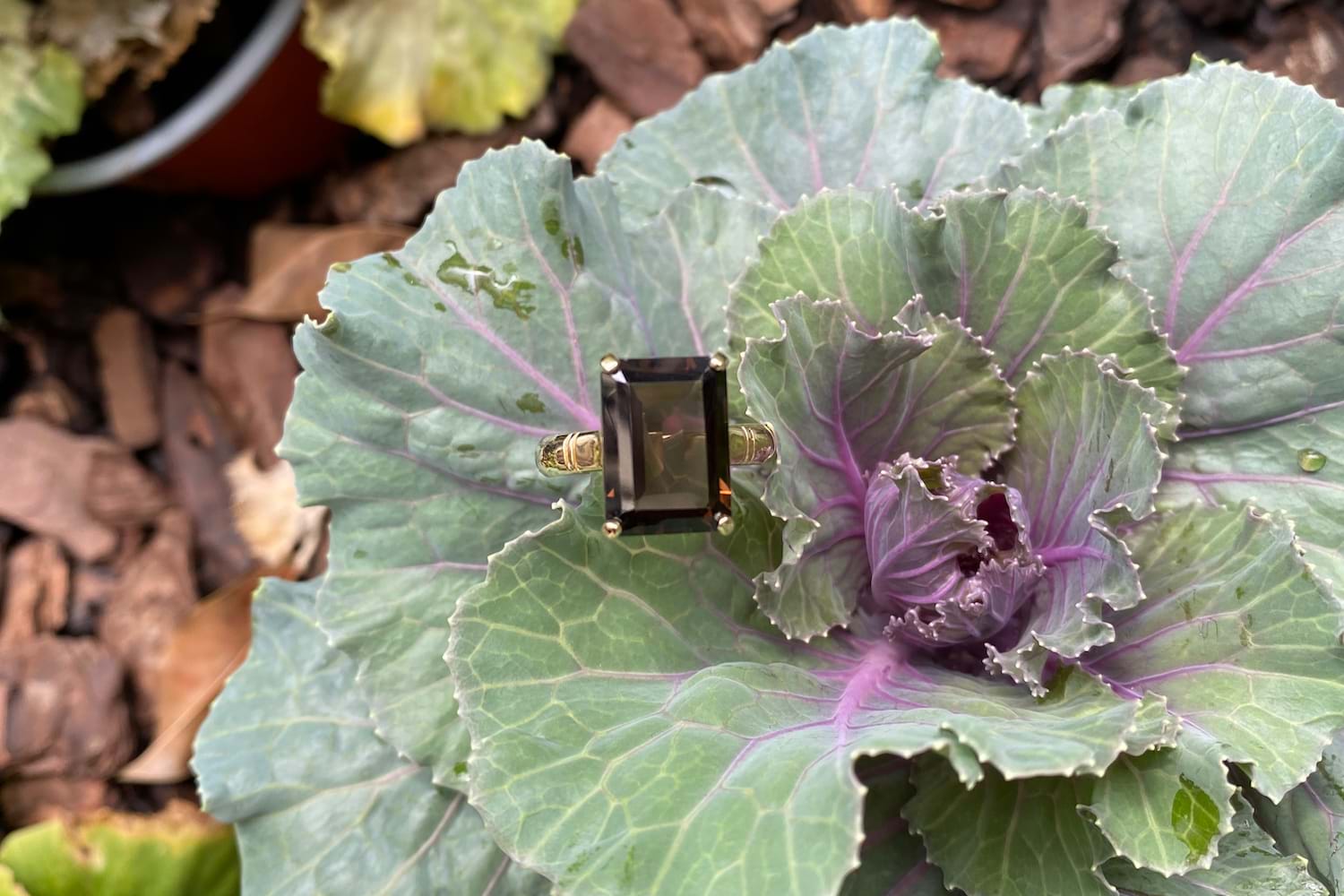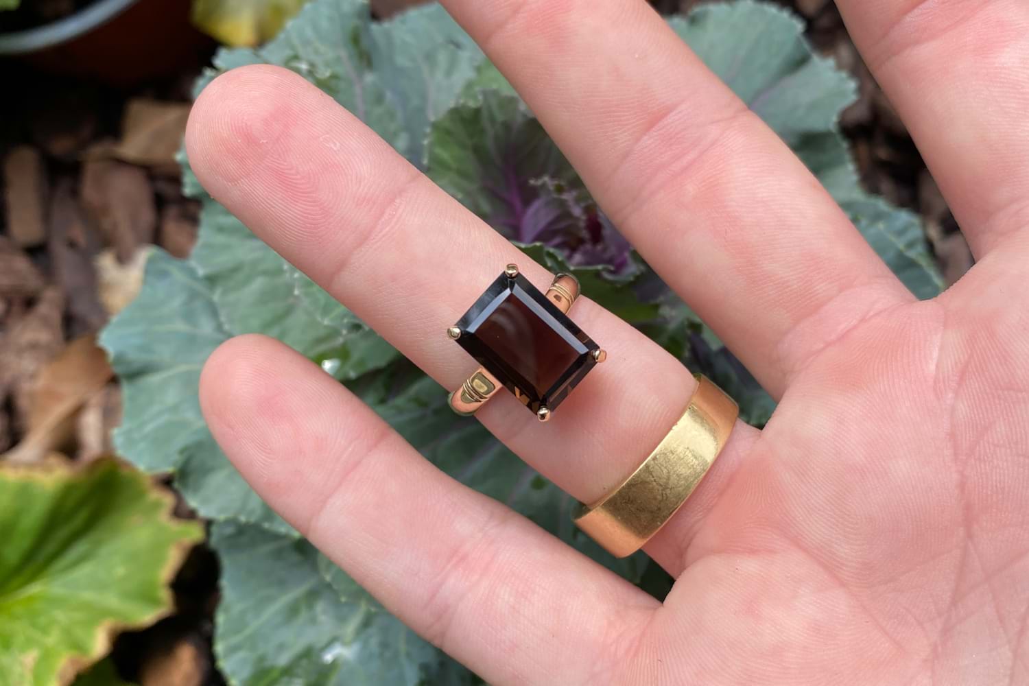 This stunning single stone ring features a 6.50ct emerald cut smokey quartz measuring approx. 14.7x10.1mm, set into a handmade 9ct yellow gold four claw setting, finished with a plain band. Finger size R.