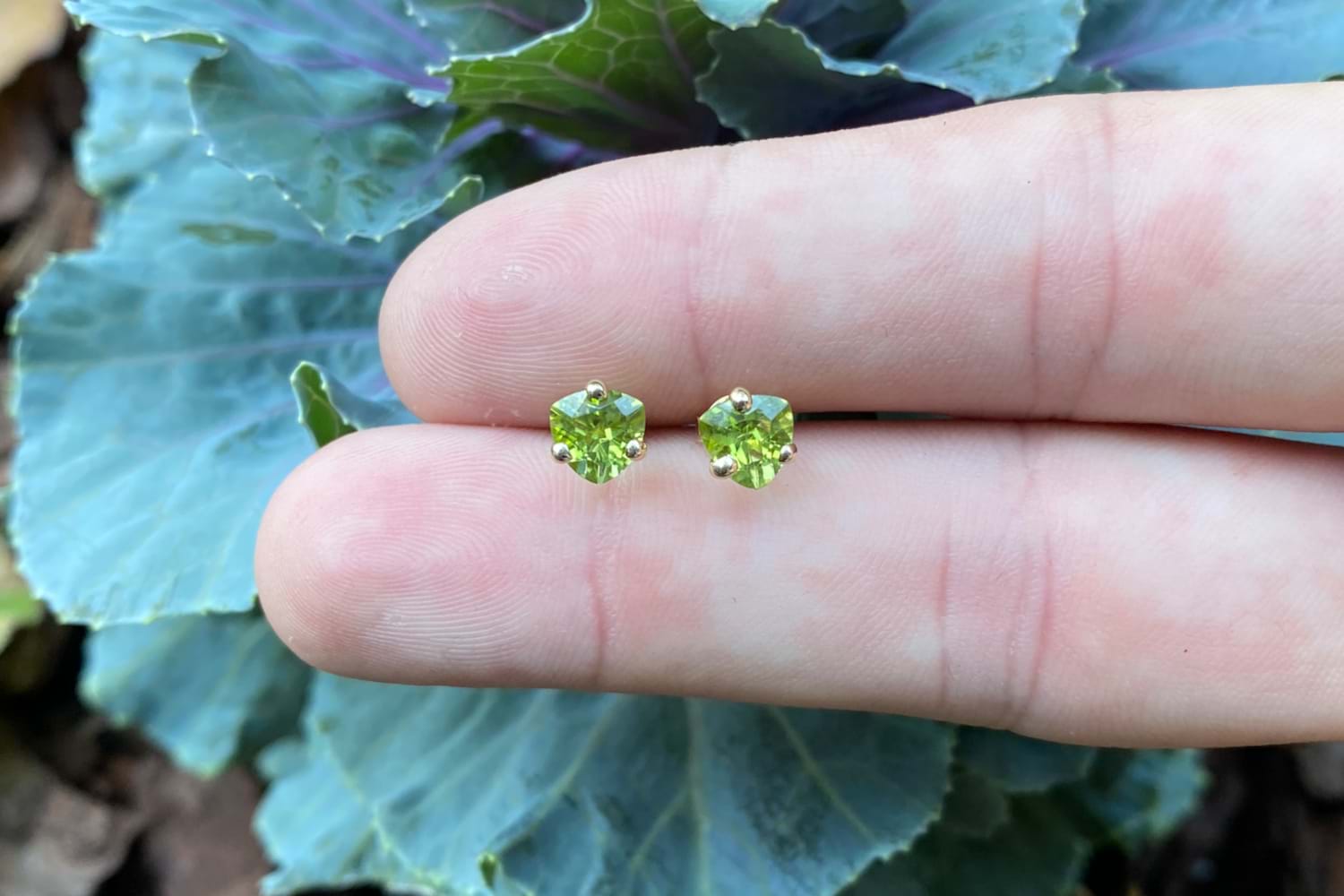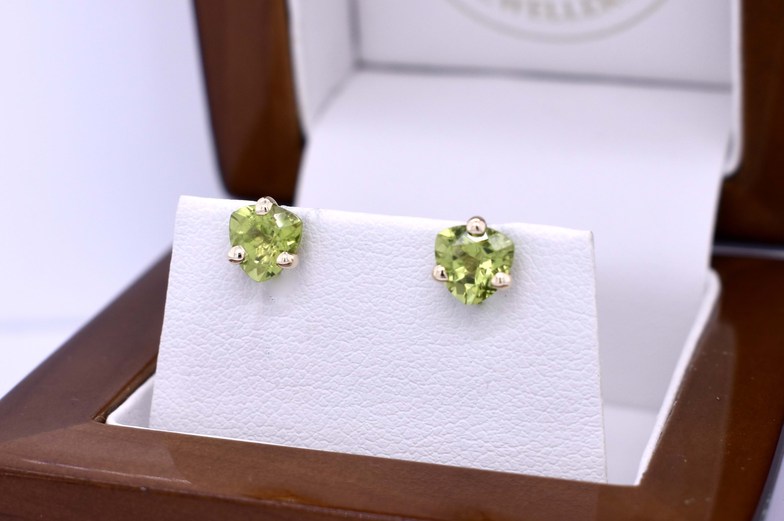 Green and glistening pair of trilliant shaped peridot studs measuring approx. 7mm set into three claws with 9ct yellow gold handmade posts and butterfly fittings.