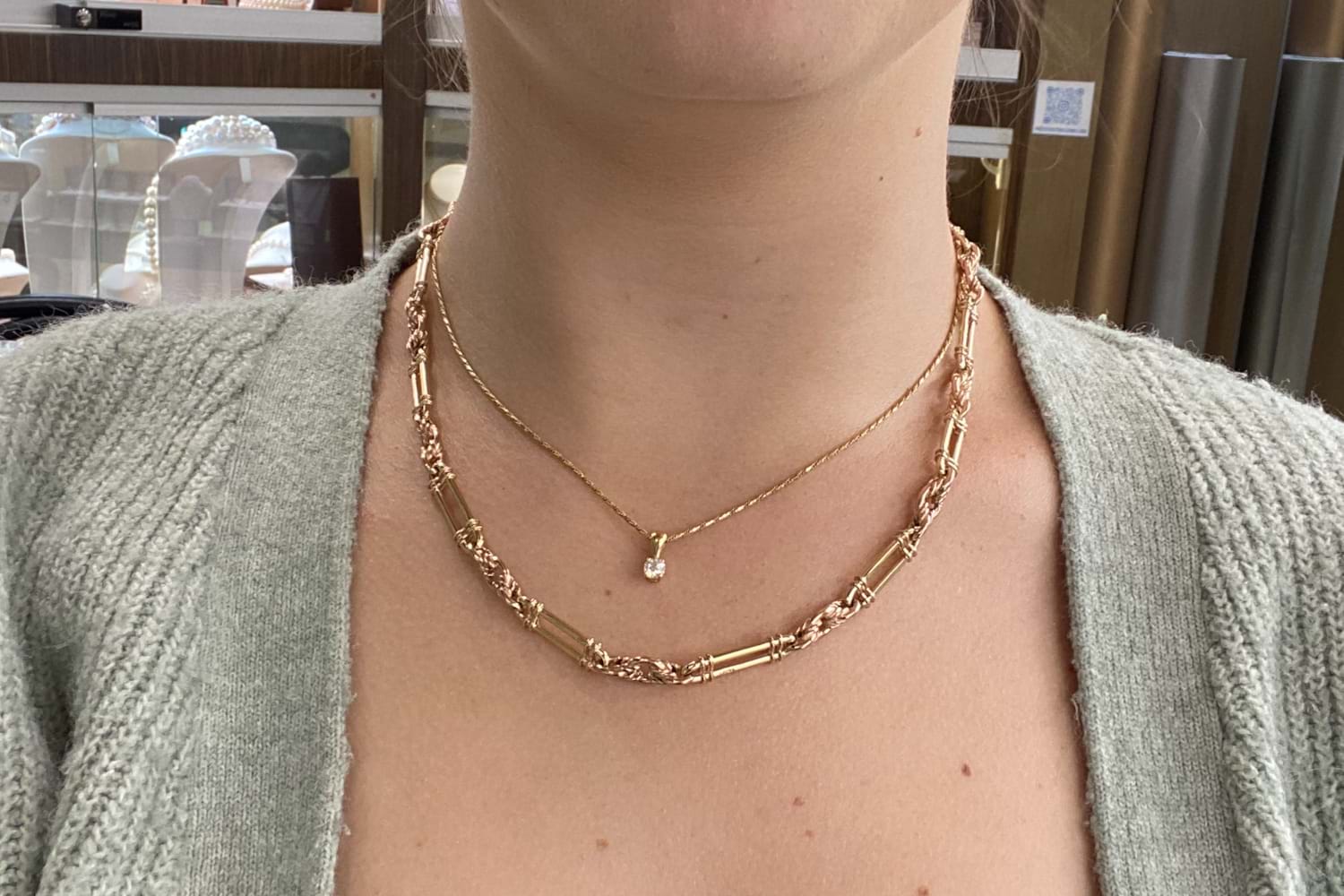This stylish chain is handmade with alternating 9ct yellow and rose gold fetta & knot links. It measures 46cm and weighs a total of 35grams. Finished with a yellow gold swivel.