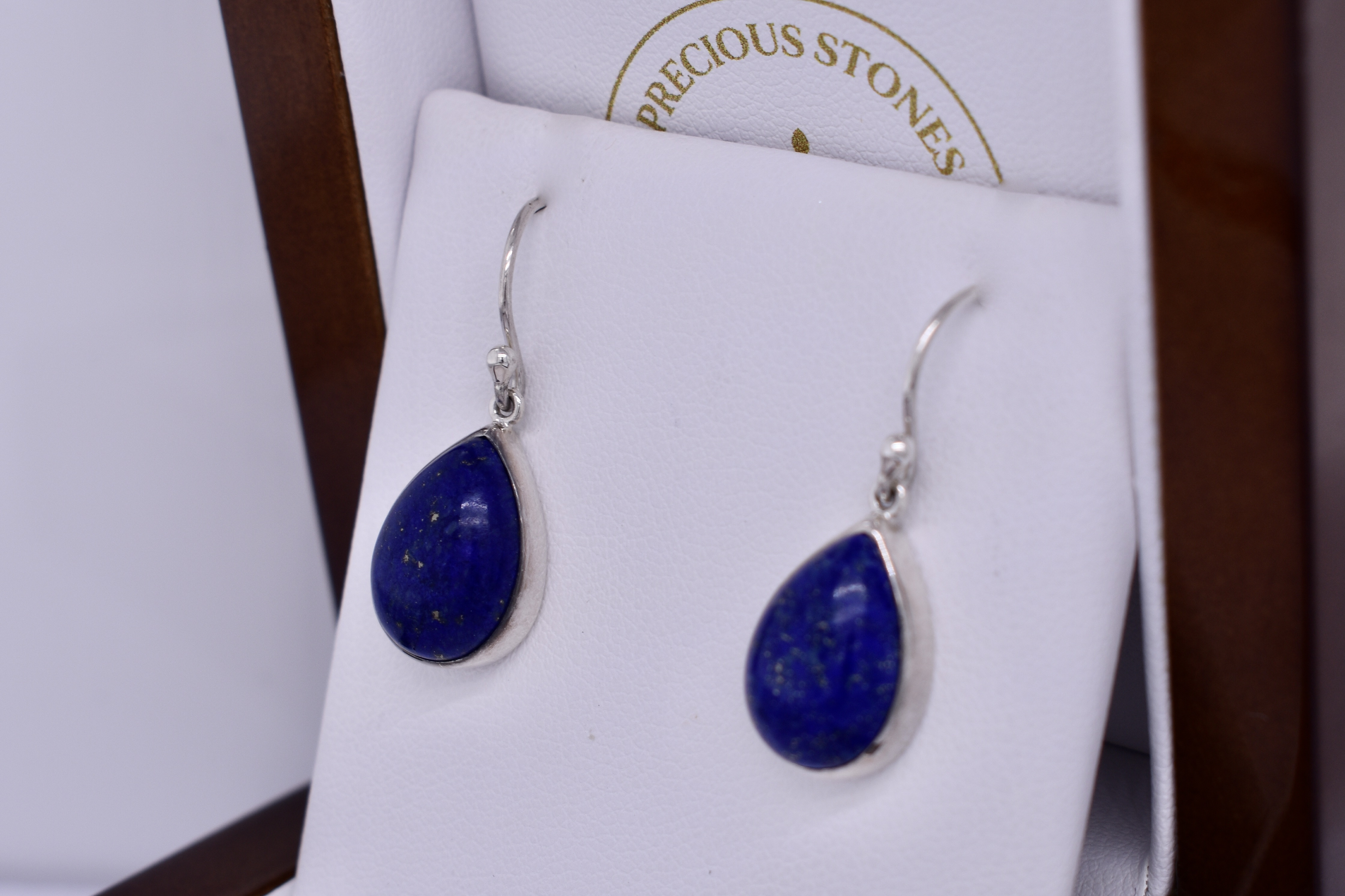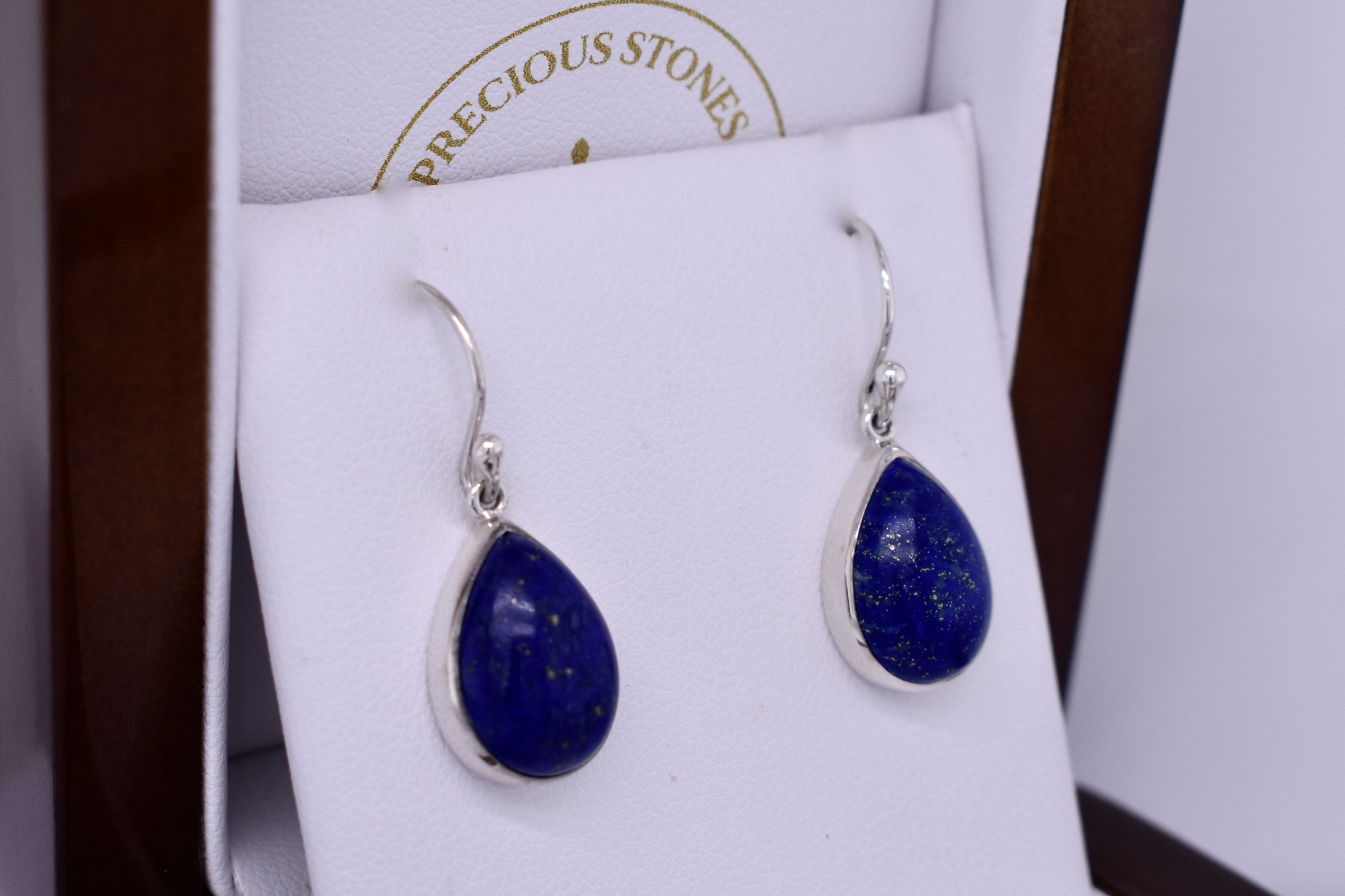 A gorgeous pair of handmade pear shaped drops featuring two lapis measuring approx. 15.5x11.3mm, bezel set into a sterling silver setting with shepherd hook fittings.