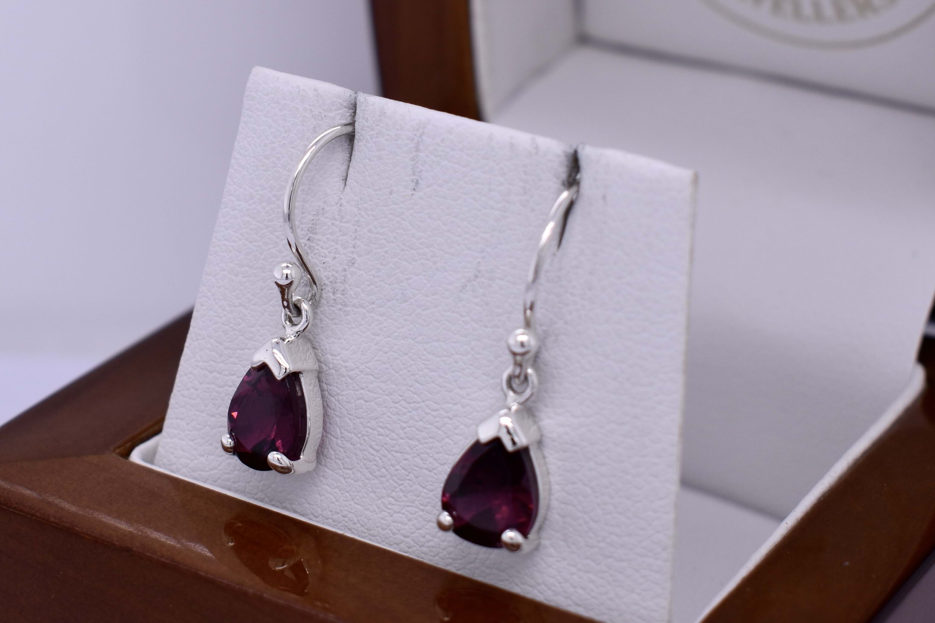 Delightful rhodolite garnet drops, featuring two 8.9x6.3mm pear shaped stones, two claw and cap set in handmade sterling silver with shepherd hook fittings.