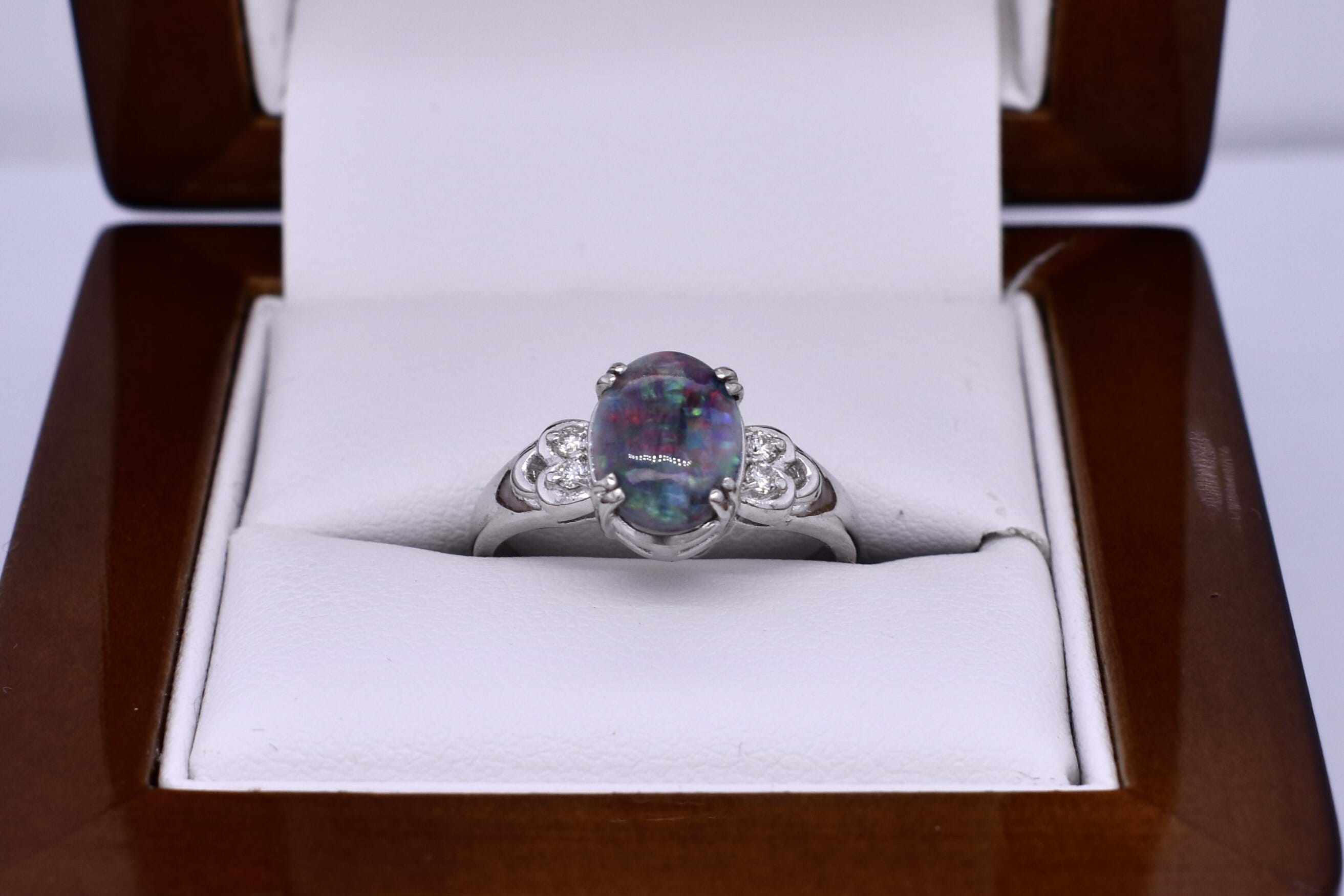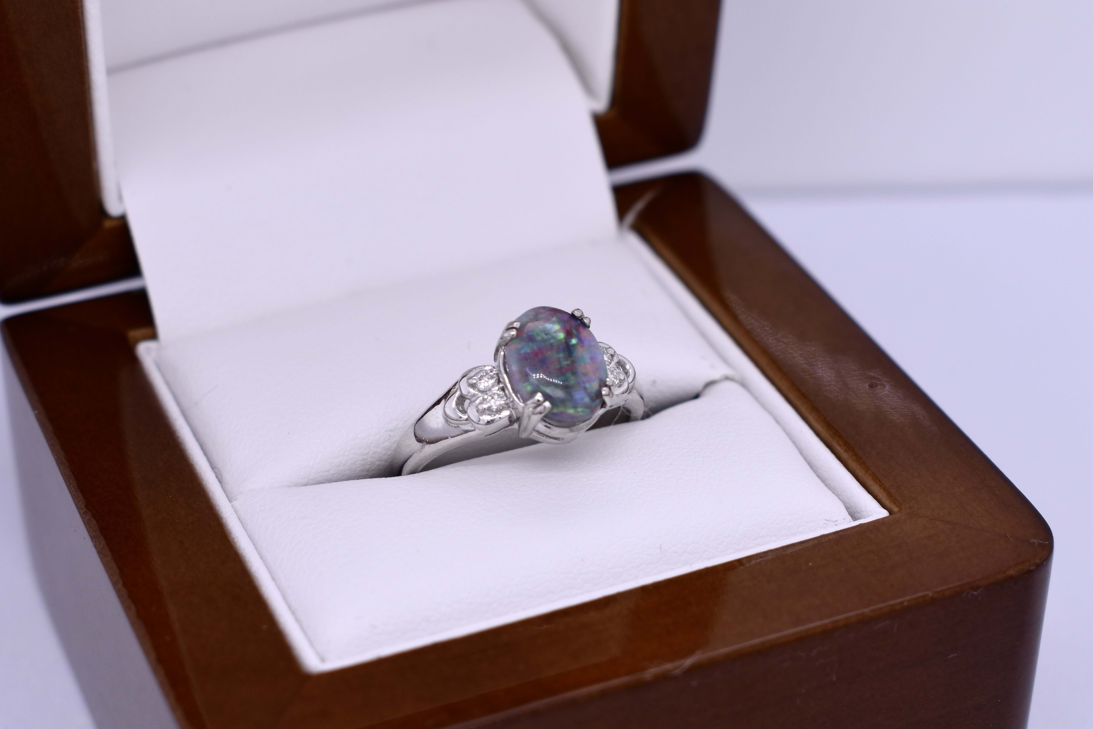 Beautifully crafted in platinum, this ring features an oval cabochon opal measuring 9.00x7.00x2.65mm, totalling 1.00ct. This solid opal is from Lightning Ridge and has a semi black body tone with red, green and blue direction and small strip patterned flashes throughout. Four double claw set on a tapering 4.7x2.5mm wide band with two 1.5mm round brilliant cut diamonds on each shoulder, equalling 0.06ct H-I SI. Finger size L. Independent Valuation Supplied.