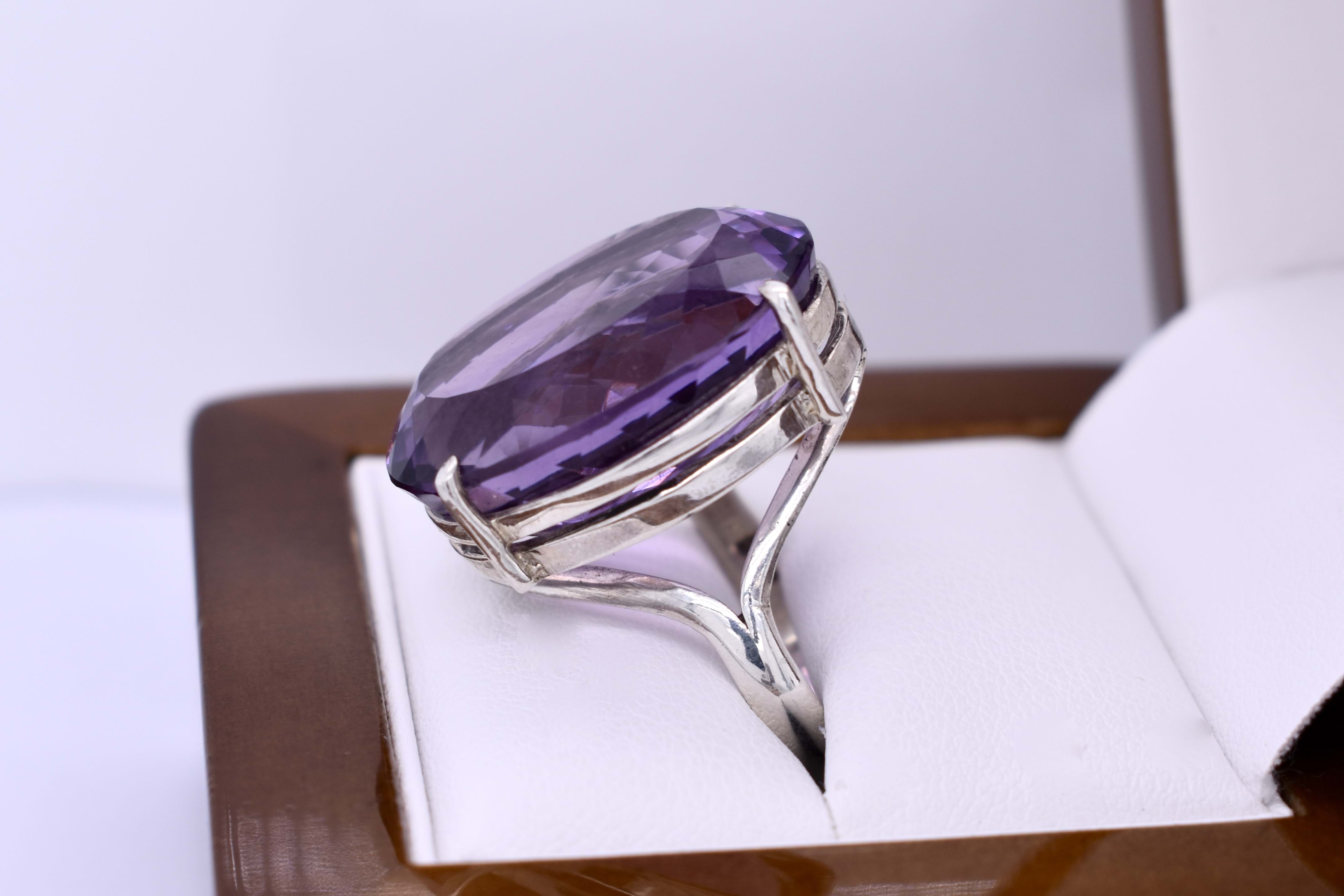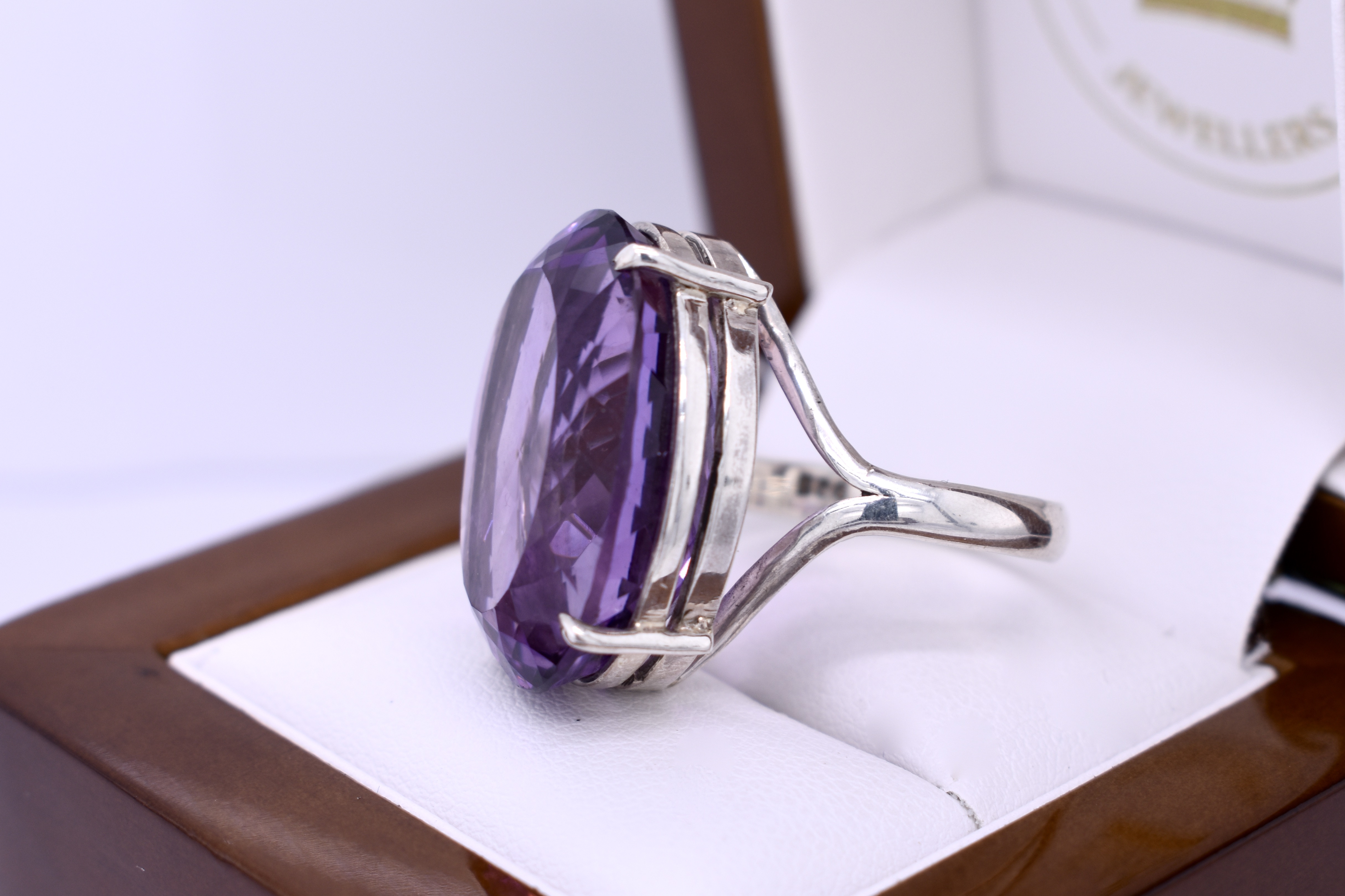 Big and bright, this oval amethyst measures 24x18mm and is four claw set in this stunning sterling silver dress ring. Finger size P+.