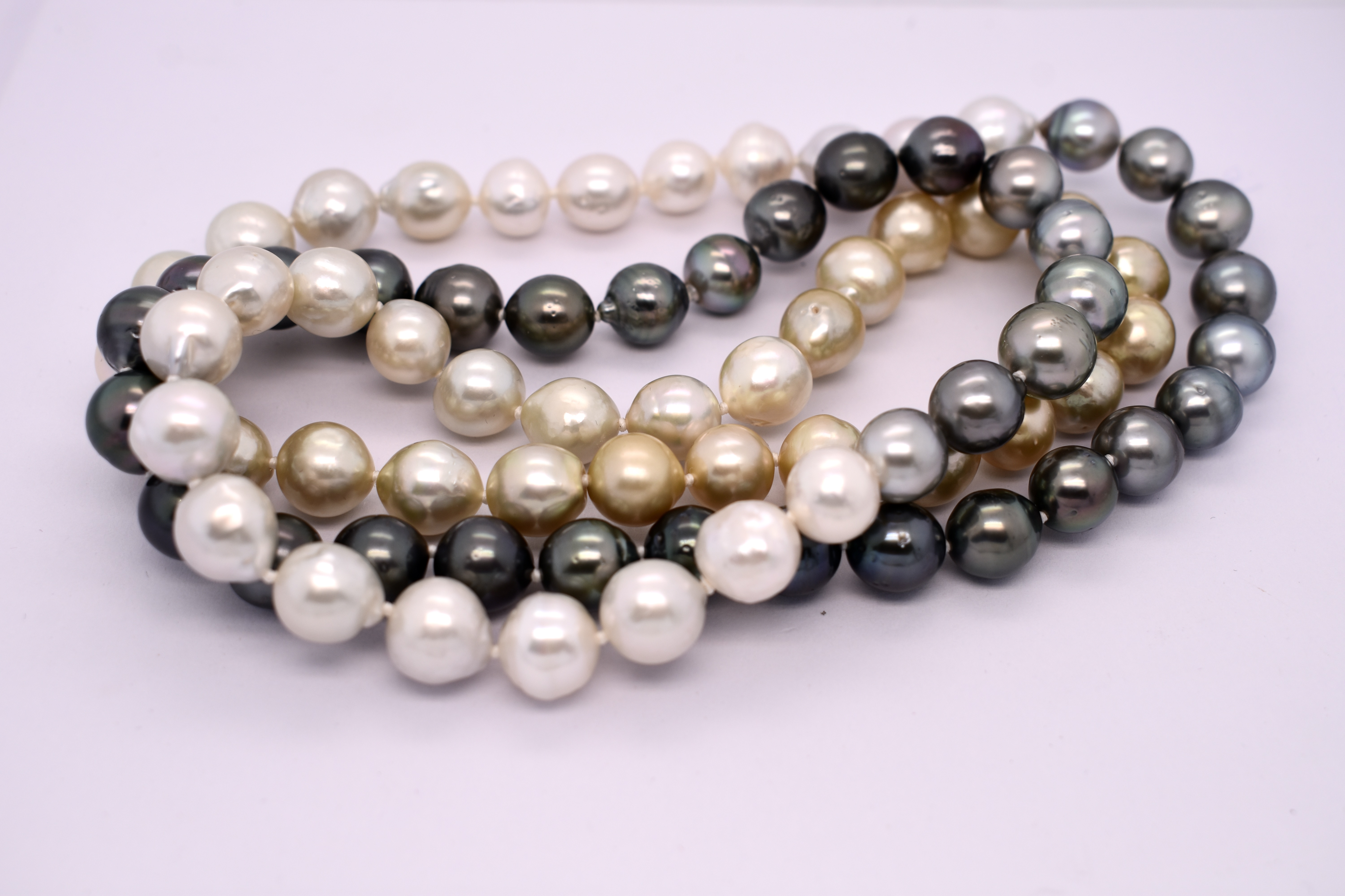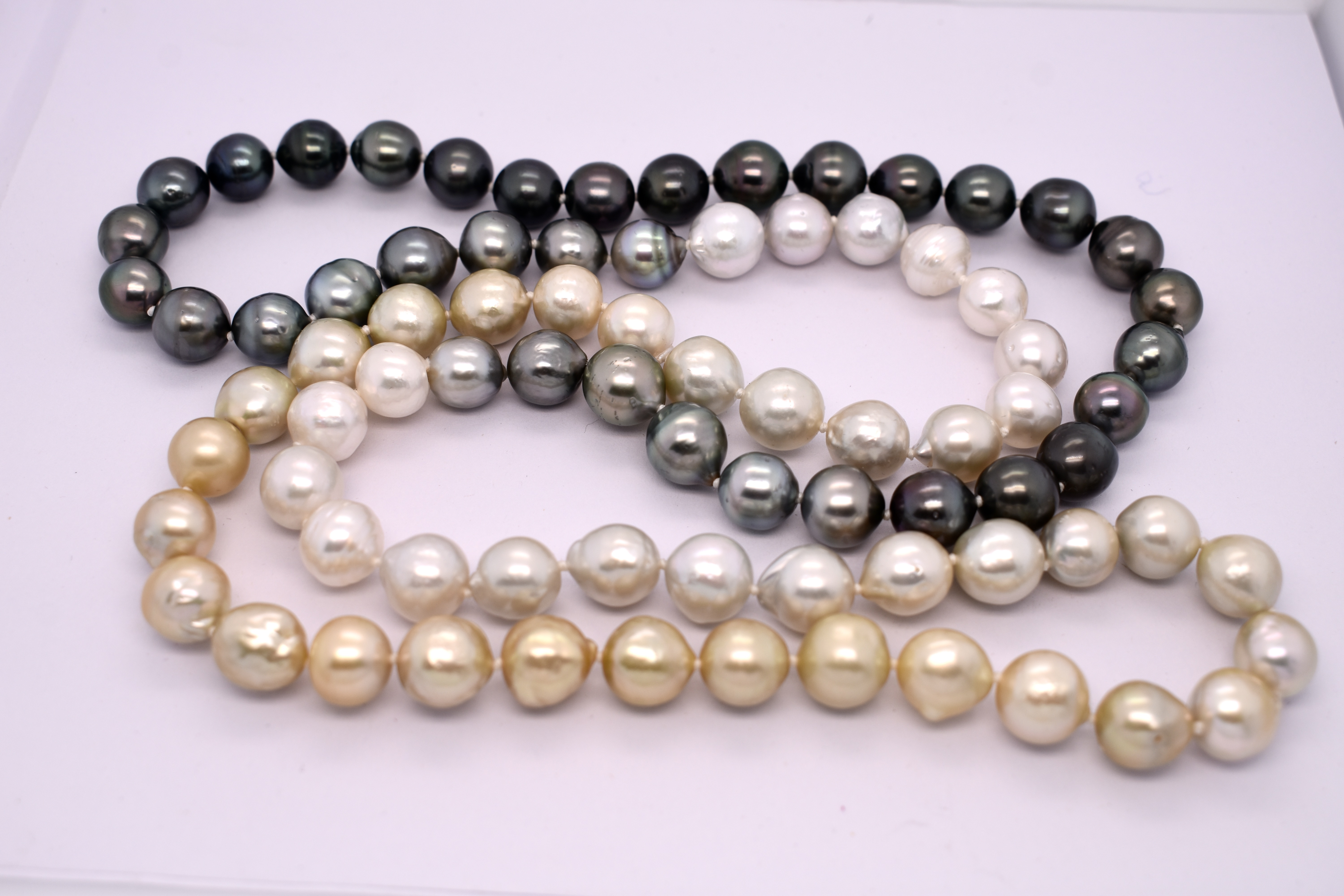 Fabulous Ombre pearl strand, consisting of 81 baroque 9-10mm South Sea and Tahitian pearls threaded and knotted on silk measuring 85mm long. The pearls range in shades of gold, white, silver, cream, grey to black creating this amazing Ombre gradient along the entire strand. All pearls have good to very good lustre. Strand is knotted with no clasp. Independent Valuation Supplied